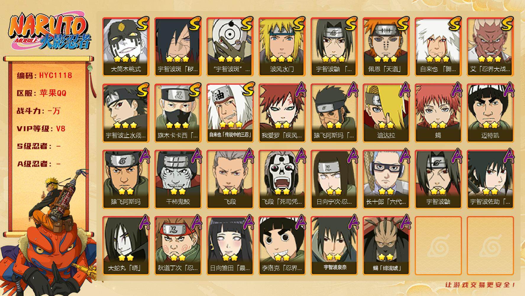 【21s忍者 50a忍者 22通灵】【苹果q-202区-149级-v13-1062万战力】【s级】 佩恩 须佐卡卡西 自来也 豪杰自来也 传说中的三忍自来也 大蛇丸 波风水门 秽土水门 波风水门-九喇嘛连结 秽土日斩 千手扉间 千手柱间 宇智波斑 秽土鼬 神秘面具男 四代目雷影艾 忍战艾 秽土三代雷影艾 秽土金银角 秽土半藏 秽土长门 【a级】 凯 猿飞阿斯玛 蝎 鬼鲛 飞段 忍战小李 疾风我爱罗