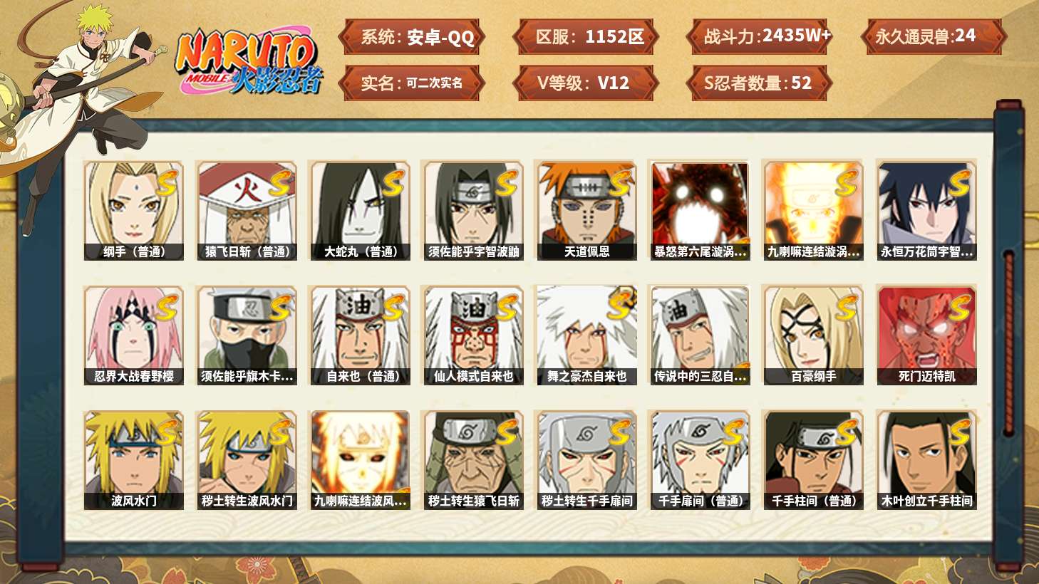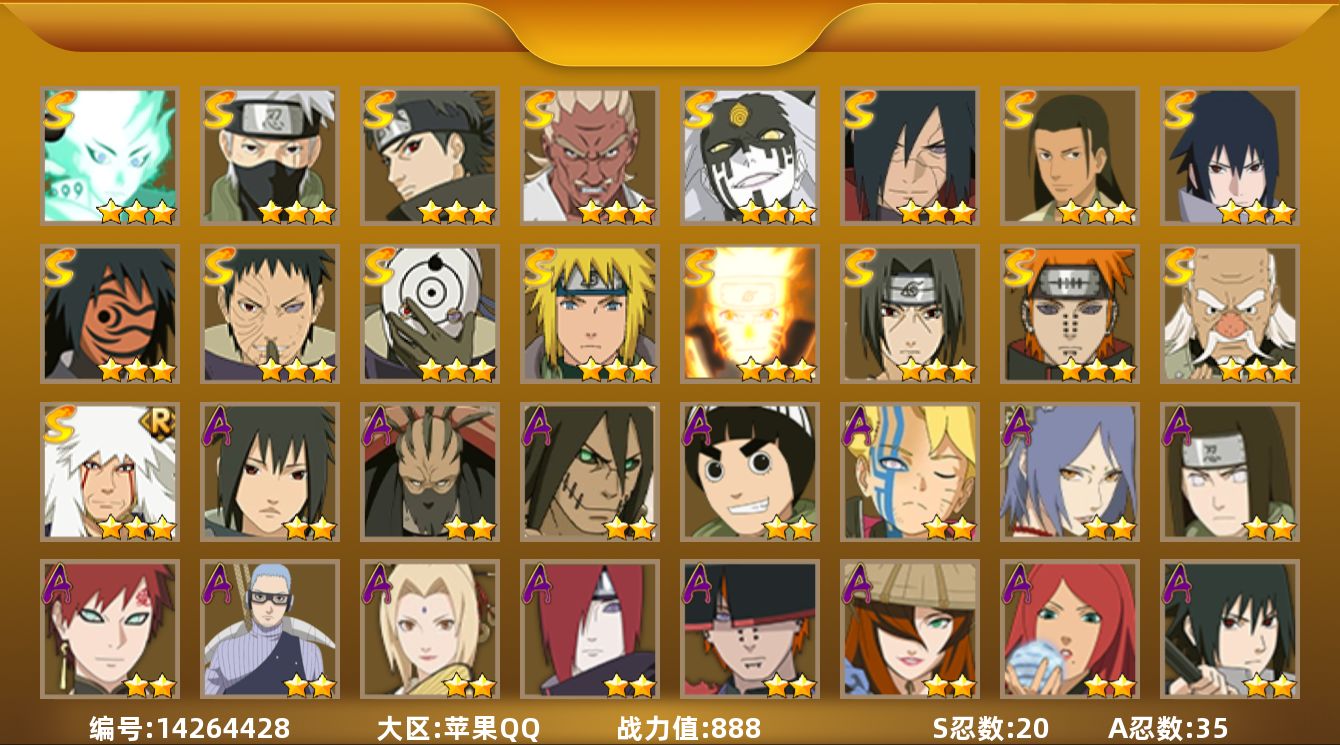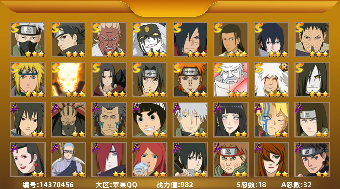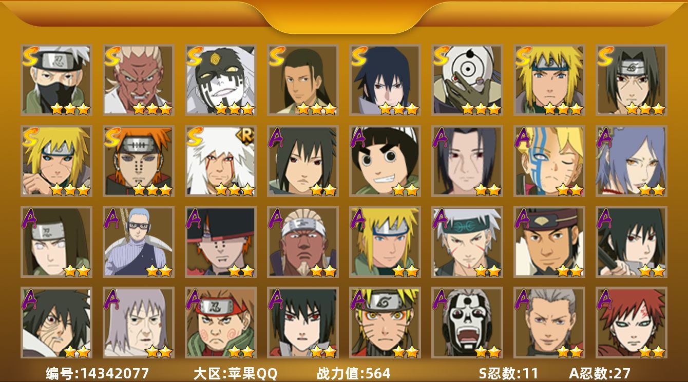 【21s忍者 34a忍者 17通灵】【安卓q-2406区-148级-v9-1029万战力】【s级】 九喇嘛鸣人 永恒万花筒佐助 忍战樱 须佐卡卡西 自来也 豪杰自来也 大蛇丸 纲手 死门凯 波风水门 秽土水门 秽土日斩 秽土柱间 秽土解斑 秽土鼬 须佐止水 白面具 忍界大战艾 忍战大野木 佩恩 秽土长门 【a级】 凯 猿飞阿斯玛 干柿鬼鲛 疾风我爱罗 蝎 飞段 九尾鸣人 鹰小队