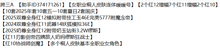 358 跨三a 【助手id374171261】【女职业桐人皮肤连体暖暖号】【2个红12增幅7个红11增幅2个红10】 【10套2025年套10套五一10套夏日2套国庆】 【2025双尊全身红12模拟附带技工玉46e完美5777附魔念帝】 【2024双尊全身红11武器14妖狐模拟36e】 【2025奶尊全身红12附带奶玉站街3.2w缪斯】 【红11刃影剑帝四姨旅人奶妈缪斯狂战士】 【红10协战师剑魔】【多个桐人皮肤基本全职业女角色】