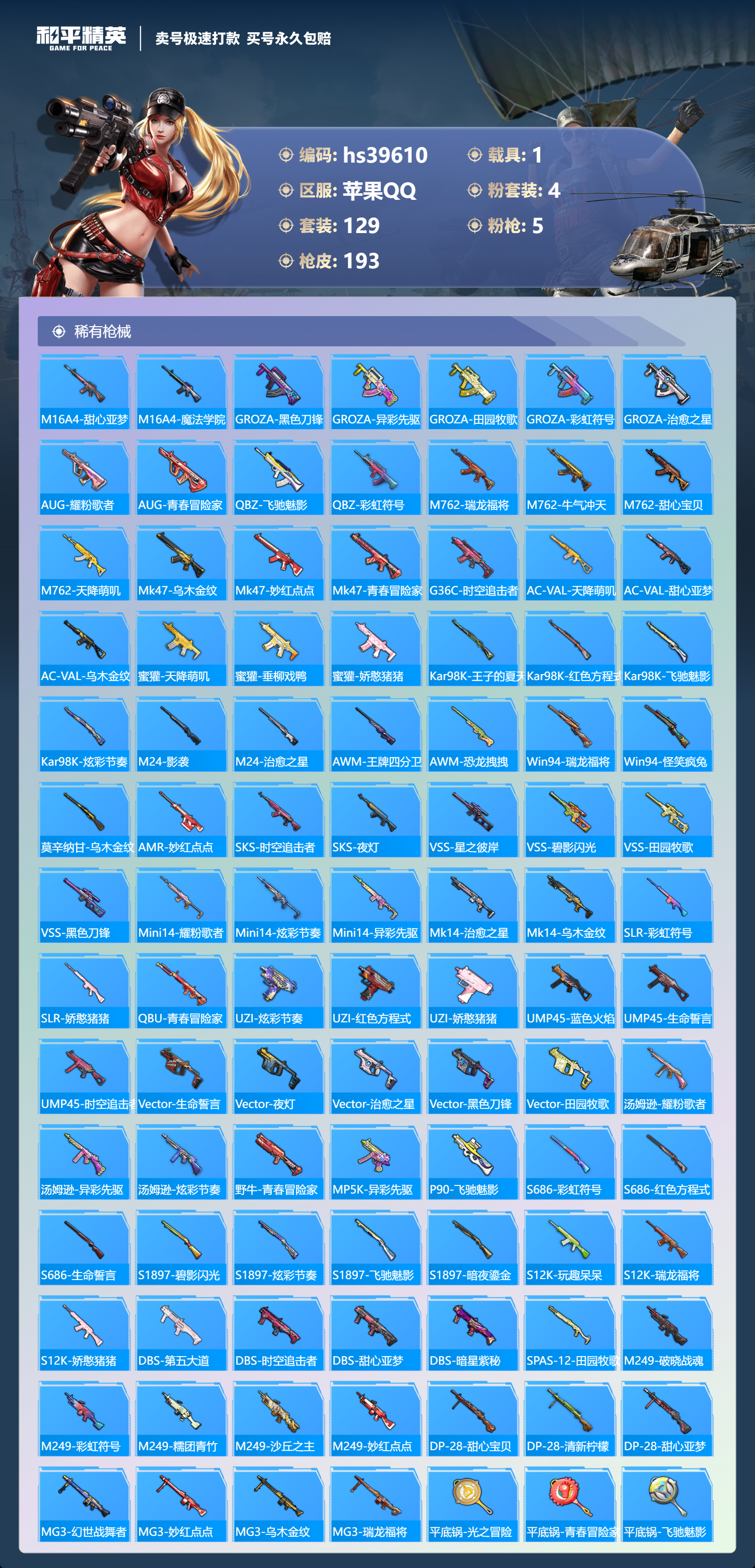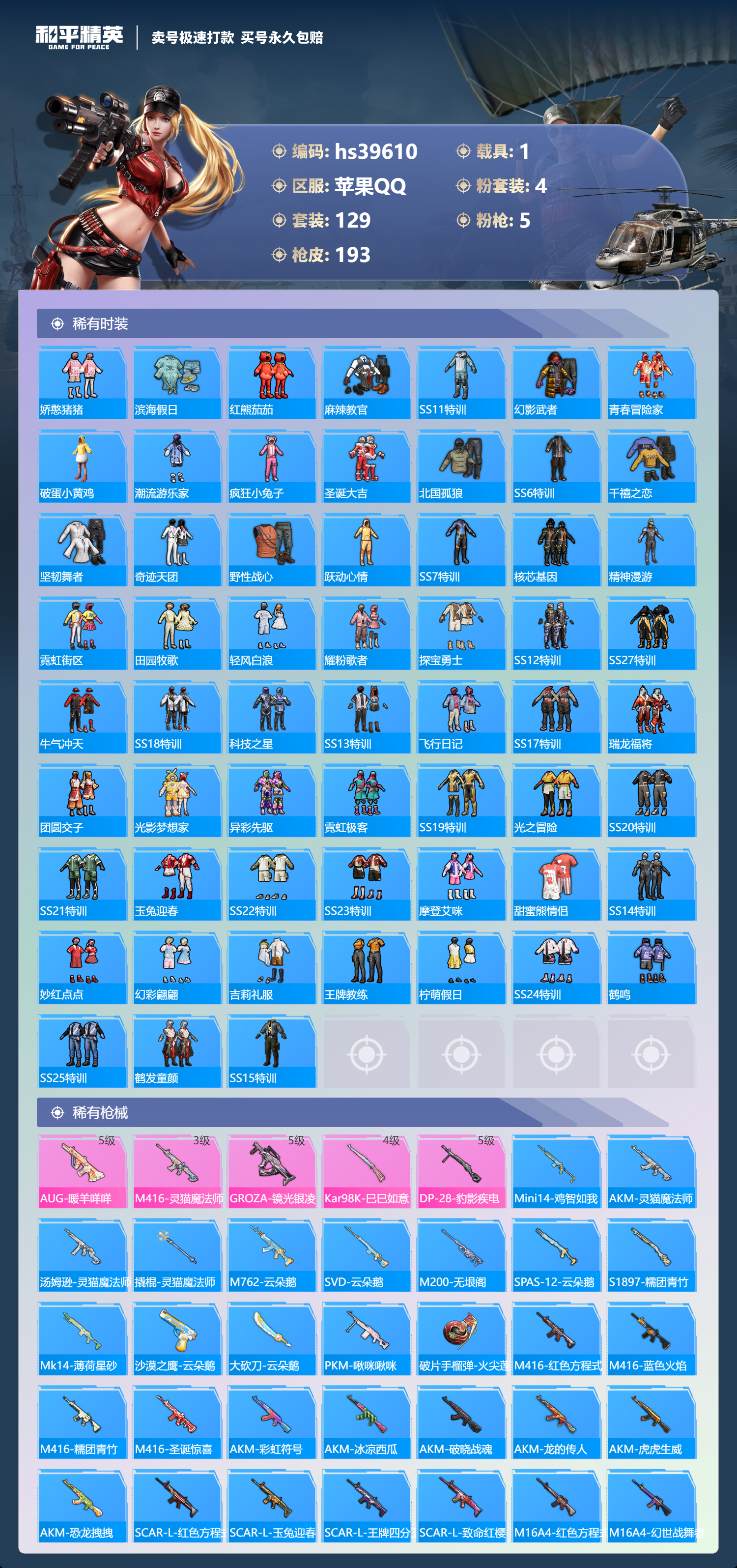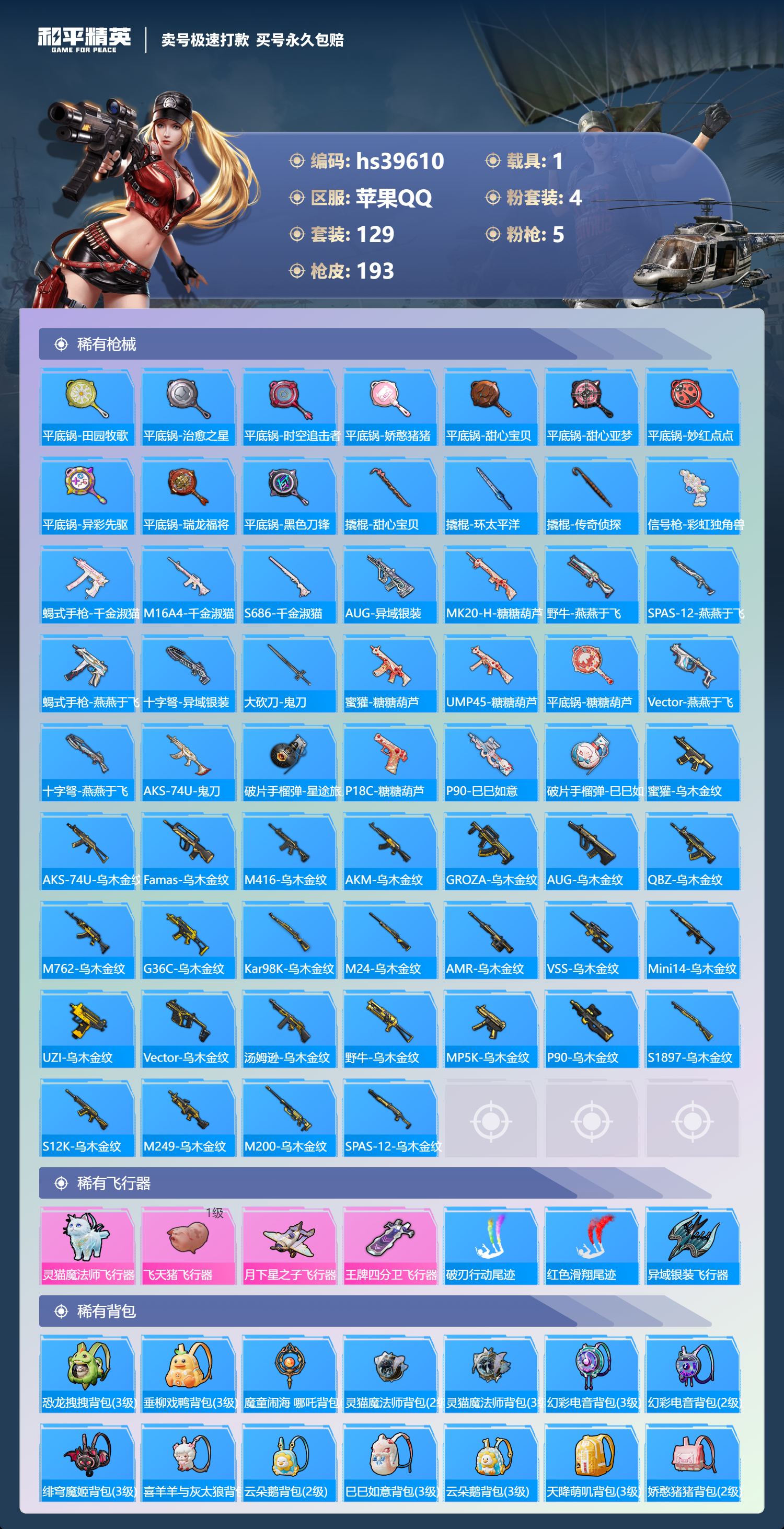 _2119752-苹果手q-12王牌印记-4粉装-5特效呛-1载具-63130热力值-129套装-193呛皮-1卓越印记-0传奇印记 【4粉装】宝贝奶油派天使彩虹糖恐龙拽拽萨利娅 【5特效呛】m416-灵猫魔法师-3级groza-镜光银凌-5级aug-暖羊咩咩-5级kar98k-巳巳如意-4级dp-28-豹影疾电-5级 【2稀有紫装】雪山精英龟仙人 【1稀有载具】黑曜夜骑 【129稀有时装】ss31特训ss33特训ss32特训雪绒豹恋语绒绒ss34特训喜羊羊龟仙人雪山精英蜜露汐语薄荷星砂云朵鹅都市丽猫街头风暴鱼渊荷华ss30特训青团波波燕燕于飞战术大师糖糖葫芦巳巳如意棉花软糖ss5特训ss16特训暴风机械师时空追击者军械专家黑色刀锋冰爽风暴极乐追光福星高照豚鼠丹丹夏日音浪龙的传人ss8特训果汁能量萌黄之夏猎鹰飞驰魅影白色伏地魔音速流光ss9特训酒红色名流湖蓝色名流黄色名流绯格组合ss26特训炫蓝之夏骑行爱好者竞技名士长空猛禽竞技勇士朋克战地菁英甜蜜告白街头潮人怒火燎原魅力单车夜莺强袭者丛林猎人甜心亚梦ss2特训虚音幻奏传奇侦探幻世战舞者牛气满满萌趣咩咩娇憨猪猪滨海假日红熊茄茄麻辣教官ss11特训幻影武者青春冒险家破蛋小黄鸡潮流游乐家疯狂小兔子圣诞大吉北国孤狼ss6特训千禧之恋坚韧舞者奇迹天团野性战心跃动心情ss7特训核芯基因精神漫游霓虹街区田园牧歌轻风白浪耀粉歌者探宝勇士ss12特训ss27特训牛气冲天ss18特训科技之星ss13特训飞行日记ss17特训瑞龙福将团圆交子光影梦想家异彩先驱霓虹极客ss19特训光之冒险ss20特训ss21特训玉兔迎春ss22特训ss23特训摩登艾咪甜蜜熊情侣ss14特训妙红点点幻彩翩翩吉莉礼服王牌教练柠萌假日ss24特训鹤鸣ss25特训鹤发童颜ss15特训 【193稀有呛械】aug-暖羊咩咩/5级m416-灵猫魔法师/3级groza-镜光银凌/5级kar98k-巳巳如意/4级dp-28-豹影疾电/5级mini14-鸡智如我akm-灵猫魔法师汤姆逊-灵猫魔法师撬棍-灵猫魔法师蜜獾-乌木金纹m762-云朵鹅svd-云朵鹅m200-无垠阁aks-74u-乌木金纹famas-乌木金纹spas-12-云朵鹅s1897-糯团青竹mk14-薄荷星砂沙墨之鹦-云朵鹅大砍刀-云朵鹅pkm-啾咪啾咪破片手留单-火尖莲影m416-红色方程式m416-乌木金纹m416-蓝色火焰m416-糯团青竹m416-圣诞惊喜akm-乌木金纹akm-彩虹符号akm-冰凉西瓜akm-破晓战魂akm-龙的传人akm-虎虎生威akm-恐龙拽拽scar-l-红色方程式scar-l-玉兔迎春scar-l-王牌四分卫scar-l-致命红樱m16a4-红色方程式m16a4-幻世战舞者m16a4-甜心亚梦m16a4-魔法学院groza-乌木金纹groza-黑色刀锋groza-异彩先驱groza-田园牧歌groza-彩虹符号groza-治愈之星aug-乌木金纹aug-耀粉歌者aug-青春冒险家q-飞驰魅影q-乌木金纹q-彩虹符号m762-瑞龙福将m762-乌木金纹m762-牛气冲天m762-甜心宝贝m762-天降萌叽mk47-乌木金纹mk47-妙红点点mk47-青春冒险家g36c-乌木金纹g36c-时空追击者ac-val-天降萌叽ac-val-甜心亚梦ac-val-乌木金纹蜜獾-天降萌叽蜜獾-垂柳戏鸭蜜獾-娇憨猪猪kar98k-乌木金纹kar98k-王子的夏天kar98k-红色方程式kar98k-飞驰魅影kar98k-炫彩节奏m24-乌木金纹m24-影袭m24-治愈之星awm-王牌四分卫awm-恐龙拽拽win94-瑞龙福将win94-怪笑疯兔莫辛纳甘-乌木金纹amr-乌木金纹amr-妙红点点sks-时空追击者sks-夜灯vss-星之彼岸vss-乌木金纹vss-碧影闪光vss-田园牧歌vss-黑色刀锋mini14-耀粉歌者mini14-乌木金纹mini14-炫彩节奏mini14-异彩先驱mk14-治愈之星mk14-乌木金纹slr-彩虹符号slr-娇憨猪猪qbu-青春冒险家uzi-炫彩节奏uzi-乌木金纹uzi-红色方程式uzi-娇憨猪猪ump45-蓝色火焰ump45-生命誓言ump45-时空追击者vect-乌木金纹vect-生命誓言vect-夜灯vect-治愈之星vect-黑色刀锋vect-田园牧歌汤姆逊-耀粉歌者汤姆逊-乌木金纹汤姆逊-异彩先驱汤姆逊-炫彩节奏野牛-乌木金纹野牛-青春冒险家mp5k-异彩先驱mp5k-乌木金纹p90-乌木金纹p90-飞驰魅影s686-彩虹符号s686-红色方程式s686-生命誓言s1897-碧影闪光s1897-乌木金纹s1897-炫彩节奏s1897-飞驰魅影s1897-暗夜鎏金s12k-玩趣呆呆s12k-乌木金纹s12k-瑞龙福将s12k-娇憨猪猪dbs-第五大道dbs-时空追击者dbs-甜心亚梦dbs-暗星紫秘spas-12-田园牧歌m249-破晓战魂m249-彩虹符号m249-糯团青竹m249-沙丘之主m249-乌木金纹m249-妙红点点dp-28-甜心宝贝dp-28-清新柠檬dp-28-甜心亚梦mg3-幻世战舞者mg3-妙红点点mg3-乌木金纹mg3-瑞龙福将平底锅-光之冒险平底锅-青春冒险家平底锅-飞驰魅影平底锅-田园牧歌平底锅-治愈之星平底锅-时空追击者平底锅-娇憨猪猪平底锅-甜心宝贝平底锅-甜心亚梦平底锅-妙红点点平底锅-异彩先驱平底锅-瑞龙福将平底锅-黑色刀锋撬棍-甜心宝贝撬棍-环太平洋撬棍-传奇侦探信号呛-彩虹独角兽蝎式手呛-千金淑猫m16a4-千金淑猫s686-千金淑猫aug-异域银装mk20-h-糖糖葫芦野牛-燕燕于飞m200-乌木金纹spas-12-燕燕于飞蝎式手呛-燕燕于飞十子怒-异域银装大砍刀-鬼刀蜜獾-糖糖葫芦ump45-糖糖葫芦spas-12-乌木金纹平底锅-糖糖葫芦vect-燕燕于飞十子怒-燕燕于飞aks-74u-鬼刀破片手留单-星途旅人p18c-糖糖葫芦p90-巳巳如意破片手留单-巳巳如意 【7稀有飞行器】灵猫魔法师飞行器破刃行动尾迹飞天猪飞行器/1级红色滑翔尾迹月下星之子飞行器王牌四分卫飞行器异域银装飞行器 【57稀有背包】恐龙拽拽背包3级垂柳戏鸭背包3级魔童闹海哪吒背包3级灵猫魔法师背包2级灵猫魔法师背包3级幻彩电音背包3级幻彩电音背包2级绯穹魔姬背包3级喜羊羊与灰太狼背包3级云朵鹅背包2级巳巳如意背包3级云朵鹅背包3级天降萌叽背包3级娇憨猪猪背包2级青春