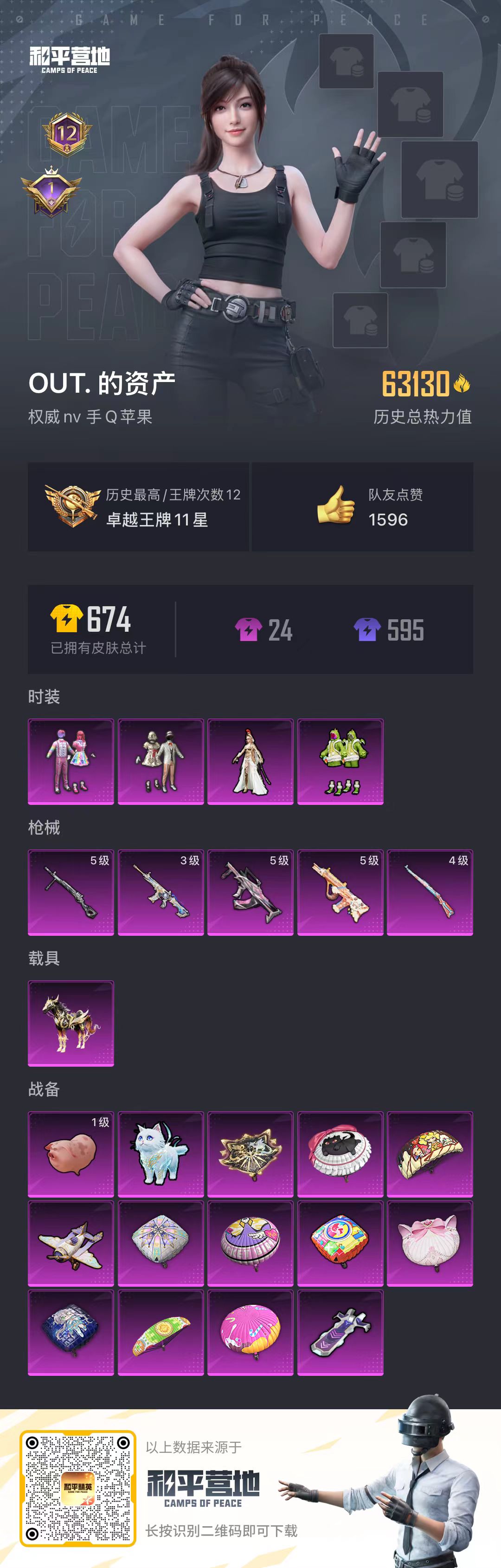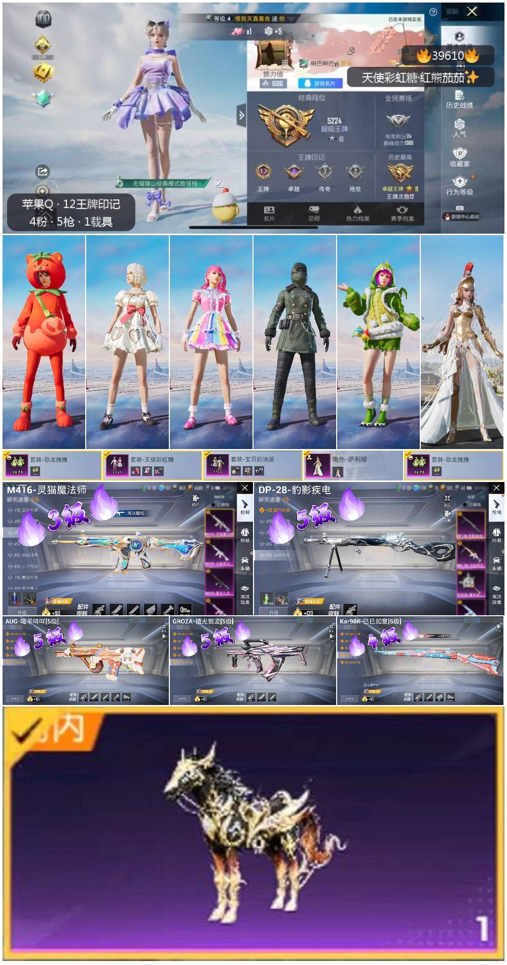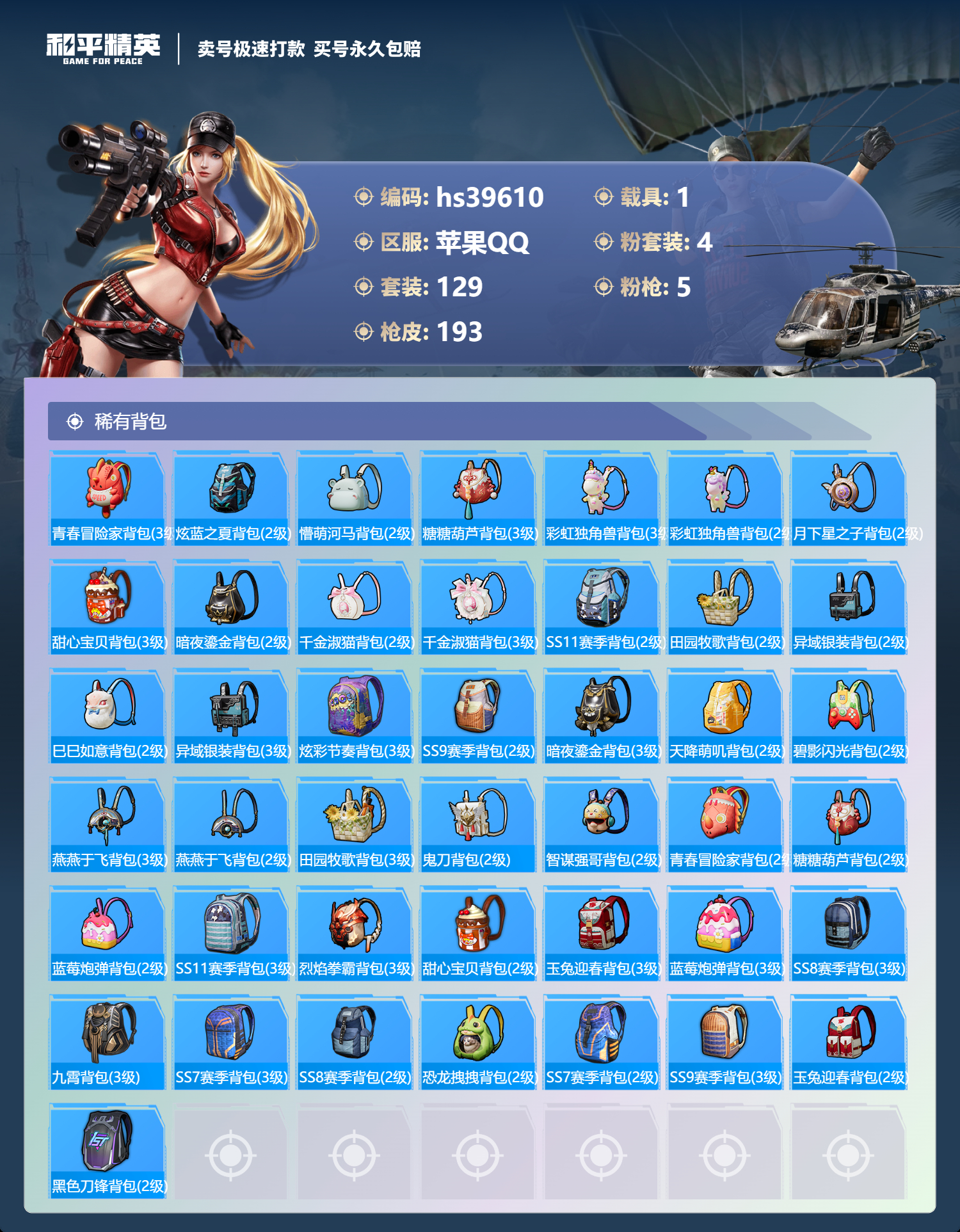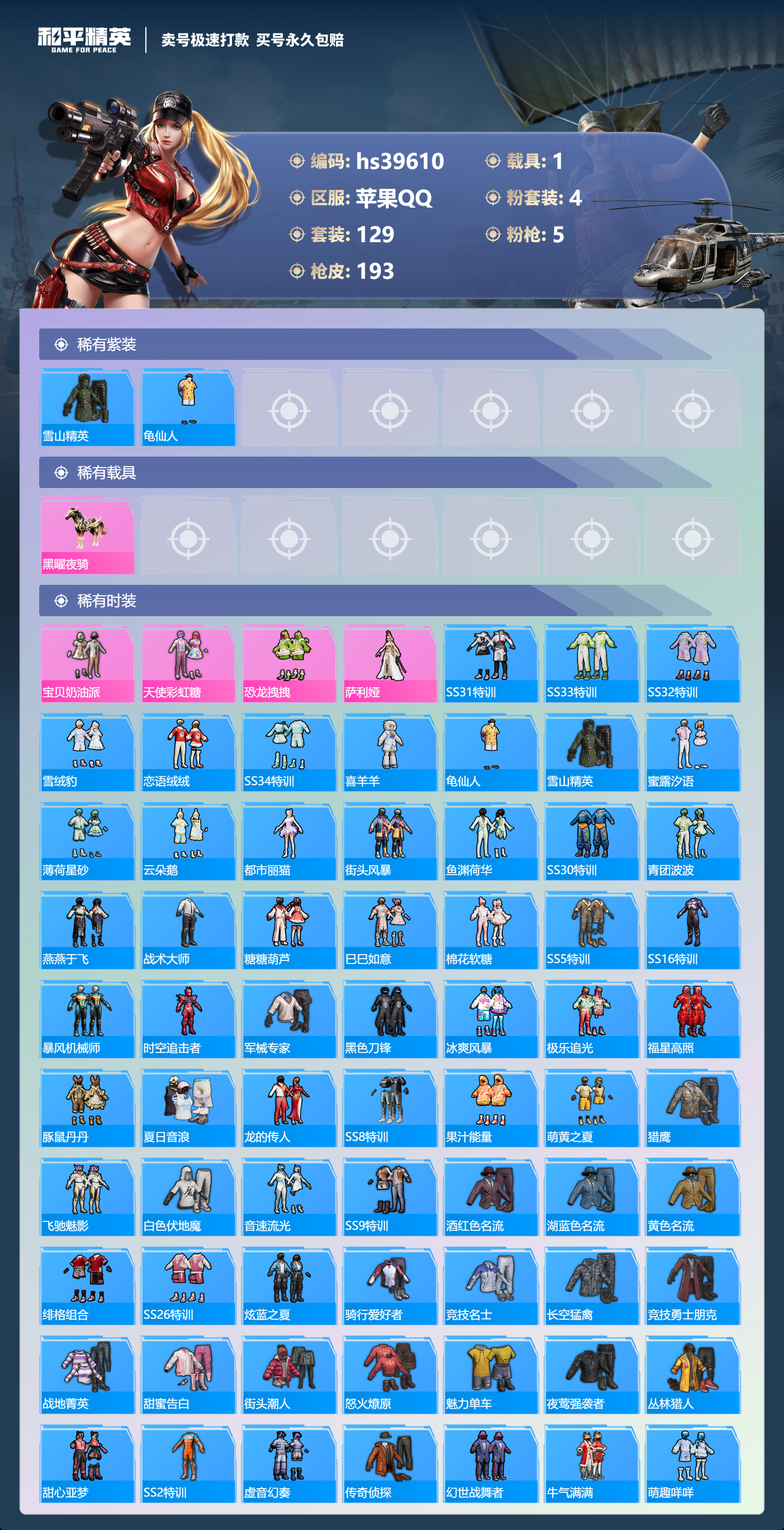 _2119752-苹果手q-12王牌印记-4粉装-5特效呛-1载具-63130热力值-129套装-193呛皮-1卓越印记-0传奇印记 【4粉装】宝贝奶油派天使彩虹糖恐龙拽拽萨利娅 【5特效呛】m416-灵猫魔法师-3级groza-镜光银凌-5级aug-暖羊咩咩-5级kar98k-巳巳如意-4级dp-28-豹影疾电-5级 【2稀有紫装】雪山精英龟仙人 【1稀有载具】黑曜夜骑 【129稀有时装】ss31特训ss33特训ss32特训雪绒豹恋语绒绒ss34特训喜羊羊龟仙人雪山精英蜜露汐语薄荷星砂云朵鹅都市丽猫街头风暴鱼渊荷华ss30特训青团波波燕燕于飞战术大师糖糖葫芦巳巳如意棉花软糖ss5特训ss16特训暴风机械师时空追击者军械专家黑色刀锋冰爽风暴极乐追光福星高照豚鼠丹丹夏日音浪龙的传人ss8特训果汁能量萌黄之夏猎鹰飞驰魅影白色伏地魔音速流光ss9特训酒红色名流湖蓝色名流黄色名流绯格组合ss26特训炫蓝之夏骑行爱好者竞技名士长空猛禽竞技勇士朋克战地菁英甜蜜告白街头潮人怒火燎原魅力单车夜莺强袭者丛林猎人甜心亚梦ss2特训虚音幻奏传奇侦探幻世战舞者牛气满满萌趣咩咩娇憨猪猪滨海假日红熊茄茄麻辣教官ss11特训幻影武者青春冒险家破蛋小黄鸡潮流游乐家疯狂小兔子圣诞大吉北国孤狼ss6特训千禧之恋坚韧舞者奇迹天团野性战心跃动心情ss7特训核芯基因精神漫游霓虹街区田园牧歌轻风白浪耀粉歌者探宝勇士ss12特训ss27特训牛气冲天ss18特训科技之星ss13特训飞行日记ss17特训瑞龙福将团圆交子光影梦想家异彩先驱霓虹极客ss19特训光之冒险ss20特训ss21特训玉兔迎春ss22特训ss23特训摩登艾咪甜蜜熊情侣ss14特训妙红点点幻彩翩翩吉莉礼服王牌教练柠萌假日ss24特训鹤鸣ss25特训鹤发童颜ss15特训 【193稀有呛械】aug-暖羊咩咩/5级m416-灵猫魔法师/3级groza-镜光银凌/5级kar98k-巳巳如意/4级dp-28-豹影疾电/5级mini14-鸡智如我akm-灵猫魔法师汤姆逊-灵猫魔法师撬棍-灵猫魔法师蜜獾-乌木金纹m762-云朵鹅svd-云朵鹅m200-无垠阁aks-74u-乌木金纹famas-乌木金纹spas-12-云朵鹅s1897-糯团青竹mk14-薄荷星砂沙墨之鹦-云朵鹅大砍刀-云朵鹅pkm-啾咪啾咪破片手留单-火尖莲影m416-红色方程式m416-乌木金纹m416-蓝色火焰m416-糯团青竹m416-圣诞惊喜akm-乌木金纹akm-彩虹符号akm-冰凉西瓜akm-破晓战魂akm-龙的传人akm-虎虎生威akm-恐龙拽拽scar-l-红色方程式scar-l-玉兔迎春scar-l-王牌四分卫scar-l-致命红樱m16a4-红色方程式m16a4-幻世战舞者m16a4-甜心亚梦m16a4-魔法学院groza-乌木金纹groza-黑色刀锋groza-异彩先驱groza-田园牧歌groza-彩虹符号groza-治愈之星aug-乌木金纹aug-耀粉歌者aug-青春冒险家q-飞驰魅影q-乌木金纹q-彩虹符号m762-瑞龙福将m762-乌木金纹m762-牛气冲天m762-甜心宝贝m762-天降萌叽mk47-乌木金纹mk47-妙红点点mk47-青春冒险家g36c-乌木金纹g36c-时空追击者ac-val-天降萌叽ac-val-甜心亚梦ac-val-乌木金纹蜜獾-天降萌叽蜜獾-垂柳戏鸭蜜獾-娇憨猪猪kar98k-乌木金纹kar98k-王子的夏天kar98k-红色方程式kar98k-飞驰魅影kar98k-炫彩节奏m24-乌木金纹m24-影袭m24-治愈之星awm-王牌四分卫awm-恐龙拽拽win94-瑞龙福将win94-怪笑疯兔莫辛纳甘-乌木金纹amr-乌木金纹amr-妙红点点sks-时空追击者sks-夜灯vss-星之彼岸vss-乌木金纹vss-碧影闪光vss-田园牧歌vss-黑色刀锋mini14-耀粉歌者mini14-乌木金纹mini14-炫彩节奏mini14-异彩先驱mk14-治愈之星mk14-乌木金纹slr-彩虹符号slr-娇憨猪猪qbu-青春冒险家uzi-炫彩节奏uzi-乌木金纹uzi-红色方程式uzi-娇憨猪猪ump45-蓝色火焰ump45-生命誓言ump45-时空追击者vect-乌木金纹vect-生命誓言vect-夜灯vect-治愈之星vect-黑色刀锋vect-田园牧歌汤姆逊-耀粉歌者汤姆逊-乌木金纹汤姆逊-异彩先驱汤姆逊-炫彩节奏野牛-乌木金纹野牛-青春冒险家mp5k-异彩先驱mp5k-乌木金纹p90-乌木金纹p90-飞驰魅影s686-彩虹符号s686-红色方程式s686-生命誓言s1897-碧影闪光s1897-乌木金纹s1897-炫彩节奏s1897-飞驰魅影s1897-暗夜鎏金s12k-玩趣呆呆s12k-乌木金纹s12k-瑞龙福将s12k-娇憨猪猪dbs-第五大道dbs-时空追击者dbs-甜心亚梦dbs-暗星紫秘spas-12-田园牧歌m249-破晓战魂m249-彩虹符号m249-糯团青竹m249-沙丘之主m249-乌木金纹m249-妙红点点dp-28-甜心宝贝dp-28-清新柠檬dp-28-甜心亚梦mg3-幻世战舞者mg3-妙红点点mg3-乌木金纹mg3-瑞龙福将平底锅-光之冒险平底锅-青春冒险家平底锅-飞驰魅影平底锅-田园牧歌平底锅-治愈之星平底锅-时空追击者平底锅-娇憨猪猪平底锅-甜心宝贝平底锅-甜心亚梦平底锅-妙红点点平底锅-异彩先驱平底锅-瑞龙福将平底锅-黑色刀锋撬棍-甜心宝贝撬棍-环太平洋撬棍-传奇侦探信号呛-彩虹独角兽蝎式手呛-千金淑猫m16a4-千金淑猫s686-千金淑猫aug-异域银装mk20-h-糖糖葫芦野牛-燕燕于飞m200-乌木金纹spas-12-燕燕于飞蝎式手呛-燕燕于飞十子怒-异域银装大砍刀-鬼刀蜜獾-糖糖葫芦ump45-糖糖葫芦spas-12-乌木金纹平底锅-糖糖葫芦vect-燕燕于飞十子怒-燕燕于飞aks-74u-鬼刀破片手留单-星途旅人p18c-糖糖葫芦p90-巳巳如意破片手留单-巳巳如意 【7稀有飞行器】灵猫魔法师飞行器破刃行动尾迹飞天猪飞行器/1级红色滑翔尾迹月下星之子飞行器王牌四分卫飞行器异域银装飞行器 【57稀有背包】恐龙拽拽背包3级垂柳戏鸭背包3级魔童闹海哪吒背包3级灵猫魔法师背包2级灵猫魔法师背包3级幻彩电音背包3级幻彩电音背包2级绯穹魔姬背包3级喜羊羊与灰太狼背包3级云朵鹅背包2级巳巳如意背包3级云朵鹅背包3级天降萌叽背包3级娇憨猪猪背包2级青春