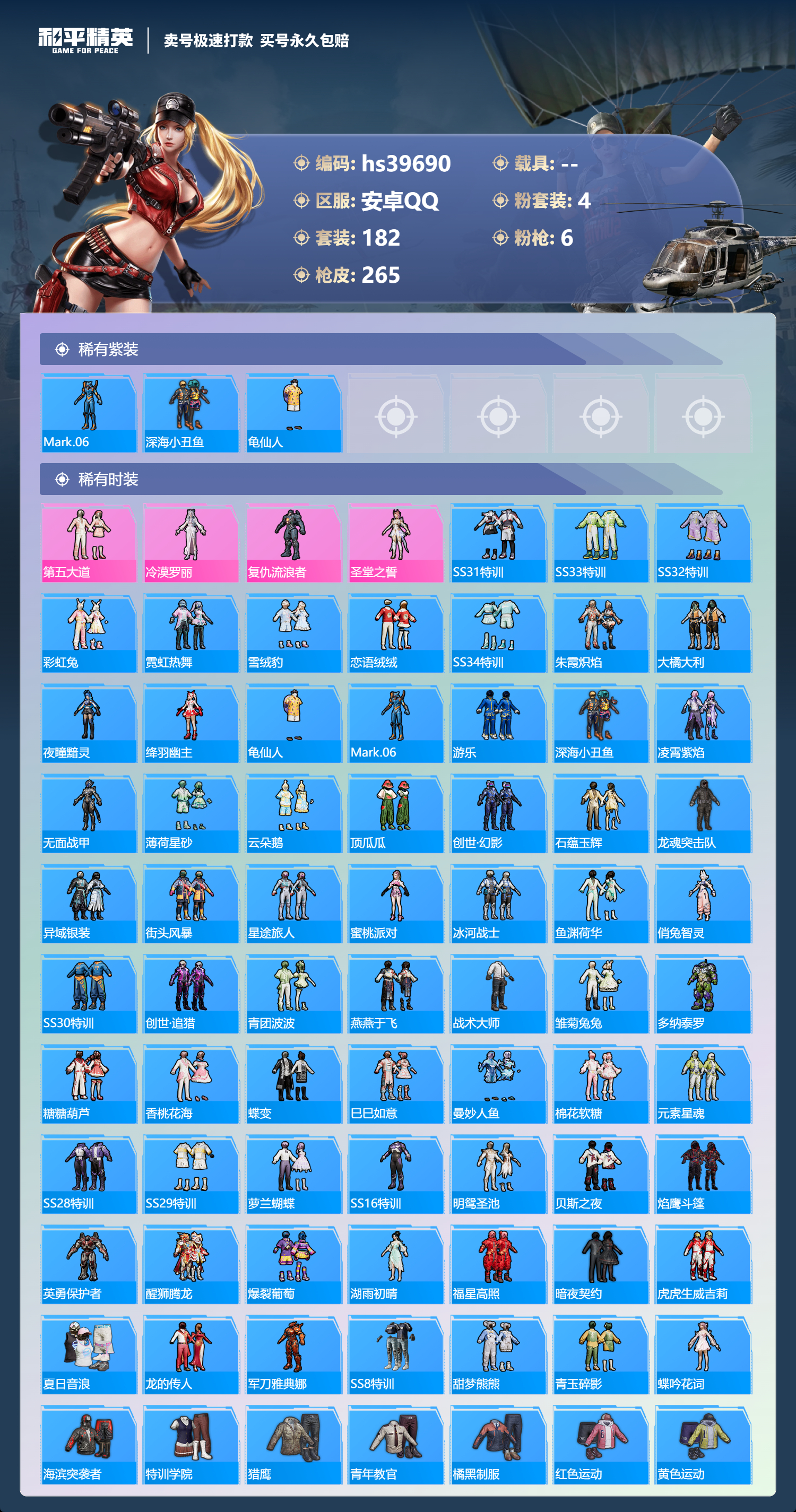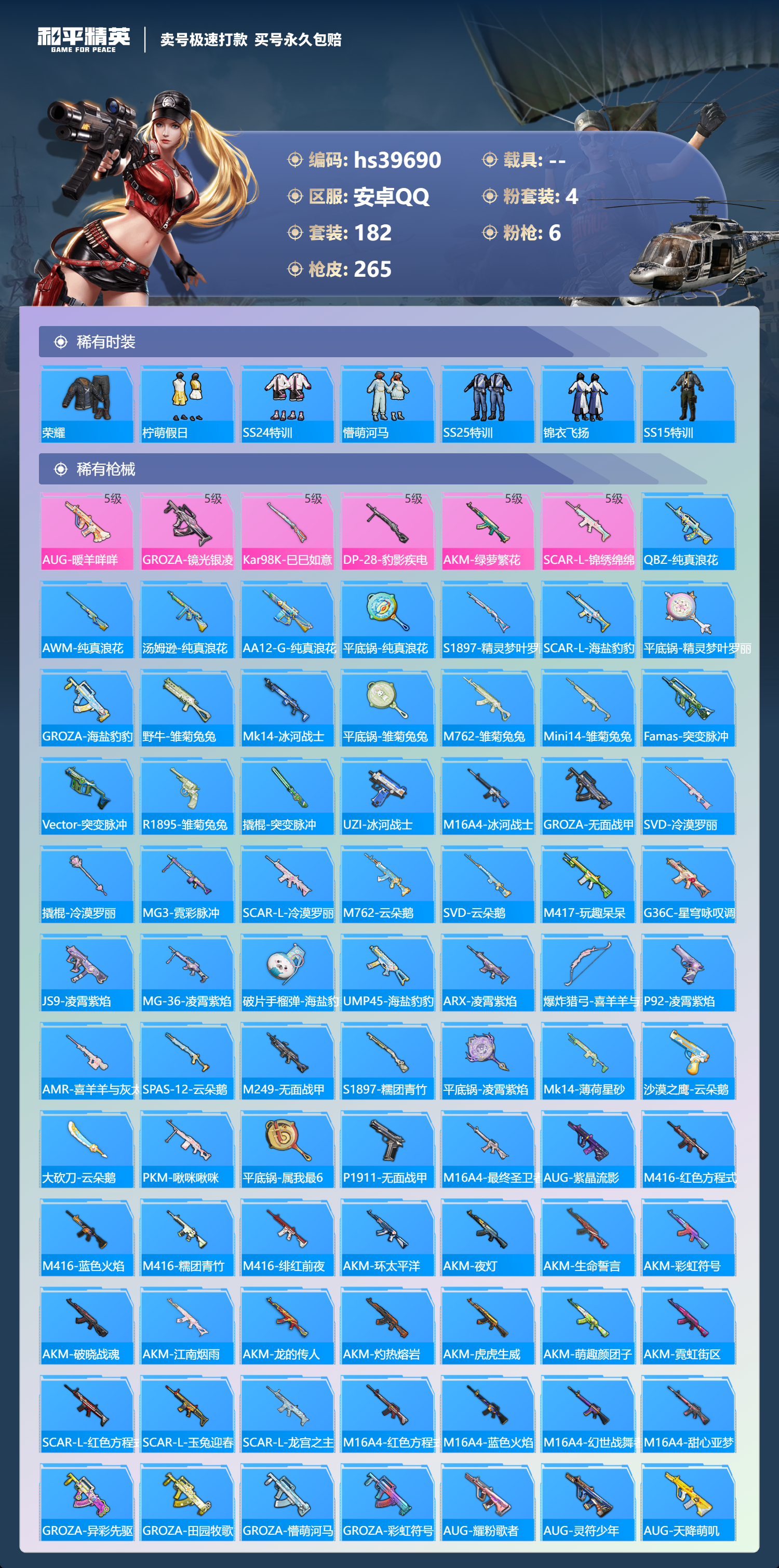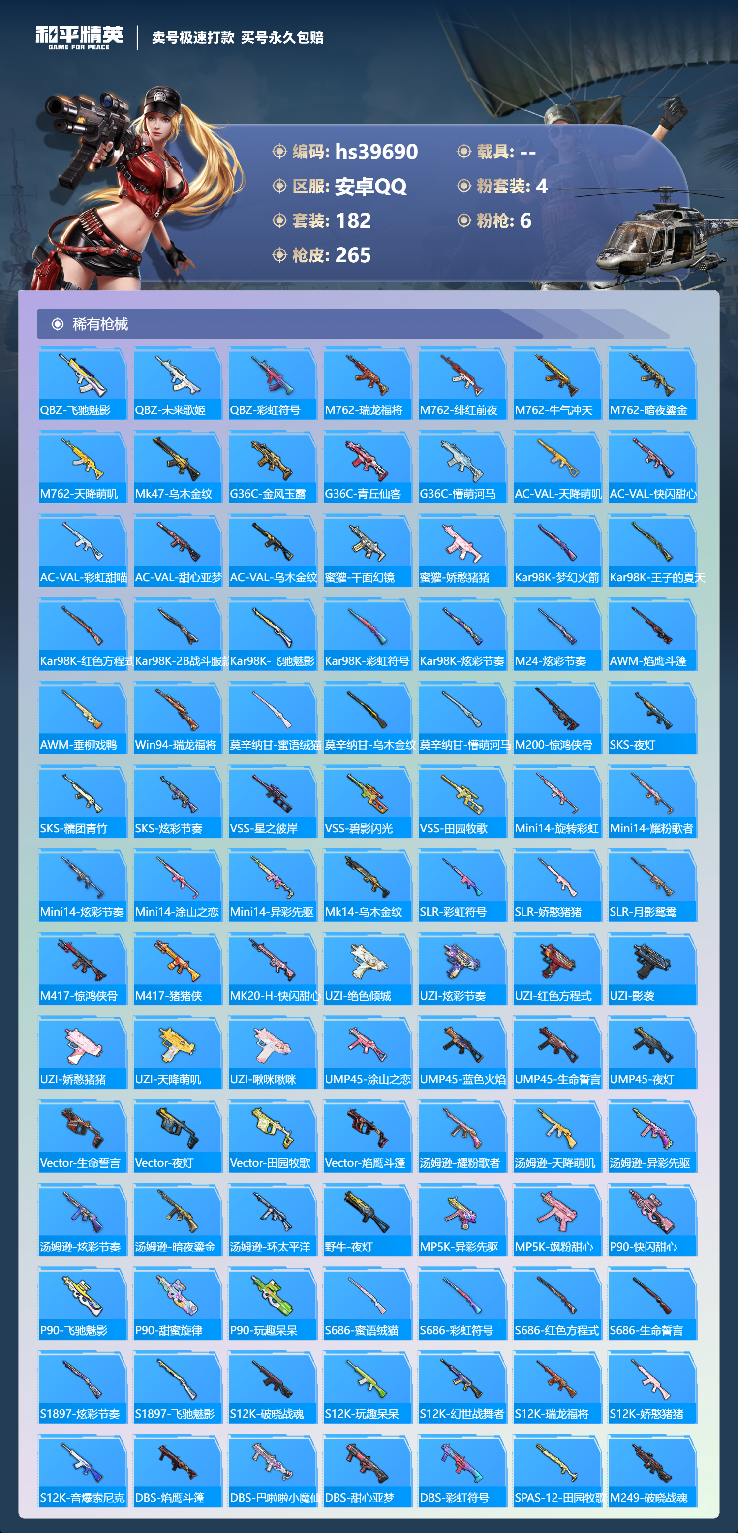 _2119782-安卓手q-16王牌印记-4粉装-6特效呛-0载具-83379热力值-182套装-265呛皮-1卓越印记-0传奇印记 【4粉装】第五大道冷漠罗丽复仇流浪者圣堂之誓 【6特效呛】akm-绿萝繁花-5级scar-l-锦绣绵绵-5级groza-镜光银凌-5级aug-暖羊咩咩-5级kar98k-巳巳如意-5级dp-28-豹影疾电-5级 【3稀有紫装】mark.06深海小丑鱼龟仙人 【182稀有时装】ss31特训ss33特训ss32特训彩虹兔霓虹热舞雪绒豹恋语绒绒ss34特训朱霞炽焰大橘大利夜瞳黯灵绛羽幽主龟仙人mark.06游乐深海小丑鱼凌霄紫焰无面战甲薄荷星砂云朵鹅顶瓜瓜创世·幻影石蕴玉辉龙魂突击队异域银装街头风暴星途旅人蜜桃派对冰河战士鱼渊荷华俏兔智灵ss30特训创世·追猎青团波波燕燕于飞战术大师雏菊兔兔多纳泰罗糖糖葫芦香桃花海蝶变巳巳如意曼妙人鱼棉花软糖元素星魂ss28特训ss29特训萝兰蝴蝶ss16特训明鸳圣池贝斯之夜焰鹰斗篷英勇保护者醒狮腾龙爆裂葡萄湖雨初晴福星高照暗夜契约虎虎生威吉莉夏日音浪龙的传人军刀雅典娜ss8特训甜梦熊熊青玉碎影蝶吟花词海滨突袭者特训学院猎鹰青年教官橘黑制服红色运动黄色运动蓝色运动极速竞梦黄色伏地魔飞驰魅影白色伏地魔音速流光热血青春酒红色名流湖蓝色名流黄色名流酷潮明星涂山之恋ss26特训空岛之星荧惑魅影热情海星黑色伏地魔炫蓝之夏纯真浪花骑行爱好者竞技名士蓝色守护者深蓝色名流猛禽长空猛禽竞技勇士朋克旭日情侣街头潮人冥星暗影冷焰舞者惊鸿侠骨魅力单车灼焰舞者云霞荷露春光漫游甜心亚梦虚音幻奏幻世战舞者战地督导青涩时光暖心熊熊牛气满满萌趣咩咩娇憨猪猪冰川特警滨海假日极速红龙麻辣教官冰冻风暴完美偶像人气偶像幽夜迷踪幻影武者破蛋小黄鸡快闪甜心酸甜橘柚北国孤狼蓝彩潮人千禧之恋绮丽涂鸦竞技达人朋克海岛探路者破晓战魂和煦暖阳霓虹街区田园牧歌都市魅力萌趣颜团子轻风白浪特种颜团子耀粉歌者ss27特训牛气冲天ss18特训飞行日记ss17特训瑞龙福将团圆交子金耀舞者缤纷焰火异彩先驱霓虹极客空投萌叽ss19特训ss20特训ss21特训玉兔迎春ss22特训ss23特训甜蜜熊情侣滨海厨神ss14特训电音精灵神气柴柴幻羽潜行海盐绵绵冰老实芭蕉王牌教练荣耀柠萌假日ss24特训懵萌河马ss25特训锦衣飞扬ss15特训 【265稀有呛械】q-纯真浪花awm-纯真浪花汤姆逊-纯真浪花dbs-乌木金纹aa12-g-纯真浪花平底锅-纯真浪花s1897-精灵梦叶罗丽scar-l-海盐豹豹平底锅-精灵梦叶罗丽groza-海盐豹豹aug-暖羊咩咩/5级groza-镜光银凌/5级kar98k-巳巳如意/5级dp-28-豹影疾电/5级野牛-雏菊兔兔mk14-冰河战士平底锅-雏菊兔兔m762-雏菊兔兔mini14-雏菊兔兔famas-突变脉冲vect-突变脉冲r1895-雏菊兔兔撬棍-突变脉冲uzi-冰河战士m16a4-冰河战士mk20-h-乌木金纹akm-绿萝繁花/5级scar-l-锦绣绵绵/5级groza-无面战甲svd-冷漠罗丽撬棍-冷漠罗丽mg3-霓彩脉冲scar-l-冷漠罗丽蜜獾-乌木金纹m762-云朵鹅svd-云朵鹅m417-玩趣呆呆g36c-星穹咏叹调js9-凌霄紫焰mg-36-凌霄紫焰破片手留单-海盐豹豹ump45-海盐豹豹arx-凌霄紫焰aks-74u-乌木金纹爆炸猎弓-喜羊羊与灰太狼p92-凌霄紫焰amr-喜羊羊与灰太狼famas-乌木金纹spas-12-云朵鹅m249-无面战甲s1897-糯团青竹平底锅-凌霄紫焰mk14-薄荷星砂沙墨之鹦-云朵鹅大砍刀-云朵鹅pkm-啾咪啾咪平底锅-属我最6p1911-无面战甲m16a4-最终圣卫者aug-紫晶流影m416-红色方程式m416-蓝色火焰m416-糯团青竹m416-绯红前夜akm-环太平洋akm-夜灯akm-生命誓言akm-彩虹符号akm-破晓战魂akm-江南烟雨akm-龙的传人akm-灼热熔岩akm-虎虎生威akm-萌趣颜团子akm-霓虹街区scar-l-红色方程式scar-l-玉兔迎春scar-l-龙宫之主m16a4-红色方程式m16a4-蓝色火焰m16a4-幻世战舞者m16a4-甜心亚梦groza-乌木金纹groza-异彩先驱groza-田园牧歌groza-懵萌河马groza-彩虹符号aug-耀粉歌者aug-灵符少年aug-天降萌叽q-飞驰魅影q-未来歌姬q-彩虹符号m762-瑞龙福将m762-绯红前夜m762-牛气冲天m762-暗夜鎏金m762-天降萌叽mk47-乌木金纹g36c-乌木金纹g36c-金风玉露g36c-青丘仙客g36c-懵萌河马ac-val-天降萌叽ac-val-快闪甜心ac-val-彩虹甜喵ac-val-甜心亚梦ac-val-乌木金纹蜜獾-千面幻镜蜜獾-娇憨猪猪kar98k-乌木金纹kar98k-梦幻火箭kar98k-王子的夏天kar98k-红色方程式kar98k-2b战斗服款kar98k-飞驰魅影kar98k-彩虹符号kar98k-炫彩节奏m24-乌木金纹m24-炫彩节奏awm-焰鹰斗篷awm-垂柳戏鸭win94-瑞龙福将莫辛纳甘-蜜语绒猫莫辛纳甘-乌木金纹莫辛纳甘-懵萌河马amr-乌木金纹m200-惊鸿侠骨sks-夜灯sks-糯团青竹sks-炫彩节奏vss-星之彼岸vss-碧影闪光vss-田园牧歌mini14-旋转彩虹mini14-耀粉歌者mini14-炫彩节奏mini14-涂山之恋mini14-异彩先驱mk14-乌木金纹slr-彩虹符号slr-娇憨猪猪slr-月影鸳鸯m417-惊鸿侠骨m417-猪猪侠mk20-h-快闪甜心uzi-绝色倾城uzi-炫彩节奏uzi-红色方程式uzi-影袭uzi-娇憨猪猪uzi-天降萌叽uzi-啾咪啾咪ump45-涂山之恋ump45-蓝色火焰ump45-生命誓言ump45-夜灯vect-生命誓言vect-夜灯vect-田园牧歌vect-焰鹰斗篷汤姆逊-耀粉歌者汤姆逊-天降萌叽汤姆逊-异彩先驱汤姆逊-炫彩节奏汤姆逊-暗夜鎏金汤姆逊-环太平洋野牛-乌木金纹野牛-夜灯mp5k-异彩先驱mp5k-乌木金纹mp5k-飒粉甜心p90-乌木金纹p90-快闪甜心p90-飞驰魅影p90-甜蜜旋律p90-玩趣呆呆s686-蜜语绒猫s686-彩虹符号s686-红色方程式s686-生命誓言s1897-乌木金纹s1897-炫彩节奏s1897-飞驰魅影s12k-破晓战魂s12k-玩趣呆呆s12k-幻世战舞者s12k-乌木金纹s12k-瑞龙福将s12k-娇憨猪猪s12k-