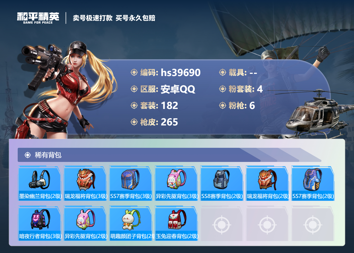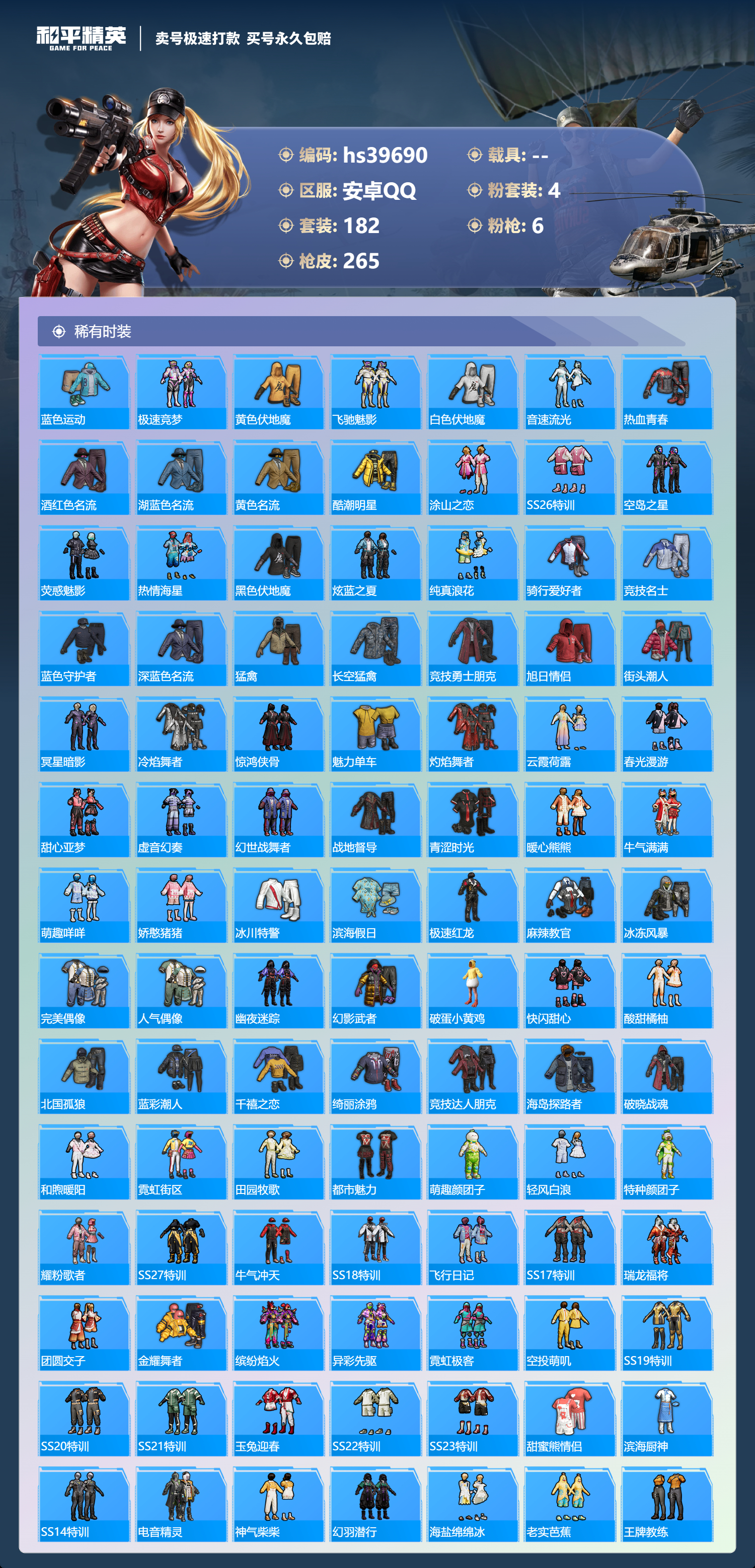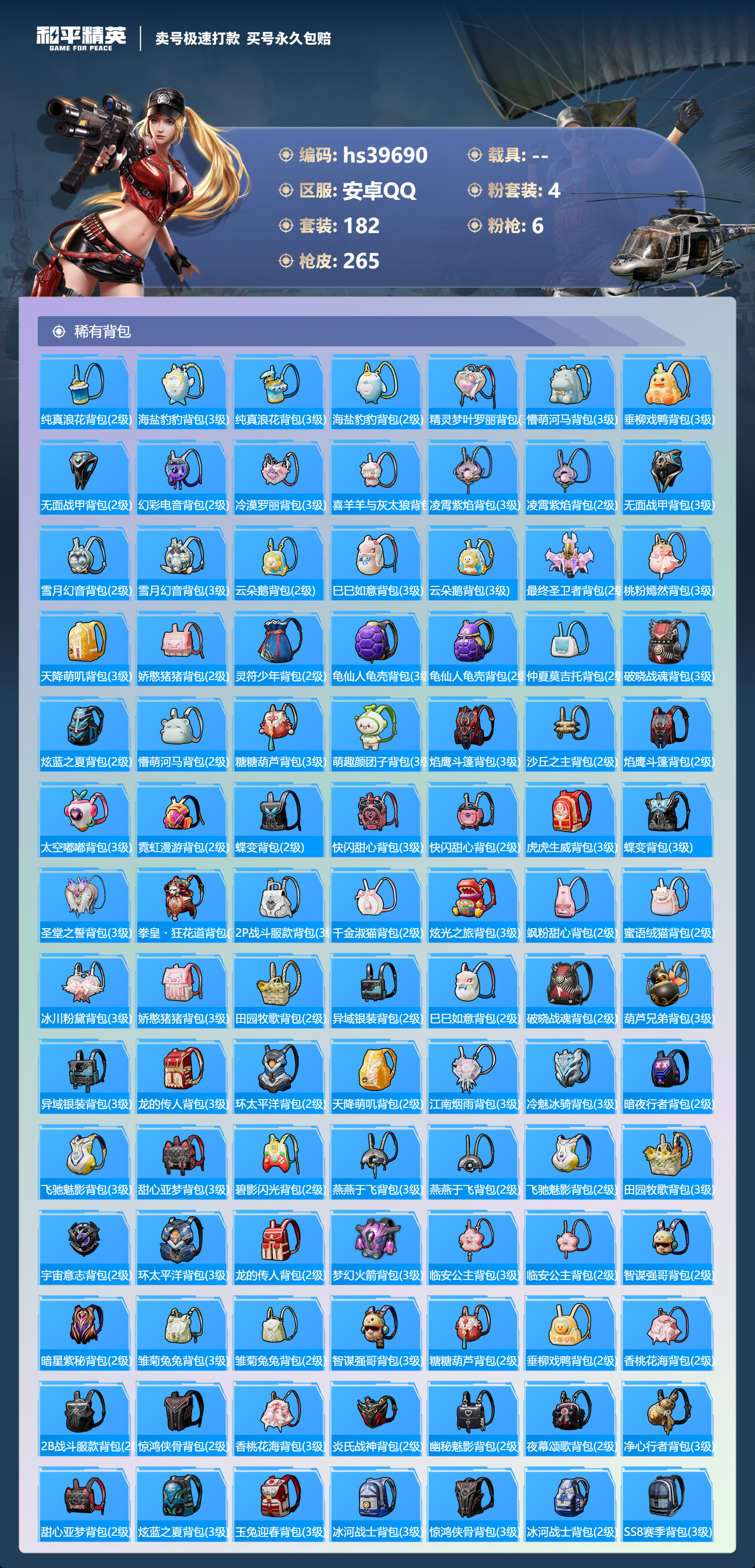 _2119782-安卓手q-16王牌印记-4粉装-6特效呛-0载具-83379热力值-182套装-265呛皮-1卓越印记-0传奇印记 【4粉装】第五大道冷漠罗丽复仇流浪者圣堂之誓 【6特效呛】akm-绿萝繁花-5级scar-l-锦绣绵绵-5级groza-镜光银凌-5级aug-暖羊咩咩-5级kar98k-巳巳如意-5级dp-28-豹影疾电-5级 【3稀有紫装】mark.06深海小丑鱼龟仙人 【182稀有时装】ss31特训ss33特训ss32特训彩虹兔霓虹热舞雪绒豹恋语绒绒ss34特训朱霞炽焰大橘大利夜瞳黯灵绛羽幽主龟仙人mark.06游乐深海小丑鱼凌霄紫焰无面战甲薄荷星砂云朵鹅顶瓜瓜创世·幻影石蕴玉辉龙魂突击队异域银装街头风暴星途旅人蜜桃派对冰河战士鱼渊荷华俏兔智灵ss30特训创世·追猎青团波波燕燕于飞战术大师雏菊兔兔多纳泰罗糖糖葫芦香桃花海蝶变巳巳如意曼妙人鱼棉花软糖元素星魂ss28特训ss29特训萝兰蝴蝶ss16特训明鸳圣池贝斯之夜焰鹰斗篷英勇保护者醒狮腾龙爆裂葡萄湖雨初晴福星高照暗夜契约虎虎生威吉莉夏日音浪龙的传人军刀雅典娜ss8特训甜梦熊熊青玉碎影蝶吟花词海滨突袭者特训学院猎鹰青年教官橘黑制服红色运动黄色运动蓝色运动极速竞梦黄色伏地魔飞驰魅影白色伏地魔音速流光热血青春酒红色名流湖蓝色名流黄色名流酷潮明星涂山之恋ss26特训空岛之星荧惑魅影热情海星黑色伏地魔炫蓝之夏纯真浪花骑行爱好者竞技名士蓝色守护者深蓝色名流猛禽长空猛禽竞技勇士朋克旭日情侣街头潮人冥星暗影冷焰舞者惊鸿侠骨魅力单车灼焰舞者云霞荷露春光漫游甜心亚梦虚音幻奏幻世战舞者战地督导青涩时光暖心熊熊牛气满满萌趣咩咩娇憨猪猪冰川特警滨海假日极速红龙麻辣教官冰冻风暴完美偶像人气偶像幽夜迷踪幻影武者破蛋小黄鸡快闪甜心酸甜橘柚北国孤狼蓝彩潮人千禧之恋绮丽涂鸦竞技达人朋克海岛探路者破晓战魂和煦暖阳霓虹街区田园牧歌都市魅力萌趣颜团子轻风白浪特种颜团子耀粉歌者ss27特训牛气冲天ss18特训飞行日记ss17特训瑞龙福将团圆交子金耀舞者缤纷焰火异彩先驱霓虹极客空投萌叽ss19特训ss20特训ss21特训玉兔迎春ss22特训ss23特训甜蜜熊情侣滨海厨神ss14特训电音精灵神气柴柴幻羽潜行海盐绵绵冰老实芭蕉王牌教练荣耀柠萌假日ss24特训懵萌河马ss25特训锦衣飞扬ss15特训 【265稀有呛械】q-纯真浪花awm-纯真浪花汤姆逊-纯真浪花dbs-乌木金纹aa12-g-纯真浪花平底锅-纯真浪花s1897-精灵梦叶罗丽scar-l-海盐豹豹平底锅-精灵梦叶罗丽groza-海盐豹豹aug-暖羊咩咩/5级groza-镜光银凌/5级kar98k-巳巳如意/5级dp-28-豹影疾电/5级野牛-雏菊兔兔mk14-冰河战士平底锅-雏菊兔兔m762-雏菊兔兔mini14-雏菊兔兔famas-突变脉冲vect-突变脉冲r1895-雏菊兔兔撬棍-突变脉冲uzi-冰河战士m16a4-冰河战士mk20-h-乌木金纹akm-绿萝繁花/5级scar-l-锦绣绵绵/5级groza-无面战甲svd-冷漠罗丽撬棍-冷漠罗丽mg3-霓彩脉冲scar-l-冷漠罗丽蜜獾-乌木金纹m762-云朵鹅svd-云朵鹅m417-玩趣呆呆g36c-星穹咏叹调js9-凌霄紫焰mg-36-凌霄紫焰破片手留单-海盐豹豹ump45-海盐豹豹arx-凌霄紫焰aks-74u-乌木金纹爆炸猎弓-喜羊羊与灰太狼p92-凌霄紫焰amr-喜羊羊与灰太狼famas-乌木金纹spas-12-云朵鹅m249-无面战甲s1897-糯团青竹平底锅-凌霄紫焰mk14-薄荷星砂沙墨之鹦-云朵鹅大砍刀-云朵鹅pkm-啾咪啾咪平底锅-属我最6p1911-无面战甲m16a4-最终圣卫者aug-紫晶流影m416-红色方程式m416-蓝色火焰m416-糯团青竹m416-绯红前夜akm-环太平洋akm-夜灯akm-生命誓言akm-彩虹符号akm-破晓战魂akm-江南烟雨akm-龙的传人akm-灼热熔岩akm-虎虎生威akm-萌趣颜团子akm-霓虹街区scar-l-红色方程式scar-l-玉兔迎春scar-l-龙宫之主m16a4-红色方程式m16a4-蓝色火焰m16a4-幻世战舞者m16a4-甜心亚梦groza-乌木金纹groza-异彩先驱groza-田园牧歌groza-懵萌河马groza-彩虹符号aug-耀粉歌者aug-灵符少年aug-天降萌叽q-飞驰魅影q-未来歌姬q-彩虹符号m762-瑞龙福将m762-绯红前夜m762-牛气冲天m762-暗夜鎏金m762-天降萌叽mk47-乌木金纹g36c-乌木金纹g36c-金风玉露g36c-青丘仙客g36c-懵萌河马ac-val-天降萌叽ac-val-快闪甜心ac-val-彩虹甜喵ac-val-甜心亚梦ac-val-乌木金纹蜜獾-千面幻镜蜜獾-娇憨猪猪kar98k-乌木金纹kar98k-梦幻火箭kar98k-王子的夏天kar98k-红色方程式kar98k-2b战斗服款kar98k-飞驰魅影kar98k-彩虹符号kar98k-炫彩节奏m24-乌木金纹m24-炫彩节奏awm-焰鹰斗篷awm-垂柳戏鸭win94-瑞龙福将莫辛纳甘-蜜语绒猫莫辛纳甘-乌木金纹莫辛纳甘-懵萌河马amr-乌木金纹m200-惊鸿侠骨sks-夜灯sks-糯团青竹sks-炫彩节奏vss-星之彼岸vss-碧影闪光vss-田园牧歌mini14-旋转彩虹mini14-耀粉歌者mini14-炫彩节奏mini14-涂山之恋mini14-异彩先驱mk14-乌木金纹slr-彩虹符号slr-娇憨猪猪slr-月影鸳鸯m417-惊鸿侠骨m417-猪猪侠mk20-h-快闪甜心uzi-绝色倾城uzi-炫彩节奏uzi-红色方程式uzi-影袭uzi-娇憨猪猪uzi-天降萌叽uzi-啾咪啾咪ump45-涂山之恋ump45-蓝色火焰ump45-生命誓言ump45-夜灯vect-生命誓言vect-夜灯vect-田园牧歌vect-焰鹰斗篷汤姆逊-耀粉歌者汤姆逊-天降萌叽汤姆逊-异彩先驱汤姆逊-炫彩节奏汤姆逊-暗夜鎏金汤姆逊-环太平洋野牛-乌木金纹野牛-夜灯mp5k-异彩先驱mp5k-乌木金纹mp5k-飒粉甜心p90-乌木金纹p90-快闪甜心p90-飞驰魅影p90-甜蜜旋律p90-玩趣呆呆s686-蜜语绒猫s686-彩虹符号s686-红色方程式s686-生命誓言s1897-乌木金纹s1897-炫彩节奏s1897-飞驰魅影s12k-破晓战魂s12k-玩趣呆呆s12k-幻世战舞者s12k-乌木金纹s12k-瑞龙福将s12k-娇憨猪猪s12k-