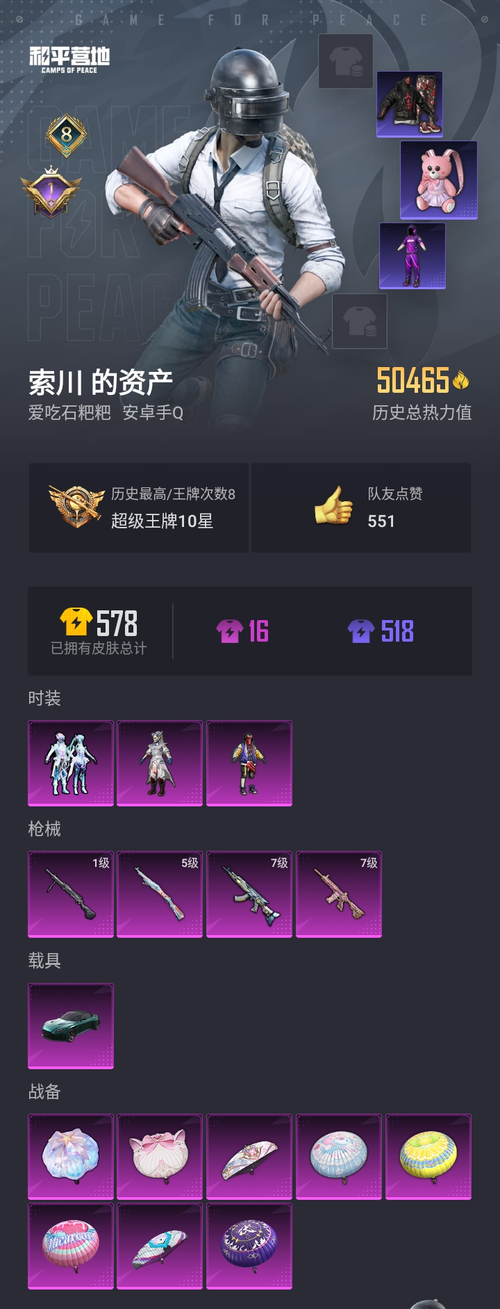 【和平精英】【lyhp9876】3粉装4特效呛1载具 银刃赛罗 赤蝎幽灵 战队服 满级m4心之恋语 满级m762激战未来 阿斯顿马丁 3粉装,4特效呛,1载具,历史最高段位:超级王牌10星 王牌印记8次 热力值:50465,120套装,146呛械,207装备,81战备;套装:套装-天禅智恒,套装-银刃赛罗,套装-幻彩电音,套装-黄色运动,套装-蓝色运动,套装-白色伏地魔,套装-黑色伏地魔,套装-骑行爱好者,套装-竞技名士,套装-深蓝色名流,套装-猛禽,套装-长空猛禽,套装-竞技勇士朋克,套装-黎明保卫者,套装-蓝色守护者,套装-海岛探路者,套装-赤蝎幽灵,套装-甜蜜告白,套装-蓝彩潮人,套装-酷萌兔限定,套装-怒火燎原,套装-魅力单车,套装-耀眼新星,套装-坚韧舞者,套装-超能勇士,套装-森林游猎者,套装-雪山精英,套装-传奇侦探,套装-迅捷狂鲨,套装-甜蜜熊情侣,套装-缤纷果语,套装-龙魂突击队,套装-冰川特警,套装-格斗先锋,套装-破蛋小黄鸡,套装-疯狂小兔子,套装-深蓝冒险家,套装-迷域探索者,套装-红酒骑士,套装-北国孤狼,套装-ss6特训,套装-拳皇97八神庵,套装-炽焰拳师,套装-格斗专家,套装-奇迹天团,套装-仓鼠灰灰,套装-跃动心情,套装-ss7特训,套装-霓虹街区,套装-暗夜契约,套装-纯白誓言,套装-ss8特训,套装-大橘为重,套装-白熊同盟,套装-萌黄之夏,套装-夏日音浪,套装-ss9特训,套装-风华少年志,套装-nv战队服,套装-牛气满满,套装-梦之呓语,套装-ss11特训,套装-原初圣火,套装-逆风勇士,套装-战术大师,套装-ss12特训,套装-牛气冲天,套装-耀粉歌者,套装-治愈之星,套装-科技之星,套装-ss13特训,套装-曼妙人鱼,套装-热情海星,套装-纯真浪花,套装-冰爽海盐,套装-ss14特训,套装-吉莉礼服,套装-福星高照,套装-龟仙人,套装-香桃花海,套装-冰河战士,套装-ss26特训,套装-快闪甜心,套装-春光漫游,套装-空岛之星,套装-童真绒兔,套装-萌趣绒叽,套装-焰鹰斗篷,套装-幻羽潜行,套装-ss27特训,套装-恋语绒绒,套装-ss28特训,角色-达芬奇,角色-白光莹,角色-情公主,角色-冰公主,套装-街头风暴,套装-海盐绵绵冰,套装-ss29特训,套装-雏菊兔兔,套装-萝兰蝴蝶,套装-异域银装,套装-星途旅人,套装-ss30特训,套装-青团波波,套装-棉花软糖,套装-糖糖葫芦,套装-ss31特训,套装-鱼渊荷华,套装-燕燕于飞,套装-智谋强哥,套装-ss33特训,套装-云朵鹅,套装-巳巳如意,套装-ss32特训,套装-顶瓜瓜,套装-雪绒豹,套装-大橘大利,套装-霓虹热舞,套装-ss34特训;呛皮:akm-春暖花开,akm-夜灯,m16a4-红色方程式,m16a4-夜灯,m16a4-幻世战舞者,m16a4-冰河战士,m16a4-乌木金纹,scar-l-红色方程式,scar-l-黄金龙骨,scar-l-海盐豹豹,scar-l-乌木金纹,7级m416-心之恋语,m416-仓鼠灰灰,m416-糯团青竹,groza-治愈之星,groza-乌木金纹,aug-异域银装,aug-乌木金纹,q-原初圣火,q-纯真浪花,q-乌木金纹,7级m762-激战未来,m762-绯红前夜,m762-拳皇97,m762-牛气冲天,m762-动感兔斯基,m762-雏菊兔兔,m762-云朵鹅,g36c-不夜海上花,ac-val-快闪甜心,蜜獾-精灵梦叶罗丽,蜜獾-糖糖葫芦,蜜獾-乌木金纹,famas-乌木金纹,5级kar98k-巳巳如意,kar98k-勇闯险境,kar98k-彩虹符号,m24-动感兔斯基,m24-治愈之星,m24-乌木金纹,awm-黄金龙骨,awm-激战未来,awm-圣堂之誓,awm-焰鹰斗篷,awm-纯真浪花,awm-乌木金纹,amr-乌木金纹,m200-乌木金纹,svd-云朵鹅,sks-夜灯,sks-勇闯险境,sks-心之恋语,vss-繁花小夜曲,vss-香桃花海,vss-乌木金纹,mini14-梦幻火箭,mini14-原初圣火,mini14-香桃花海,mini14-雏菊兔兔,mk14-治愈之星,mk14-冰河战士,qbu-不夜海上花,mk20-h-快闪甜心,mk20-h-糖糖葫芦,mk20-h-乌木金纹,uzi-红色方程式,uzi-众神之王,uzi-逆行者qq,uzi-天降萌叽,uzi-冰河战士,uzi-啾咪啾咪,ump45-生命誓言,ump45-海盐豹豹,ump45-糖糖葫芦,ump45-乌木金纹,vect-生命誓言,vect-彩虹符号,vect-治愈之星,vect-焰鹰斗篷,vect-燕燕于飞,vect-乌木金纹,汤姆逊-勇闯险境,汤姆逊-炫彩节奏,汤姆逊-纯真浪花,汤姆逊-乌木金纹,野牛-雏菊兔兔,野牛-燕燕于飞,mp5k-乌木金纹,p90-快闪甜心,p90-玩趣呆呆,p90-巳巳如意,s686-红色方程式,s686-生命誓言,s686-千金淑猫,s1897-春暖花开,s1897-勇闯险境,s1897-精灵梦叶罗丽,s12k-乌木金纹,dbs-焰鹰斗篷,dbs-幻彩电音,dbs-乌木金纹,aa12-g-纯真浪花,spas-12-燕燕于飞,spas-12-云朵鹅,spas-12-乌木金纹,m249-拳皇97,m249-乌木金纹,1级dp-28-豹影疾电,dp-28-沙漠守护者,dp-28-原初圣火,dp-28-焰鹰斗篷,mg3-幻世战舞者,pkm-啾咪啾咪,p92-拳皇97,p92-尼罗河传说,r1895-雏菊兔兔,p18c-原初圣火,p18c-糖糖葫芦,蝎式手呛-燕燕于飞,沙墨之鹦-快闪甜心,沙墨之鹦-云朵鹅,大砍刀-云朵鹅,撬棍-传奇侦探,撬棍-突变脉冲,平底锅-拳皇97,平底锅-仓鼠灰灰,平底锅-勇闯险境,平底锅-不夜海上花,平底锅-伏魔团,平底锅-原初圣火,平底锅-治愈之星,平底锅-快闪甜心,平底锅-空岛之星,平底锅-焰鹰斗篷,平底锅-精灵梦叶罗丽,平底锅-纯真浪花,平底锅-雏菊兔兔,平底锅-糖糖葫芦,平底锅-属我最6,十子怒-燕燕于飞,十子怒-异域银装,破片手留单-圣诞大吉,破片手留单-呆爆全场,破片手留单-星途旅人,破片手留单-海盐豹豹,破片手留单-巳巳如意;载具:阿斯顿·马丁dbs绿;降落伞:伏魔团降落伞,四圣焕新降落伞,马卡龙降落伞,香水柠檬降落伞,彩虹甜喵降落伞,精灵梦叶罗丽降落伞,千金淑猫降落伞,荧海星豚降落伞,彩虹勇气降落伞,赤蝎幽灵降落伞,蓝海之火降落伞,白昼之火降落伞,寂夜之火降落伞,化学天才降落伞,钢铁雄心降落伞,勇闯险境降落伞,比翼双飞降落伞,拳皇97降落伞,仓