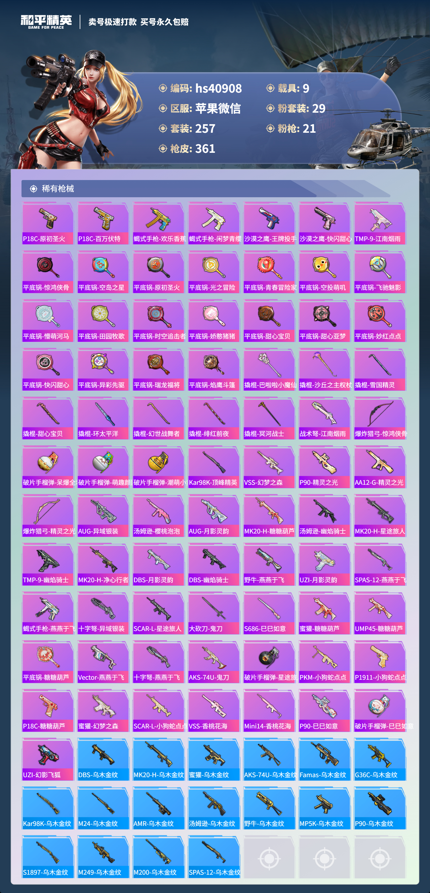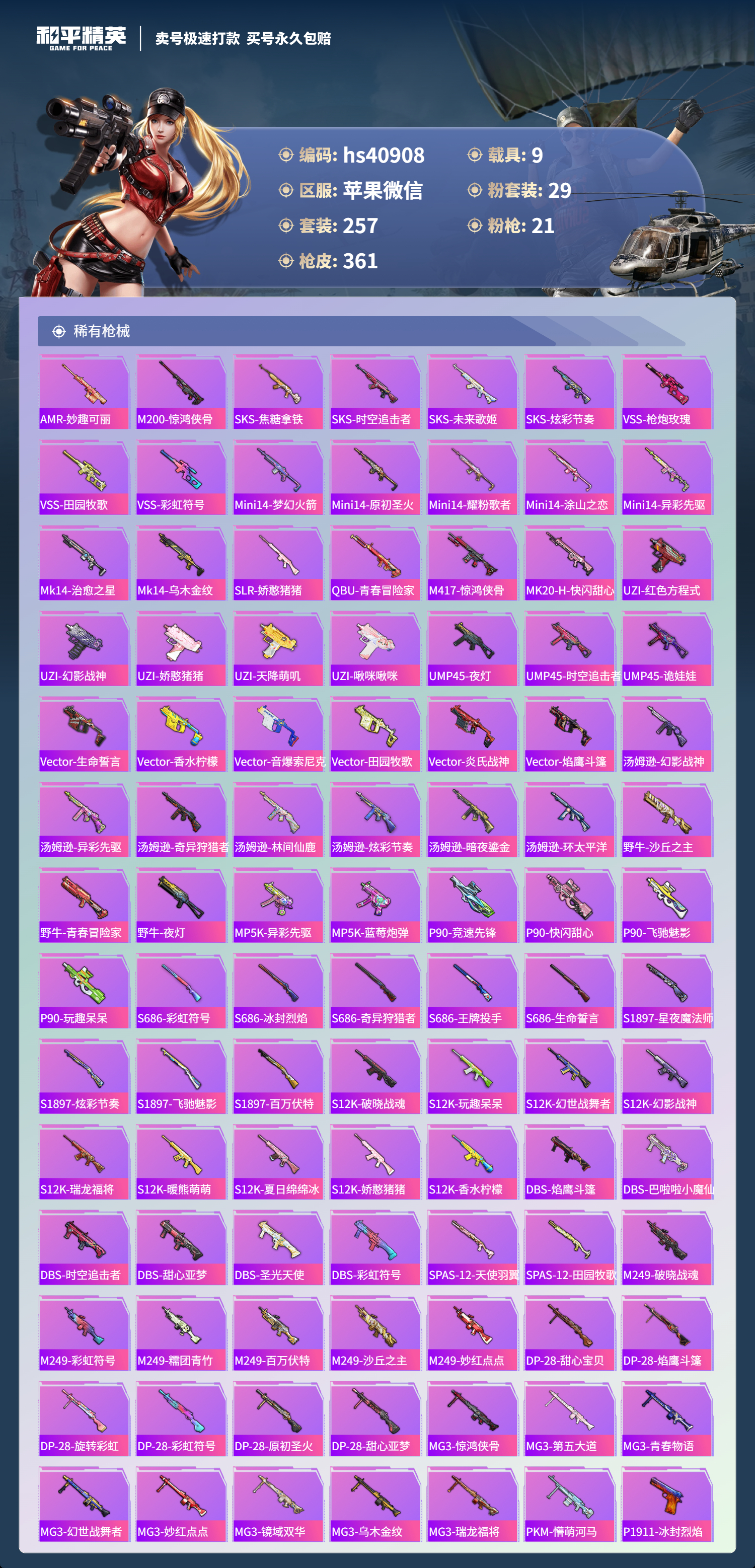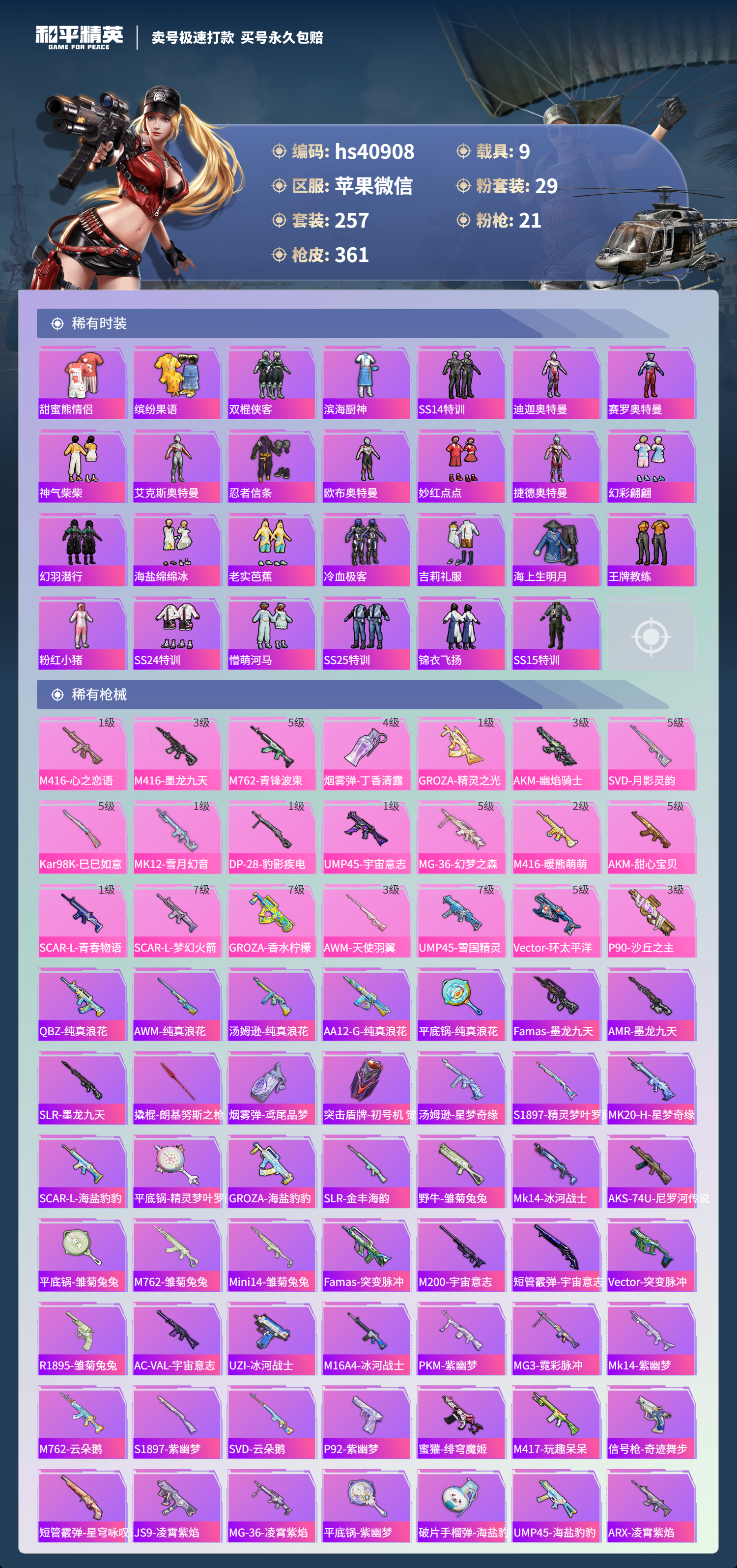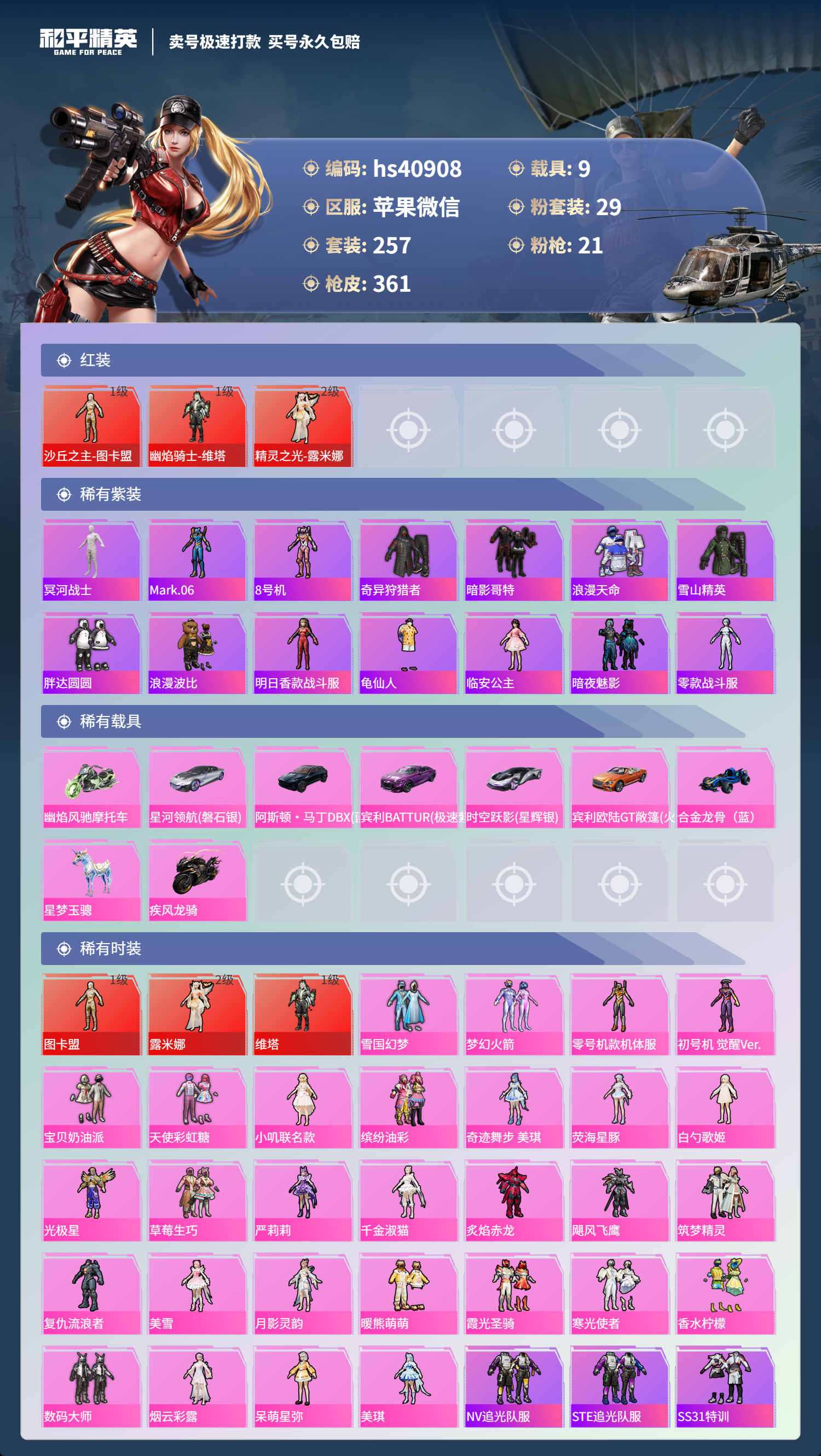 _2132727-苹果微信-20王牌印记-29粉装-21特效呛-9载具-热力值-257套装-361呛皮-1卓越印记-0传奇印记 【29粉装】雪国幻梦梦幻火箭零号机款机体服初号机觉醒ver.宝贝奶油派天使彩虹糖小叽联名款缤纷油彩奇迹舞步美琪荧海星豚白勺歌姬光极星草莓生巧严莉莉千金淑猫炙焰赤龙飓风飞鹰筑梦精灵复仇流浪者美雪月影灵韵暖熊萌萌霞光圣骑寒光使者香水柠檬数码大师烟云彩露呆萌星弥美琪 【21特效呛】akm-甜心宝贝-5级akm-幽焰骑士-3级scar-l-青春物语-1级scar-l-梦幻火箭-7级m416-心之恋语-1级m416-暖熊萌萌-2级m416-墨龙九天-3级groza-香水柠檬-7级groza-精灵之光-1级m762-青锋波束-5级kar98k-巳巳如意-5级awm-天使羽翼-3级svd-月影灵韵-5级mk12-雪月幻音-1级ump45-宇宙意志-1级ump45-雪国精灵-7级vect-环太平洋-5级p90-沙丘之主-3级dp-28-豹影疾电-1级mg-36-幻梦之森-5级盐雾蛋-丁香清露-4级 【3红装】沙丘之主-图卡盟/1级幽焰骑士-维塔/1级精灵之光-露米娜/2级 【14稀有紫装】冥河战士mark.068号机奇异狩猎者暗影哥特浪漫天命雪山精英胖达圆圆浪漫波比明日香款战斗服龟仙人临安公主暗夜魅影零款战斗服 【9稀有载具】幽焰风驰摩托车星河领航磐石银阿斯顿·马丁dbx蓝宾利battur极速紫)时空跃影星辉银宾利欧陆gt敞篷火焰橘合金龙骨(蓝)星梦玉骢疾风龙骑 【258稀有时装】图卡盟/1级露米娜/2级维塔/1级nv追光队服ste追光队服ss31特训ss33特训ss32特训彩虹兔蓝冰羽乐音雪绒豹恋语绒绒玫纹锢梦ss34特训朱霞炽焰紫幽梦大橘大利浪漫天命暗夜魅影奇异狩猎者龟仙人mark.06临安公主雪山精英游乐暗影哥特8号机零款战斗服明日香款战斗服胖达圆圆浪漫波比凌霄紫焰小鸟芋圆薄荷星砂粉恋花云朵鹅冥河战士顶瓜瓜创世·幻影兔兔白日梦狂战萌兔酷熊伴侣潮萌小黄鸭粉雾星云黑色高级特训官上衣鹿角斗士龙魂突击队卖崽青蛙异域银装疾锋精英暗夜风云狂花道·娜可露露街头风暴星途旅人光矢逐梦冰河战士鱼渊荷华俏兔智灵ss30特训青团波波燕燕于飞海琴烟达芬奇战术大师智谋强哥雏菊兔兔辉光之湖糖糖葫芦小狗蛇点点香桃花海蝶变巳巳如意棉花软糖极地流光ss28特训银尘ss29特训萝兰蝴蝶ss16特训暴风机械师无暇誓言时空追击者星辰守护者星际旅行舰行太空焰鹰斗篷英勇保护者水晶王族爆裂葡萄湖雨初晴福星高照都市漫游者虎虎生威吉莉夏日音浪龙的传人白熊同盟日冕精灵星谷精灵蓝色运动极速竞梦飞驰魅影白色伏地魔音速流光帅气教官湖蓝色名流酷潮明星绯格组合抹茶蜜豆ss26特训薄荷蓝莓空岛之星热情海星黑色伏地魔黎明保卫者纯真浪花竞技名士银月精灵长空猛禽特战装甲山经魅狐粉团憨憨灰色格斗者软羊咩咩怒火燎原冷焰舞者惊鸿侠骨王牌投手春光漫游猎梦纪元甜心亚梦虚音幻奏nv战队服贵族骑装幻世战舞者甜蜜菠萝特殊使命街舞之王香草威化青涩时光青春校园牛气满满萌趣咩咩娇憨猪猪冰川特警龙腾端午燃烧卡路里幻影公爵滨海假日wifi精灵沙漠毒蛇红熊茄茄沙暴袭击者完美偶像诡面顽熊梦魇先生青春冒险家潮流游乐家快闪甜心蓝彩潮人千禧之恋神秘领域绮丽涂鸦竞技达人朋克原初圣火逆风勇士霓虹街区田园牧歌萌趣颜团子轻风白浪特种颜团子沙漠兵团耀粉歌者风华少年志探宝勇士ss12特训ss27特训牛气冲天ss18特训清新柠檬ss17特训瑞龙福将团圆交子金耀舞者蓝调潮人熠彩粉晶缤纷焰火异彩先驱霓虹极客空投萌叽ss19特训光之冒险ss20特训ss21特训玉兔迎春弄潮海豚深海梦境ss22特训ss23特训呆萌铁蟹冰爽海盐浪漫樱花甜蜜熊情侣缤纷果语双棍侠客滨海厨神ss14特训迪迦奥特曼赛罗奥特曼神气柴柴艾克斯奥特曼忍者信条欧布奥特曼妙红点点捷德奥特曼幻彩翩翩幻羽潜行海盐绵绵冰老实芭蕉冷血极客吉莉礼服海上生明月王牌教练粉红小猪ss24特训懵萌河马ss25特训锦衣飞扬ss15特训 【361稀有呛械】m416-心之恋语/1级q-纯真浪花awm-纯真浪花汤姆逊-纯真浪花dbs-乌木金纹aa12-g-纯真浪花平底锅-纯真浪花m416-墨龙九天/3级famas-墨龙九天amr-墨龙九天slr-墨龙九天撬棍-朗基努斯之呛盐雾蛋-鸢尾晶梦突击盾牌-初号机觉醒ver.汤姆逊-星梦奇缘s1897-精灵梦叶罗丽mk20-h-星梦奇缘scar-l-海盐豹豹平底锅-精灵梦叶罗丽groza-海盐豹豹m762-青锋波束/5级盐雾蛋-丁香清露/4级groza-精灵之光/1级akm-幽焰骑士/3级svd-月影灵韵/5级kar98k-巳巳如意/5级mk12-雪月幻音/1级dp-28-豹影疾电/1级ump45-宇宙意志/1级mg-36-幻梦之森/5级slr-金丰海韵野牛-雏菊兔兔mk14-冰河战士aks-74u-尼罗河传说平底锅-雏菊兔兔m762-雏菊兔兔mini14-雏菊兔兔famas-突变脉冲m200-宇宙意志短管霰弹-宇宙意志vect-突变脉冲r1895-雏菊兔兔ac-val-宇宙意志uzi-冰河战士m16a4-冰河战士mk20-h-乌木金纹m416-暖熊萌萌/2级akm-甜心宝贝/5级scar-l-青春物语/1级scar-l-梦幻火箭/7级groza-香水柠檬/7级awm-天使羽翼/3级ump45-雪国精灵/7级vect-环太平洋/5级p90-沙丘之主/3级pkm-紫幽梦mg3-霓彩脉冲mk14-紫幽梦蜜獾-乌木金纹m762-云朵鹅s1897-紫幽梦svd-云朵鹅p92-紫幽梦蜜獾-绯穹魔姬m417-玩趣呆呆信号呛-奇迹舞步短管霰弹-星穹咏叹调js9-凌霄紫焰mg-36-凌霄紫焰平底锅-紫幽梦破片手留单-海盐豹豹ump45-海盐豹豹arx-凌霄紫焰aks-74u-乌木金纹p92-凌霄紫焰famas-乌木金纹spas-12-云朵鹅m249-无面战甲s1897-糯团青竹平底锅-凌霄紫焰mk14-薄荷星砂aks-74u-鸡智如我汤姆逊-智耀战神沙墨之鹦-云朵鹅盐雾蛋-冰氧夏