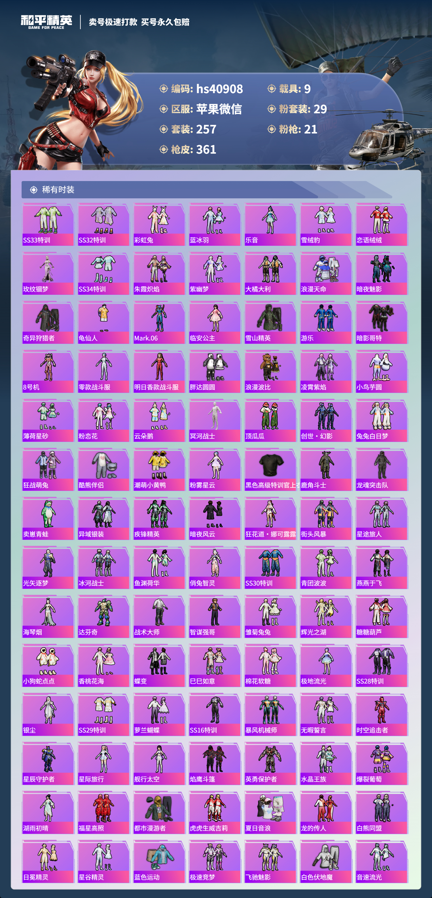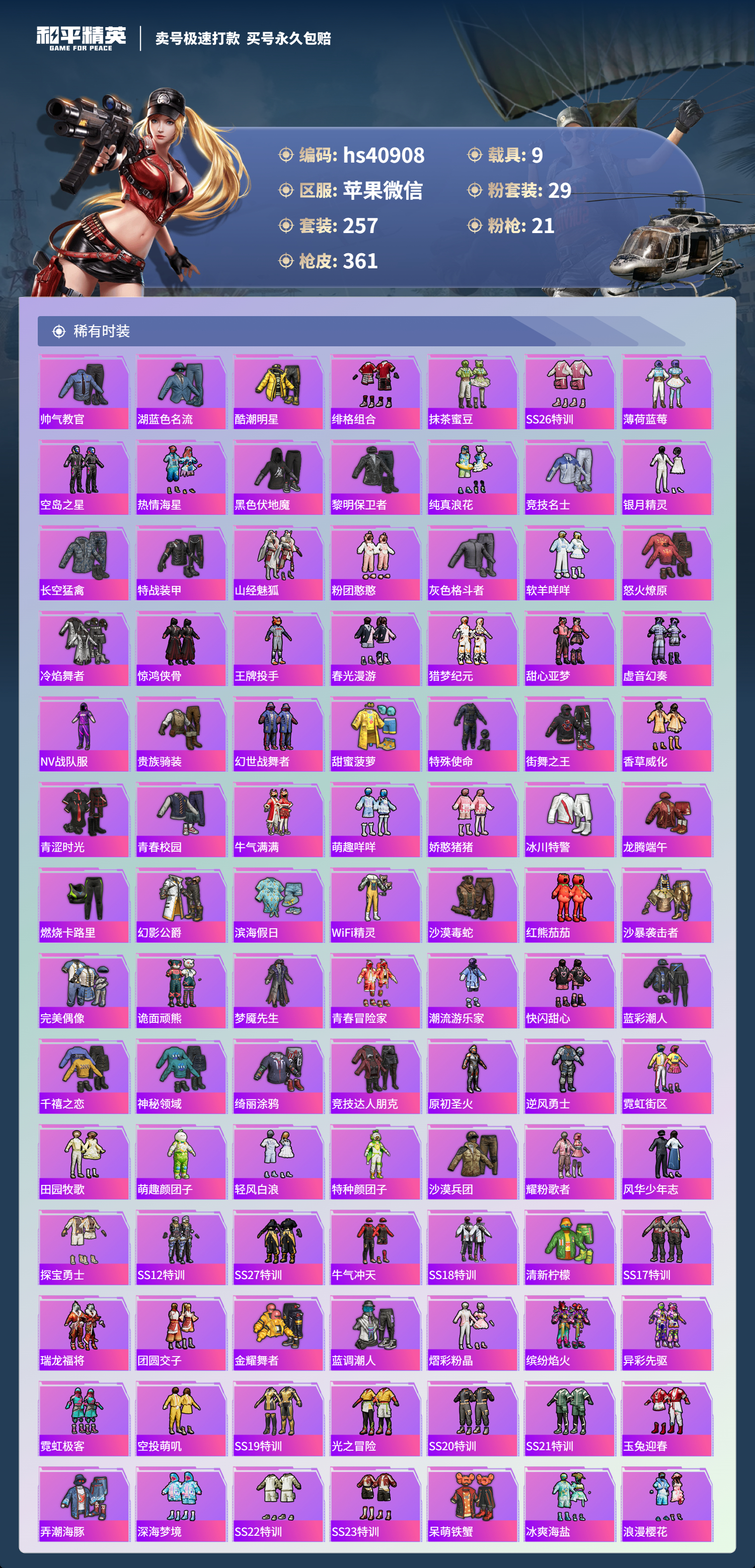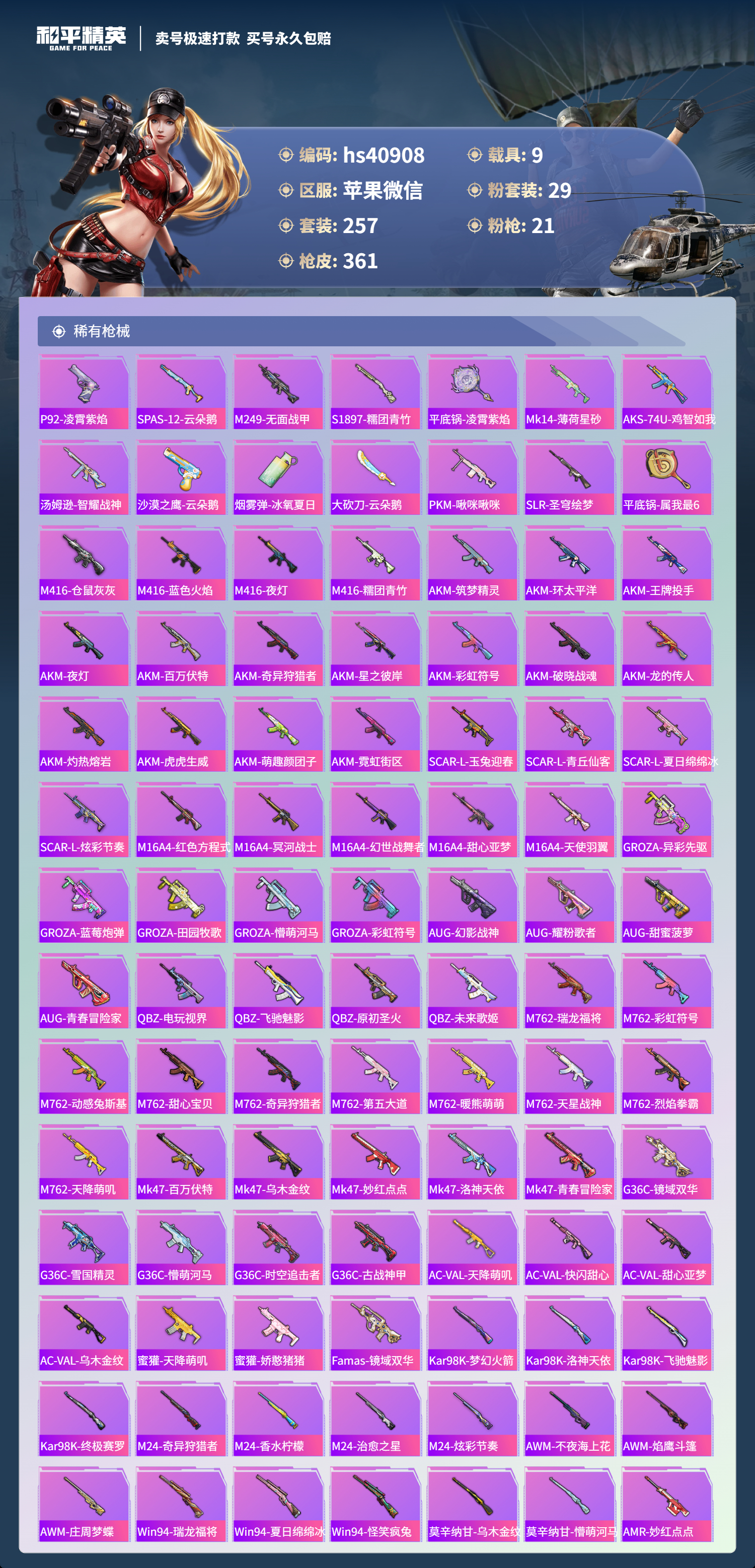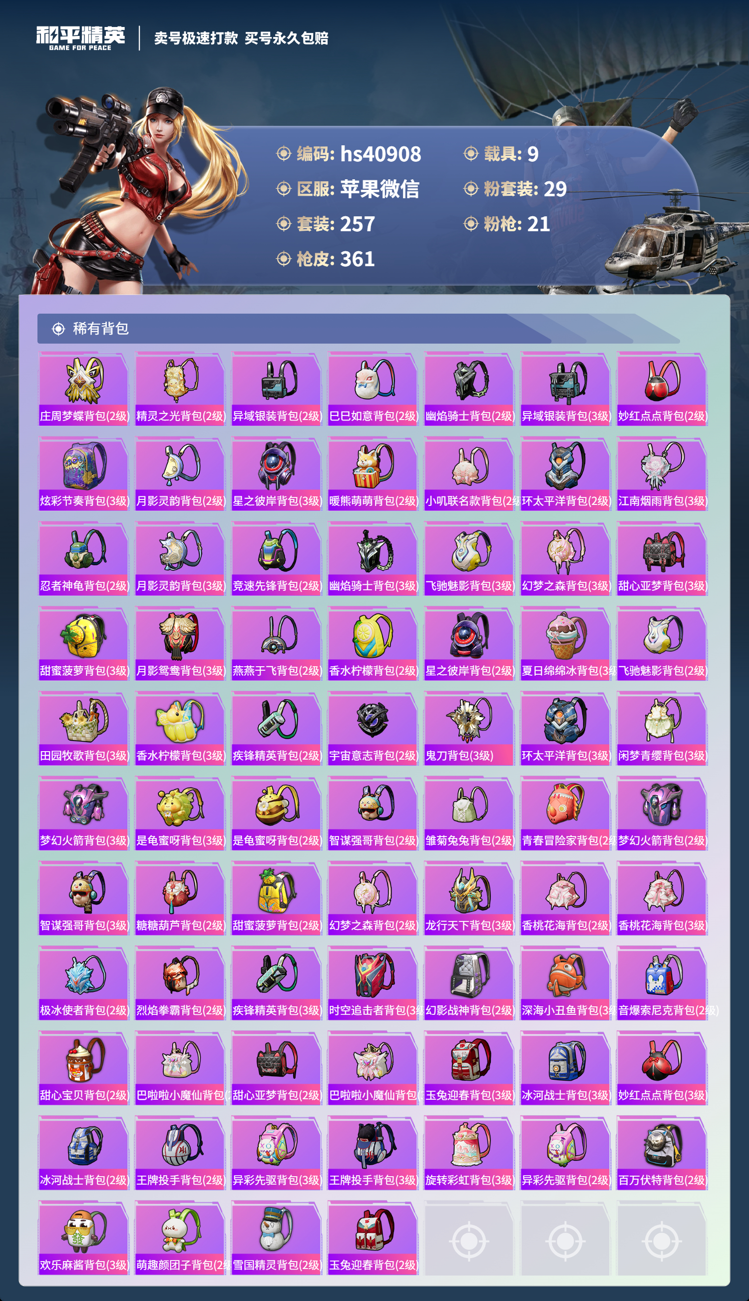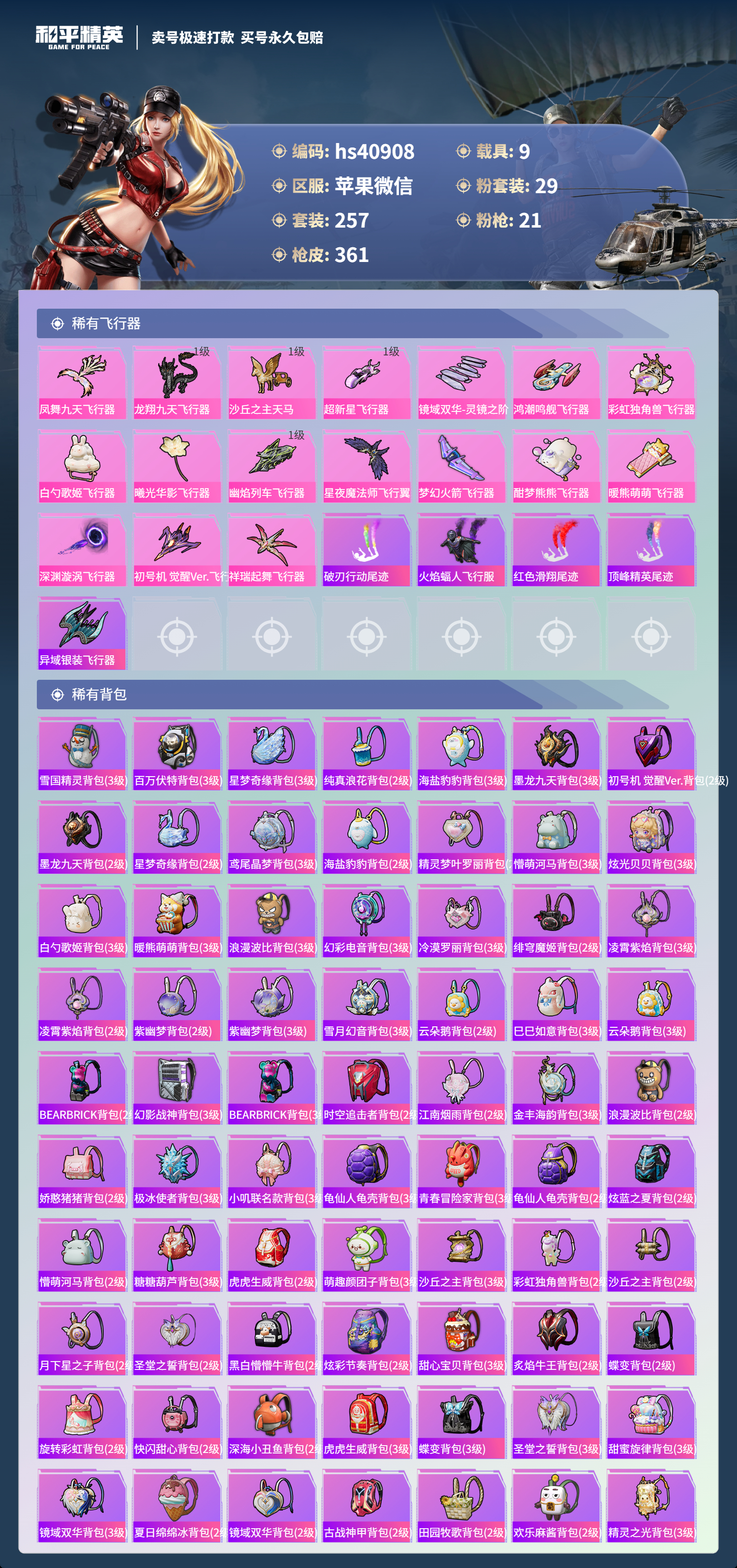 _2132727-苹果微信-20王牌印记-29粉装-21特效呛-9载具-热力值-257套装-361呛皮-1卓越印记-0传奇印记 【29粉装】雪国幻梦梦幻火箭零号机款机体服初号机觉醒ver.宝贝奶油派天使彩虹糖小叽联名款缤纷油彩奇迹舞步美琪荧海星豚白勺歌姬光极星草莓生巧严莉莉千金淑猫炙焰赤龙飓风飞鹰筑梦精灵复仇流浪者美雪月影灵韵暖熊萌萌霞光圣骑寒光使者香水柠檬数码大师烟云彩露呆萌星弥美琪 【21特效呛】akm-甜心宝贝-5级akm-幽焰骑士-3级scar-l-青春物语-1级scar-l-梦幻火箭-7级m416-心之恋语-1级m416-暖熊萌萌-2级m416-墨龙九天-3级groza-香水柠檬-7级groza-精灵之光-1级m762-青锋波束-5级kar98k-巳巳如意-5级awm-天使羽翼-3级svd-月影灵韵-5级mk12-雪月幻音-1级ump45-宇宙意志-1级ump45-雪国精灵-7级vect-环太平洋-5级p90-沙丘之主-3级dp-28-豹影疾电-1级mg-36-幻梦之森-5级盐雾蛋-丁香清露-4级 【3红装】沙丘之主-图卡盟/1级幽焰骑士-维塔/1级精灵之光-露米娜/2级 【14稀有紫装】冥河战士mark.068号机奇异狩猎者暗影哥特浪漫天命雪山精英胖达圆圆浪漫波比明日香款战斗服龟仙人临安公主暗夜魅影零款战斗服 【9稀有载具】幽焰风驰摩托车星河领航磐石银阿斯顿·马丁dbx蓝宾利battur极速紫)时空跃影星辉银宾利欧陆gt敞篷火焰橘合金龙骨(蓝)星梦玉骢疾风龙骑 【258稀有时装】图卡盟/1级露米娜/2级维塔/1级nv追光队服ste追光队服ss31特训ss33特训ss32特训彩虹兔蓝冰羽乐音雪绒豹恋语绒绒玫纹锢梦ss34特训朱霞炽焰紫幽梦大橘大利浪漫天命暗夜魅影奇异狩猎者龟仙人mark.06临安公主雪山精英游乐暗影哥特8号机零款战斗服明日香款战斗服胖达圆圆浪漫波比凌霄紫焰小鸟芋圆薄荷星砂粉恋花云朵鹅冥河战士顶瓜瓜创世·幻影兔兔白日梦狂战萌兔酷熊伴侣潮萌小黄鸭粉雾星云黑色高级特训官上衣鹿角斗士龙魂突击队卖崽青蛙异域银装疾锋精英暗夜风云狂花道·娜可露露街头风暴星途旅人光矢逐梦冰河战士鱼渊荷华俏兔智灵ss30特训青团波波燕燕于飞海琴烟达芬奇战术大师智谋强哥雏菊兔兔辉光之湖糖糖葫芦小狗蛇点点香桃花海蝶变巳巳如意棉花软糖极地流光ss28特训银尘ss29特训萝兰蝴蝶ss16特训暴风机械师无暇誓言时空追击者星辰守护者星际旅行舰行太空焰鹰斗篷英勇保护者水晶王族爆裂葡萄湖雨初晴福星高照都市漫游者虎虎生威吉莉夏日音浪龙的传人白熊同盟日冕精灵星谷精灵蓝色运动极速竞梦飞驰魅影白色伏地魔音速流光帅气教官湖蓝色名流酷潮明星绯格组合抹茶蜜豆ss26特训薄荷蓝莓空岛之星热情海星黑色伏地魔黎明保卫者纯真浪花竞技名士银月精灵长空猛禽特战装甲山经魅狐粉团憨憨灰色格斗者软羊咩咩怒火燎原冷焰舞者惊鸿侠骨王牌投手春光漫游猎梦纪元甜心亚梦虚音幻奏nv战队服贵族骑装幻世战舞者甜蜜菠萝特殊使命街舞之王香草威化青涩时光青春校园牛气满满萌趣咩咩娇憨猪猪冰川特警龙腾端午燃烧卡路里幻影公爵滨海假日wifi精灵沙漠毒蛇红熊茄茄沙暴袭击者完美偶像诡面顽熊梦魇先生青春冒险家潮流游乐家快闪甜心蓝彩潮人千禧之恋神秘领域绮丽涂鸦竞技达人朋克原初圣火逆风勇士霓虹街区田园牧歌萌趣颜团子轻风白浪特种颜团子沙漠兵团耀粉歌者风华少年志探宝勇士ss12特训ss27特训牛气冲天ss18特训清新柠檬ss17特训瑞龙福将团圆交子金耀舞者蓝调潮人熠彩粉晶缤纷焰火异彩先驱霓虹极客空投萌叽ss19特训光之冒险ss20特训ss21特训玉兔迎春弄潮海豚深海梦境ss22特训ss23特训呆萌铁蟹冰爽海盐浪漫樱花甜蜜熊情侣缤纷果语双棍侠客滨海厨神ss14特训迪迦奥特曼赛罗奥特曼神气柴柴艾克斯奥特曼忍者信条欧布奥特曼妙红点点捷德奥特曼幻彩翩翩幻羽潜行海盐绵绵冰老实芭蕉冷血极客吉莉礼服海上生明月王牌教练粉红小猪ss24特训懵萌河马ss25特训锦衣飞扬ss15特训 【361稀有呛械】m416-心之恋语/1级q-纯真浪花awm-纯真浪花汤姆逊-纯真浪花dbs-乌木金纹aa12-g-纯真浪花平底锅-纯真浪花m416-墨龙九天/3级famas-墨龙九天amr-墨龙九天slr-墨龙九天撬棍-朗基努斯之呛盐雾蛋-鸢尾晶梦突击盾牌-初号机觉醒ver.汤姆逊-星梦奇缘s1897-精灵梦叶罗丽mk20-h-星梦奇缘scar-l-海盐豹豹平底锅-精灵梦叶罗丽groza-海盐豹豹m762-青锋波束/5级盐雾蛋-丁香清露/4级groza-精灵之光/1级akm-幽焰骑士/3级svd-月影灵韵/5级kar98k-巳巳如意/5级mk12-雪月幻音/1级dp-28-豹影疾电/1级ump45-宇宙意志/1级mg-36-幻梦之森/5级slr-金丰海韵野牛-雏菊兔兔mk14-冰河战士aks-74u-尼罗河传说平底锅-雏菊兔兔m762-雏菊兔兔mini14-雏菊兔兔famas-突变脉冲m200-宇宙意志短管霰弹-宇宙意志vect-突变脉冲r1895-雏菊兔兔ac-val-宇宙意志uzi-冰河战士m16a4-冰河战士mk20-h-乌木金纹m416-暖熊萌萌/2级akm-甜心宝贝/5级scar-l-青春物语/1级scar-l-梦幻火箭/7级groza-香水柠檬/7级awm-天使羽翼/3级ump45-雪国精灵/7级vect-环太平洋/5级p90-沙丘之主/3级pkm-紫幽梦mg3-霓彩脉冲mk14-紫幽梦蜜獾-乌木金纹m762-云朵鹅s1897-紫幽梦svd-云朵鹅p92-紫幽梦蜜獾-绯穹魔姬m417-玩趣呆呆信号呛-奇迹舞步短管霰弹-星穹咏叹调js9-凌霄紫焰mg-36-凌霄紫焰平底锅-紫幽梦破片手留单-海盐豹豹ump45-海盐豹豹arx-凌霄紫焰aks-74u-乌木金纹p92-凌霄紫焰famas-乌木金纹spas-12-云朵鹅m249-无面战甲s1897-糯团青竹平底锅-凌霄紫焰mk14-薄荷星砂aks-74u-鸡智如我汤姆逊-智耀战神沙墨之鹦-云朵鹅盐雾蛋-冰氧夏
