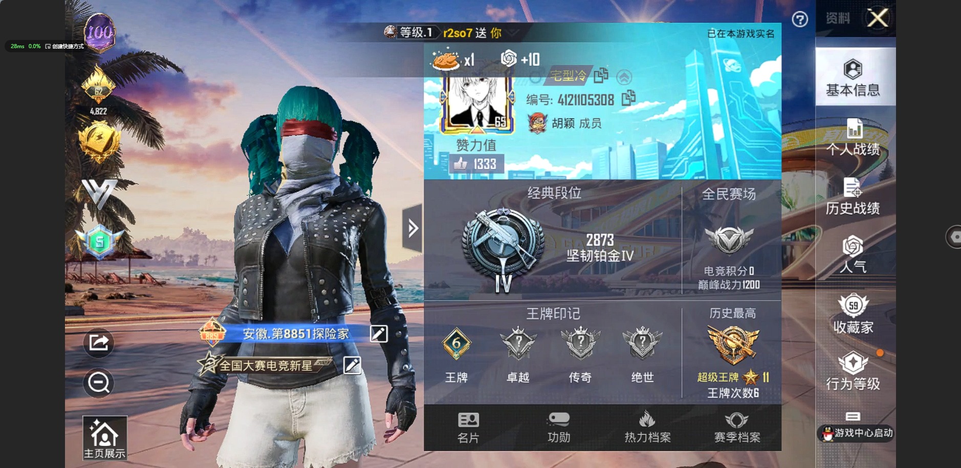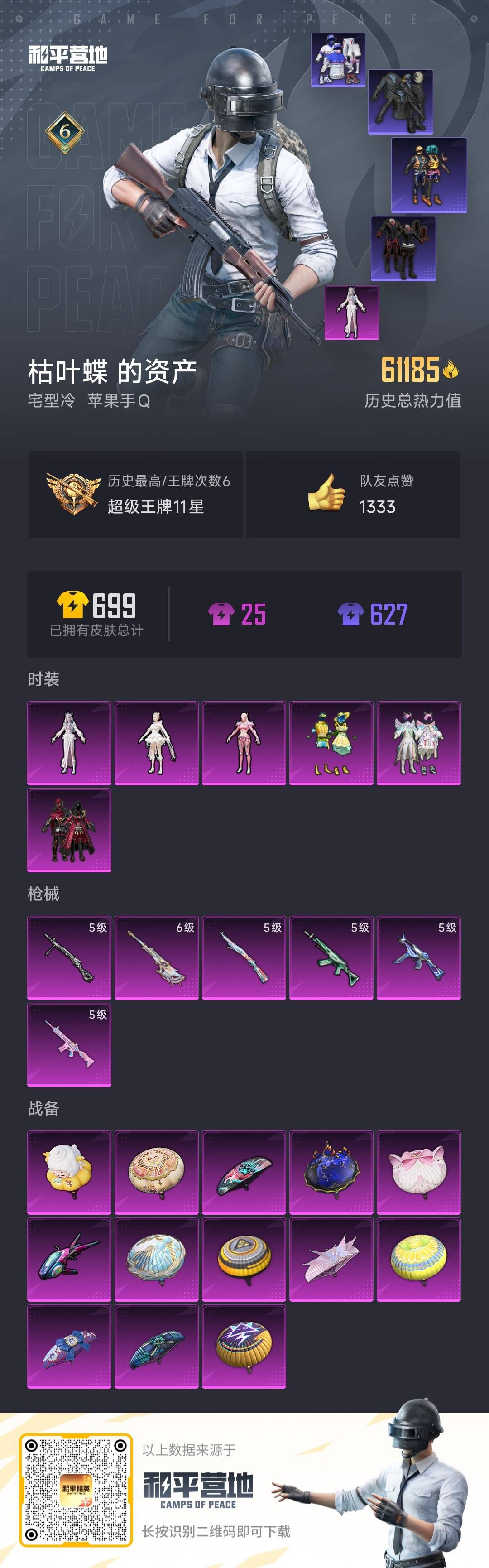 6粉装 6特效呛 6印记 可二次 可修改实名 身法装备:都市猎人暗影哥特(红眼罩) 优质装备:都市猎人 热门装扮:千金淑猫冷漠罗丽香水柠檬炙焰红王山涧鹿灵守护天翼鹰眼刺客深海小丑鱼都市猎人暗夜魅影 稀有呛皮:amr-智耀战神kar98k-巳巳如意ump45量子极限m762-