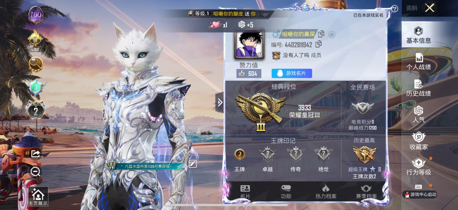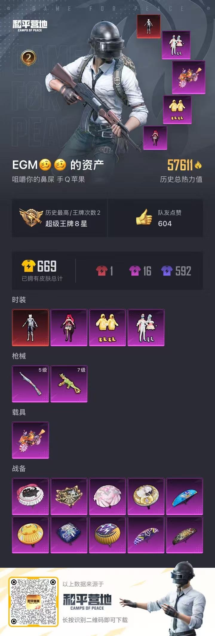 1红装 3粉装 2特效呛 1载具 2印记 可二次 可修改实名 二级神装:二级灵猫魔法师-塞维尔 热门装扮:绯穹魔姬旋转彩虹傲傲奶龙梦魇先生浪漫波比 载具:鬼马风驰 稀有呛皮:kar98k-巳巳如意ump45恐龙拽拽 神级装扮:灵猫魔法师-塞维尔 七级特效呛:七级ump45-恐龙拽拽 五级特