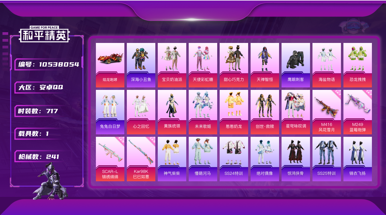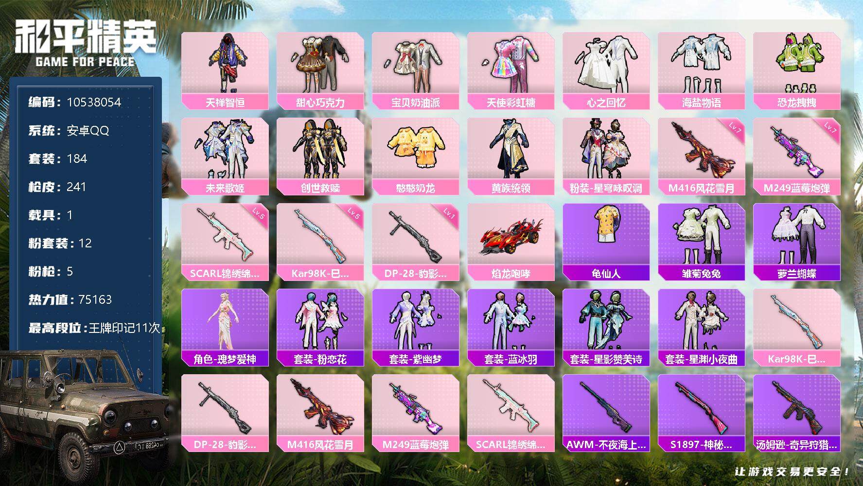 [11272854]【编号78821】【商品标题】:安卓 手q-12粉装-5特效呛-1载具-75163热力值-11印记-184套装-241呛皮 【稀有载具】:焰龙咆哮 【特效呛等级】:scar-l-锦绣绵绵五级,m416-风花雪月七级,kar98k-巳巳如意五级,m249-蓝莓炮弹七级,dp-28-豹影疾电一级 【优质套装】:粉装-甜心巧克力,粉装-宝贝奶油派,粉装-天使彩虹糖,粉装-天禅智恒,粉装-海盐物语,粉装-恐龙拽拽,粉装-心之回忆,粉装-黄族统领,粉装-未来歌姬,粉装-憨憨奶龙,套装-创世·救赎,粉装-星穹咏叹调 【稀有套装】:套装-龟仙人,套装-雏菊兔兔,套装-萝兰蝴蝶,套装-粉恋花,套装-紫幽梦,套装-蓝冰羽,角色-瑰梦爱神,套装-星影赞美诗,套装-星渊小夜曲 【优质武器皮肤】:scar-l-锦绣绵绵,m416-风花雪月,kar98k-巳巳如意,m249-蓝莓炮弹,dp-28-豹影疾电 【稀有武器皮肤】:akm-冰凉西瓜,akm-夜灯,akm-彩虹符号,akm-影袭,akm-恐龙拽拽,akm-环太平洋,akm-生命誓言,akm-破晓战魂,akm-萌趣颜团子,akm-虎虎生威,akm-霓虹街区,akm-龙的传人,m16a4-幻世战舞者,m16a4-甜心亚梦,m16a4-红色方程式,m16a4-蓝色火焰,scar-l-炫彩节奏,scar-l-玉兔迎春,scar-l-生命誓言,scar-l-黄金龙骨,m416-夜灯,m416-糯团青竹,m416-红色方程式,m416-绯红前夜,m416-蓝色火焰,groza-异彩先驱,groza-彩虹符号,groza-影袭,groza-懵萌河马,groza-田园牧歌,aug-天降萌叽,aug-灵符少年,aug-耀粉歌者,aug-闲梦青缨,q-彩虹符号,q-未来歌姬,q-飞驰魅影,m762-天降萌叽,m762-彩虹符号,m762-牛气冲天,m762-瑞龙福将,m762-甜心宝贝,m762-绯红前夜,mk47-妙红点点,mk47-百万伏特,g36c-懵萌河马,g36c-时空追击者,g36c-炙焰牛王,g36c-星穹咏叹调,ac-val-天降萌叽,ac-val-彩虹甜喵,ac-val-快闪甜心,ac-val-甜心亚梦,蜜獾-天降萌叽,蜜獾-娇憨猪猪,uzi-啾咪啾咪,uzi-天降萌叽,uzi-娇憨猪猪,uzi-影袭,
