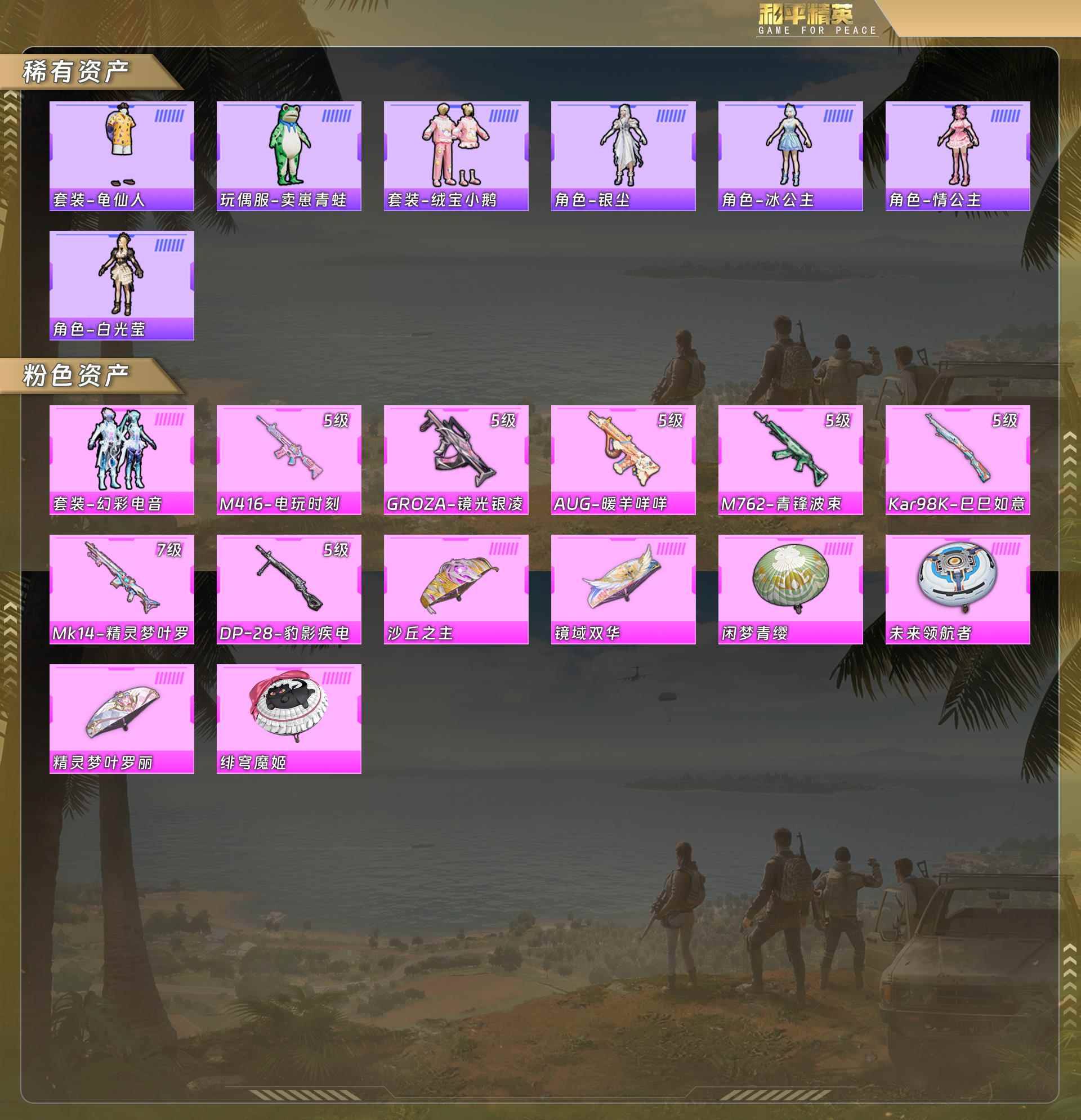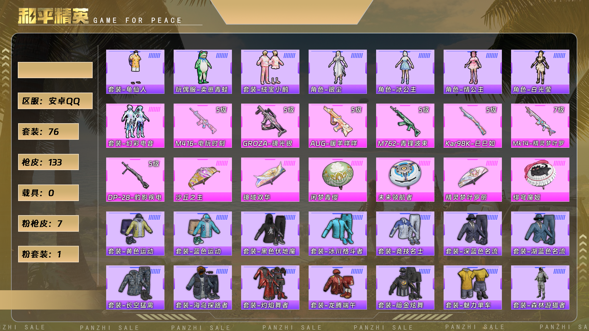 [11306186]gpz9395 【1粉装-7粉呛-0载具-0珍稀飞行器-76套装-133呛皮】当前段位:荣耀皇冠ⅴ 历史最高段位:卓越王牌7星 热力值:36623 王牌印记:4 卓越印记:2 游戏等级:48 【稀有资产】套装-龟仙人/玩偶服-卖崽青蛙/套装-绒宝小鹅/角色-银尘/角色-冰公主/角色-情公主/角色-白光莹 【粉色套装】套装-幻彩电音 【粉色呛皮】m416-电玩时刻[5级]/groza-镜光银凌[5级]/aug-暖羊咩咩[5级]/m762-青锋波束[5级]/kar98k-巳巳如意[5级]/mk14-精灵梦叶罗丽[7级]/dp-28-豹影疾电[5级]