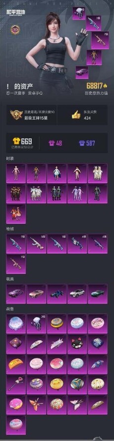 [11335964]【商品标题】:安卓【精品螳螂号/10王牌印记/合金龙骨(蓝)/梦幻火箭/洛天依/零号机款机体服/粉螳螂/蓝螳螂/小丑鱼/11粉装-6特效呛-5载具】 手q68817热力值-10印记-138套装-178呛皮 【稀有载具】:阿斯顿马丁dbs(绿),路特斯eletre(花绽灰),玛莎拉蒂ghibli(粉),宾利batur(极速紫),合金龙骨(蓝) 【特效呛等级】:akm-梦之光华七级,scar-l-青春物语四级,m416-心之恋语七级,m762-甜心娃娃五级,m762-冷魅冰骑一级,vect-环太平洋四级 【优质套装】:粉装-梦幻火箭,粉装-锦绣火鲤,粉装-山涧鹿灵,角色-洛天依,角色-零号机款机体服,粉装-酣梦娃娃,粉装-赤焰黑爵,角色-复仇流浪者,粉装-青空秋雨,角色-小可学妹,角色-守护天翼 【稀有套装】:套装-龟仙人 【优质武器皮肤】:akm-梦之光华,scar-l-青春物语,m416-心之恋语,m762-甜心娃娃,m762-冷魅冰骑,vect-环太平洋 【稀有武器皮肤】:akm-彩虹符号,akm-江南烟雨,akm-海渊国主,akm-环太平洋,akm-缤纷海域,akm-萌趣颜团子,akm-虎虎生威,akm-锦绣火鲤,m16a4-甜心亚梦,scar-l-炫彩节奏,scar-l-玉兔迎春,m416-神秘黑猫,m416-糯团青竹,groza-异彩先驱,groza-懵萌河马,groza-田园牧歌,aug-天降萌叽,aug-青春冒险家,q-原初圣火,q-彩虹符号,q-未来歌姬,q-神秘黑猫,q-绚金瑰梦,m762-天降萌叽,m762-奇异狩猎者,m762-瑞龙福将,m762-第五大道,m762-绒雪飘舞,m762-镭射皇者,mk47-天之羽翼,mk47-妙红点点,mk47-洛神天依,g36c-懵萌河马,ac-val-天降萌叽,ac-val-彩虹甜喵,ac-val-甜心亚梦,ac-val-闲梦青缨,ac-val-魅影蝠王,蜜獾-垂柳戏鸭,蜜獾-娇憨猪猪,uzi-啾咪啾咪,uzi-天降萌叽,uzi-娇憨猪猪,uzi-炫彩节奏,ump45-涂山之恋,vect-焰鹰斗篷,vect-生命誓言,vect-田园牧歌,汤姆逊-异彩先驱,汤姆逊-环太平洋,野牛-天星战神,mp5k-异彩先驱,p90-飞驰魅影,kar98k-