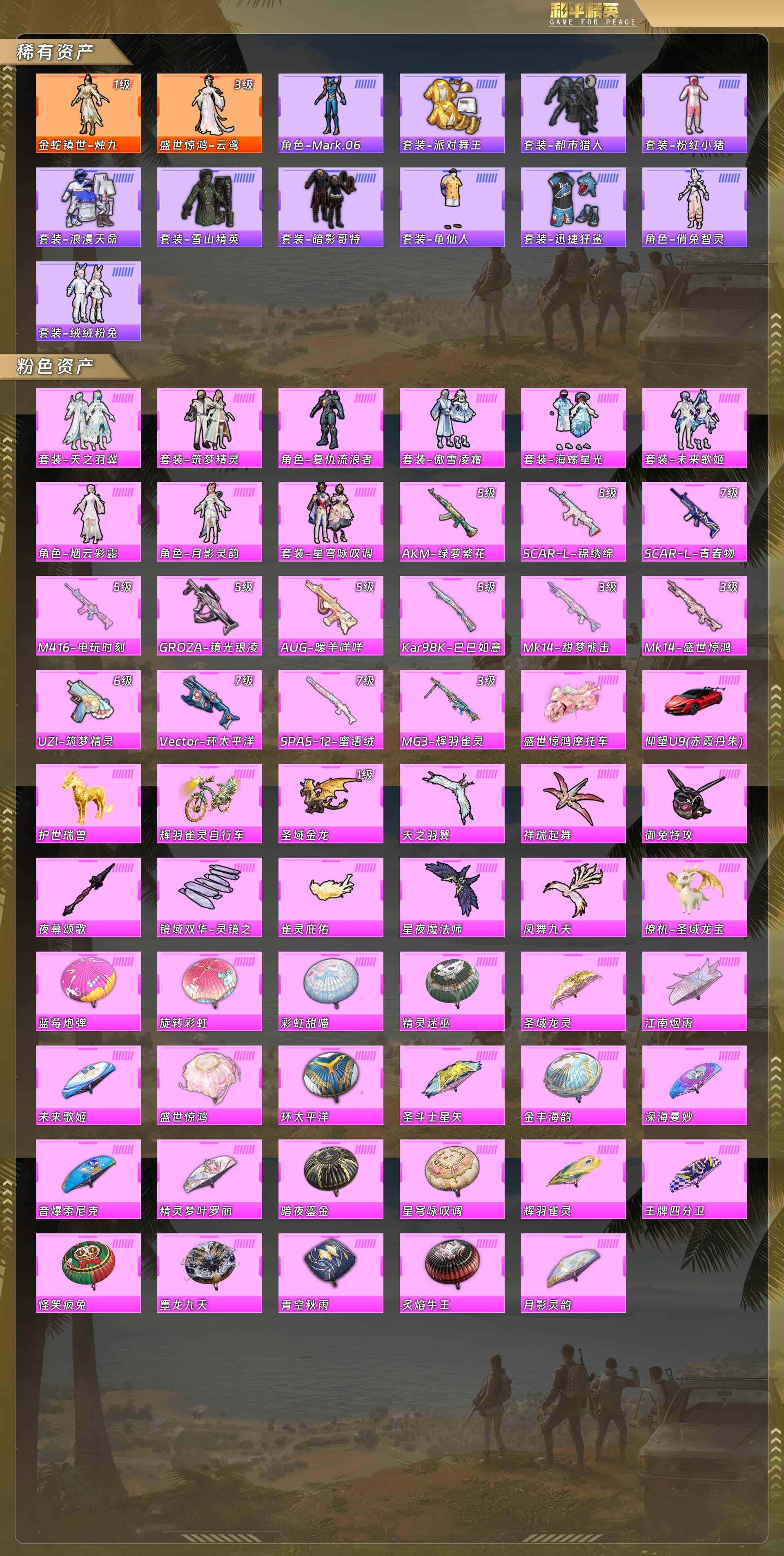 公主号-地铁满天赋-3级红装云鸾/红装烛九/都市/金鞋/红眼罩/浪漫天命/粉红小猪/迅捷狂鲨/深海小丑鱼/绒绒粉兔/天之羽翼/筑梦精灵/复仇流浪者/傲雪凌霜/海螺星光/未来歌姬/烟云彩露/月影灵韵/星穹咏叹调/瑰梦爱神/鲛海歌灵【载具】盛世惊鸿摩托车/仰望u9赤霞丹朱/护世瑞兽/辉羽雀灵自行车 没战神框(2红装9粉套13粉呛4载具)hp1342 可立即换绑无需挂单养号-124154热力值-17印记-255套装-330呛皮 【角色神装】:金蛇镇世-烛九,盛世惊鸿-云鸾 【角色神装等级】:金蛇镇世-烛九一级,盛世惊鸿-云鸾三级 【稀有载具】:仰望u9(赤霞丹朱),盛世惊鸿摩托车,僚机-圣域龙宝,护世瑞兽,辉羽雀灵自行车 【特效呛等级】:akm-绿萝繁花五级,scar-l-青春物语七级,scar-l-锦绣绵绵五级,m416-电玩时刻五级,groza-镜光银凌五级,aug-暖羊咩咩五级,uzi-筑梦精灵六级,vect-环太平洋七级,kar98k-巳巳如意五级,mk14-盛世惊鸿三级,spas-12-蜜语绒猫七级,mg3-辉羽雀灵三级 【优质套装】:粉装-天之羽翼,粉装-筑梦精灵,角色-复仇流浪者,粉装-傲雪凌霜,粉装-海螺星光,粉装-未来歌姬,角色-烟云彩露,角色-月影灵韵,粉装-星穹咏叹调 【稀有套装】:套装-龟仙人,套装-巳巳如意,套装-雏菊兔兔,套装-萝兰蝴蝶,套装-小熊娃娃,角色-狂花道·娜可露露,套装-糖糖葫芦,套装-青团波波,套装-棉花软糖,角色-俏兔智灵,角色-光矢逐梦,套装-燕燕于飞,套装-鱼渊荷华,角色-蜜桃派对,套装-粉恋花,套装-紫幽梦,套装-蓝冰羽,角色-瑰梦爱神,角色-鲛海歌灵,套装-星影赞美诗,套装-星渊小夜曲 【优质武器皮肤】:akm-绿萝繁花,scar-l-青春物语,scar-l-锦绣绵绵,m416-电玩时刻,groza-镜光银凌,aug-暖羊咩咩,uzi-筑梦精灵,vect-环太平洋,kar98k-巳巳如意,mk14-盛世惊鸿,mk14-甜梦熊击,spas-12-蜜语绒猫,mg3-辉羽雀灵 【稀有武器皮肤】:akm-墨染幽兰,akm-夜灯,akm-彩虹符号,akm-影袭,akm-灼热熔岩,akm-环太平洋,akm-破晓战魂,akm-萌趣颜团子,akm-虎虎生威,akm-霓虹街区,akm-龙的传人,m16a4-夜灯,m16a4-幻世战舞者,m16a4-星际漫游,m16a4-甜心亚梦,m16a4-红色方程式,m16a4-蓝色火焰,scar-l-炫彩节奏,scar-l-玉兔迎春,scar-l-甜蜜旋律,scar-l-红色方程式,m416-夜灯,m416-糯团青竹,m416-红色方程式,m416-绯红前夜,m416-蓝色火焰,groza-异彩先驱,groza-彩虹符号,groza-影袭,groza-懵萌河马,groza-治愈之星,groza-田园牧歌,aug-天降萌叽,aug-甜蜜菠萝,aug-耀粉歌者,aug-青春冒险家,aug-月影灵韵,q-彩虹符号,q-飞驰魅影,m762-天降萌叽,m762-奇异狩猎者,m762-彩虹符号,m762-暗夜鎏金,m762-橘柚倾心,m762-牛气冲天,m762-瑞龙福将,mk47-妙红点点,mk47-青春冒险家,g36c-六号树人,g36c-懵萌河马,g36c-炙焰牛王,g36c-星穹咏叹调,ac-val-天降萌叽,ac-val-快闪甜心,ac-val-甜心亚梦,蜜獾-垂柳戏鸭,蜜獾-天降萌叽,蜜獾-娇憨猪猪,famas-墨龙九天,uzi-啾咪啾咪,uzi-天降萌叽,uzi-娇憨猪猪,uzi-影袭,uzi-炫彩节奏,uzi-红色方程式,uzi-盛世惊鸿,uzi-月影灵韵,ump45-夜灯,ump45-涂山之恋,ump45-生命誓言,vect-焰鹰斗篷,vect-夜灯,vect-彩虹符号,vect-治愈之星,vect-生命誓言,vect-田园牧歌,vect-香水柠檬,汤姆逊-天降萌叽,汤姆逊-奇异狩猎者,汤姆逊-幻影战神,汤姆逊-异彩先驱,汤姆逊-暗夜鎏金,汤姆逊-炫彩节奏,汤姆逊-环太平洋,汤姆逊-耀粉歌者,野牛-沙丘之主,野牛-青春冒险家,mp5k-异彩先驱,mp5k-怪笑疯兔,aks-74u-鬼刀,aks-74u-辉羽雀灵,p90-快闪甜心,p90-飞驰魅影,p90-金蛇镇世,p90-巳巳如意,kar98k-彩虹符号,kar98k-影袭,kar98k-炫彩节奏,kar98k-王子的夏天,kar98k-红色方程式,kar98k-飞驰魅影,kar98k-星穹咏叹调,m24-影袭,m24-治愈之星,m24-炫彩节奏,m24-香水柠檬,m24-奇异狩猎者,awm-焰鹰斗篷,awm-垂柳戏鸭,awm-炙焰牛王,awm-盛世惊鸿,sks-夜灯,sks-心之恋语,sks-未来歌姬,sks-炫彩节奏,sks-糯团青竹,sks-圣域龙灵,vss-彩虹符号,vss-星之彼岸,vss-田园牧歌,vss-碧影闪光,mini14-异彩先驱,mini14-旋转彩虹,mini14-星际漫游,mini14-炫彩节奏,mini14-筑梦精灵,mini14-耀粉歌者,mk14-治愈之星,win94-瑞龙福将,slr-娇憨猪猪,slr-彩虹符号,qbu-青春冒险家,qbu-飒粉甜心,莫辛纳甘-懵萌河马,莫辛纳甘-炙焰牛王,莫辛纳甘-蜜语绒猫,amr-妙红点点,amr-镜光幻境,m417-惊鸿侠骨,m417-星兔领航员,m417-蓝晶绮麟,mk20-h-快闪甜心,mk20-h-樱桃泡泡,mk20-h-圣域龙灵,m200-惊鸿侠骨,s686-奇异狩猎者,s686-彩虹符号,s686-生命誓言,s686-红色方程式,s686-巳巳如意,s1897-暗夜鎏金,s1897-炫彩节奏,s1897-碧影闪光,s1897-飞驰魅影,s12k-玩趣呆呆,s12k-瑞龙福将,s12k-破晓战魂,s12k-垂柳戏鸭,s12k-夜幕颂歌,s12k-娇憨猪猪,s12k-幻世战舞者,s12k-是爱神辣,dbs-焰鹰斗篷,dbs-彩虹甜喵,dbs-甜心亚梦,spas-12-田园牧歌,m249-妙红点点,m249-彩虹符号,m249-破晓战魂,m249-糯团青竹,dp-28-焰鹰斗篷,dp-28-山经魅狐,dp-28-彩虹符号,dp-28-甜心亚梦,mg3-镜域双华,mg3-妙红点点,mg3-幻世战舞者,mg3-惊鸿侠骨,mg3-瑞龙福将,pkm-懵萌河马,p92-雷霆特警,p1911-动力核心,p18c-黄金龙骨,短管霰弹-竹节火铳,短管霰弹-圣域龙灵,短管霰弹-星穹咏叹调,沙墨之鹦-快闪甜心,沙墨之鹦-旋转彩虹,tmp-9-江南烟雨,战术弩-江南烟雨,爆炸猎弓-惊鸿侠骨,大砍刀-盛世惊鸿,撬棍-沙丘之主权杖,平底锅-辉羽雀灵,燃烧瓶-甜梦桃焰,破片手留单-巳巳如意 【热门品类】:套装-派对舞王,套装-深海小丑鱼,套装-小丑鱼,角色-军刀雅典娜,套装-金羽特工,套装-都市猎人 【其他套装】:套装-ss2特训,套装-ss3特训,套装-ss4特训,套装-ss5特训,套装-ss6特训,套装-ss7特训,套装-ss8特