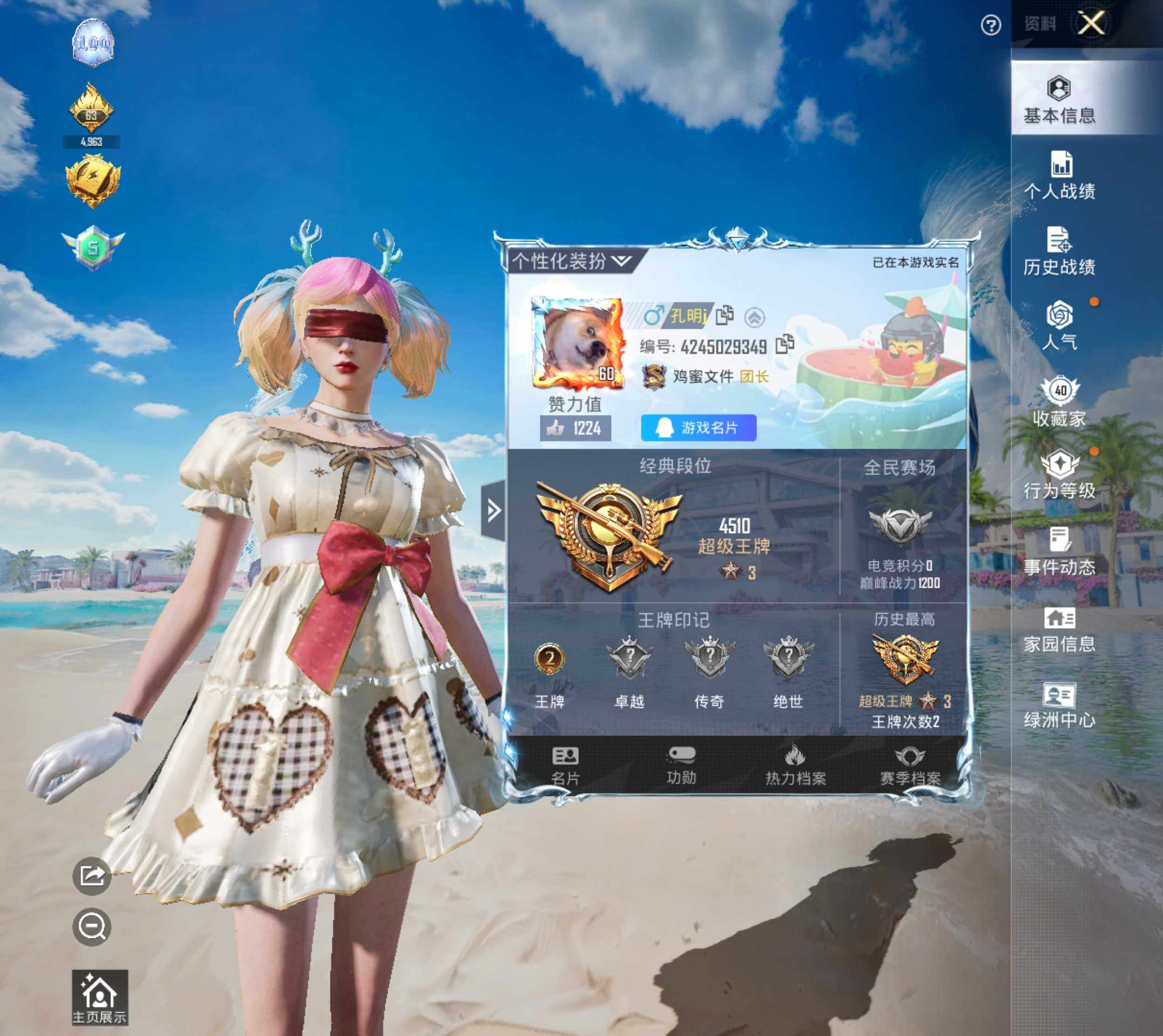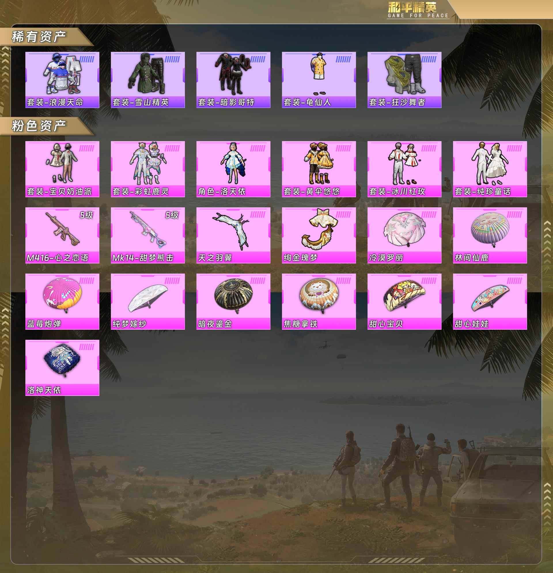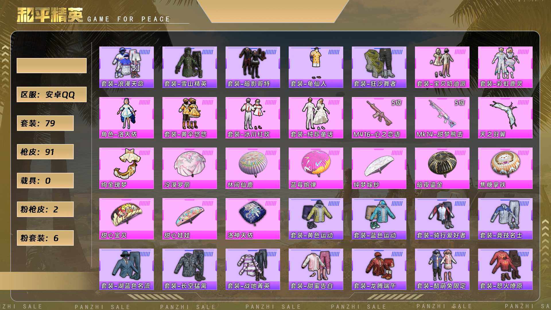 公主号-红眼罩/浪漫天命/雪山精英/狂沙舞者/宝贝奶油派/彩虹鹿灵/洛天依/黄伞悠悠/冰川红玫/纯珍童话【粉色呛皮】m416-心之恋语[5级]/mk14-甜梦熊击[5级](6粉套2粉呛)hp1695 没战神框 可立即换绑无需挂单养号-29653热力值-2印记-79套装-91呛皮 【特效呛等级】:m416-心之恋语五级,mg3-辉羽雀灵五级mk14-甜梦熊击 【优质套装】:粉装-宝贝奶油派,粉装-彩虹鹿灵,角色-洛天依,粉装-黄伞悠悠,粉装-冰川红玫,粉装-纯珍童话 【稀有套装】:套装-龟仙人,套装-彩虹兔,套装-云朵鹅,套装-雪绒豹 【优质武器皮肤】:m416-心之恋语,mk14-甜梦熊击 【稀有武器皮肤】:akm-彩虹符号,akm-生命誓言,akm-虎虎生威,akm-霓虹街区,m16a4-幻世战舞者,m16a4-红色方程式,scar-l-夜灯,scar-l-炫彩节奏,scar-l-生命誓言,scar-l-粉色回忆,scar-l-冷漠罗丽,m416-夜灯,m416-蓝色火焰,groza-异彩先驱,groza-春暖花开,groza-林间仙鹿,groza-蓝莓炮弹,aug-天降萌叽,aug-耀粉歌者,q-洛神天依,q-神秘黑猫,m762-天降萌叽,m762-瑞龙福将,m762-绯红前夜,m762-云朵鹅,mk47-天之羽翼,mk47-林间仙鹿,蜜獾-天降萌叽,uzi-天降萌叽,ump45-涂山之恋,ump45-生命誓言,ump45-蓝色火焰,汤姆逊-异彩先驱,汤姆逊-林间仙鹿,汤姆逊-炫彩节奏,汤姆逊-耀粉歌者,mp5k-异彩先驱,mp5k-蓝莓炮弹,kar98k-红伞翩翩,kar98k-蓝莓炮弹,m24-冰封烈焰,awm-恐龙拽拽,vss-荒野猎神,mini14-异彩先驱,mini14-生命誓言,mini14-穿刺龙虾,mini14-龙宫之主,mk14-绚金瑰梦,win94-瑞龙福将,svd-云朵鹅,s686-冰封烈焰,s1897-春暖花开,s12k-玩趣呆呆,s12k-瑞龙福将,s12k-音爆索尼克,s12k-龙宫之主,dbs-第五大道,spas-12-苔丝玫瑰,spas-12-云朵鹅,m249-破晓战魂,dp-28-彩虹符号,mg3-瑞龙福将,p1911-冰封烈焰,沙墨之鹦-云朵鹅,大砍刀-云朵鹅,撬棍-冷漠罗丽 【其他套装】:套装-ss3特训,套装-ss4特训,套装-ss5特训,套装-ss17特训,套装-ss18特训,套装-ss19特训,套装-ss23特训,套装-ss24特训,套装-ss25特训,套装-传奇侦探,套装-北国孤狼,套装-吉莉礼服,套装-怒火燎原,套装-暗影哥特,套装-柠萌假日,套装-浪漫天命,套装-湖蓝色名流,套装-滨海厨神,套装-潮流炫酷,套装-牛气满满,套装-狂沙舞者,套装-王牌教练,套装-甜蜜告白,套装-甜蜜熊情侣,套装-疯狂小兔子,套装-破蛋小黄鸡,套装-空投萌叽,套装-竞技名士,套装-竞技达人朋克,套装-绮丽涂鸦,套装-绯格组合,套装-缤纷果语,套装-耀粉歌者,套装-萌黄之夏,套装-蓝色运动,套装-酷萌兔限定,套装-野性战魂,套装-长空猛禽,套装-霓虹街区,套装-骑行爱好者,套装-魅力单车,套装-鹤鸣,套装-黄色运动,套装-龙腾端午,套装-龟仙人,套装-战地菁英,套装-极地朋克,套装-夜莺强袭者,套装-坚韧舞者,套装-凛冬战士,套装-雪山精英,套装-雪山征服者,套装-冰原使者,套装-圣诞大吉,套装-神秘黑猫,套装-风华少年志,套装-激萌罗小黑,套装-机械征服者,套装-瑞龙福将,套装-团圆交子,套装-电音精灵,套装-爆裂葡萄,套装-异彩先驱,套装-霓虹极客,套装-月蓝流光,套装-灵动马戏师,套装-跃动晴空 【优质飞行器】:绚金瑰梦飞行器,天之羽翼飞行器 【优质降落伞】:甜心宝贝降落伞,林间仙鹿降落伞,洛神天依降落伞,蓝莓炮弹降落伞,甜心娃娃降落伞,焦糖拿铁降落伞,暗夜鎏金降落伞,纯梦嫁纱降落伞,冷漠罗丽降落伞 【稀有头盔】:折纸暴龙头盔(3级),折纸暴龙头盔(2级),幻影战神头盔(1级) 【稀有背包】:折纸暴龙背包(3级),深海小丑鱼背包(2级),神秘黑猫背包(3级),神秘黑猫背包(2级) 【营地id】:787014759
