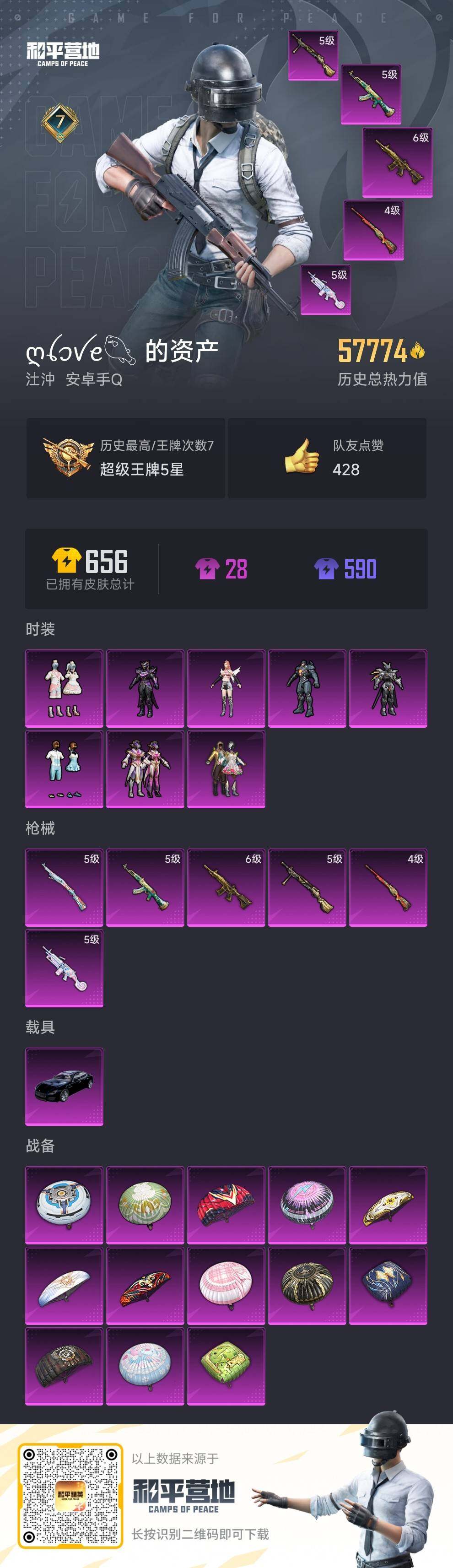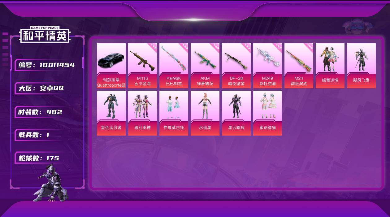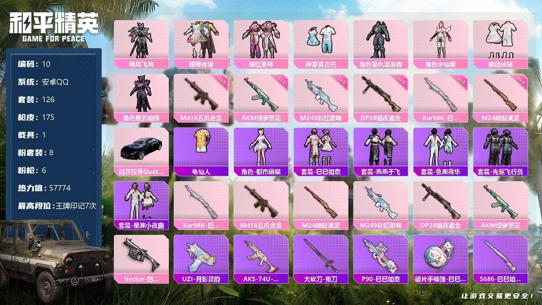 [11380787]【商品标题】:安卓 手q-8粉装-6特效呛-1载具-57774热力值-7印记-126套装-175呛皮 【稀有载具】:玛莎拉蒂quattropte(夜幕蓝) 【特效呛等级】:akm-绿萝繁花五级,m416-五爪金龙六级,kar98k-巳巳如意五级,m24-翩跹演武四级,m249-彩虹甜喵五级,dp-28-暗夜鎏金五级 【优质套装】:粉装-蝶舞迷情,粉装-飓风飞鹰,角色-复仇流浪者,粉装-银红美神,粉装-仲夏莫吉托,角色-水仙星,角色-星云暗核,粉装-蜜语绒猫 【稀有套装】:套装-龟仙人,套装-巳巳如意,套装-先驱飞行员,角色-都市丽猫,套装-燕燕于飞,套装-鱼渊荷华,套装-星渊小夜曲 【优质武器皮肤】:akm-绿萝繁花,m416-五爪金龙,kar98k-巳巳如意,m24-翩跹演武,m249-彩虹甜喵,dp-28-暗夜鎏金 【稀有武器皮肤】:akm-夜灯,akm-生命誓言,akm-破晓战魂,akm-霓虹街区,akm-龙的传人,m16a4-红色方程式,scar-l-玉兔迎春,scar-l-甜蜜誓约,scar-l-红色方程式,m416-糯团青竹,m416-红色方程式,m416-诡夜天鹅,groza-2b战斗服款,groza-彩虹符号,groza-懵萌河马,groza-田园牧歌,aug-天降萌叽,aug-耀粉歌者,q-彩虹符号,q-未来歌姬,m762-天降萌叽,m762-彩虹甜喵,m762-暗夜鎏金,m762-甜心宝贝,mk47-妙红点点,g36c-镜域双华,g36c-懵萌河马,ac-val-天降萌叽,ac-val-彩虹甜喵,ac-val-快闪甜心,蜜獾-垂柳戏鸭,蜜獾-天降萌叽,蜜獾-娇憨猪猪,uzi-啾咪啾咪,uzi-天降萌叽,uzi-娇憨猪猪,uzi-月影灵韵,ump45-涂山之恋,ump45-猪猪侠,ump45-生命誓言,vect-焰鹰斗篷,vect-彩虹符号,vect-生命誓言,vect-田园牧歌,vect-创世·救赎,汤姆逊-天降萌叽,汤姆逊-暗夜鎏金,汤姆逊-耀粉歌者,mp5k-甜蜜誓约,mp5k-飒粉甜心,aks-74u-鬼刀,p90-快闪甜心,p90-巳巳如意,kar98k-2b战斗服款,kar98k-彩虹符号,kar98k-梦幻火箭,kar98k-炫彩节奏,kar98k-王子的夏天,kar98k-红