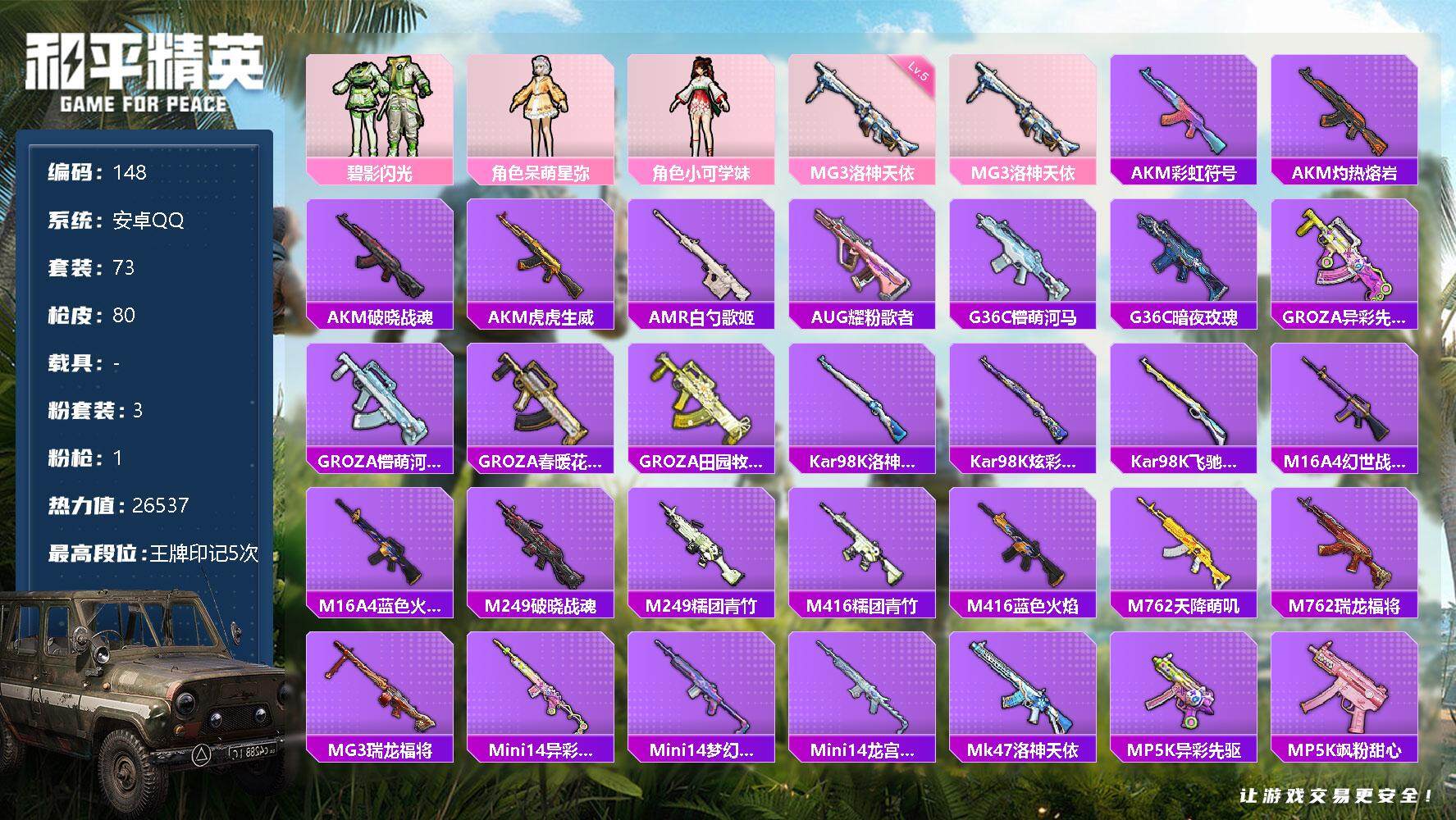[11381032]【商品标题】:安卓 手q-3粉装-1特效呛-0载具-26537热力值-5印记-73套装-80呛皮 【特效呛等级】:mg3-洛神天依五级 【优质套装】:粉装-碧影闪光,角色-呆萌星弥,角色-小可学妹 【优质武器皮肤】:mg3-洛神天依 【稀有武器皮肤】:akm-彩虹符号,akm-灼热熔岩,akm-破晓战魂,akm-虎虎生威,m16a4-幻世战舞者,m16a4-蓝色火焰,scar-l-玉兔迎春,scar-l-红色方程式,m416-糯团青竹,m416-蓝色火焰,groza-异彩先驱,groza-懵萌河马,groza-春暖花开,groza-田园牧歌,aug-耀粉歌者,q-洛神天依,q-飞驰魅影,m762-天降萌叽,m762-瑞龙福将,mk47-洛神天依,g36c-懵萌河马,g36c-暗夜玫瑰,蜜獾-天降萌叽,蜜獾-娇憨猪猪,uzi-娇憨猪猪,uzi-炫彩节奏,uzi-红色方程式,ump45-蓝色火焰,vect-生命誓言,vect-田园牧歌,汤姆逊-异彩先驱,汤姆逊-炫彩节奏,汤姆逊-耀粉歌者,mp5k-异彩先驱,mp5k-飒粉甜心,p90-飞驰魅影,kar98k-洛神天依,kar98k-炫彩节奏,kar98k-飞驰魅影,sks-迅猛狂鲨,vss-未来战士,vss-田园牧歌,mini14-异彩先驱,mini14-梦幻火箭,mini14-龙宫之主,win94-瑞龙福将,slr-娇憨猪猪,莫辛纳甘-懵萌河马,amr-白勺歌姬,s686-白勺歌姬,s686-红色方程式,s1897-炫彩节奏,s1897-飞驰魅影,s12k-瑞龙福将,s12k-破晓战魂,s12k-娇憨猪猪,s12k-幻世战舞者,spas-12-田园牧歌,m249-破晓战魂,m249-糯团青竹,mg3-瑞龙福将,pkm-懵萌河马,沙墨之鹦-旋转彩虹 【其他套装】:套装-ss17特训,套装-ss18特训,套装-ss19特训,套装-ss20特训,套装-ss21特训,套装-ss22特训,套装-ss23特训,套装-ss24特训,套装-人气偶像,套装-光之冒险,套装-冷焰舞者,套装-夏日音浪,套装-完美偶像,套装-幻世战舞者,套装-战地督导,套装-柠萌假日,套装-格斗先锋,套装-深蓝色名流,套装-湖蓝色名流,套装-滨海假日,套装-潮流炫酷,套装-灼焰舞者,套装-炫蓝之夏,套装-特战装甲,套装-特殊使命,套装