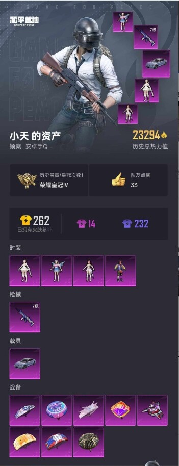 [11407045]【商品标题】:安卓 【精品公主号 电磁星/圣堂之誓/仰望u7/4粉装-1满级特效呛-1载具】手q-4粉装-1特效呛-1载具-23294热力值-1印记-37套装-71呛皮 【稀有载具】:仰望u7(阿盖尔紫) 【特效呛等级】:scar-l-青春物语七级 【优质套装】:粉装-天禅智恒,角色-圣堂之誓,角色-电磁星,角色-千金淑猫 【稀有套装】:套装-糖糖葫芦,套装-青团波波,角色-怀庆长公主 【优质武器皮肤】:scar-l-青春物语 【稀有武器皮肤】:akm-影袭,akm-恐龙拽拽,akm-江南烟雨,m416-糯团青竹,q-彩虹符号,m762-天降萌叽,m762-暗夜鎏金,ac-val-快闪甜心,uzi-啾咪啾咪,uzi-天降萌叽,vect-焰鹰斗篷,vect-田园牧歌,汤姆逊-暗夜鎏金,p90-快闪甜心,p90-宁雨蝶,awm-焰鹰斗篷,awm-圣堂之誓,vss-田园牧歌,mini14-炫彩节奏,mk20-h-快闪甜心,s686-奇异狩猎者,s1897-暗夜鎏金,dbs-焰鹰斗篷,dbs-圣堂之誓,spas-12-田园牧歌,m249-沙丘之主,m249-糯团青竹,dp-28-焰鹰斗篷,沙墨之鹦-绝色倾城,沙墨之鹦-快闪甜心,战术弩-江南烟雨,撬棍-沙丘之主权杖 【其他套装】:套装-ss26特训,套装-ss27特训,套装-白色伏地魔,套装-空岛之星,套装-缤纷果语,套装-长空猛禽,套装-霓虹街区,套装-金耀舞者,套装-贵族骑装,套装-轻风白浪,套装-绚烂繁星,套装-熠彩粉晶,套装-云霞荷露,套装-快闪甜心,套装-春光漫游,套装-贝斯之夜,套装-焰鹰斗篷,套装-幽夜迷踪,套装-幻羽潜行,套装-alan walker电音教主,角色-蝶吟花词,套装-创世·幻影 【优质飞行器】:花傲天飞行器 【优质降落伞】:暗夜鎏金降落伞,变形金刚降落伞,萌酷奶龙降落伞,江南烟雨降落伞,霓虹漫游降落伞,电糖天使降落伞,魔法神域降落伞 【稀有头盔】:深海小丑鱼头盔(2级) 【营地id】:946599681