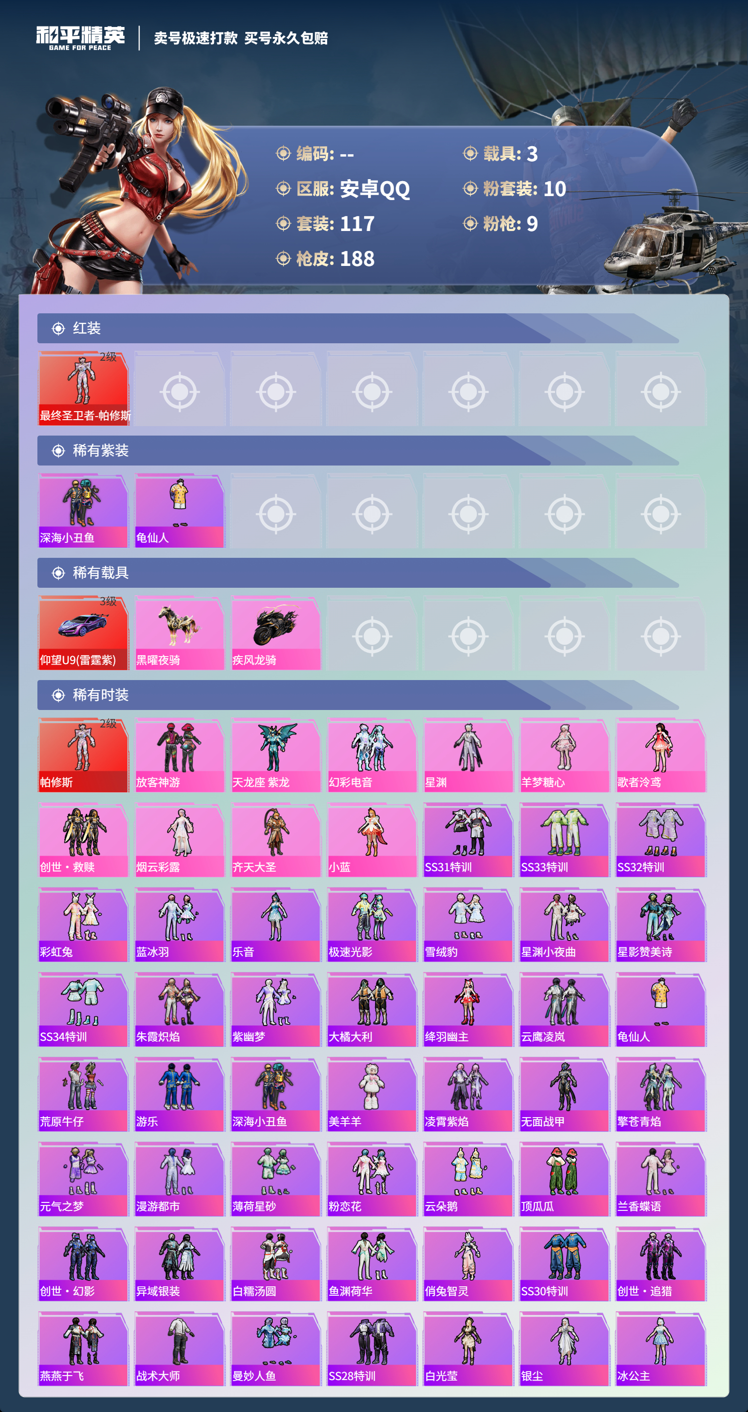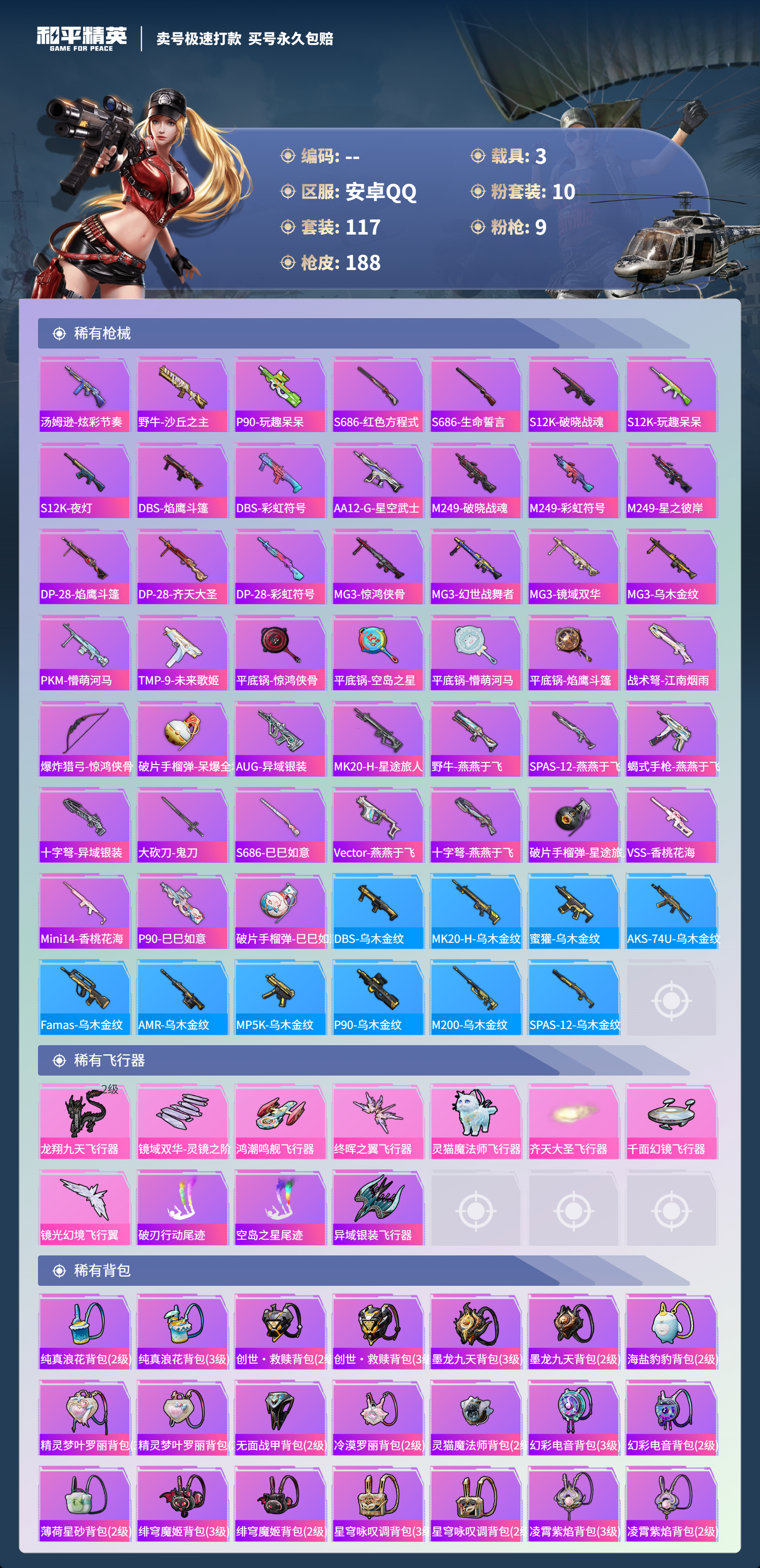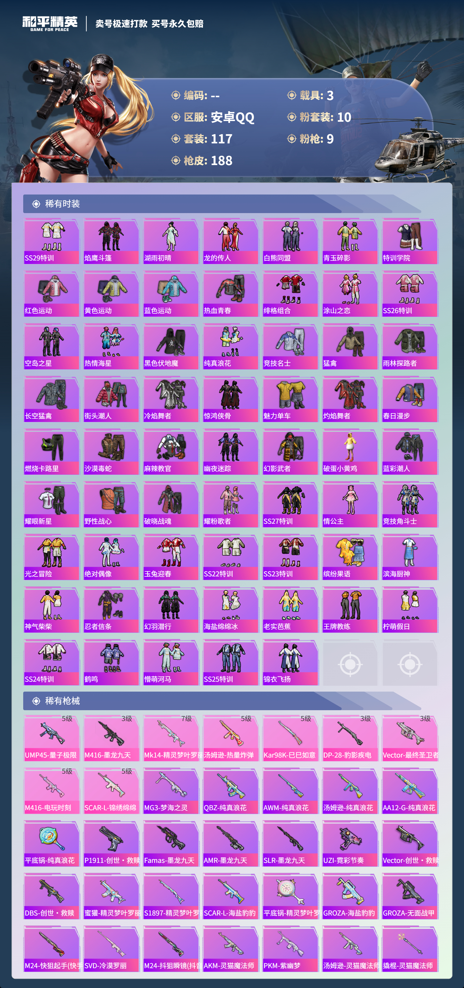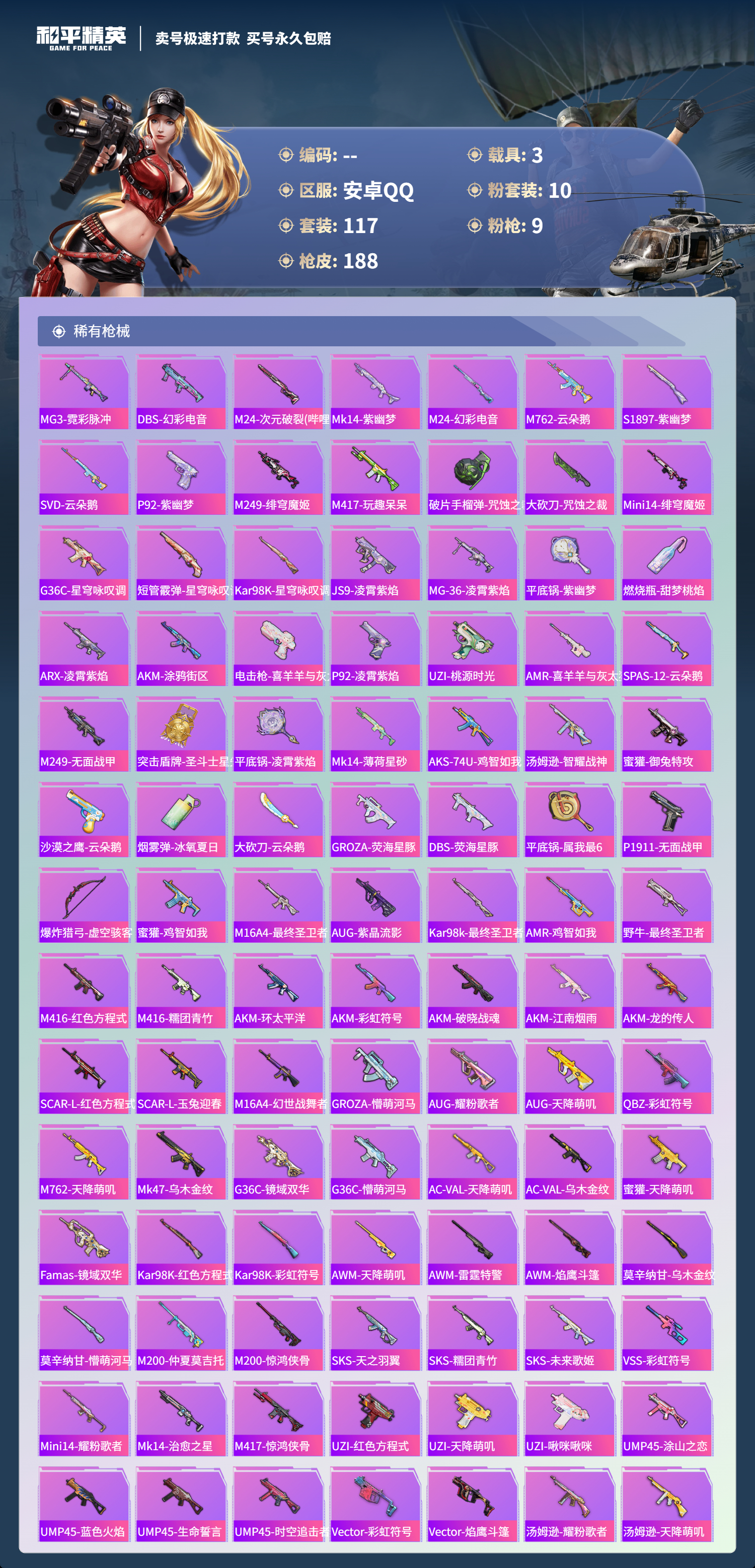 2156957-手q-4王牌印记-10粉装-9特效呛-3载具-63442热力值-117套装-188呛皮-0卓越印记-0传奇印记 【10粉装】放客神游天龙座 紫龙幻彩电音星渊羊梦糖心歌者泠鸢创世·救赎烟云彩露齐天大圣小蓝 【9特效呛】scar-l-锦绣绵绵-5级 m416-墨龙九天-3级 m416-电玩时刻-5级 kar98k-巳巳如意-5级 mk14-精灵梦叶罗丽-7级