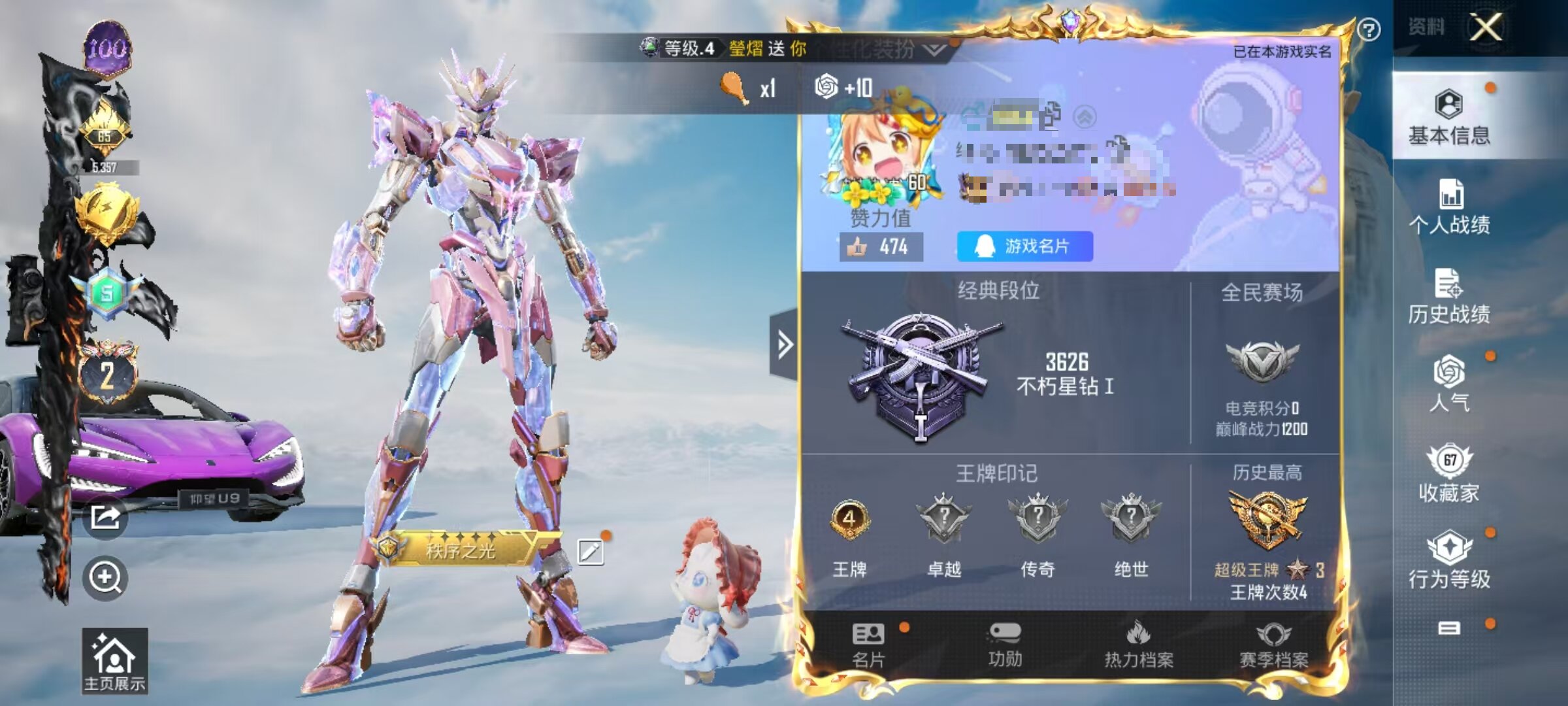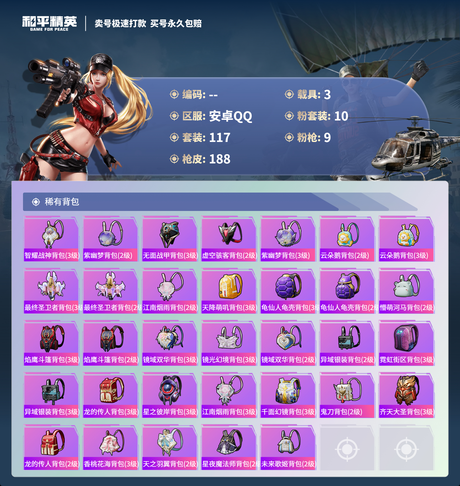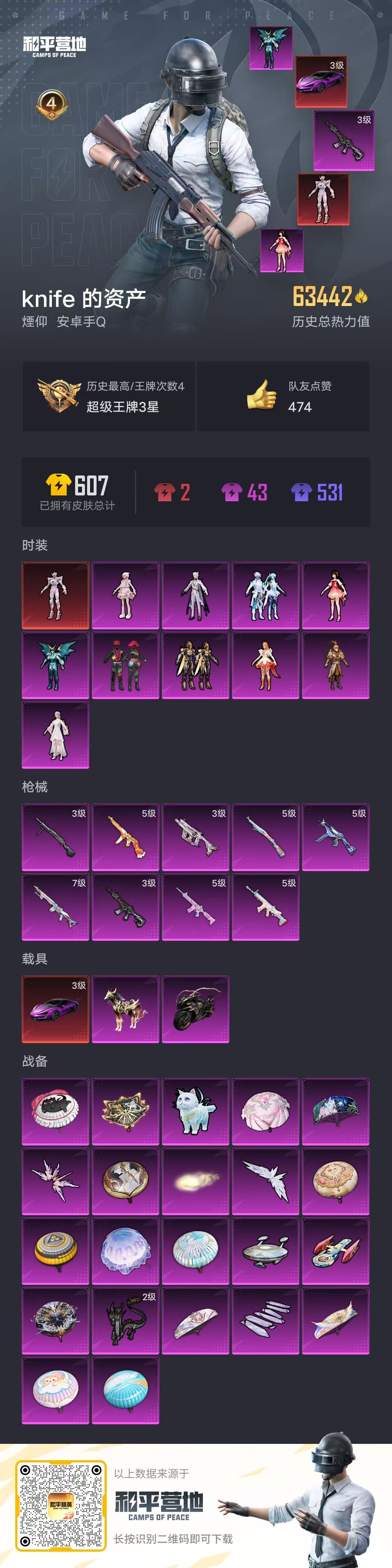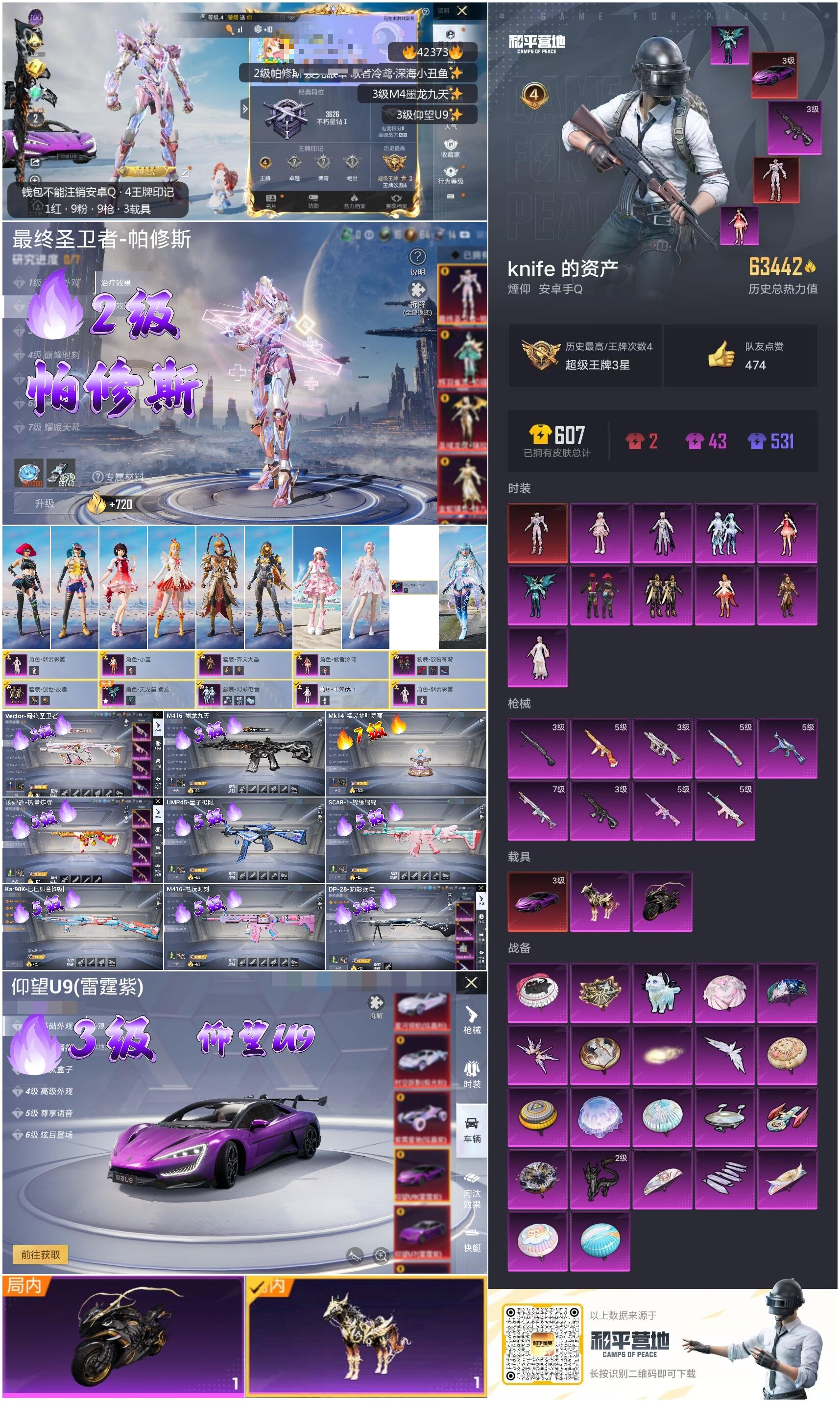 2156957-手q-4王牌印记-10粉装-9特效呛-3载具-63442热力值-117套装-188呛皮-0卓越印记-0传奇印记 【10粉装】放客神游天龙座 紫龙幻彩电音星渊羊梦糖心歌者泠鸢创世·救赎烟云彩露齐天大圣小蓝 【9特效呛】scar-l-锦绣绵绵-5级 m416-墨龙九天-3级 m416-电玩时刻-5级 kar98k-巳巳如意-5级 mk14-精灵梦叶罗丽-7级