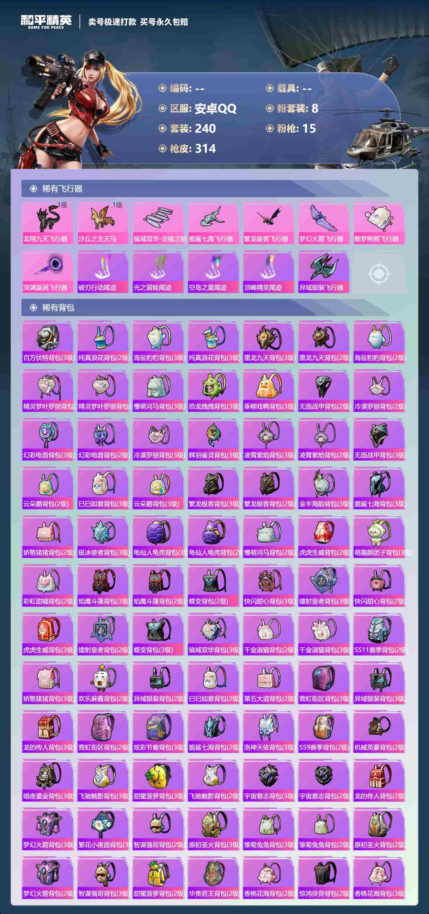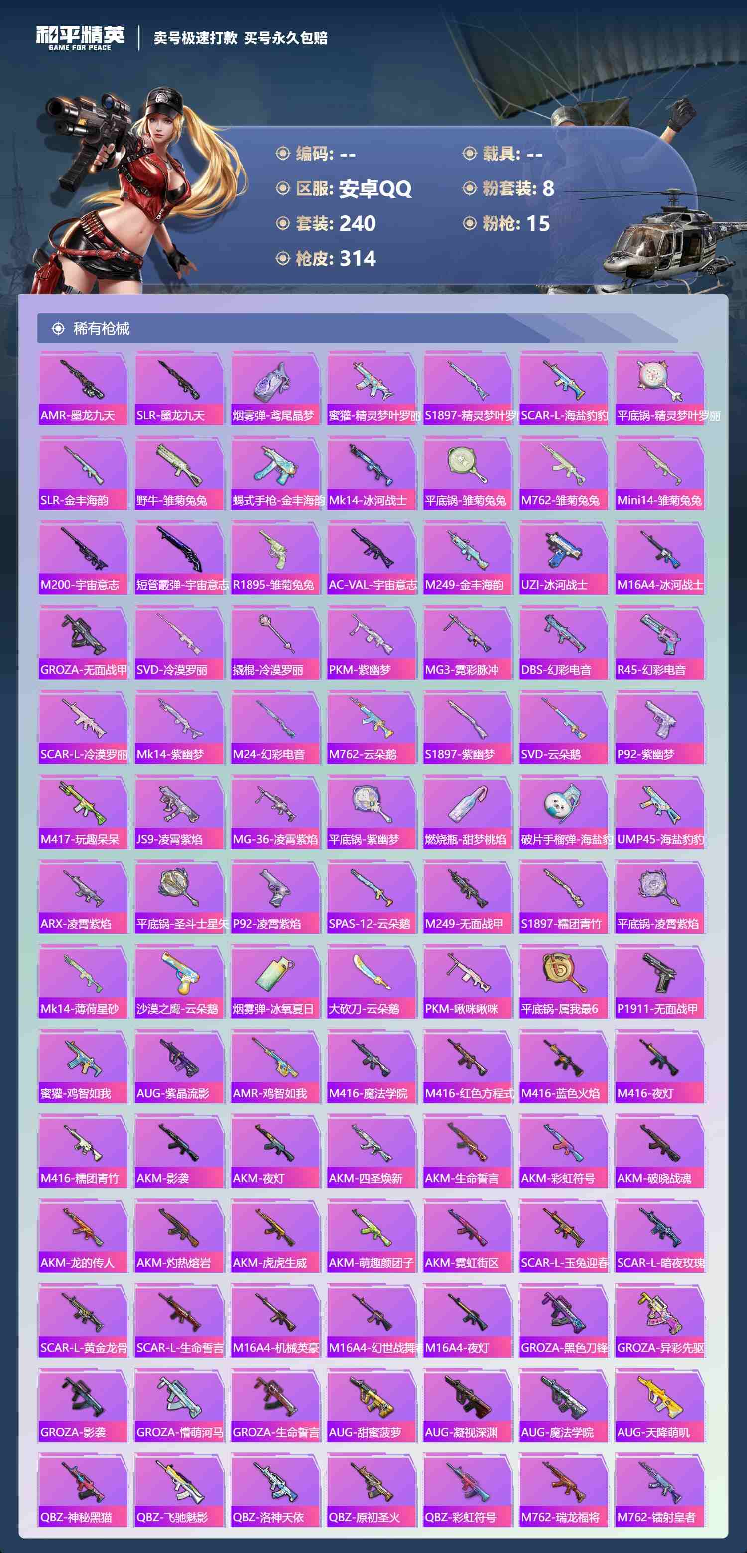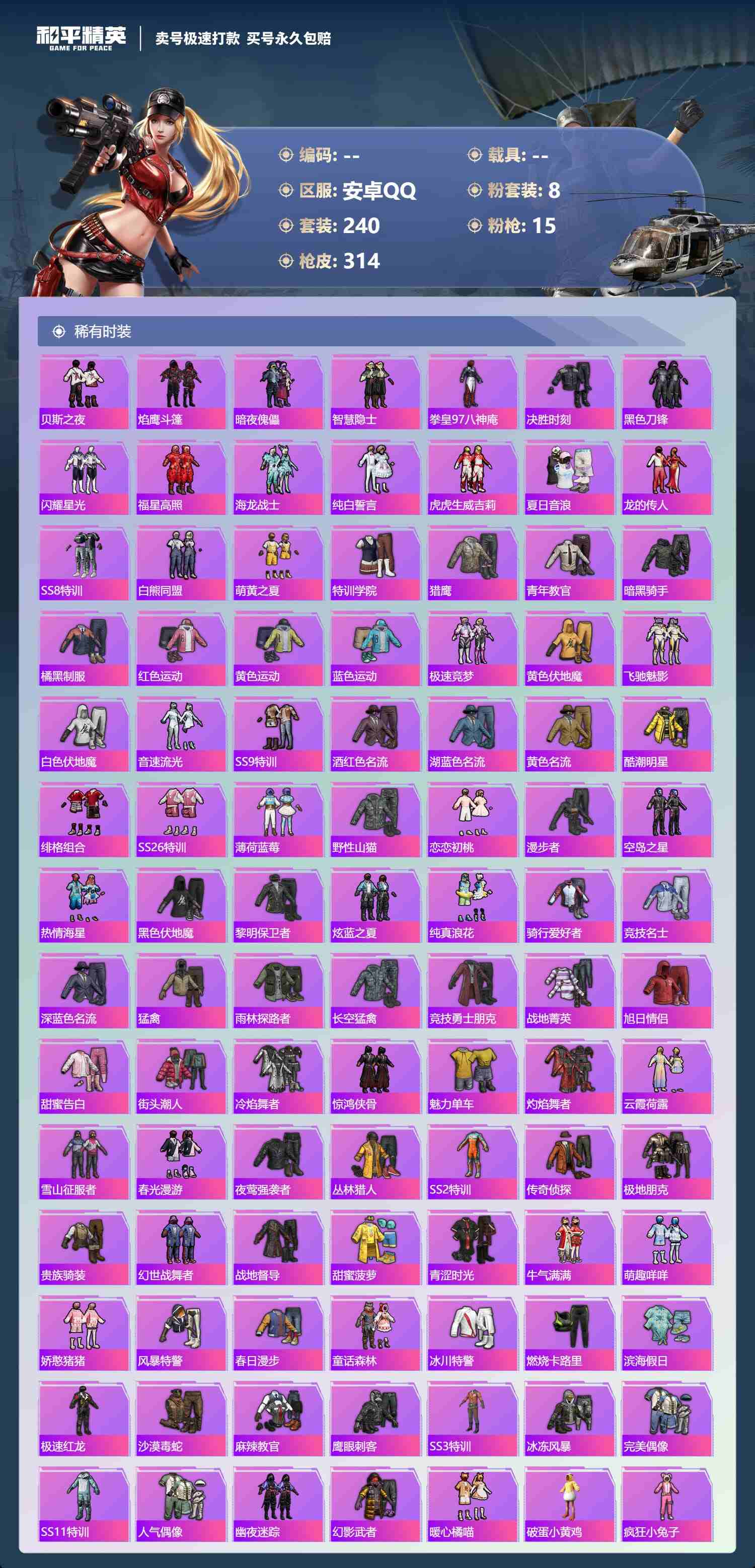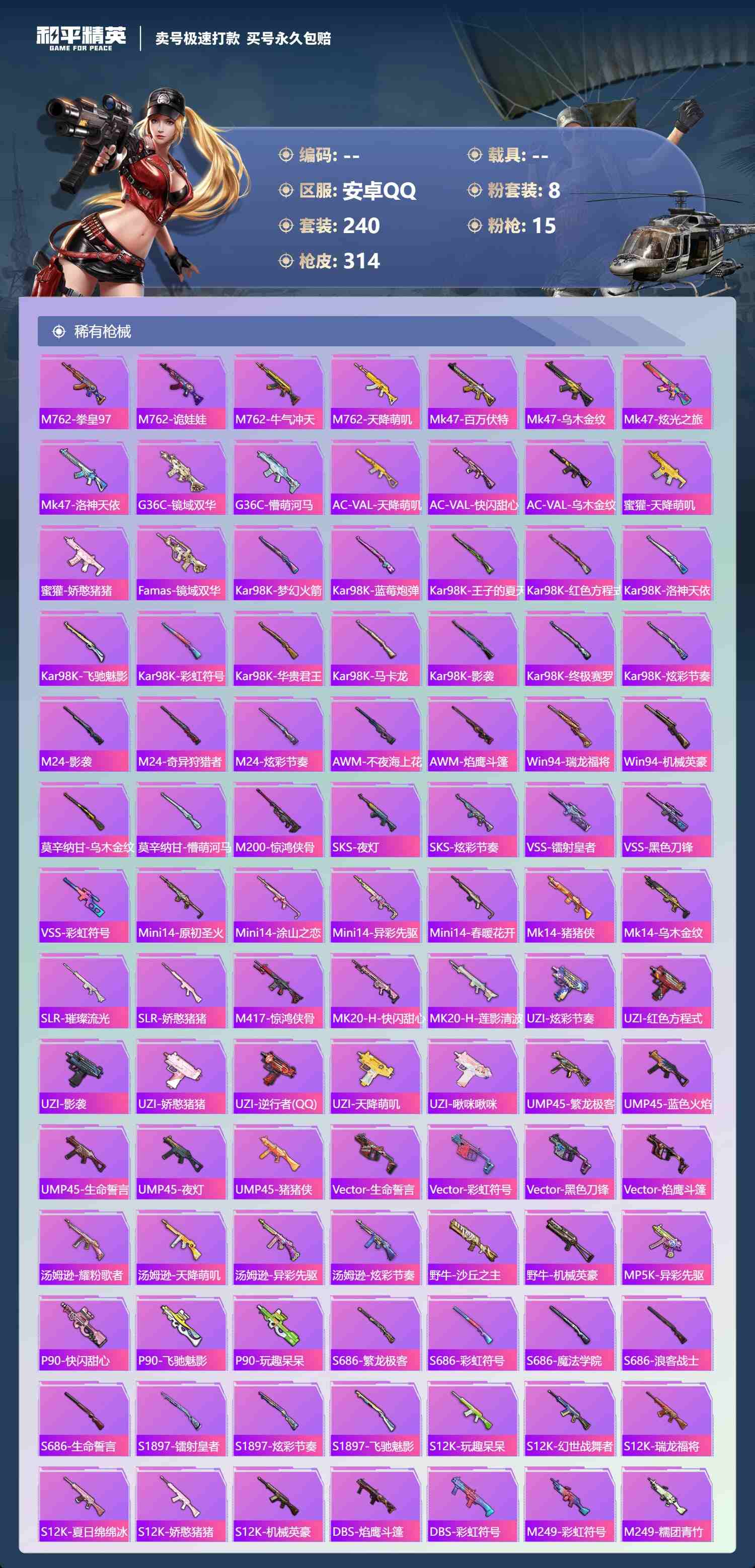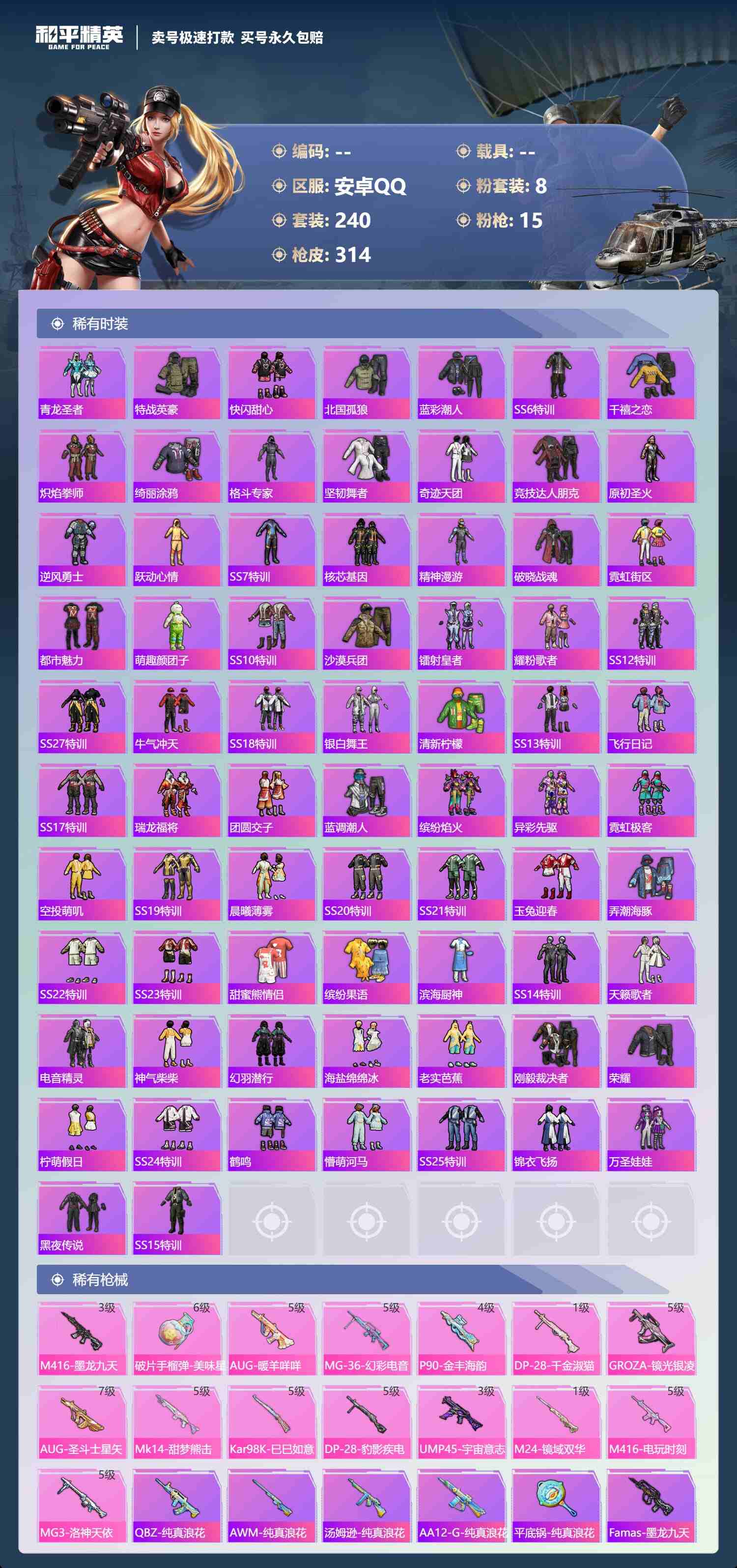 "TD10054/安卓QQ/营地号731457475/安卓手Q-12王牌印记-8粉装-15特效枪-0载具-110205热力值-240套装-314枪皮-1卓越印记-0传奇印记 【8粉装】梦幻火箭繁龙极客洛天依幻彩电音千金淑猫暗夜玫瑰脆鲨七海金丰海韵 【15特效枪】GROZA-镜光银凌-5级 AUG-圣斗士星矢-7级 AUG-暖羊咩咩-5级 M416-电玩时刻-5级 M416-墨龙九天-3级 Kar98K-巳巳如意-5级 M24-镜域双华-1级 Mk14-甜梦熊击-5级 UMP45-宇宙意志-3级 P90-金丰海韵-4级 DP-28-千金淑猫-1级 DP-28-豹影疾电-5级 MG-36-幻彩电音-5级 MG3-洛神天依-5级 破片手榴弹-美味星星糖-6级 【2红装】沙丘之主-图卡盟/5级宇宙意志-塞卢姆/1级 【5稀有紫装】派对舞王雪山精英迅捷狂鲨龟仙人金羽特工 【240稀有时装】图卡盟/5级塞卢姆/1级SS31特训SS33特训SS32特训彩虹兔蓝冰羽时希公主乐音灵公主极速光影霓虹热舞雪绒豹恋语绒绒SS34特训朱霞炽焰紫幽梦大橘大利龟仙人雪山精英游乐金羽特工迅捷狂鲨凌霄紫焰无面战甲擎苍青焰小鸟芋圆漫游都市薄荷星砂云朵鹅派对舞王顶瓜瓜龙魂突击队小熊娃娃异域银装火种守卫者都市丽猫摩登魅猫街头风暴星途旅人冰河战士荒漠狂战鱼渊荷华SS30特训青团波波燕燕于飞战术大师智谋强哥雏菊兔兔糖糖葫芦香桃花海蝶变巳巳如意SS28特训白光莹冰公主机械英豪机械征服者SS29特训萝兰蝴蝶SS5特训SS16特训贝斯之夜焰鹰斗篷暗夜傀儡智慧隐士拳皇97八神庵决胜时刻黑色刀锋闪耀星光福星高照海龙战士纯白誓言虎虎生威吉莉夏日音浪龙的传人SS8特训白熊同盟萌黄之夏特训学院猎鹰青年教官暗黑骑手橘黑制服红色运动黄色运动蓝色运动极速竞梦黄色伏地魔飞驰魅影白色伏地魔音速流光SS9特训酒红色名流湖蓝色名流黄色名流酷潮明星绯格组合SS26特训薄荷蓝莓野性山猫恋恋初桃漫步者空岛之星热情海星黑色伏地魔黎明保卫者炫蓝之夏纯真浪花骑行爱好者竞技名士深蓝色名流猛禽雨林探路者长空猛禽竞技勇士朋克战地菁英旭日情侣甜蜜告白街头潮人冷焰舞者惊鸿侠骨魅力单车灼焰舞者云霞荷露雪山征服者春光漫游夜莺强袭者丛林猎人SS2特训传奇侦探极地朋克贵族骑装幻世战舞者战地督导甜蜜菠萝青涩时光牛气满满萌趣咩咩娇憨猪猪风暴特警春日漫步童话森林冰川特警燃烧卡路里滨海假日极速红龙沙漠毒蛇麻辣教官鹰眼刺客SS3特训冰冻风暴完美偶像SS11特训人气偶像幽夜迷踪幻影武者暖心橘喵破蛋小黄鸡疯狂小兔子青龙圣者特战英豪快闪甜心北国孤狼蓝彩潮人SS6特训千禧之恋炽焰拳师绮丽涂鸦格斗专家坚韧舞者奇迹天团竞技达人朋克原初圣火逆风勇士跃动心情SS7特训核芯基因精神漫游破晓战魂霓虹街区都市魅力萌趣颜团子SS10特训沙漠兵团镭射皇者耀粉歌者SS12特训SS27特训牛气冲天SS18特训银白舞王清新柠檬SS13特训飞行日记SS17特训瑞龙福将团圆交子蓝调潮人缤纷焰火异彩先驱霓虹极客空投萌叽SS19特训晨曦薄雾SS20特训SS21特训玉兔迎春弄潮海豚SS22特训SS23特训甜蜜熊情侣缤纷果语滨海厨神SS14特训天籁歌者电音精灵神气柴柴幻羽潜行海盐绵绵冰老实芭蕉刚毅裁决者荣耀柠萌假日SS24特训鹤鸣懵萌河马SS25特训锦衣飞扬万圣娃娃黑夜传说SS15特训 【314稀有枪械】QBZ-纯真浪花AWM-纯真浪花汤姆逊-纯真浪花DBS-乌木金纹AA12-G-纯真浪花平底锅-纯真浪花M416-墨龙九天/3级Famas-墨龙九天AMR-墨龙九天SLR-墨龙九天烟雾弹-鸢尾晶梦蜜獾-精灵梦叶罗丽S1897-精灵梦叶罗丽SCAR-L-海盐豹豹平底锅-精灵梦叶罗丽破片手榴弹-美味星星糖/6级AUG-暖羊咩咩/5级MG-36-幻彩电音/5级P90-金丰海韵/4级DP-28-千金淑猫/1级GROZA-镜光银凌/5级AUG-圣斗士星矢/7级Mk14-甜梦熊击/5级Kar98K-巳巳如意/5级DP-28-豹影疾电/5级UMP45-宇宙意志/3级SLR-金丰海韵野牛-雏菊兔兔蝎式手枪-金丰海韵Mk14-冰河战士平底锅-雏菊兔兔M762-雏菊兔兔Mini14-雏菊兔兔M200-宇宙意志短管霰弹-宇宙意志R1895-雏菊兔兔AC-VAL-宇宙意志M249-金丰海韵UZI-冰河战士M16A4-冰河战士MK20-H-乌木金纹M24-镜域双华/1级M416-电玩时刻/5级MG3-洛神天依/5级GROZA-无面战甲SVD-冷漠罗丽撬棍-冷漠罗丽PKM-紫幽梦MG3-霓彩脉冲DBS-幻彩电音R45-幻彩电音SCAR-L-冷漠罗丽Mk14-紫幽梦M24-幻彩电音蜜獾-乌木金纹M762-云朵鹅S1897-紫幽梦SVD-云朵鹅P92-紫幽梦M417-玩趣呆呆JS9-凌霄紫焰MG-36-凌霄紫焰平底锅-紫幽梦燃烧瓶-甜梦桃焰破片手榴弹-海盐豹豹UMP45-海盐豹豹ARX-凌霄紫焰AKS-74U-乌木金纹平底锅-圣斗士星矢P92-凌霄紫焰Famas-乌木金纹SPAS-12-云朵鹅M249-无面战甲S1897-糯团青竹平底锅-凌霄紫焰Mk14-薄荷星砂沙漠之鹰-云朵鹅烟雾弹-冰氧夏日大砍刀-云朵鹅PKM-啾咪啾咪平底锅-属我最6P1911-无面战甲蜜獾-鸡智如我AUG-紫晶流影AMR-鸡智如我M416-魔法学院M416-红色方程式M416-乌木金纹M416-蓝色火焰M416-夜灯M416-糯团青竹AKM-影袭AKM-夜灯AKM-四圣焕新AKM-生命誓言AKM-乌木金纹AKM-彩虹符号AKM-破晓战魂AKM-龙的传人AKM-灼热熔岩AKM-虎虎生威AKM-萌趣颜团子AKM-霓虹街区SCAR-L-玉兔迎春SCAR-L-乌木金纹SCAR-L-暗夜玫瑰SCAR-L-黄金龙骨SCAR-L-生命誓言M16A4-机械英豪M16A4-幻世战舞者M16A4-乌木金纹M16A4-夜灯GROZA-乌木金纹GROZA-黑色刀锋GROZA-异彩先驱GROZA-影袭GROZA-懵萌河马GROZA-生命誓言AUG-乌木金纹AUG-甜蜜菠萝AUG-凝视深渊AUG-魔法学院AUG-天降萌叽QBZ-神秘黑猫QBZ-飞驰魅影QBZ-洛神天依QBZ-原初圣火QBZ-乌木金纹QBZ-彩虹符号M762-瑞龙福将M762-镭射皇者M762-拳皇97M762-诡娃娃M762-乌木