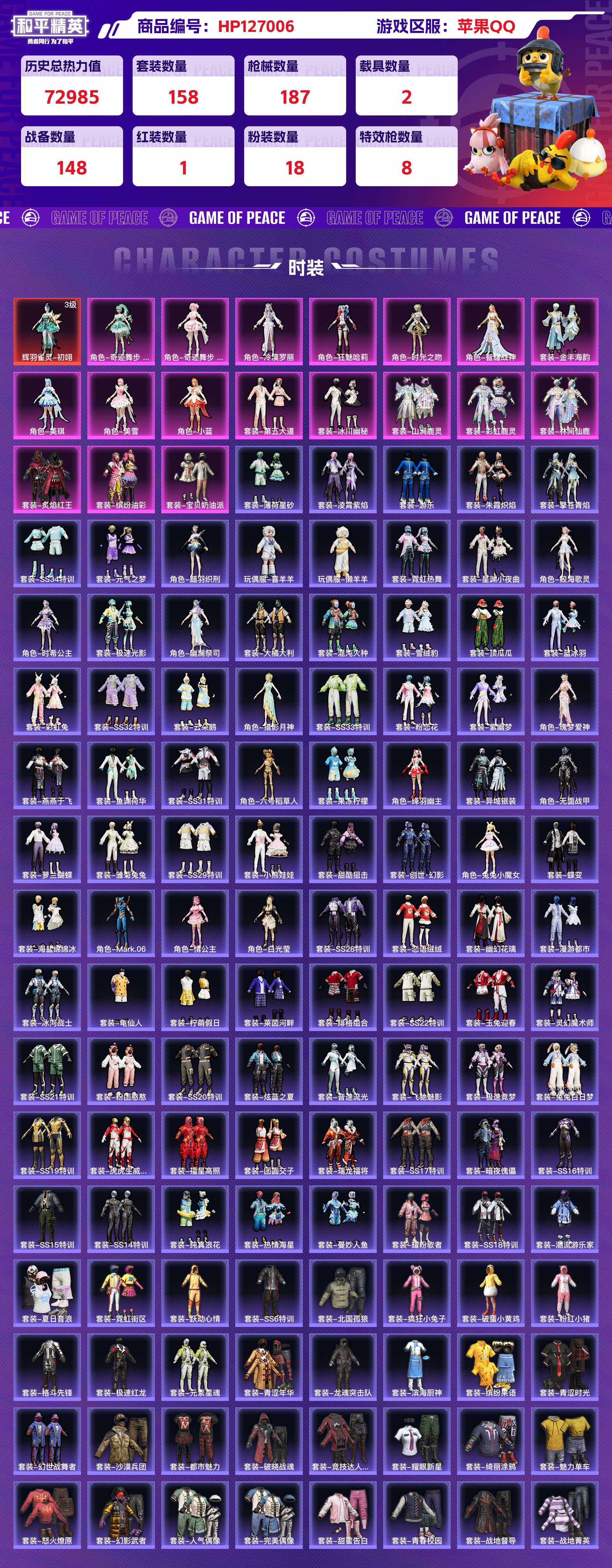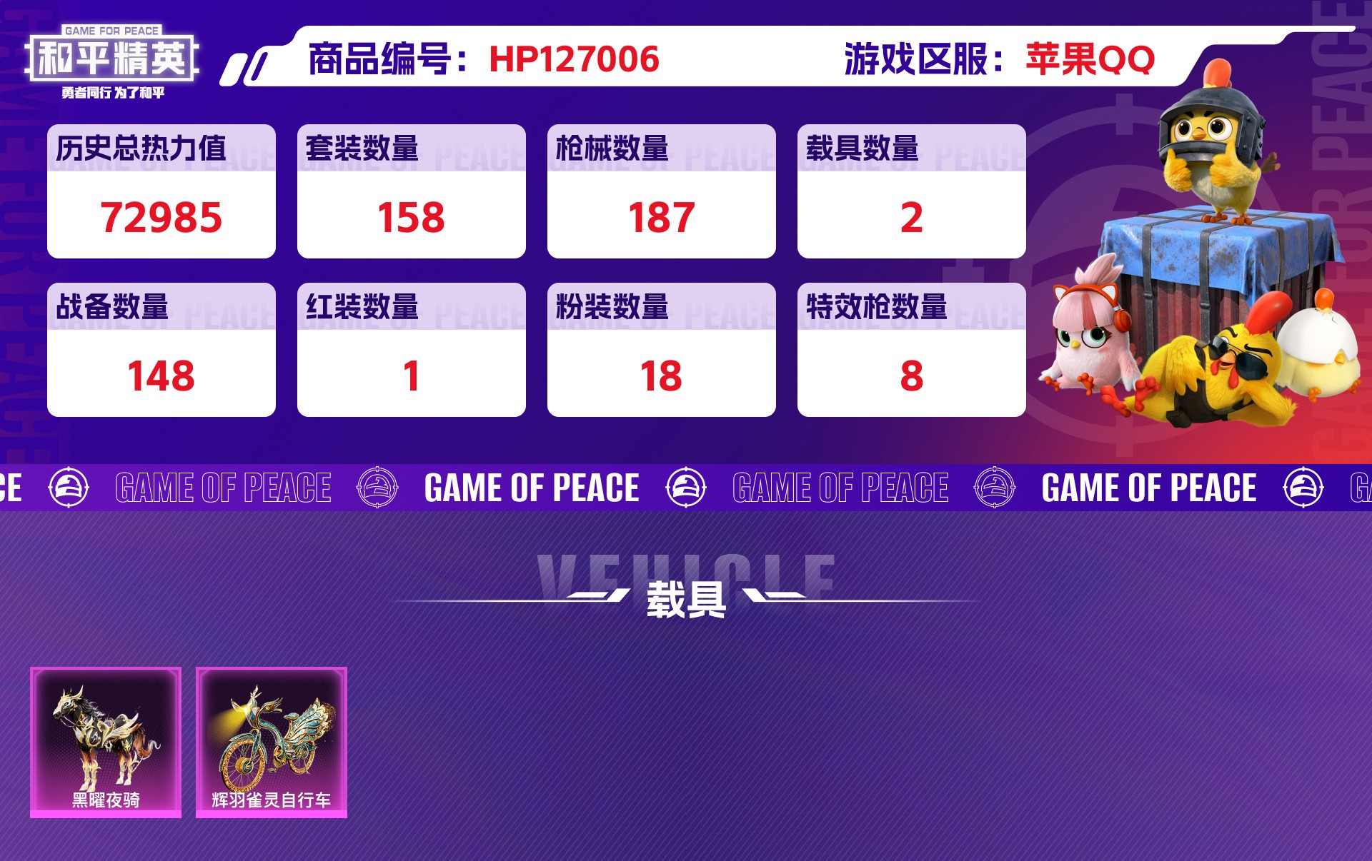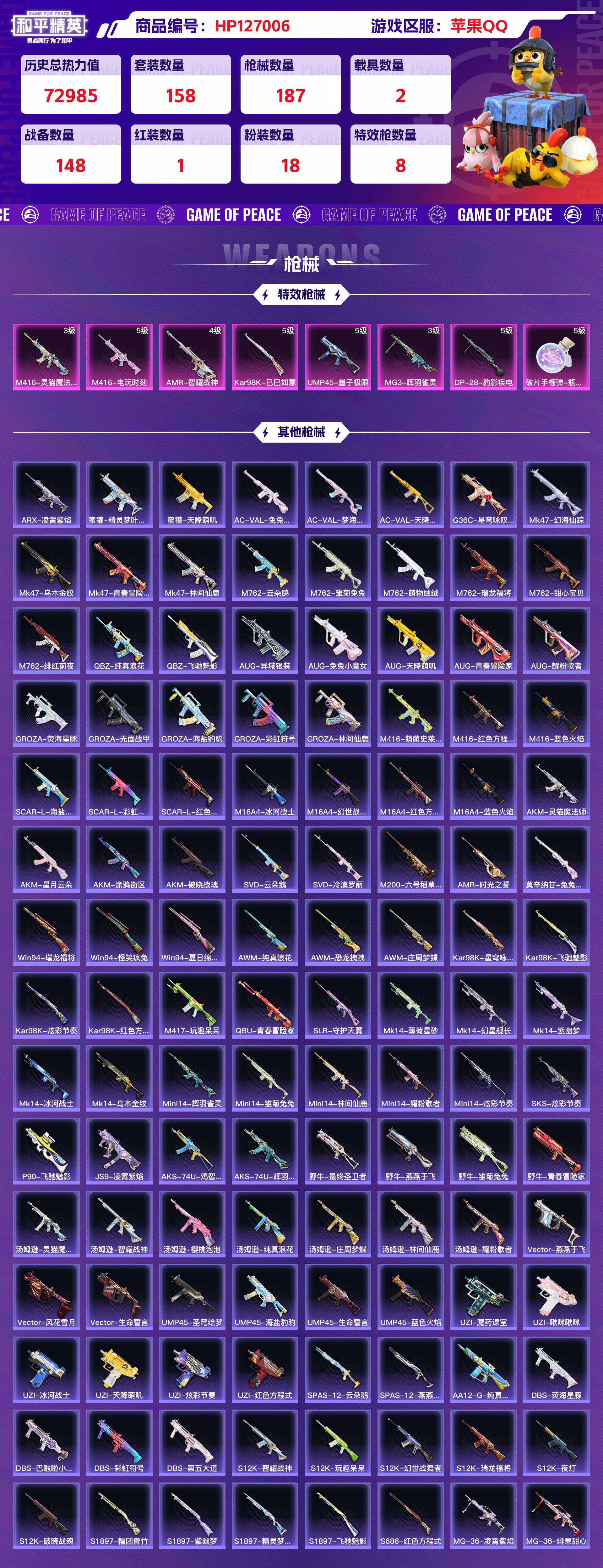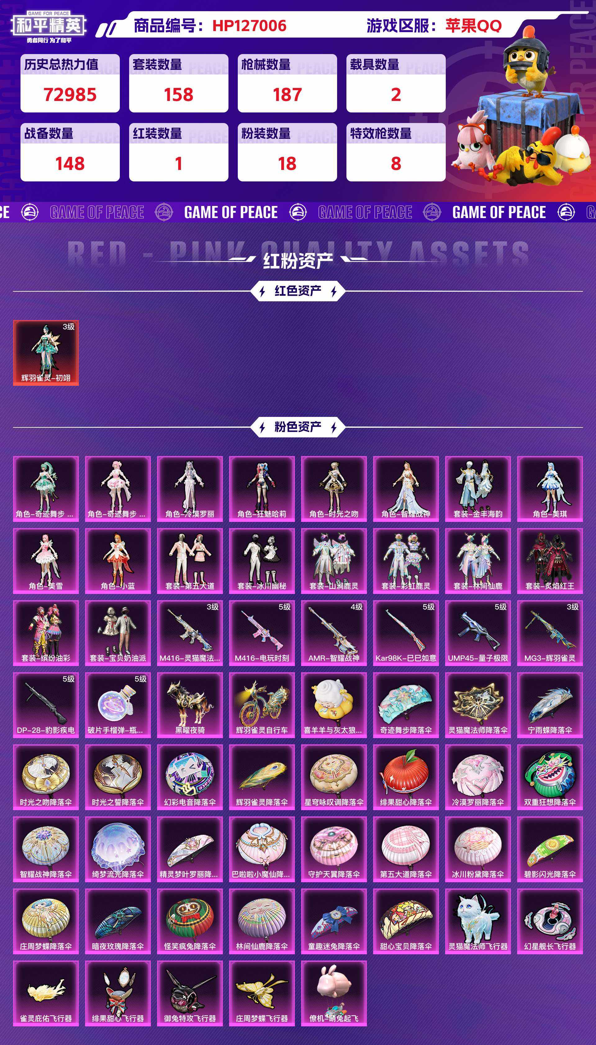 hp127006|精品号苹果qq红装1(辉羽雀灵-初翊)粉装18(小蓝 美琪 美雪 等)粉呛8(m416-电玩时刻 ump45-量子极限 kar98k-巳巳如意 等)载具2(辉羽雀灵自行车黑曜夜骑)