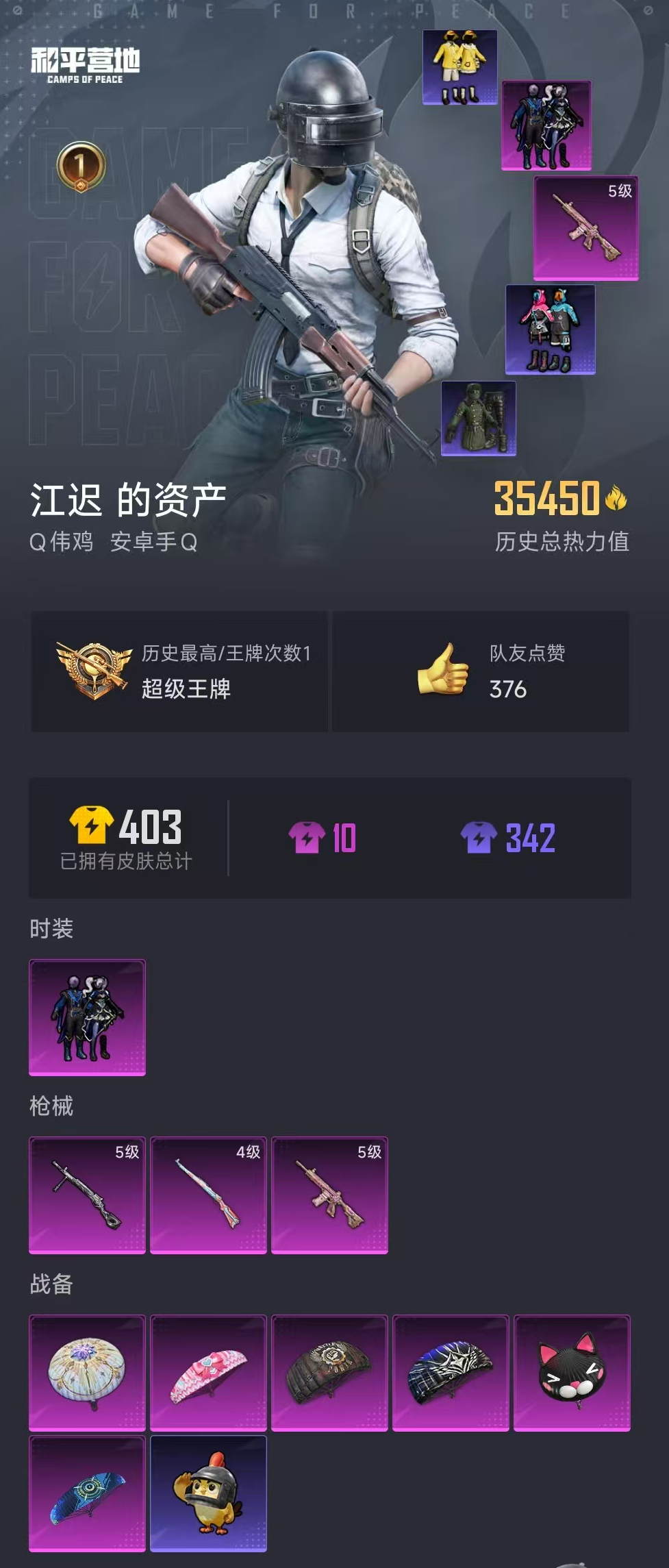 【和平精英】【lyhp12303】3.5w热力值1粉装3特效呛 暗夜玫瑰 老六服 小黄鸭 5级高级外观心之恋语m4 1粉装,3特效呛,0载具,历史最高段位:超级王牌 王牌印记1次 热力值:35450,104套装,114呛械,108装备,53战备;套装:套装-暗夜玫瑰,套装-特训学院,套装-橘黑制服,套装-红色运动,套装-黄色运动,套装-蓝色运动,套装-白色伏地魔,套装-骑行爱好者,套装-冰川格斗者,套装-深海格斗者,套装-深蓝色名流,套装-湖蓝色名流,套装-黄色名流,套装-猛禽,套装-长空猛禽,套装-竞技勇士朋克,套装-灰色守护者,套装-雨林探路者,套装-沙漠探路者,套装-战地督导,套装-突袭者,套装-灰色格斗者,套装-龙腾端午,套装-燃烧卡路里,套装-沙漠毒蛇,套装-鹰眼刺客,套装-完美偶像,套装-人气偶像,套装-蓝彩潮人,套装-怒火燎原,套装-魅力单车,套装-绮丽涂鸦,套装-耀眼新星,套装-坚韧舞者,套装-朋克治安官,套装-野性战心,套装-野性战魂,套装-丛林猎人,套装-雪山精英,套装-酷潮明星,套装-传奇侦探,套装-摩艾涂鸦,套装-缤纷果语,套装-冰川特警,套装-格斗先锋,套装-疯狂小兔子,套装-深蓝冒险家,套装-迷域探索者,套装-机械英豪,套装-机械征服者,套装-北国孤狼,套装-ss6特训,套装-拳皇97八神庵,套装-炽焰拳师,套装-格斗专家,套装-跃动心情,套装-ss7特训,套装-黑色刀锋,套装-核芯基因,套装-精神漫游,套装-银河圣歌,套装-霓虹街区,套装-暗夜契约,套装-赛博空间,套装-ss10特训,套装-潮萌小黄鸭,套装-ss8特训,套装-众神之王,套装-智慧之神,套装-神秘黑猫,套装-软萌银虎,套装-萌黄之夏,套装-夏日音浪,套装-ss9特训,套装-风华少年志,套装-牛气满满,套装-梦之呓语,套装-ss11特训,套装-青龙圣者,套装-原初圣火,套装-逆风勇士,套装-萌趣颜团子,套装-ss12特训,套装-牛气冲天,套装-耀粉歌者,套装-ss13特训,套装-ss14特训,套装-ss15特训,套装-ss16特训,套装-暗夜魅影,套装-ss17特训,套装-福星高照,套装-王牌教练,套装-青玉碎影,套装-恋语绒绒,套装-ss31特训,套装-鱼渊荷华,套装-燕燕于飞,套装-ss33特训,套装-ss32特训,套装-大橘大利,套装-星渊小夜曲,套装-元气之梦,套装-ss34特训;呛皮:akm-灼热熔岩,akm-生命誓言,akm-玉龙,akm-破晓战魂,akm-锦绣火鲤,akm-萌趣颜团子,akm-虎虎生威,akm-乌木金纹,m762-绯红前夜,m762-奇异狩猎者,m762-拳皇97,m762-牛气冲天,m762-乌木金纹,groza-黑色刀锋,groza-乌木金纹,q-神秘黑猫,q-原初圣火,q-乌木金纹,famas-乌木金纹,5级m416-心之恋语,m416-夜灯,m416-红色方程式,m416-动感兔斯基,m416-乌木金纹,aug-耀粉歌者,aug-乌木金纹,g36c-不夜海上花,g36c-乌木金纹,ac-val-天降萌叽,scar-l-炫彩节奏,scar-l-乌木金纹,m16a4-机械英豪,m16a4-乌木金纹,蜜獾-乌木金纹,4级kar98k-巳巳如意,kar98k-勇闯险境,kar98k-彩虹符号,kar98k-电玩视界,kar98k-乌木金纹,m200-乌木金纹,awm-不夜海上花,awm-乌木金纹,win94-机械英豪,m24-影袭,m24-众神之王,m24-樱桃泡泡,vss-黑色刀锋,vss-星之彼岸,vss-乌木金纹,mini14-原初圣火,mini14-炫彩节奏,mini14-鸡智如我,mini14-乌木金纹,mk14-薄荷星砂,sks-勇闯险境,sks-乌木金纹,qbu-不夜海上花,slr-众神之王,vect-生命誓言,vect-黑色刀锋,vect-彩虹符号,vect-燕燕于飞,vect-乌木金纹,野牛-机械英豪,野牛-燕燕于飞,aks-74u-乌木金纹,汤姆逊-勇闯险境,汤姆逊-天降萌叽,汤姆逊-乌木金纹,uzi-众神之王,uzi-炫彩节奏,uzi-乌木金纹,mp5k-众神之王,mp5k-梨园星光,ump45-乌木金纹,s686-奇异狩猎者,s686-生命誓言,s686-不夜海上花,s686-乌木金纹,dbs-彩虹符号,s1897-勇闯险境,s1897-糯团青竹,s1897-乌木金纹,spas-12-燕燕于飞,s12k-华贵君王,s12k-机械英豪,s12k-玩趣呆呆,s12k-乌木金纹,m249-百万伏特,m249-古堡领主,m249-拳皇97,m249-四圣焕新,m249-星之彼岸,m249-乌木金纹,5级dp-28-豹影疾电,dp-28-潮萌小黄鸭,dp-28-原初圣火,dp-28-彩虹符号,dp-28-乌木金纹,mg3-幻世战舞者,pkm-啾咪啾咪,p92-拳皇97,p18c-原初圣火,蝎式手呛-燕燕于飞,撬棍-传奇侦探,平底锅-拳皇97,平底锅-黑色刀锋,平底锅-勇闯险境,平底锅-缤纷糖果,平底锅-众神之王,平底锅-不夜海上花,平底锅-机械英豪,平底锅-原初圣火,十子怒-燕燕于飞;降落伞:未来战士降落伞,古堡领主降落伞,神秘黑猫降落伞,pel轰鸣竞梦者降落伞,樱桃泡泡降落伞,智耀战神降落伞,都市猎人降落伞,蓝海之火降落伞,化学天才降落伞,钢铁雄心降落伞,勇闯险境降落伞,丛林猎人降落伞,拳皇97降落伞,黑色刀锋降落伞,霓虹街区降落伞,众神之王降落伞,不夜海上花降落伞,山经魅狐降落伞,机械英豪降落伞,跑卡漂移降落伞,牛气冲天降落伞,原初圣火降落伞,燕燕于飞降落伞,ss32王牌降落伞,一举夺葵降落伞,紫菱降落伞,青羽降落伞,蝶舞翩翩降落伞,夏日音浪降落伞,普通降落伞;滑翔尾迹:粉色滑翔尾迹; 详情看图
