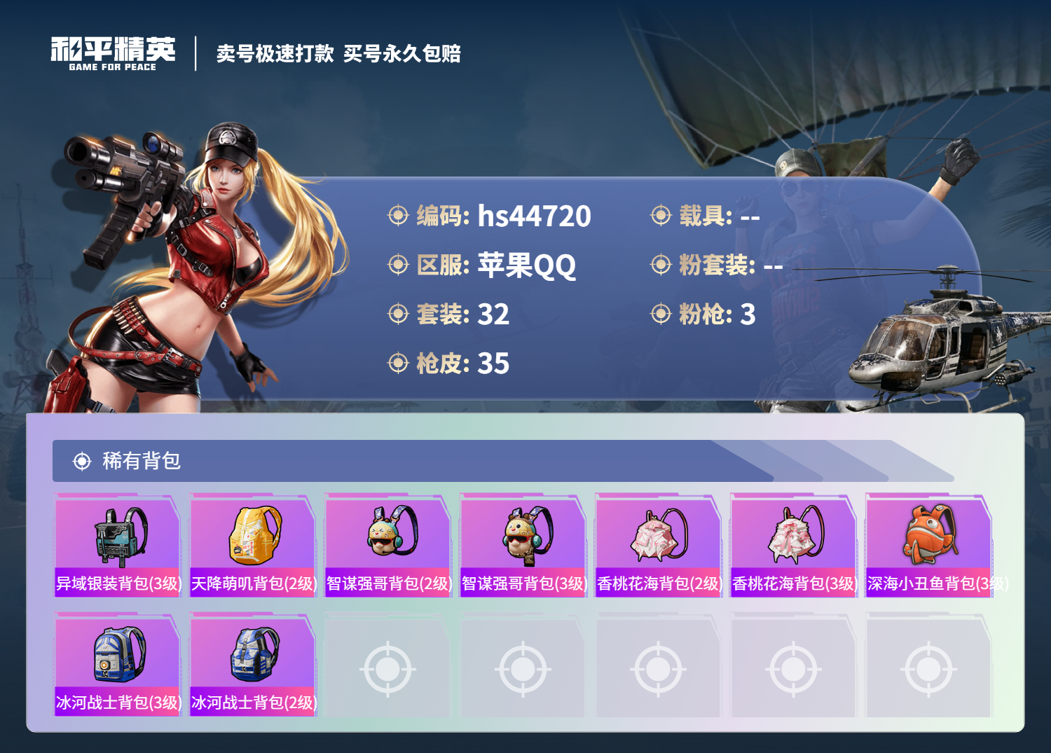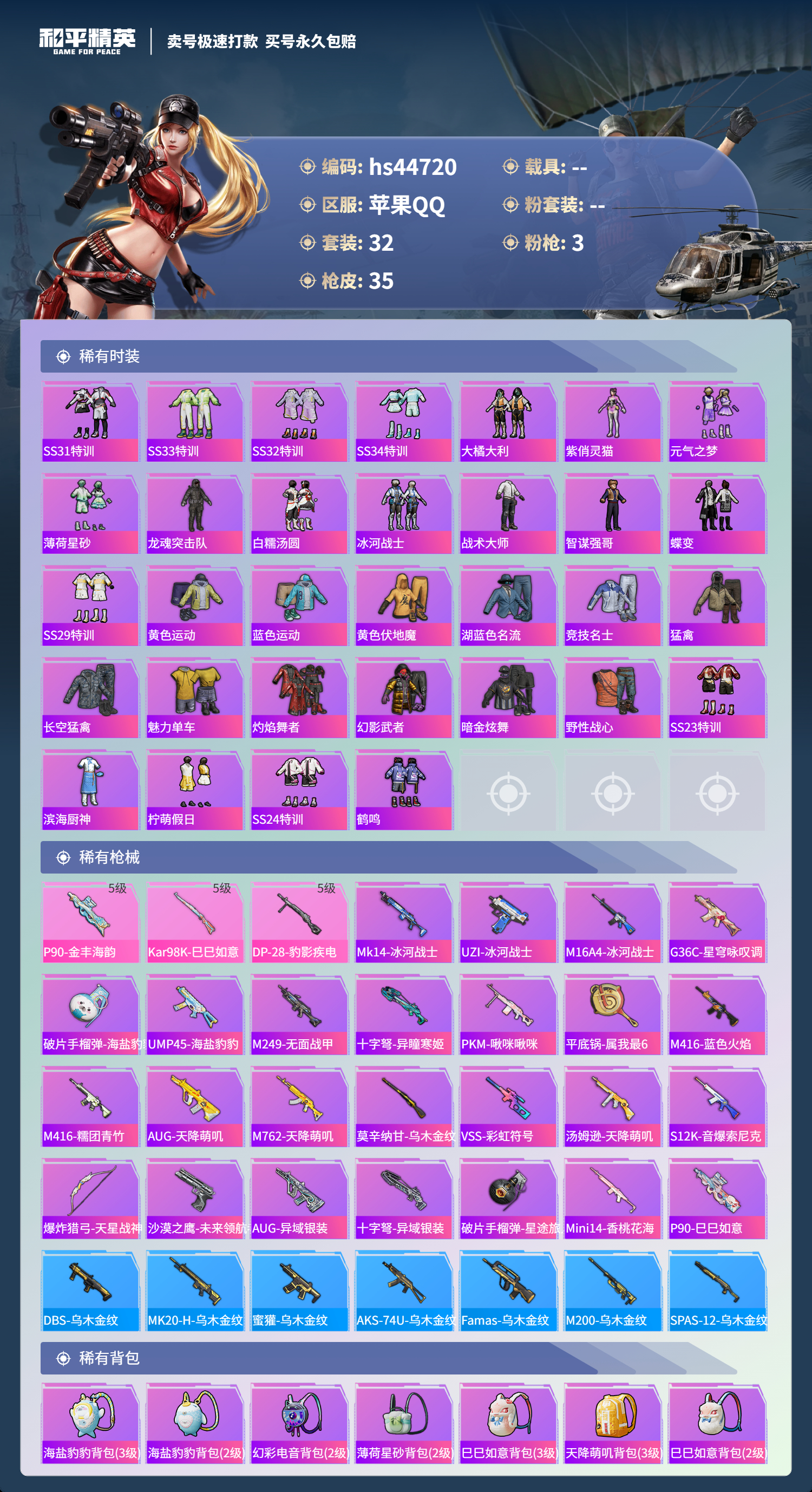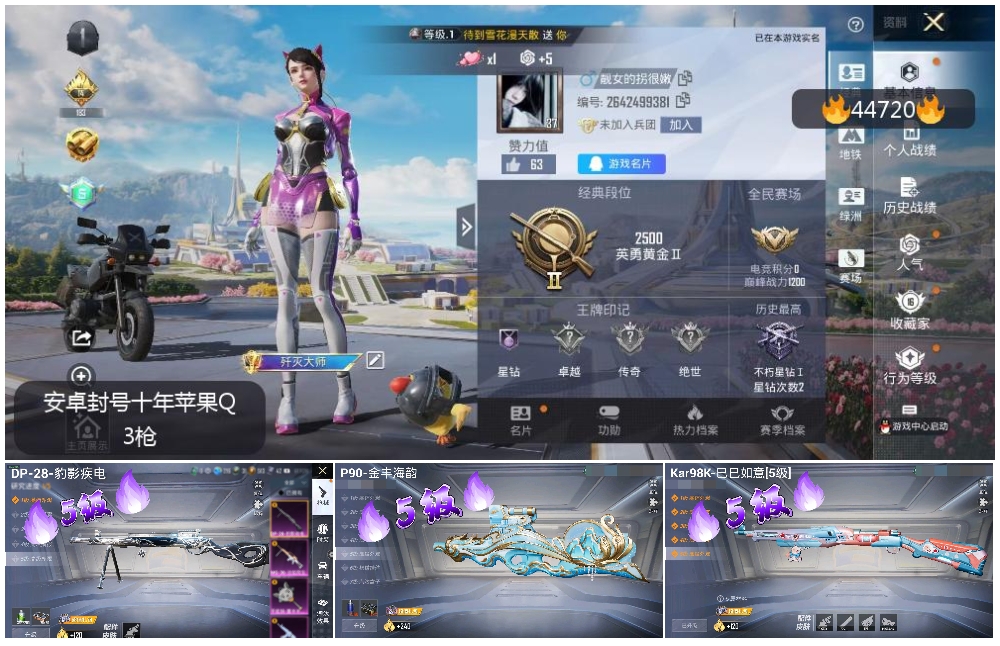 hs44720 苹果手q-0王牌印记-0粉装-3特效呛-0载具-10810热力值-32套装-35呛皮-0卓越印记-0传奇印记 【3特效呛】kar98k-巳巳如意-5级 p90-金丰海韵-5级 dp-2
