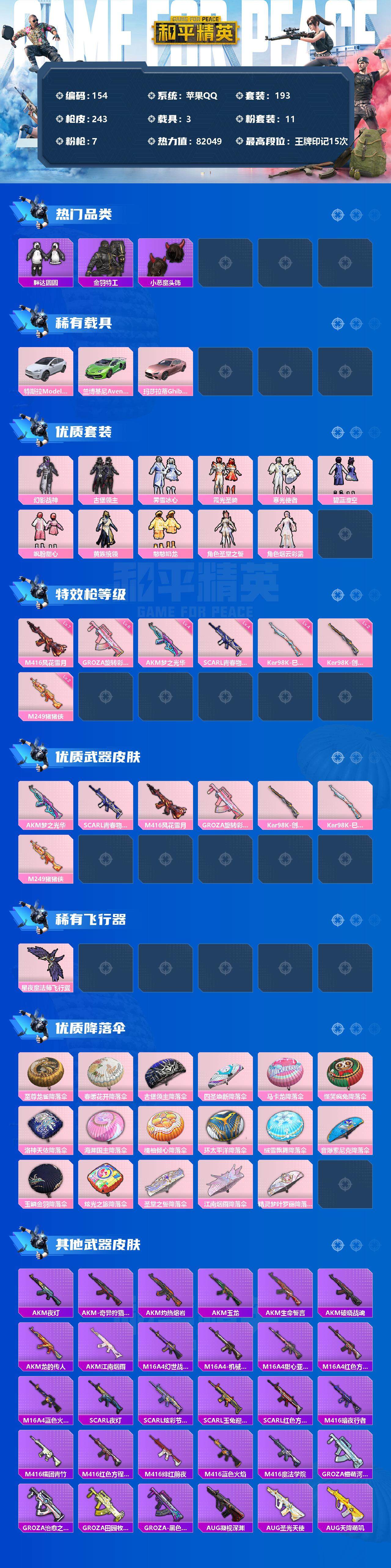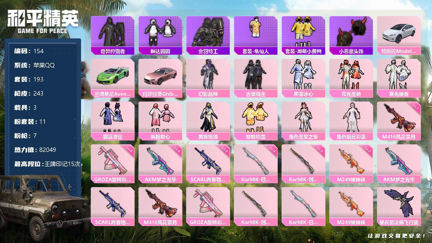 [12482298]【商品标题】:苹果 手q-11粉装-7特效呛-3载具-1粉色飞行器-82049热力值-15王牌印记-193套装-243呛皮 【热门品类】:套装-奇异狩猎者,套装-胖达圆圆,套装-金羽特工,套装-龟仙人,套装-潮萌小黄鸭,小恶魔头饰 【粉色载具】:特斯拉model x(珍珠白),兰博基尼aventad svj(翡翠绿),玛莎拉蒂ghibli(粉) 【粉色套装】:粉装-幻影战神,粉装-古堡领主,粉装-霁雪冰心,粉装-霞光圣骑,粉装-寒光使者,粉装-碧蓝澄空,粉装-飒粉甜心,粉装-黄族统领,粉装-憨憨奶龙,角色-圣堂之誓,角色-烟云彩露 【粉色呛皮等级】:akm-梦之光华四级,scar-l-青春物语四级,m416-风花雪月七级,groza-旋转彩虹六级,kar98k-创世·救赎二级,kar98k-巳巳如意四级,m249-猪猪侠二级 【粉色呛皮】:akm-梦之光华,scar-l-青春物语,m416-风花雪月,groza-旋转彩虹,kar98k-创世·救赎,kar98k-巳巳如意,m249-猪猪侠 【粉色飞行器】:星夜魔法师飞行翼 【粉色降落伞】:至尊龙雀降落伞,春暖花开降落伞,古堡领主降落伞,四圣焕新降落伞,马卡龙降落伞,怪笑疯兔降落伞,洛神天依降落伞,海渊国主降落伞,橘柚倾心降落伞,环太平洋降落伞,绒雪飘舞降落伞,音爆索尼克降落伞,玉鳞金羽降落伞,炫光之旅降落伞,圣堂之誓降落伞,江南烟雨降落伞,精灵梦叶罗丽降落伞 【稀有套装】:套装-龟仙人 【稀有呛皮】:akm-夜灯,akm-奇异狩猎者,akm-江南烟雨,akm-灼热熔岩,akm-玉龙,akm-生命誓言,akm-破晓战魂,akm-龙的传人,m16a4-幻世战舞者,m16a4-机械英豪,m16a4-甜心亚梦,m16a4-红色方程式,m16a4-蓝色火焰,scar-l-夜灯,scar-l-炫彩节奏,scar-l-玉兔迎春,scar-l-红色方程式,m416-暗夜行者,m416-糯团青竹,m416-红色方程式,m416-绯红前夜,m416-蓝色火焰,m416-魔法学院,groza-懵萌河马,groza-治愈之星,groza-田园牧歌,groza-黑色刀锋,aug-凝视深渊,aug-圣光天使,aug-天降萌叽,aug-耀粉歌者,q-原初圣火,q-彩虹符号,q-洛神天依,q-飞驰魅