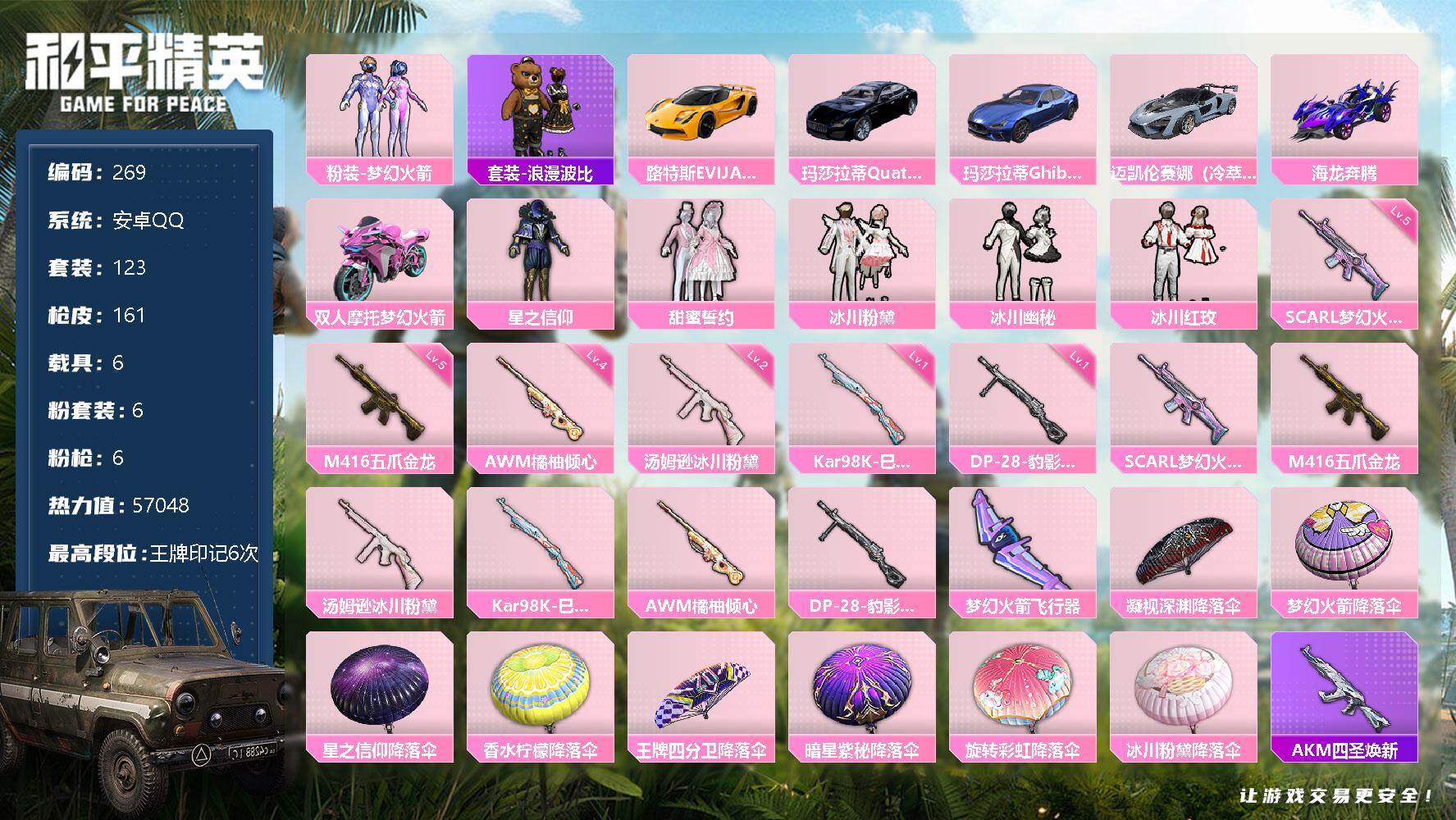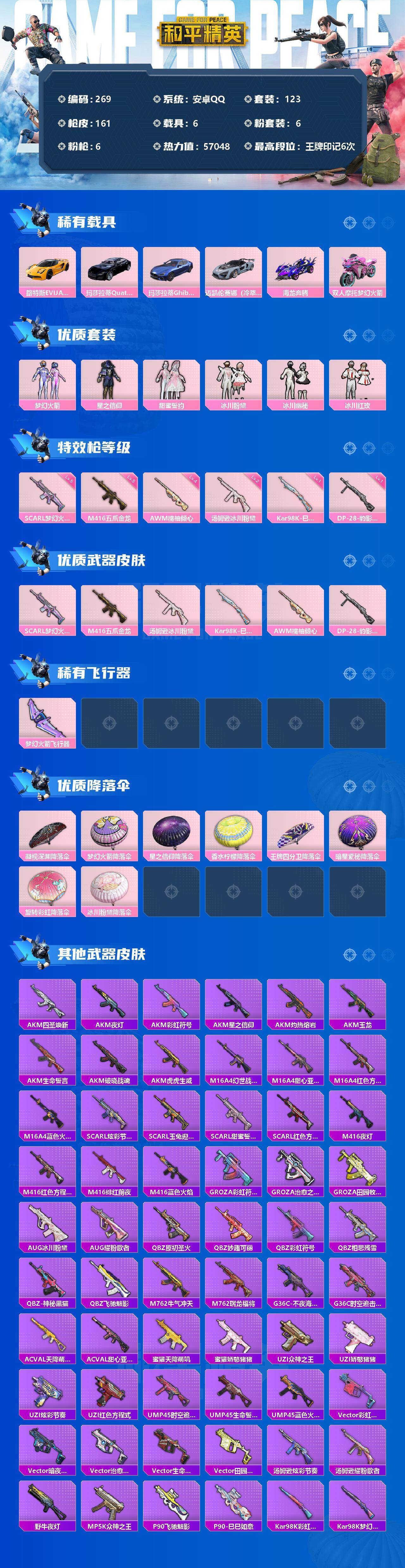 [12482552]【商品标题】:安卓 手q-6粉装-6特效呛-6载具-1粉色飞行器-57048热力值-6王牌印记-123套装-161呛皮 【热门品类】:粉装-梦幻火箭,套装-浪漫波比 【粉色载具】:路特斯evija(星际黄),玛莎拉蒂quattropte(夜幕蓝),玛莎拉蒂ghibli(蓝),迈凯伦塞纳(冷萃蓝),海龙奔腾,双人摩托-梦幻火箭 【粉色套装】:粉装-梦幻火箭,粉装-星之信仰,粉装-甜蜜誓约,粉装-冰川粉黛,粉装-冰川幽秘,粉装-冰川红玫 【粉色呛皮等级】:scar-l-梦幻火箭五级,m416-五爪金龙五级,汤姆逊-冰川粉黛二级,kar98k-巳巳如意一级,awm-橘柚倾心四级,dp-28-豹影疾电一级 【粉色呛皮】:scar-l-梦幻火箭,m416-五爪金龙,汤姆逊-冰川粉黛,kar98k-巳巳如意,awm-橘柚倾心,dp-28-豹影疾电 【粉色飞行器】:梦幻火箭飞行器 【粉色降落伞】:凝视深渊降落伞,梦幻火箭降落伞,星之信仰降落伞,香水柠檬降落伞,王牌四分卫降落伞,暗星紫秘降落伞,旋转彩虹降落伞,冰川粉黛降落伞 【稀有呛皮】:akm-四圣焕新,akm-夜灯,akm-彩虹符号,akm-星之信仰,akm-灼热熔岩,akm-玉龙,akm-生命誓言,akm-破晓战魂,akm-虎虎生威,m16a4-幻世战舞者,m16a4-甜心亚梦,m16a4-红色方程式,m16a4-蓝色火焰,scar-l-炫彩节奏,scar-l-玉兔迎春,scar-l-甜蜜誓约,scar-l-红色方程式,m416-夜灯,m416-红色方程式,m416-绯红前夜,m416-蓝色火焰,groza-彩虹符号,groza-治愈之星,groza-田园牧歌,aug-冰川粉黛,aug-耀粉歌者,q-原初圣火,q-妙趣可丽,q-彩虹符号,q-相思残雪,q-神秘黑猫,q-飞驰魅影,m762-牛气冲天,m762-瑞龙福将,g36c-不夜海上花,g36c-时空追击者,ac-val-天降萌叽,ac-val-甜心亚梦,蜜獾-天降萌叽,蜜獾-娇憨猪猪,uzi-众神之王,uzi-娇憨猪猪,uzi-炫彩节奏,uzi-红色方程式,ump45-时空追击者,ump45-生命誓言,ump45-蓝色火焰,vect-彩虹符号,vect-暗夜玫瑰,vect-治愈之星,vect-生命誓言