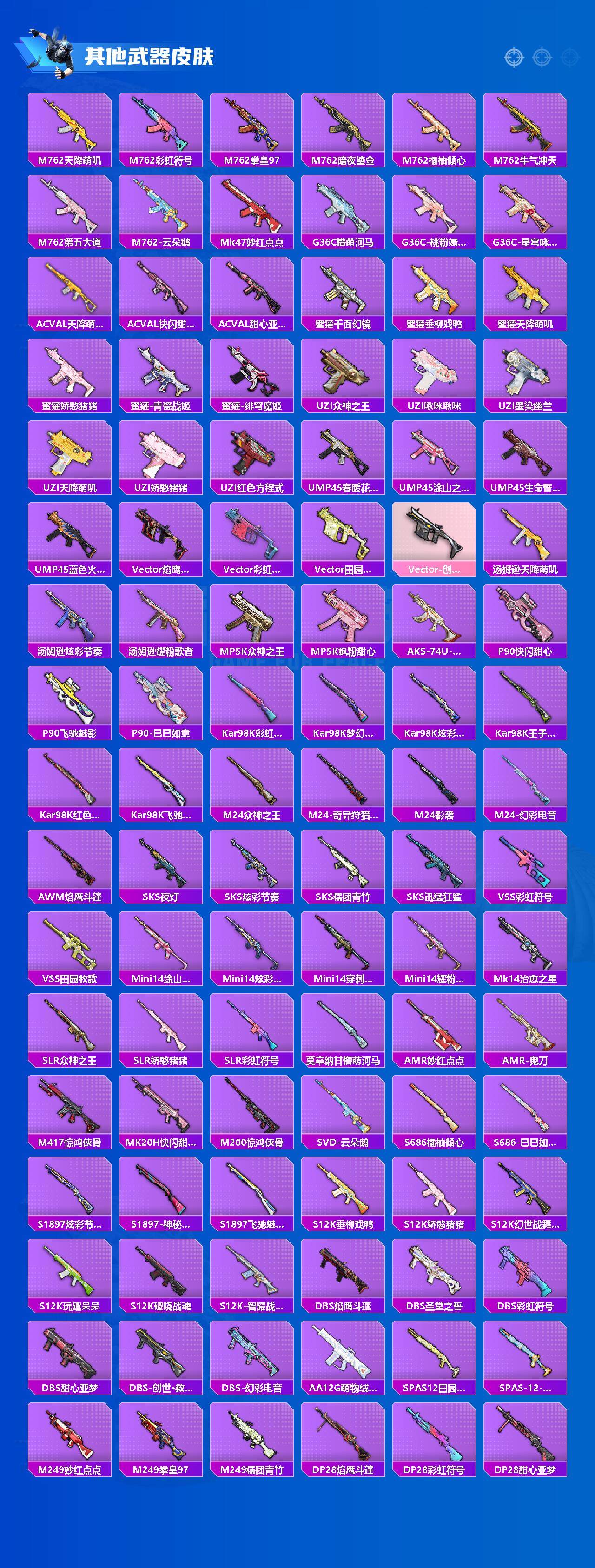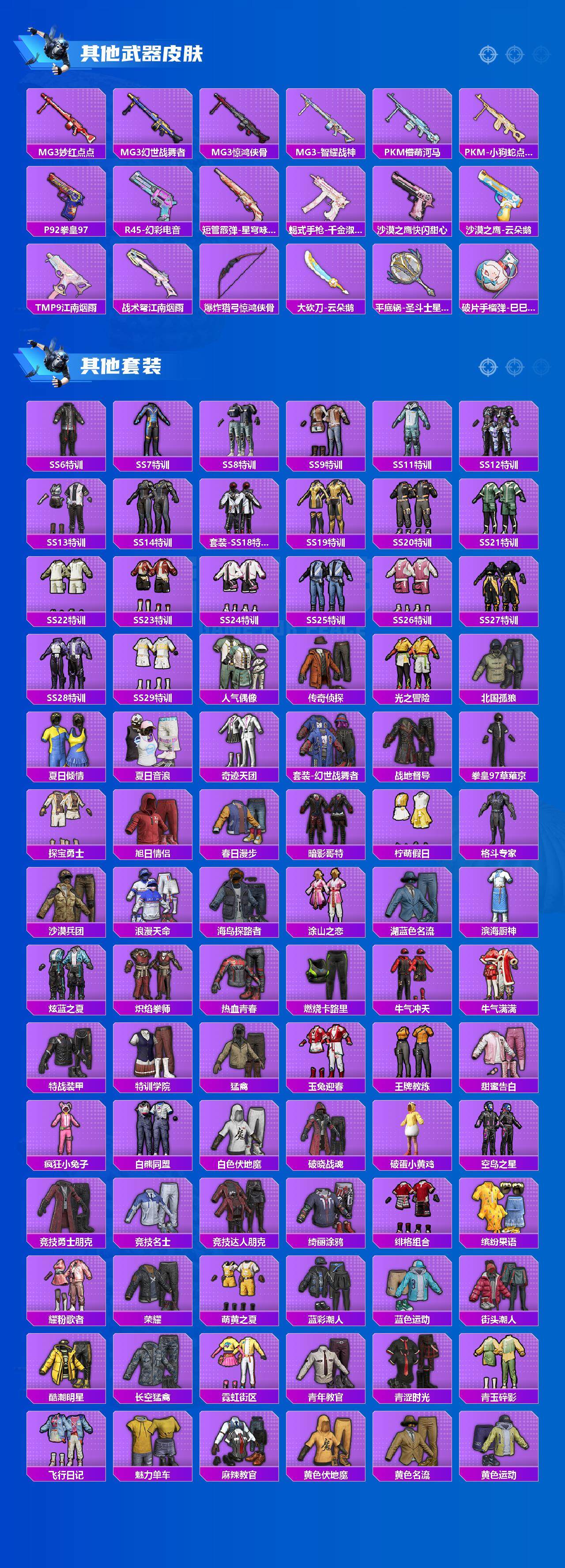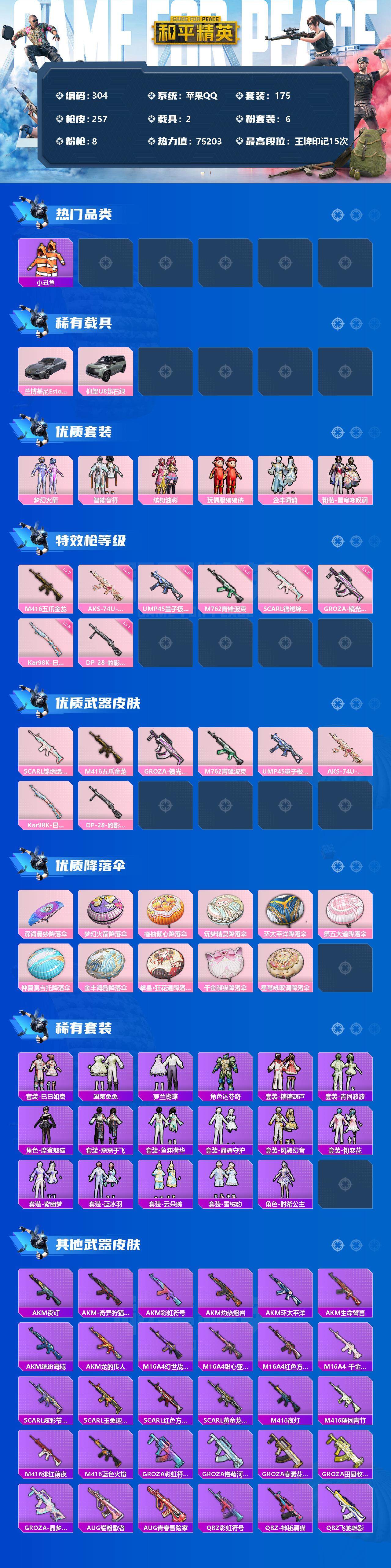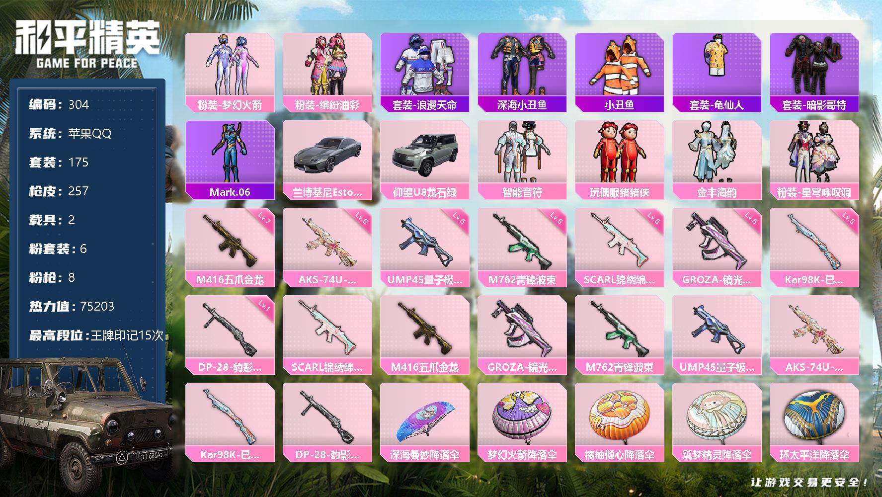 [12482641]【商品标题】:苹果 手q-6粉装-8特效呛-2载具-0粉色飞行器-75203热力值-15王牌印记-175套装-257呛皮 【热门品类】:粉装-梦幻火箭,粉装-缤纷油彩,套装-浪漫天命,套装-深海小丑鱼,套装-小丑鱼,套装-龟仙人,套装-暗影哥特,角色-mark.06 【粉色载具】:兰博基尼estoque(银翼灰),仰望u8(龙石绿) 【粉色套装】:粉装-梦幻火箭,粉装-智能音符,粉装-缤纷油彩,玩偶服-猪猪侠,粉装-金丰海韵,粉装-星穹咏叹调 【粉色呛皮等级】:scar-l-锦绣绵绵五级,m416-五爪金龙七级,groza-镜光银凌五级,m762-青锋波束五级,ump45-量子极限五级,aks-74u-星穹咏叹调六级,kar98k-巳巳如意五级,dp-28-豹影疾电一级 【粉色呛皮】:scar-l-锦绣绵绵,m416-五爪金龙,groza-镜光银凌,m762-青锋波束,ump45-量子极限,aks-74u-星穹咏叹调,kar98k-巳巳如意,dp-28-豹影疾电 【粉色降落伞】:深海曼妙降落伞,梦幻火箭降落伞,橘柚倾心降落伞,筑梦精灵降落伞,环太平洋降落伞,第五大道降落伞,仲夏莫吉托降落伞,金丰海韵降落伞,拳皇·狂花道降落伞,千金淑猫降落伞,星穹咏叹调降落伞 【稀有套装】:套装-龟仙人,套装-巳巳如意,套装-雏菊兔兔,套装-萝兰蝴蝶,角色-达芬奇,套装-糖糖葫芦,套装-青团波波,角色-摩登魅猫,套装-燕燕于飞,套装-鱼渊荷华,套装-晶辉守护,套装-风舞幻音,套装-粉恋花,套装-紫幽梦,套装-蓝冰羽,套装-云朵鹅,套装-雪绒豹,角色-时希公主 【稀有呛皮】:akm-夜灯,akm-奇异狩猎者,akm-彩虹符号,akm-灼热熔岩,akm-环太平洋,akm-生命誓言,akm-缤纷海域,akm-龙的传人,m16a4-幻世战舞者,m16a4-甜心亚梦,m16a4-红色方程式,m16a4-千金淑猫,scar-l-炫彩节奏,scar-l-玉兔迎春,scar-l-红色方程式,scar-l-黄金龙骨,m416-夜灯,m416-糯团青竹,m416-绯红前夜,m416-蓝色火焰,groza-彩虹符号,groza-懵萌河马,groza-春暖花开,groza-田园牧歌,groza-晶梦幻蝶,aug-耀粉歌者,aug-青春冒险家,q-彩虹符号,q-神秘黑