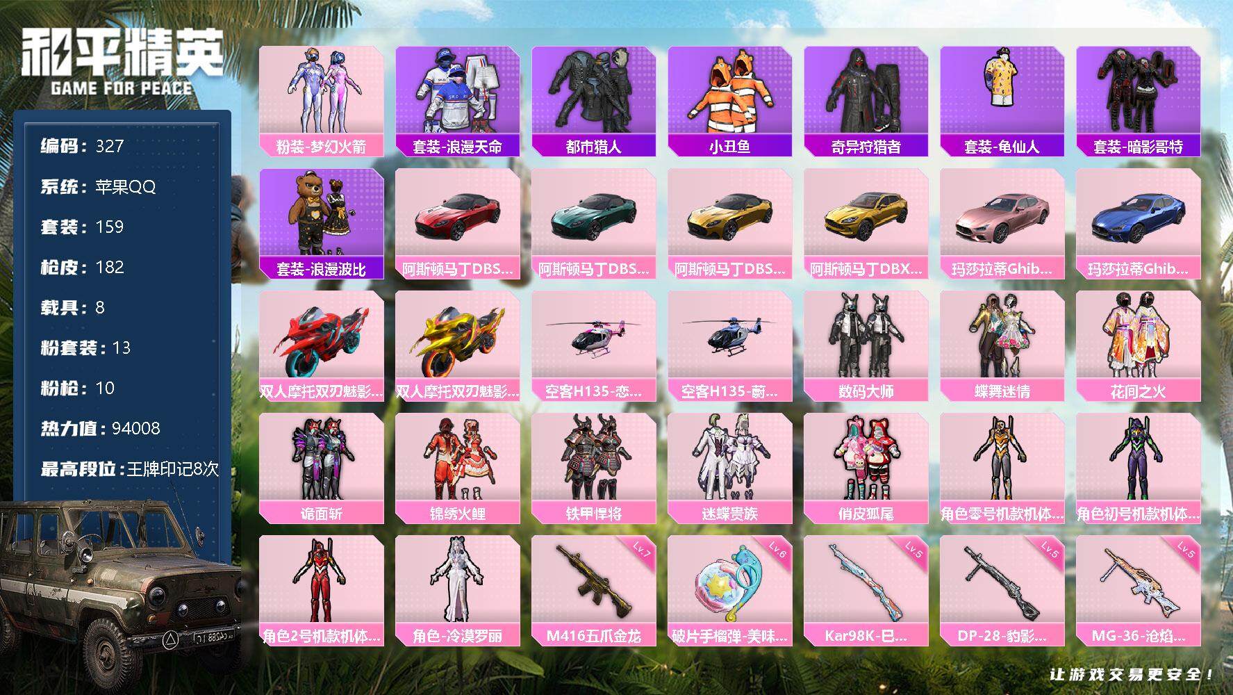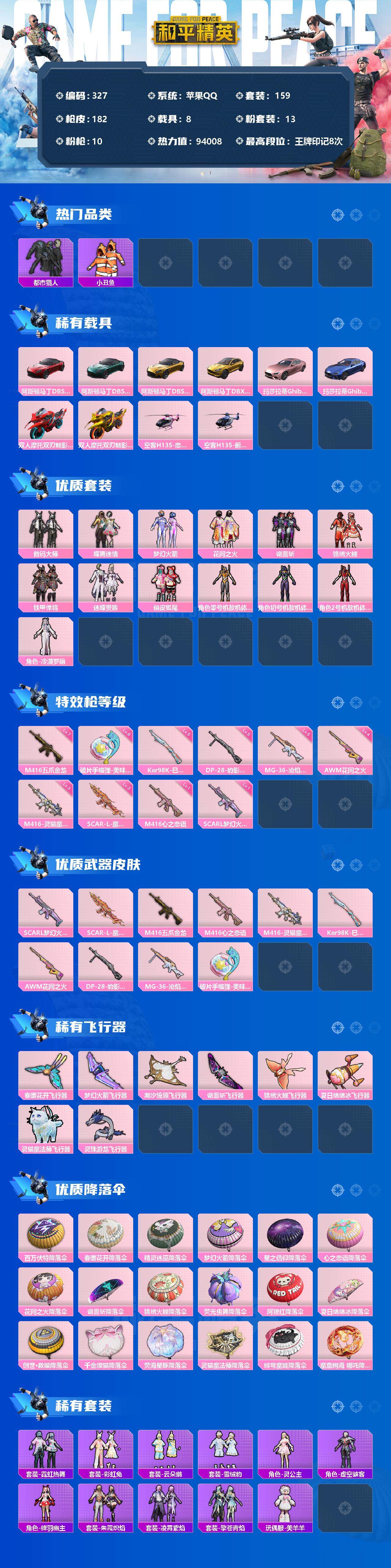 [12482718]【商品标题】:苹果 手q-13粉装-10特效呛-8载具-8粉色飞行器-94008热力值-8王牌印记-159套装-182呛皮 【热门品类】:粉装-梦幻火箭,套装-浪漫天命,套装-都市猎人,套装-小丑鱼,套装-奇异狩猎者,套装-龟仙人,套装-暗影哥特,套装-浪漫波比 【粉色载具】:阿斯顿马丁dbs(红),阿斯顿马丁dbs(绿),阿斯顿马丁dbs(金),阿斯顿马丁dbx(金),玛莎拉蒂ghibli(粉),玛莎拉蒂ghibli(蓝),双人摩托-双刃魅影(红),双人摩托-双刃魅影(金),空客h135-恋语之翼,空客h135-蔚蓝之翼 【粉色套装】:粉装-数码大师,粉装-蝶舞迷情,粉装-梦幻火箭,粉装-花间之火,粉装-诡面斩,粉装-锦绣火鲤,粉装-铁甲悍将,粉装-迷蝶贵族,粉装-俏皮狐尾,角色-零号机款机体服,角色-初号机款机体服,角色-2号机款机体服,角色-冷漠罗丽 【粉色呛皮等级】:scar-l-梦幻火箭一级,scar-l-魔童闹海 哪吒三级,m416-五爪金龙七级,m416-心之恋语一级,m416-灵猫魔法师三级,kar98k-巳巳如意五级,awm-花间之火四级,dp-28-豹影疾电五级,mg-36-沧焰双生五级,破片手留单-美味星星糖六级 【粉色呛皮】:scar-l-梦幻火箭,scar-l-魔童闹海 哪吒,m416-五爪金龙,m416-心之恋语,m416-灵猫魔法师,kar98k-巳巳如意,awm-花间之火,dp-28-豹影疾电,mg-36-沧焰双生,破片手留单-美味星星糖 【粉色飞行器】:春暖花开飞行器,梦幻火箭飞行器,潮汐统领飞行器,诡面斩飞行器,锦绣火鲤飞行器,夏日绵绵冰飞行器,灵猫魔法师飞行器,灵珠游龙飞行器 【粉色降落伞】:百万伏特降落伞,春暖花开降落伞,精灵迷巫降落伞,梦幻火箭降落伞,星之信仰降落伞,心之恋语降落伞,花间之火降落伞,诡面斩降落伞,锦绣火鲤降落伞,荧光虫舞降落伞,阿狸红降落伞,夏日绵绵冰降落伞,创世·救赎降落伞,千金淑猫降落伞,荧海星豚降落伞,灵猫魔法师降落伞,绯穹魔姬降落伞,魔童闹海 哪吒降落伞 【稀有套装】:套装-龟仙人,套装-霓虹热舞,套装-彩虹兔,套装-云朵鹅,套装-雪绒豹,角色-灵公主,角色-虚空骇客,角色-绛羽幽主,套装-朱霞炽焰,套装-凌霄紫焰,套装-擎苍青焰,玩偶服-美羊羊 【稀有呛皮】