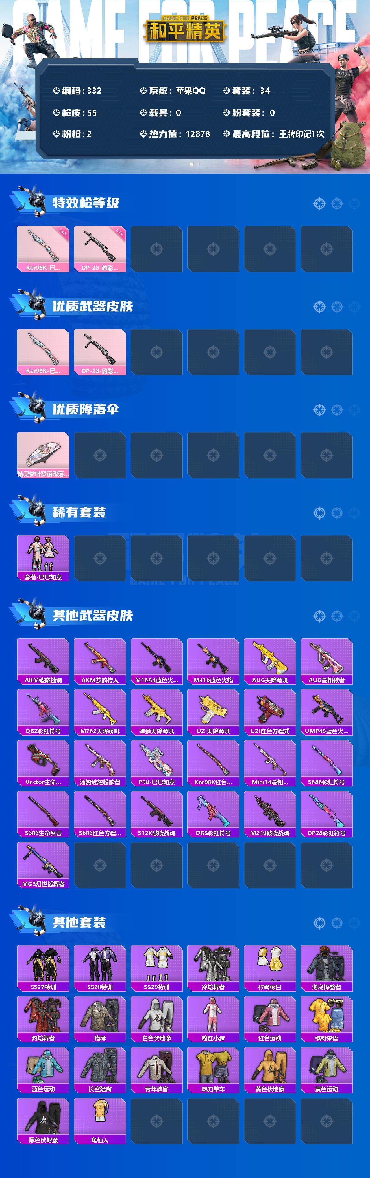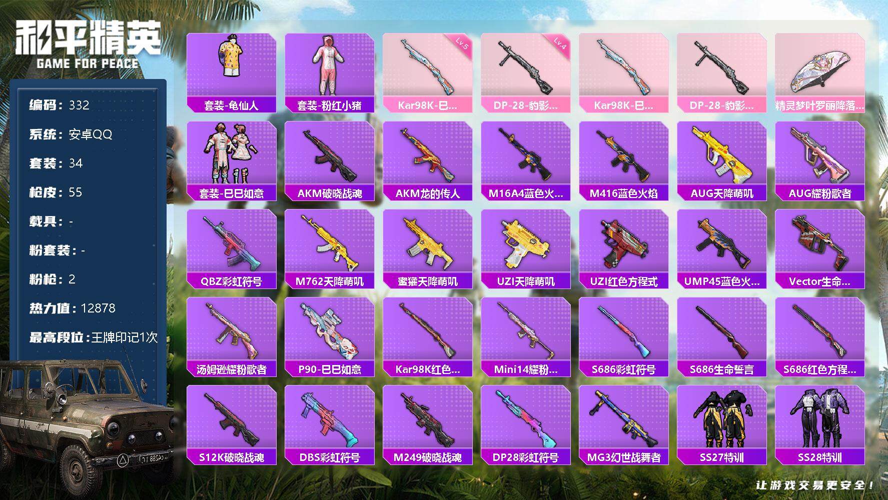 [12482730]【商品标题】:安卓 手q-0粉装-2特效呛-0载具-0粉色飞行器-12878热力值-1王牌印记-34套装-55呛皮 【热门品类】:套装-龟仙人,套装-粉红小猪 【粉色呛皮等级】:kar98k-巳巳如意五级,dp-28-豹影疾电四级 【粉色呛皮】:kar98k-巳巳如意,dp-28-豹影疾电 【粉色降落伞】:精灵梦叶罗丽降落伞 【稀有套装】:套装-龟仙人,套装-巳巳如意 【稀有呛皮】:akm-破晓战魂,akm-龙的传人,m16a4-蓝色火焰,m416-蓝色火焰,aug-天降萌叽,aug-耀粉歌者,q-彩虹符号,m762-天降萌叽,蜜獾-天降萌叽,uzi-天降萌叽,uzi-红色方程式,ump45-蓝色火焰,vect-生命誓言,汤姆逊-耀粉歌者,p90-巳巳如意,kar98k-红色方程式,mini14-耀粉歌者,s686-彩虹符号,s686-生命誓言,s686-红色方程式,s12k-破晓战魂,dbs-彩虹符号,m249-破晓战魂,dp-28-彩虹符号,mg3-幻世战舞者 【其他套装】:套装-ss27特训,套装-ss28特训,套装-ss29特训,套装-冷焰舞者,套装-柠萌假日,套装-海岛探路者,套装-灼焰舞者,套装-猎鹰,套装-白色伏地魔,套装-粉红小猪,套装-红色运动,套装-缤纷果语,套装-蓝色运动,套装-长空猛禽,套装-青年教官,套装-魅力单车,套装-黄色伏地魔,套装-黄色运动,套装-黑色伏地魔,套装-龟仙人 【营地id】:965701870