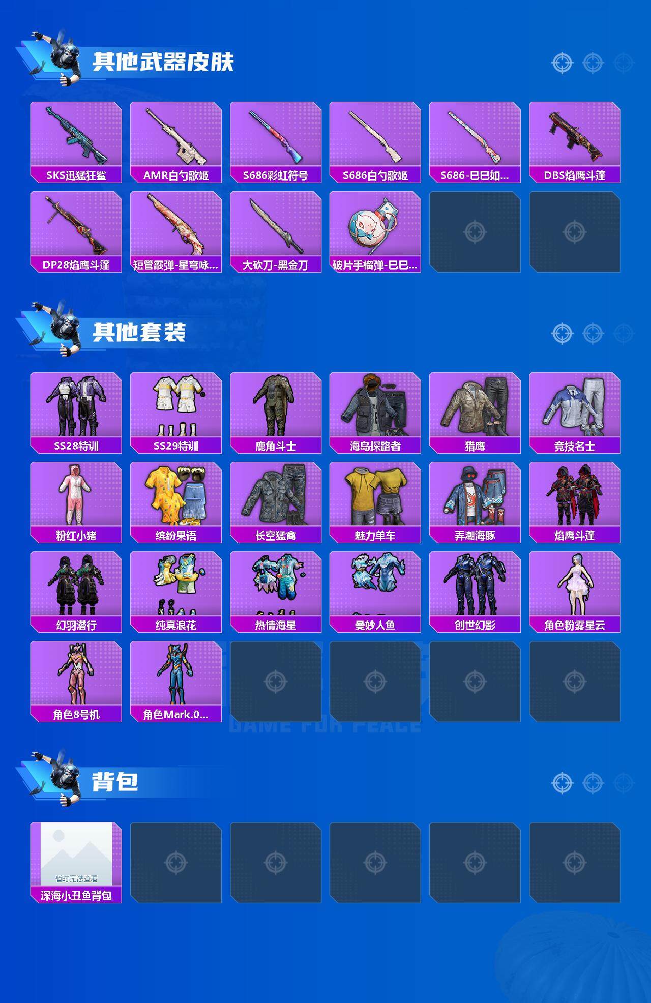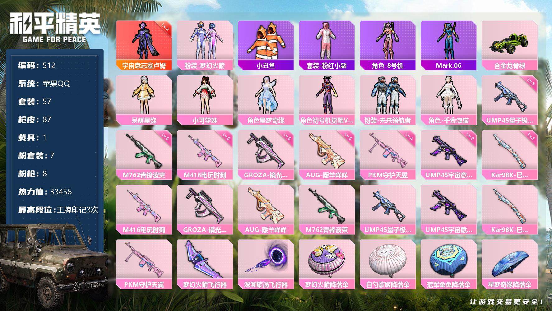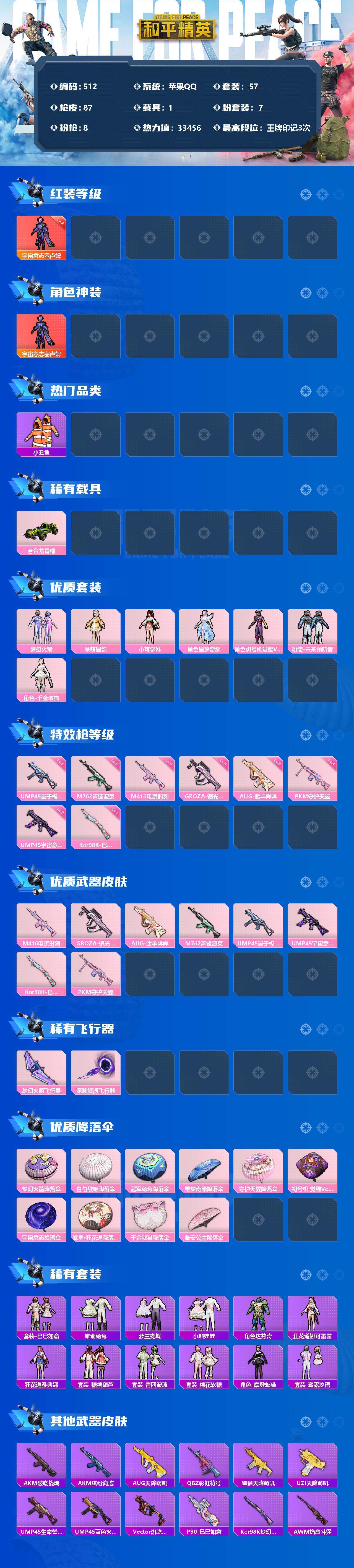 [12483453]【商品标题】:苹果 手q-1神装-7粉装-8特效呛-1载具-2粉色飞行器-33456热力值-3王牌印记-57套装-87呛皮 【红色神装等级】:宇宙意志-塞卢姆二级 【红色角色神装】:宇宙意志-塞卢姆 【热门品类】:粉装-梦幻火箭,套装-小丑鱼,套装-粉红小猪,角色-8号机,角色-mark.06 【粉色载具】:合金龙骨(绿) 【粉色套装】:粉装-梦幻火箭,角色-呆萌星弥,角色-小可学妹,角色-星梦奇缘,角色-初号机 觉醒ver.,粉装-未来领航者,角色-千金淑猫 【粉色呛皮等级】:m416-电玩时刻五级,groza-镜光银凌五级,aug-暖羊咩咩五级,m762-青锋波束五级,ump45-量子极限五级,ump45-宇宙意志二级,kar98k-巳巳如意一级,pkm-守护天翼四级 【粉色呛皮】:m416-电玩时刻,groza-镜光银凌,aug-暖羊咩咩,m762-青锋波束,ump45-量子极限,ump45-宇宙意志,kar98k-巳巳如意,pkm-守护天翼 【粉色飞行器】:梦幻火箭飞行器,深渊漩涡飞行器 【粉色降落伞】:梦幻火箭降落伞,白勺歌姬降落伞,冠军兔兔降落伞,星梦奇缘降落伞,守护天翼降落伞,初号机 觉醒ver.降落伞,宇宙意志降落伞,拳皇·狂花道降落伞,千金淑猫降落伞,临安公主降落伞 【稀有套装】:套装-巳巳如意,套装-雏菊兔兔,套装-萝兰蝴蝶,套装-小熊娃娃,角色-达芬奇,角色-狂花道·娜可露露,角色-狂花道·雅典娜,套装-糖糖葫芦,套装-青团波波,套装-棉花软糖,角色-摩登魅猫,套装-蜜露汐语 【稀有呛皮】:akm-破晓战魂,akm-缤纷海域,aug-天降萌叽,q-彩虹符号,蜜獾-天降萌叽,uzi-天降萌叽,ump45-生命誓言,ump45-蓝色火焰,vect-焰鹰斗篷,p90-巳巳如意,kar98k-梦幻火箭,awm-焰鹰斗篷,sks-迅猛狂鲨,amr-白勺歌姬,s686-彩虹符号,s686-白勺歌姬,s686-巳巳如意,dbs-焰鹰斗篷,dp-28-焰鹰斗篷,短管霰弹-星穹咏叹调,大砍刀-黑金刀,破片手留单-巳巳如意 【其他套装】:套装-ss28特训,套装-ss29特训,套装-鹿角斗士,套装-海岛探路者,套装-猎鹰,套装-竞技名士,套装-粉红小猪,套装-缤纷果语,套装-长空猛禽,套装-魅力单车,套装-弄潮海豚,套