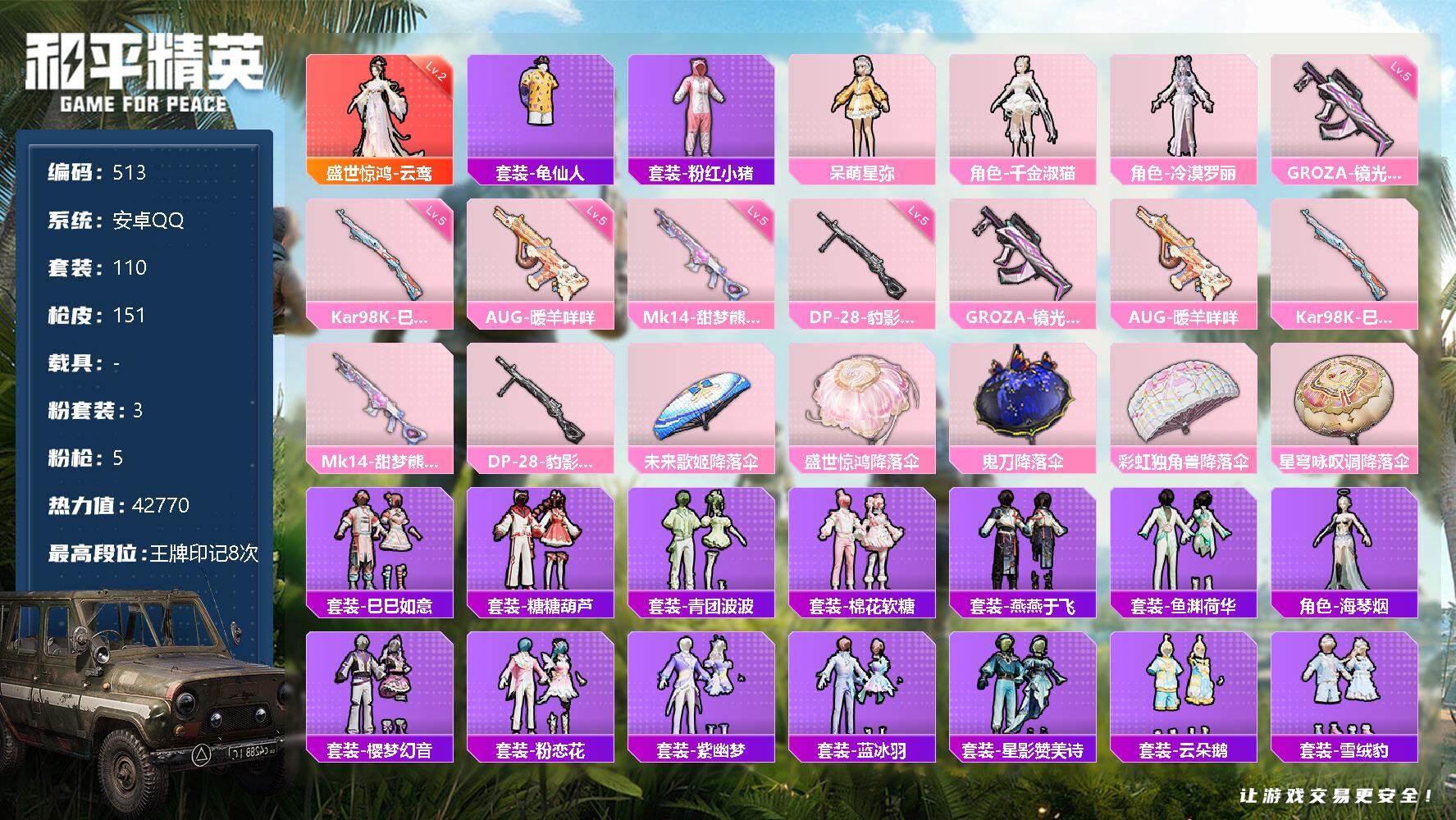 [12483458]【商品标题】:安卓 手q-1神装-3粉装-5特效呛-0载具-0粉色飞行器-42770热力值-8王牌印记-110套装-151呛皮 【红色神装等级】:盛世惊鸿-云鸾二级 【红色角色神装】:盛世惊鸿-云鸾 【热门品类】:套装-龟仙人,套装-粉红小猪 【粉色套装】:角色-呆萌星弥,角色-千金淑猫,角色-冷漠罗丽 【粉色呛皮等级】:groza-镜光银凌五级,aug-暖羊咩咩五级,kar98k-巳巳如意五级,mk14-甜梦熊击五级,dp-28-豹影疾电五级 【粉色呛皮】:groza-镜光银凌,aug-暖羊咩咩,kar98k-巳巳如意,mk14-甜梦熊击,dp-28-豹影疾电 【粉色降落伞】:未来歌姬降落伞,盛世惊鸿降落伞,鬼刀降落伞,彩虹独角兽降落伞,星穹咏叹调降落伞 【稀有套装】:套装-龟仙人,套装-巳巳如意,套装-糖糖葫芦,套装-青团波波,套装-棉花软糖,套装-燕燕于飞,套装-鱼渊荷华,角色-海琴烟,套装-樱梦幻音,套装-粉恋花,套装-紫幽梦,套装-蓝冰羽,套装-星影赞美诗,套装-云朵鹅,套装-雪绒豹 【稀有呛皮】:akm-夜灯,akm-彩虹符号,akm-江南烟雨,akm-生命誓言,akm-破晓战魂,akm-萌趣颜团子,akm-虎虎生威,akm-霓虹街区,m16a4-幻世战舞者,scar-l-暗夜玫瑰,scar-l-炫彩节奏,scar-l-红色方程式,scar-l-小狗蛇点点,m416-夜灯,m416-糯团青竹,m416-绯红前夜,m416-蓝色火焰,groza-彩虹符号,groza-田园牧歌,aug-天降萌叽,aug-耀粉歌者,q-彩虹符号,m762-天降萌叽,m762-暗夜鎏金,m762-瑞龙福将,m762-云朵鹅,蜜獾-天降萌叽,uzi-天降萌叽,uzi-幽秘魅影,uzi-炫彩节奏,uzi-红色方程式,ump45-涂山之恋,ump45-生命誓言,ump45-蓝色火焰,vect-夜灯,vect-生命誓言,vect-田园牧歌,汤姆逊-天降萌叽,汤姆逊-炫彩节奏,汤姆逊-耀粉歌者,mp5k-蓝莓炮弹,aks-74u-鬼刀,p90-巳巳如意,kar98k-彩虹符号,kar98k-星穹咏叹调,m24-樱桃泡泡,sks-夜灯,sks-炫彩节奏,vss-彩虹符号,vss-田园牧歌,mini14-涂山之恋,mini14-炫彩节奏,win94-