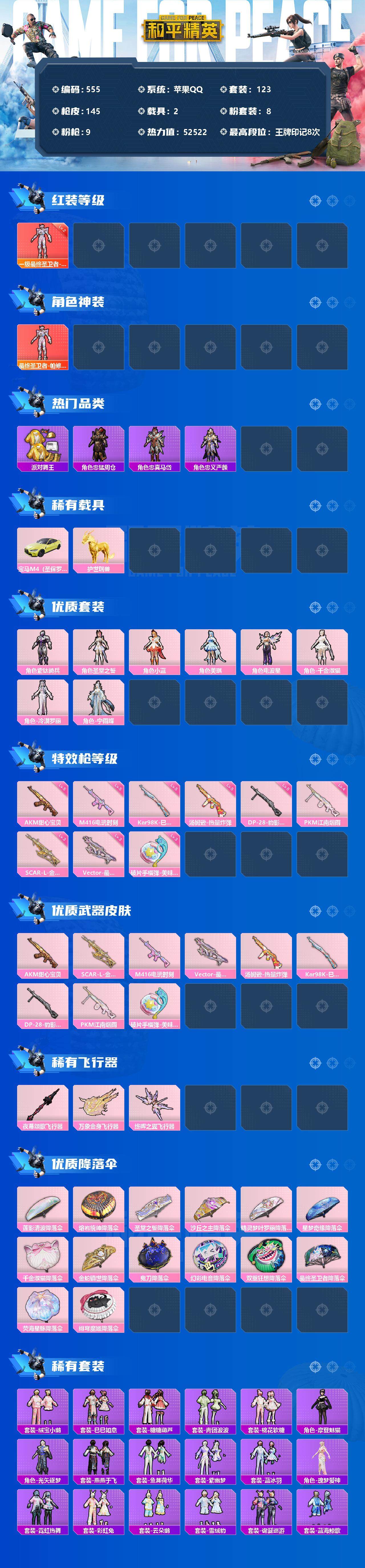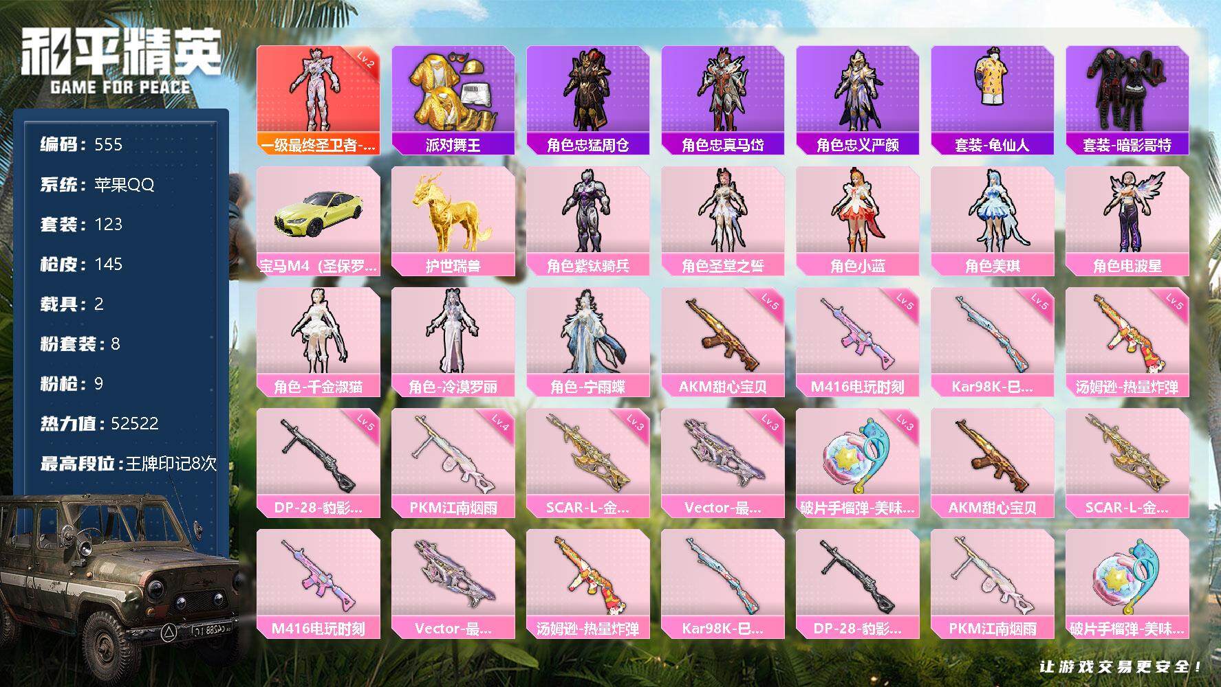 [12483677]【商品标题】:苹果 手q-1神装-8粉装-9特效呛-2载具-4粉色飞行器-52522热力值-8王牌印记-123套装-145呛皮 【红色神装等级】:最终圣卫者-帕修斯二级 【红色角色神装】:最终圣卫者-帕修斯 【热门品类】:套装-派对舞王,角色-忠猛周仓,角色-忠真马岱,角色-忠义严颜,套装-龟仙人,套装-暗影哥特 【粉色载具】:宝马m4(圣保罗黄),护世瑞兽 【粉色套装】:角色-紫钛骑兵,角色-圣堂之誓,角色-小蓝,角色-美琪,角色-电波星,角色-千金淑猫,角色-冷漠罗丽,角色-宁雨蝶 【粉色呛皮等级】:akm-甜心宝贝五级,scar-l-金蛇镇世三级,m416-电玩时刻五级,vect-最终圣卫者三级,汤姆逊-热量炸弹五级,kar98k-巳巳如意五级,dp-28-豹影疾电五级,pkm-江南烟雨四级,破片手留单-美味星星糖三级 【粉色呛皮】:akm-甜心宝贝,scar-l-金蛇镇世,m416-电玩时刻,vect-最终圣卫者,汤姆逊-热量炸弹,kar98k-巳巳如意,dp-28-豹影疾电,pkm-江南烟雨,破片手留单-美味星星糖 【粉色飞行器】:夜幕颂歌飞行器,万象金身飞行器,终晖之翼飞行器 【粉色降落伞】:莲影清波降落伞,熔岩统帅降落伞,圣堂之誓降落伞,沙丘之主降落伞,精灵梦叶罗丽降落伞,星梦奇缘降落伞,千金淑猫降落伞,金蛇镇世降落伞,鬼刀降落伞,幻彩电音降落伞,双重狂想降落伞,最终圣卫者降落伞,荧海星豚降落伞,绯穹魔姬降落伞 【稀有套装】:套装-龟仙人,套装-绒宝小鹅,套装-巳巳如意,套装-糖糖葫芦,套装-青团波波,套装-棉花软糖,角色-摩登魅猫,角色-光矢逐梦,套装-燕燕于飞,套装-鱼渊荷华,套装-紫幽梦,套装-蓝冰羽,角色-瑰梦爱神,套装-霓虹热舞,套装-彩虹兔,套装-云朵鹅,套装-雪绒豹,套装-诡诞巡游,套装-蓝海鲸歌 【稀有呛皮】:akm-江南烟雨,akm-霓虹街区,akm-龙的传人,m16a4-最终圣卫者,scar-l-夜灯,scar-l-粉锦千层,scar-l-绯月迷踪,m416-糯团青竹,m416-蓝色火焰,aug-甜蜜菠萝,aug-耀粉歌者,aug-金蛇镇世,aug-月影灵韵,m762-云朵鹅,g36c-星穹咏叹调,ac-val-快闪甜心,蜜獾-天降萌叽,uzi-啾咪啾咪,uzi-天降萌叽,ump45