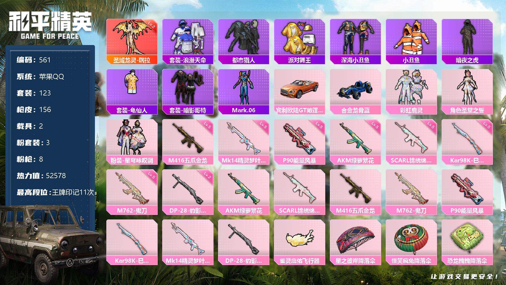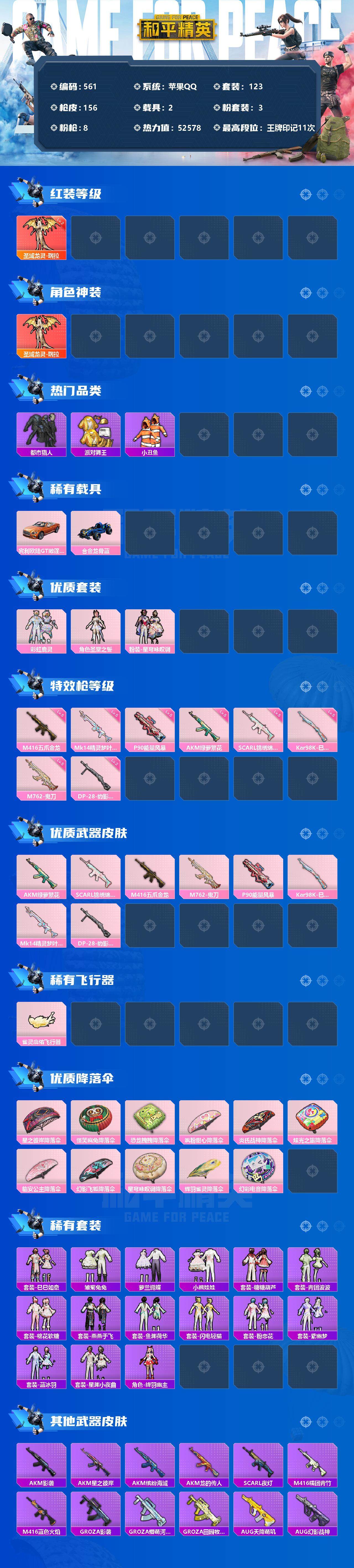 [12483707]【商品标题】:苹果 手q-1神装-3粉装-8特效呛-2载具-2粉色飞行器-52578热力值-11王牌印记-123套装-156呛皮 【红色神装等级】:圣域龙灵-瑞拉二级 【红色角色神装】:圣域龙灵-瑞拉 【热门品类】:套装-浪漫天命,套装-都市猎人,套装-派对舞王,套装-深海小丑鱼,套装-小丑鱼,套装-暗夜之虎,套装-龟仙人,套装-暗影哥特,角色-mark.06 【粉色载具】:宾利欧陆gt敞篷(火焰橘),合金龙骨(蓝) 【粉色套装】:粉装-彩虹鹿灵,角色-圣堂之誓,粉装-星穹咏叹调 【粉色呛皮等级】:akm-绿萝繁花五级,scar-l-锦绣绵绵五级,m416-五爪金龙五级,m762-鬼刀五级,p90-能量风暴五级,kar98k-巳巳如意五级,mk14-精灵梦叶罗丽五级,dp-28-豹影疾电二级 【粉色呛皮】:akm-绿萝繁花,scar-l-锦绣绵绵,m416-五爪金龙,m762-鬼刀,p90-能量风暴,kar98k-巳巳如意,mk14-精灵梦叶罗丽,dp-28-豹影疾电 【粉色飞行器】:雀灵庇佑飞行器 【粉色降落伞】:星之彼岸降落伞,怪笑疯兔降落伞,恐龙拽拽降落伞,飒粉甜心降落伞,炎氏战神降落伞,炫光之旅降落伞,临安公主降落伞,幻影飞狐降落伞,星穹咏叹调降落伞,辉羽雀灵降落伞,幻彩电音降落伞 【稀有套装】:套装-龟仙人,套装-巳巳如意,套装-雏菊兔兔,套装-萝兰蝴蝶,套装-小熊娃娃,套装-糖糖葫芦,套装-青团波波,套装-棉花软糖,套装-燕燕于飞,套装-鱼渊荷华,套装-闪电轻猫,套装-粉恋花,套装-紫幽梦,套装-蓝冰羽,套装-星渊小夜曲,角色-绛羽幽主 【稀有呛皮】:akm-影袭,akm-星之彼岸,akm-缤纷海域,akm-龙的传人,scar-l-夜灯,m416-糯团青竹,m416-蓝色火焰,groza-影袭,groza-懵萌河马,groza-田园牧歌,aug-天降萌叽,aug-幻影战神,aug-甜蜜菠萝,aug-耀粉歌者,m762-天降萌叽,mk47-妙红点点,g36c-懵萌河马,g36c-星穹咏叹调,ac-val-快闪甜心,蜜獾-千面幻镜,蜜獾-天降萌叽,uzi-啾咪啾咪,uzi-天降萌叽,uzi-影袭,uzi-红色方程式,ump45-涂山之恋,ump45-炫光之旅,vect-焰鹰斗篷,vect-田园牧歌,vect-