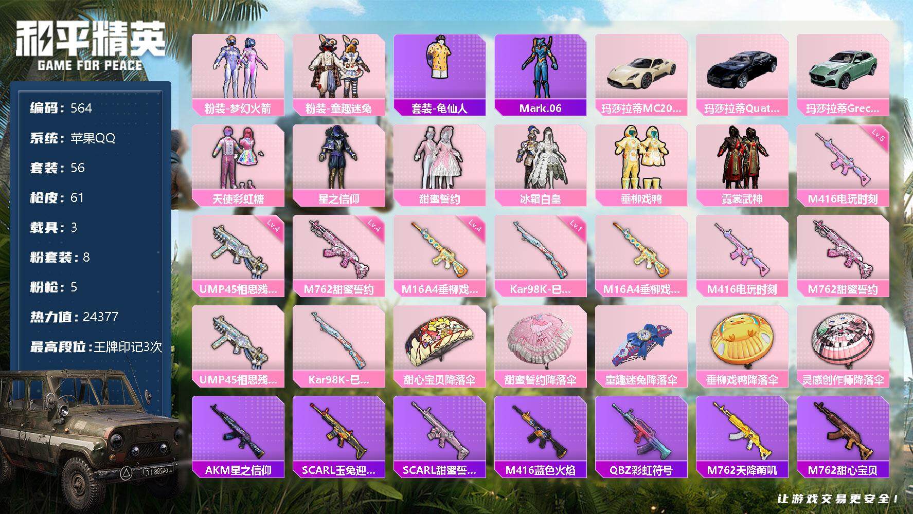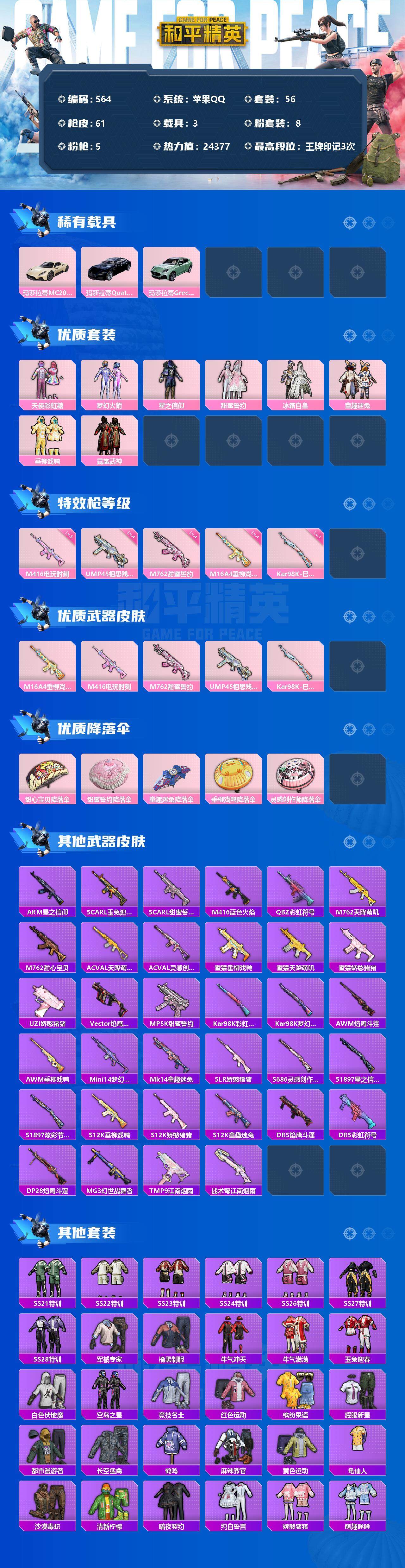 [12483728]【商品标题】:苹果 手q-8粉装-5特效呛-3载具-0粉色飞行器-24377热力值-3王牌印记-56套装-61呛皮 【热门品类】:粉装-梦幻火箭,粉装-童趣迷兔,套装-龟仙人,角色-mark.06 【粉色载具】:玛莎拉蒂mc20(星石白),玛莎拉蒂quattropte(夜幕蓝),玛莎拉蒂grecale(薄荷绿) 【粉色套装】:粉装-天使彩虹糖,粉装-梦幻火箭,粉装-星之信仰,粉装-甜蜜誓约,粉装-冰霜白皇,粉装-童趣迷兔,粉装-垂柳戏鸭,粉装-霓裳武神 【粉色呛皮等级】:m16a4-垂柳戏鸭四级,m416-电玩时刻五级,m762-甜蜜誓约四级,ump45-相思残雪四级,kar98k-巳巳如意一级 【粉色呛皮】:m16a4-垂柳戏鸭,m416-电玩时刻,m762-甜蜜誓约,ump45-相思残雪,kar98k-巳巳如意 【粉色降落伞】:甜心宝贝降落伞,甜蜜誓约降落伞,童趣迷兔降落伞,垂柳戏鸭降落伞,灵感创作师降落伞 【稀有套装】:套装-龟仙人 【稀有呛皮】:akm-星之信仰,scar-l-玉兔迎春,scar-l-甜蜜誓约,m416-蓝色火焰,q-彩虹符号,m762-天降萌叽,m762-甜心宝贝,ac-val-天降萌叽,ac-val-灵感创作师,蜜獾-垂柳戏鸭,蜜獾-天降萌叽,蜜獾-娇憨猪猪,uzi-娇憨猪猪,vect-焰鹰斗篷,mp5k-甜蜜誓约,kar98k-彩虹符号,kar98k-梦幻火箭,awm-焰鹰斗篷,awm-垂柳戏鸭,mini14-梦幻火箭,mk14-童趣迷兔,slr-娇憨猪猪,s686-灵感创作师,s1897-星之信仰,s1897-炫彩节奏,s12k-童趣迷兔,s12k-垂柳戏鸭,s12k-娇憨猪猪,dbs-焰鹰斗篷,dbs-彩虹符号,dp-28-焰鹰斗篷,mg3-幻世战舞者,tmp-9-江南烟雨,战术弩-江南烟雨 【其他套装】:套装-ss21特训,套装-ss22特训,套装-ss23特训,套装-ss24特训,套装-ss26特训,套装-ss27特训,套装-ss28特训,套装-军械专家,套装-橘黑制服,套装-牛气冲天,套装-牛气满满,套装-玉兔迎春,套装-白色伏地魔,套装-空岛之星,套装-竞技名士,套装-红色运动,套装-缤纷果语,套装-耀眼新星,套装-都市漫游者,套装-长空猛禽,套装-鹤鸣,套装-麻辣教官,套装-黄色运动,套装