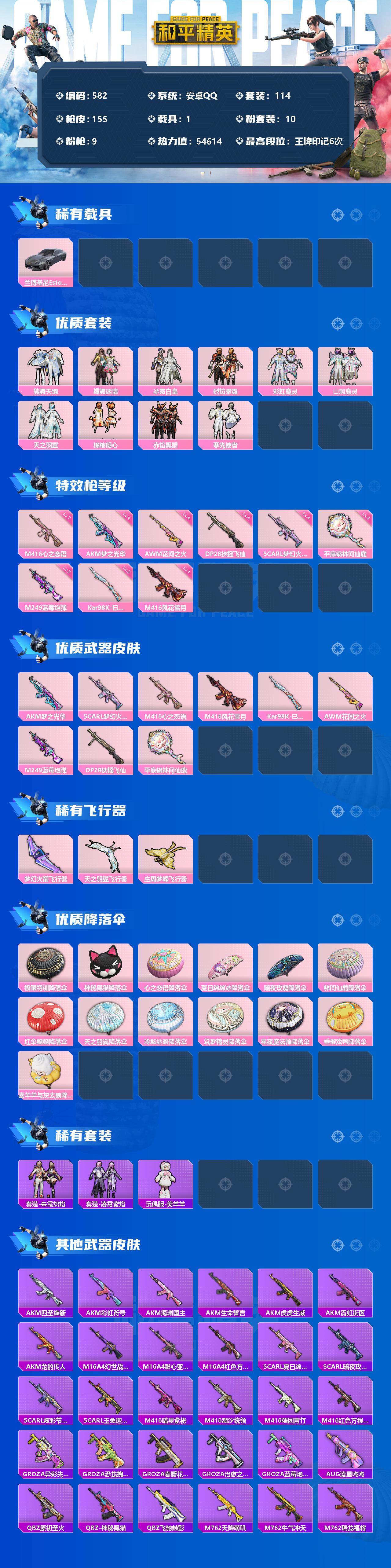 [12483801]【商品标题】:安卓 手q-10粉装-9特效呛-1载具-3粉色飞行器-54614热力值-6王牌印记-114套装-155呛皮 【热门品类】:套装-浪漫天命,套装-暗影哥特,套装-浪漫波比 【粉色载具】:兰博基尼estoque(银翼灰) 【粉色套装】:粉装-独舞天鹅,粉装-蝶舞迷情,粉装-冰霜白皇,粉装-烈焰拳霸,粉装-彩虹鹿灵,粉装-山涧鹿灵,粉装-天之羽翼,粉装-橘柚倾心,粉装-赤焰黑爵,粉装-寒光使者 【粉色呛皮等级】:akm-梦之光华四级,scar-l-梦幻火箭四级,m416-心之恋语七级,m416-风花雪月一级,kar98k-巳巳如意二级,awm-花间之火四级,m249-蓝莓炮弹二级,dp-28-扶摇飞仙四级,平底锅-林间仙鹿三级 【粉色呛皮】:akm-梦之光华,scar-l-梦幻火箭,m416-心之恋语,m416-风花雪月,kar98k-巳巳如意,awm-花间之火,m249-蓝莓炮弹,dp-28-扶摇飞仙,平底锅-林间仙鹿 【粉色飞行器】:梦幻火箭飞行器,天之羽翼飞行器,庄周梦蝶飞行器 【粉色降落伞】:极限特训降落伞,神秘黑猫降落伞,心之恋语降落伞,夏日绵绵冰降落伞,暗夜玫瑰降落伞,林间仙鹿降落伞,红伞翩翩降落伞,天之羽翼降落伞,冷魅冰骑降落伞,筑梦精灵降落伞,星夜魔法师降落伞,垂柳戏鸭降落伞,喜羊羊与灰太狼降落伞 【稀有套装】:套装-朱霞炽焰,套装-凌霄紫焰,玩偶服-美羊羊 【稀有呛皮】:akm-四圣焕新,akm-彩虹符号,akm-海渊国主,akm-生命誓言,akm-虎虎生威,akm-霓虹街区,akm-龙的传人,m16a4-幻世战舞者,m16a4-甜心亚梦,m16a4-红色方程式,scar-l-夏日绵绵冰,scar-l-暗夜玫瑰,scar-l-炫彩节奏,scar-l-玉兔迎春,m416-暗星紫秘,m416-潮汐统领,m416-糯团青竹,m416-红色方程式,groza-异彩先驱,groza-恐龙拽拽,groza-春暖花开,groza-治愈之星,groza-蓝莓炮弹,aug-流星咚咚,q-原初圣火,q-神秘黑猫,q-飞驰魅影,m762-天降萌叽,m762-牛气冲天,m762-瑞龙福将,m762-诡娃娃,mk47-天之羽翼,mk47-林间仙鹿,mk47-洛神天依,g36c-时空追击者,g36c-暗夜玫瑰,ac-v