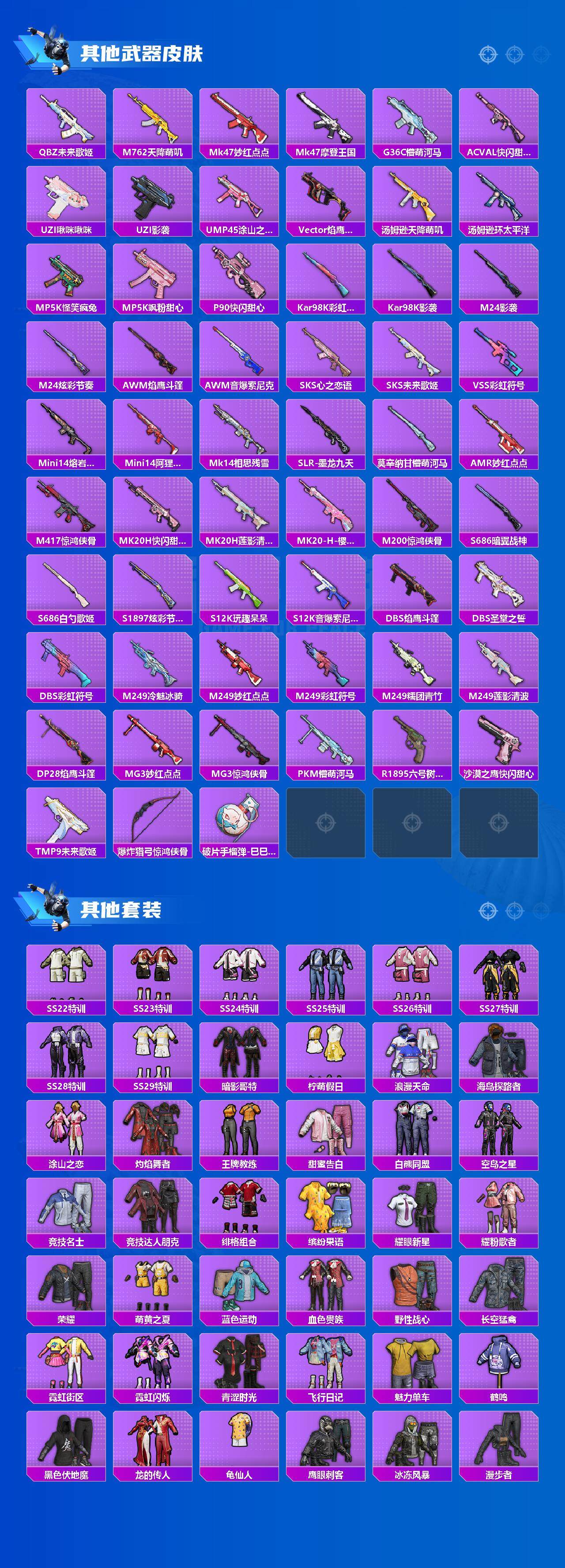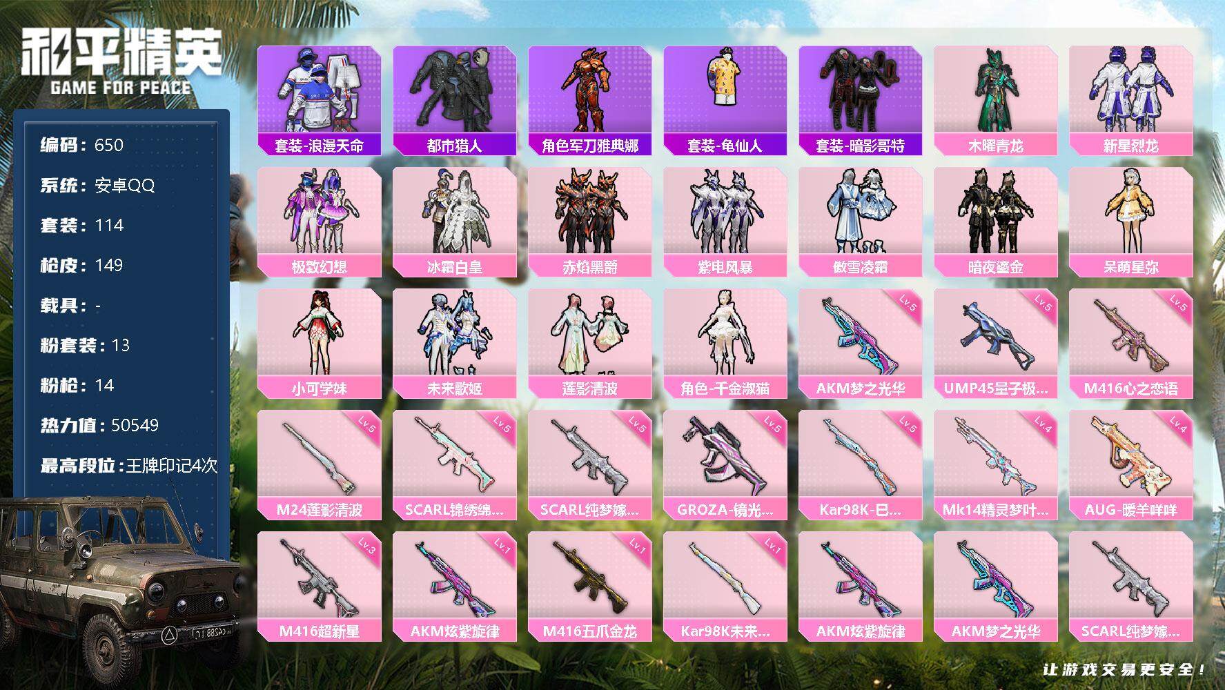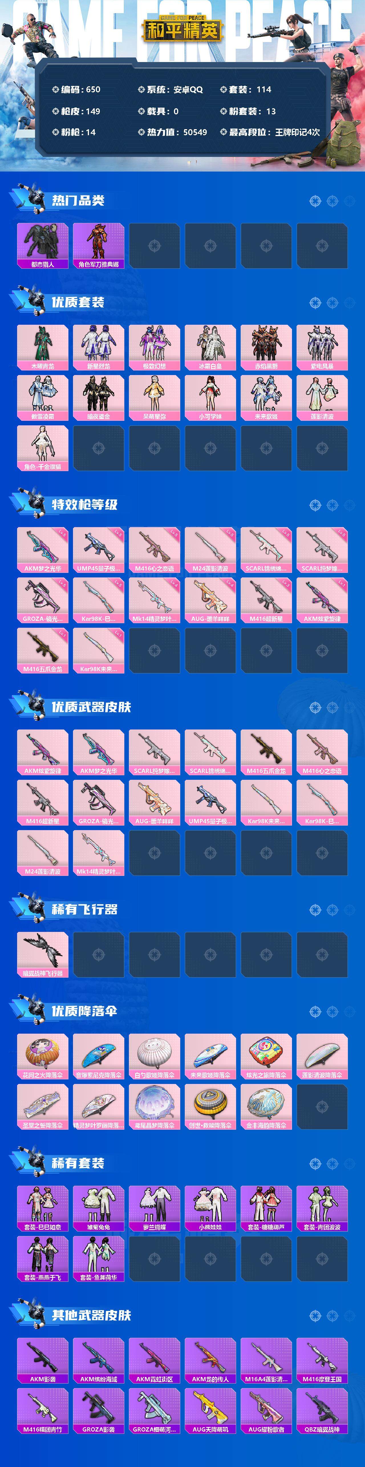 [12484059]【商品标题】:安卓 手q-13粉装-14特效呛-0载具-1粉色飞行器-50549热力值-4王牌印记-114套装-149呛皮 【热门品类】:套装-浪漫天命,套装-都市猎人,角色-军刀雅典娜,套装-龟仙人,套装-暗影哥特 【粉色套装】:粉装-木曜青龙,粉装-新星烈龙,粉装-极致幻想,粉装-冰霜白皇,粉装-赤焰黑爵,粉装-紫电风暴,粉装-傲雪凌霜,粉装-暗夜鎏金,角色-呆萌星弥,角色-小可学妹,粉装-未来歌姬,粉装-莲影清波,角色-千金淑猫 【粉色呛皮等级】:akm-炫紫旋律一级,akm-梦之光华五级,scar-l-纯梦嫁纱五级,scar-l-锦绣绵绵五级,m416-五爪金龙一级,m416-心之恋语五级,m416-超新星三级,groza-镜光银凌五级,aug-暖羊咩咩四级,ump45-量子极限五级,kar98k-未来歌姬一级,kar98k-巳巳如意五级,m24-莲影清波五级,mk14-精灵梦叶罗丽四级 【粉色呛皮】:akm-炫紫旋律,akm-梦之光华,scar-l-纯梦嫁纱,scar-l-锦绣绵绵,m416-五爪金龙,m416-心之恋语,m416-超新星,groza-镜光银凌,aug-暖羊咩咩,ump45-量子极限,kar98k-未来歌姬,kar98k-巳巳如意,m24-莲影清波,mk14-精灵梦叶罗丽 【粉色飞行器】:暗翼战神飞行器 【粉色降落伞】:花间之火降落伞,音爆索尼克降落伞,白勺歌姬降落伞,未来歌姬降落伞,炫光之旅降落伞,莲影清波降落伞,圣堂之誓降落伞,精灵梦叶罗丽降落伞,鸢尾晶梦降落伞,创世·救赎降落伞,金丰海韵降落伞 【稀有套装】:套装-龟仙人,套装-巳巳如意,套装-雏菊兔兔,套装-萝兰蝴蝶,套装-小熊娃娃,套装-糖糖葫芦,套装-青团波波,套装-燕燕于飞,套装-鱼渊荷华 【稀有呛皮】:akm-影袭,akm-缤纷海域,akm-霓虹街区,akm-龙的传人,m16a4-莲影清波,m416-摩登王国,m416-糯团青竹,groza-影袭,groza-懵萌河马,aug-天降萌叽,aug-耀粉歌者,q-暗翼战神,q-未来歌姬,m762-天降萌叽,mk47-妙红点点,mk47-摩登王国,g36c-懵萌河马,ac-val-快闪甜心,uzi-啾咪啾咪,uzi-影袭,ump45-涂山之恋,vect-焰鹰斗篷,