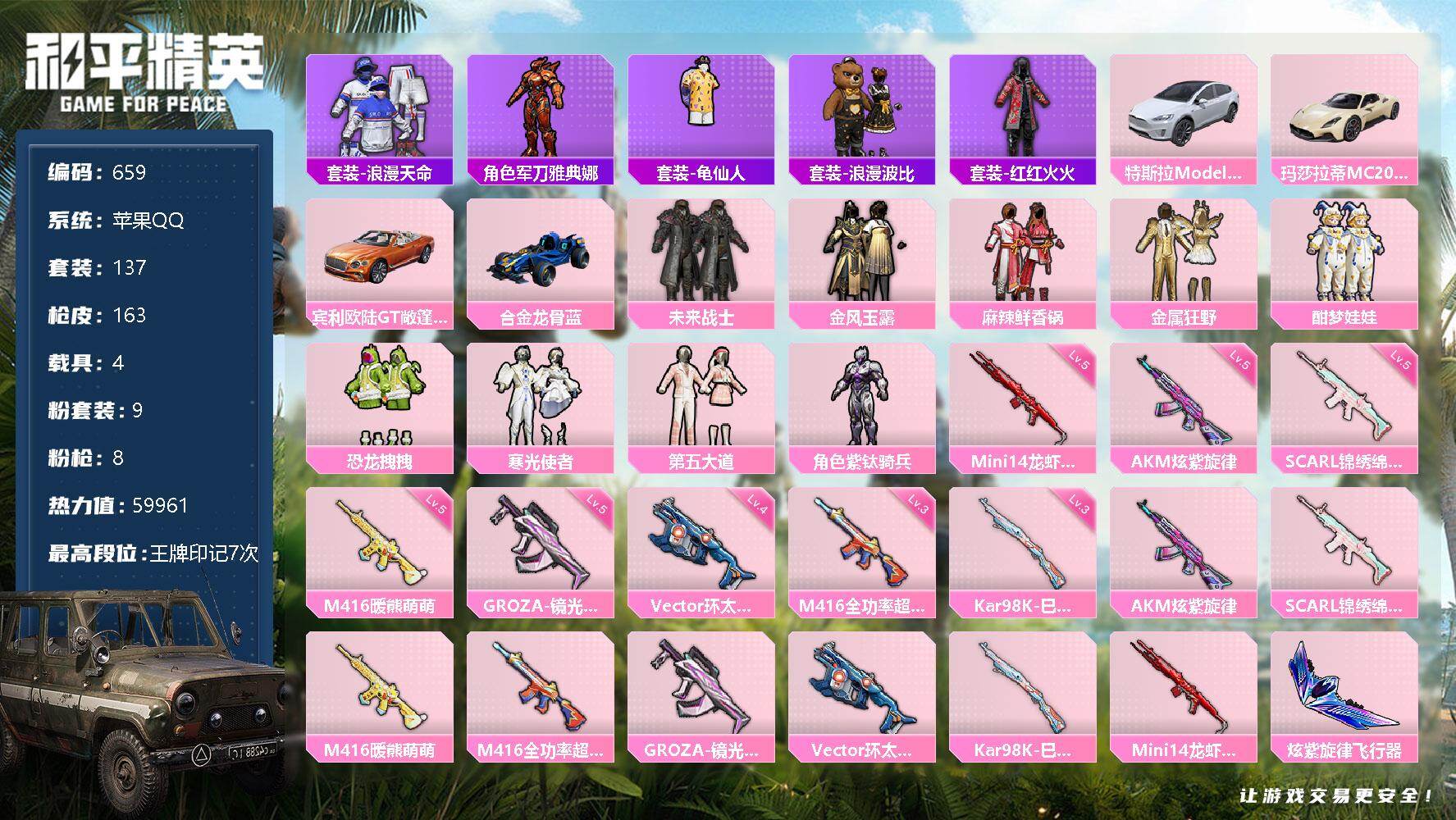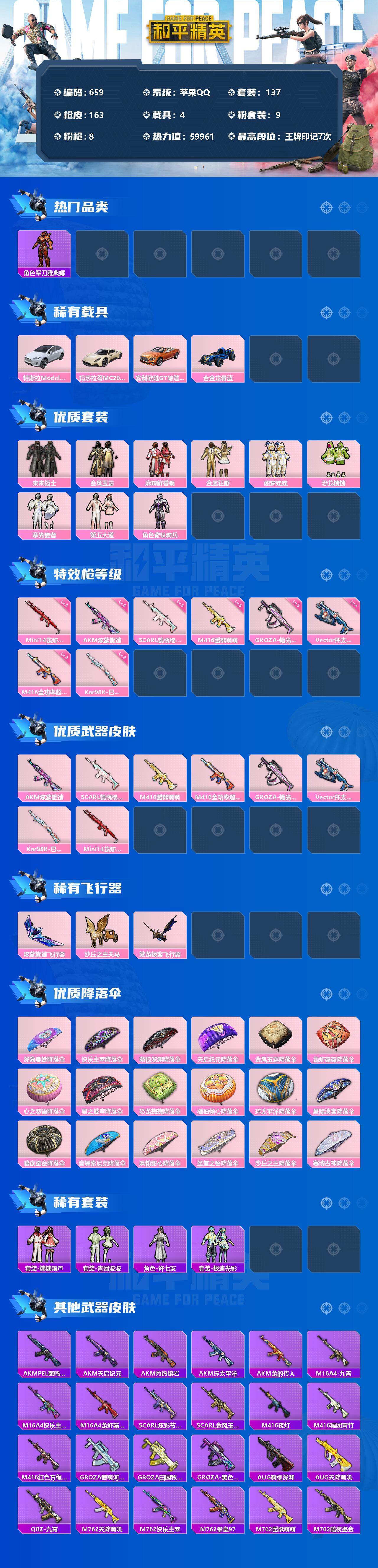 [12484107]【商品标题】:苹果 手q-9粉装-8特效呛-4载具-3粉色飞行器-59961热力值-7王牌印记-137套装-163呛皮 【热门品类】:套装-浪漫天命,角色-军刀雅典娜,套装-龟仙人,套装-浪漫波比,套装-红红火火 【粉色载具】:特斯拉model x(珍珠白),玛莎拉蒂mc20(星石白),宾利欧陆gt敞篷(火焰橘),合金龙骨(蓝) 【粉色套装】:粉装-未来战士,粉装-金风玉露,粉装-麻辣鲜香锅,粉装-金属狂野,粉装-酣梦娃娃,粉装-恐龙拽拽,粉装-寒光使者,粉装-第五大道,角色-紫钛骑兵 【粉色呛皮等级】:akm-炫紫旋律五级,scar-l-锦绣绵绵五级,m416-暖熊萌萌五级,m416-全功率超战三级,groza-镜光银凌五级,vect-环太平洋四级,kar98k-巳巳如意三级,mini14-龙虾霸霸五级 【粉色呛皮】:akm-炫紫旋律,scar-l-锦绣绵绵,m416-暖熊萌萌,m416-全功率超战,groza-镜光银凌,vect-环太平洋,kar98k-巳巳如意,mini14-龙虾霸霸 【粉色飞行器】:炫紫旋律飞行器,沙丘之主天马,繁龙极客飞行器 【粉色降落伞】:深海曼妙降落伞,快乐主宰降落伞,凝视深渊降落伞,天启纪元降落伞,金风玉露降落伞,龙虾霸霸降落伞,心之恋语降落伞,星之彼岸降落伞,恐龙拽拽降落伞,橘柚倾心降落伞,环太平洋降落伞,星际浪客降落伞,暗夜鎏金降落伞,音爆索尼克降落伞,飒粉甜心降落伞,圣堂之誓降落伞,沙丘之主降落伞,赛博古神降落伞 【稀有套装】:套装-龟仙人,套装-糖糖葫芦,套装-青团波波,角色-许七安,套装-极速光影 【稀有呛皮】:akm-pel轰鸣竞梦者,akm-天启纪元,akm-灼热熔岩,akm-环太平洋,akm-龙的传人,m16a4-九霄,m16a4-快乐主宰,m16a4-龙虾霸霸,scar-l-炫彩节奏,scar-l-金风玉露,m416-夜灯,m416-糯团青竹,m416-红色方程式,groza-懵萌河马,groza-田园牧歌,groza-黑色刀锋,aug-凝视深渊,aug-天降萌叽,q-九霄,m762-天降萌叽,m762-快乐主宰,m762-拳皇97,m762-暖熊萌萌,m762-暗夜鎏金,m762-牛气冲天,mk47-妙红点点,mk47-百万伏特,g36c-六号树人,g36c-懵萌河马,
