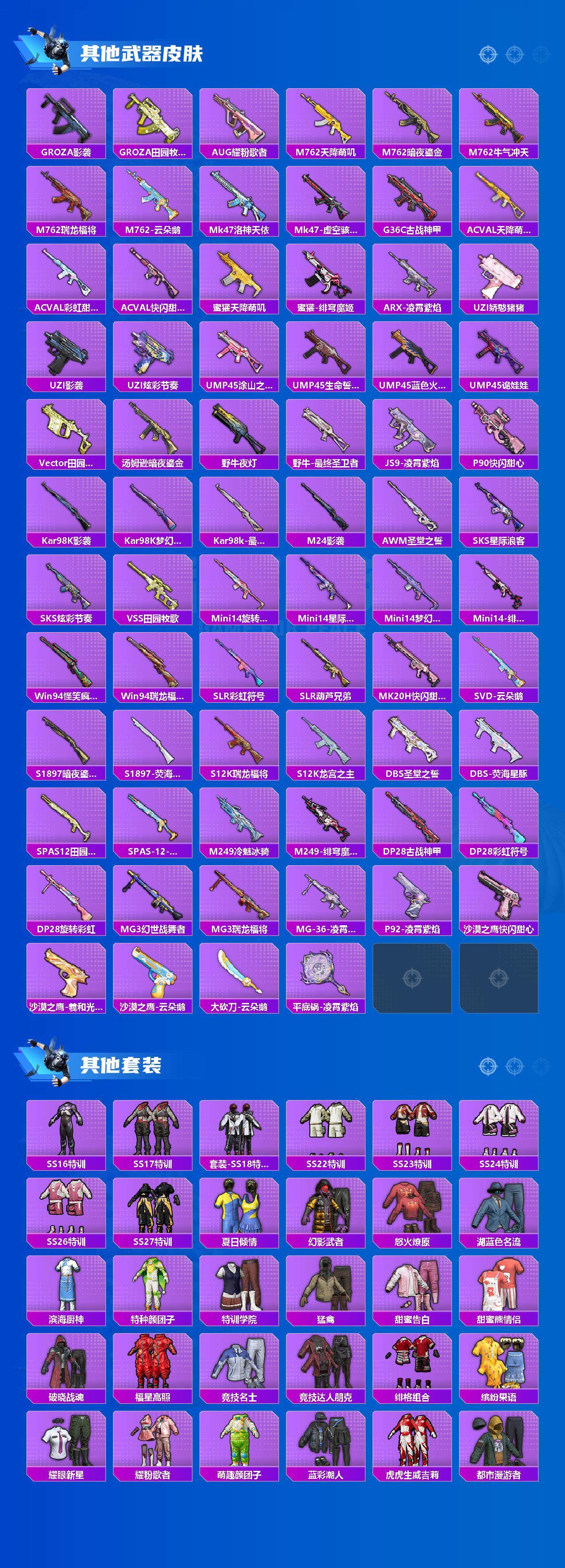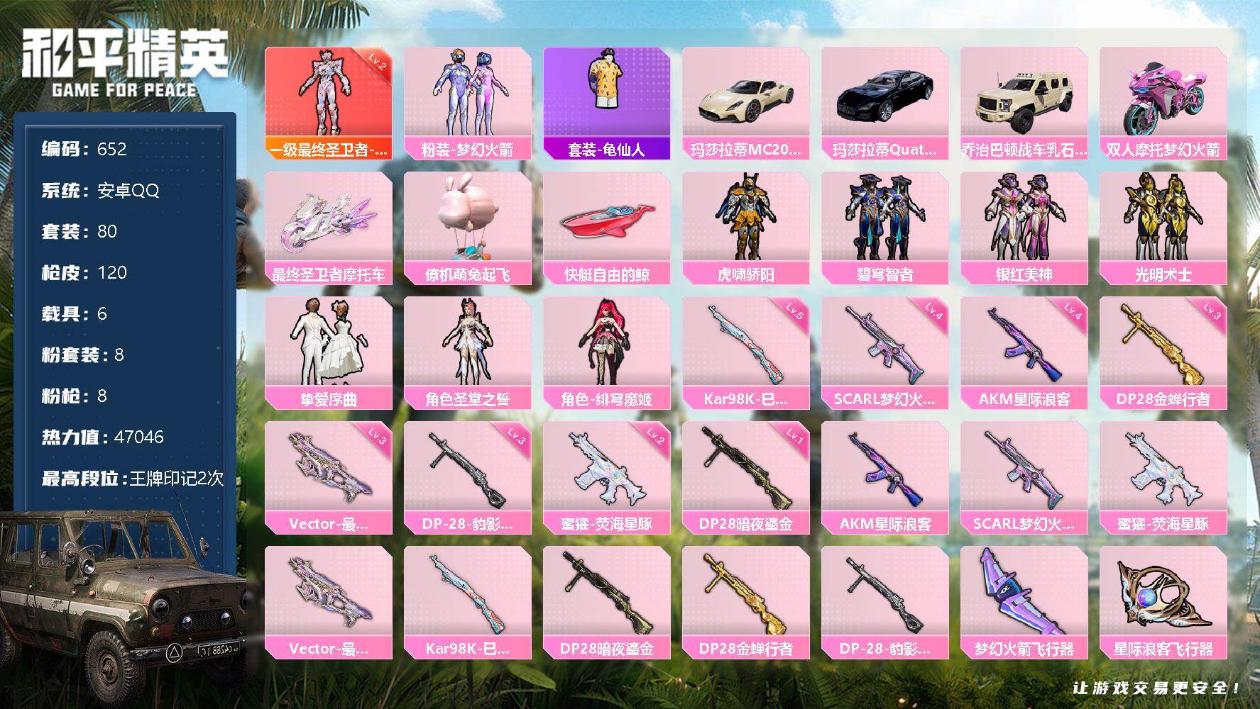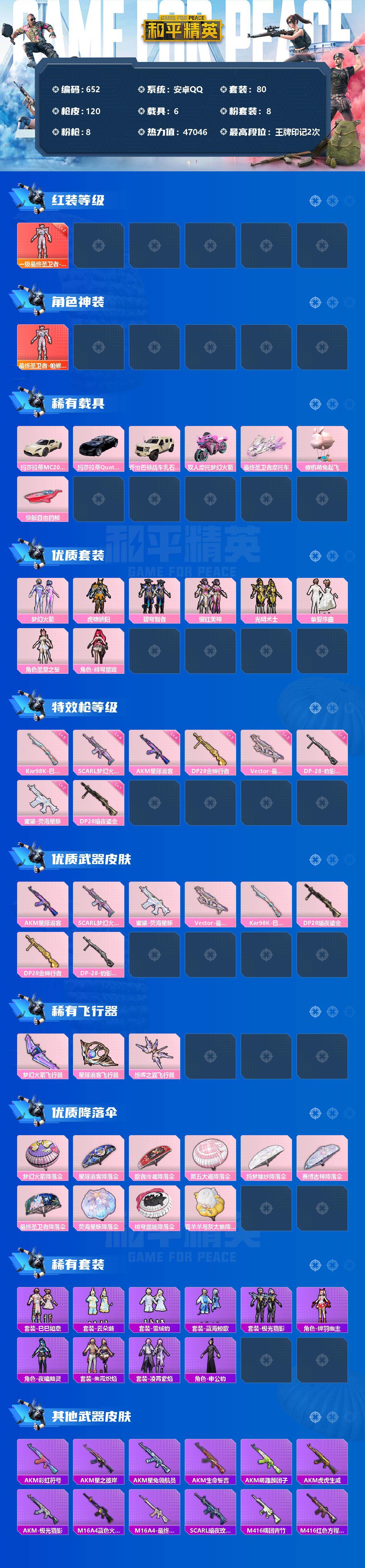 [12484131]【商品标题】:安卓 手q-1神装-8粉装-8特效呛-6载具-3粉色飞行器-47046热力值-2王牌印记-80套装-120呛皮 【红色神装等级】:最终圣卫者-帕修斯二级 【红色角色神装】:最终圣卫者-帕修斯 【热门品类】:粉装-梦幻火箭,套装-龟仙人 【粉色载具】:玛莎拉蒂mc20(星石白),玛莎拉蒂quattropte(夜幕蓝),乔治巴顿战车(乳石白),双人摩托-梦幻火箭,最终圣卫者摩托车,僚机-萌兔起飞,快艇-自由的鲸 【粉色套装】:粉装-梦幻火箭,粉装-虎啸骄阳,粉装-碧穹智者,粉装-银红美神,粉装-光明术士,粉装-挚爱序曲,角色-圣堂之誓,角色-绯穹魔姬 【粉色呛皮等级】:akm-星际浪客四级,scar-l-梦幻火箭四级,蜜獾-荧海星豚二级,vect-最终圣卫者三级,kar98k-巳巳如意五级,dp-28-暗夜鎏金一级,dp-28-金蝉行者三级,dp-28-豹影疾电三级 【粉色呛皮】:akm-星际浪客,scar-l-梦幻火箭,蜜獾-荧海星豚,vect-最终圣卫者,kar98k-巳巳如意,dp-28-暗夜鎏金,dp-28-金蝉行者,dp-28-豹影疾电 【粉色飞行器】:梦幻火箭飞行器,星际浪客飞行器,终晖之翼飞行器 【粉色降落伞】:梦幻火箭降落伞,星际浪客降落伞,歌者泠鸢降落伞,第五大道降落伞,纯梦嫁纱降落伞,赛博古神降落伞,最终圣卫者降落伞,荧海星豚降落伞,绯穹魔姬降落伞,喜羊羊与灰太狼降落伞 【稀有套装】:套装-龟仙人,套装-巳巳如意,套装-云朵鹅,套装-雪绒豹,套装-蓝海鲸歌,套装-极光猎影,角色-绛羽幽主,角色-夜瞳黯灵,套装-朱霞炽焰,套装-凌霄紫焰,角色-申公豹 【稀有呛皮】:akm-彩虹符号,akm-星之彼岸,akm-星兔领航员,akm-生命誓言,akm-萌趣颜团子,akm-虎虎生威,akm-极光猎影,m16a4-蓝色火焰,m16a4-最终圣卫者,scar-l-暗夜玫瑰,m416-糯团青竹,m416-红色方程式,groza-影袭,groza-田园牧歌,aug-耀粉歌者,m762-天降萌叽,m762-暗夜鎏金,m762-牛气冲天,m762-瑞龙福将,m762-云朵鹅,mk47-洛神天依,mk47-虚空骇客,g36c-古战神甲,ac-val-天降萌叽,ac-val-彩虹甜喵,ac-val-快闪甜心,蜜獾