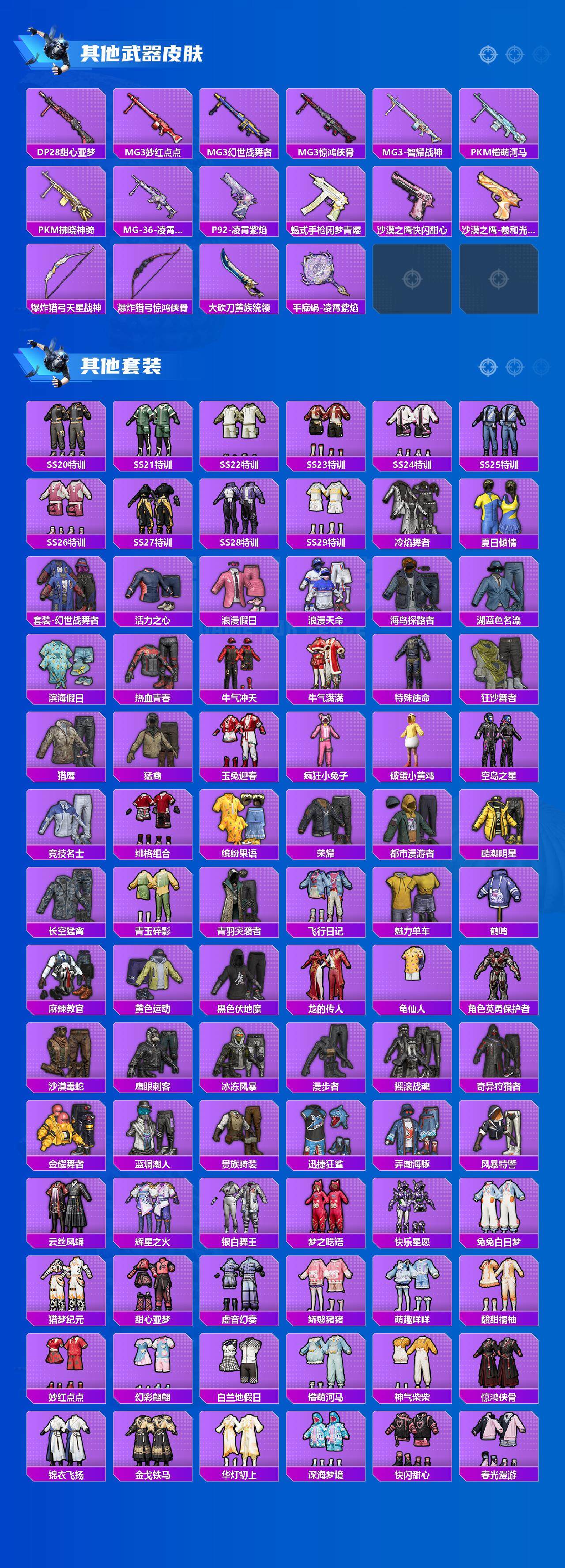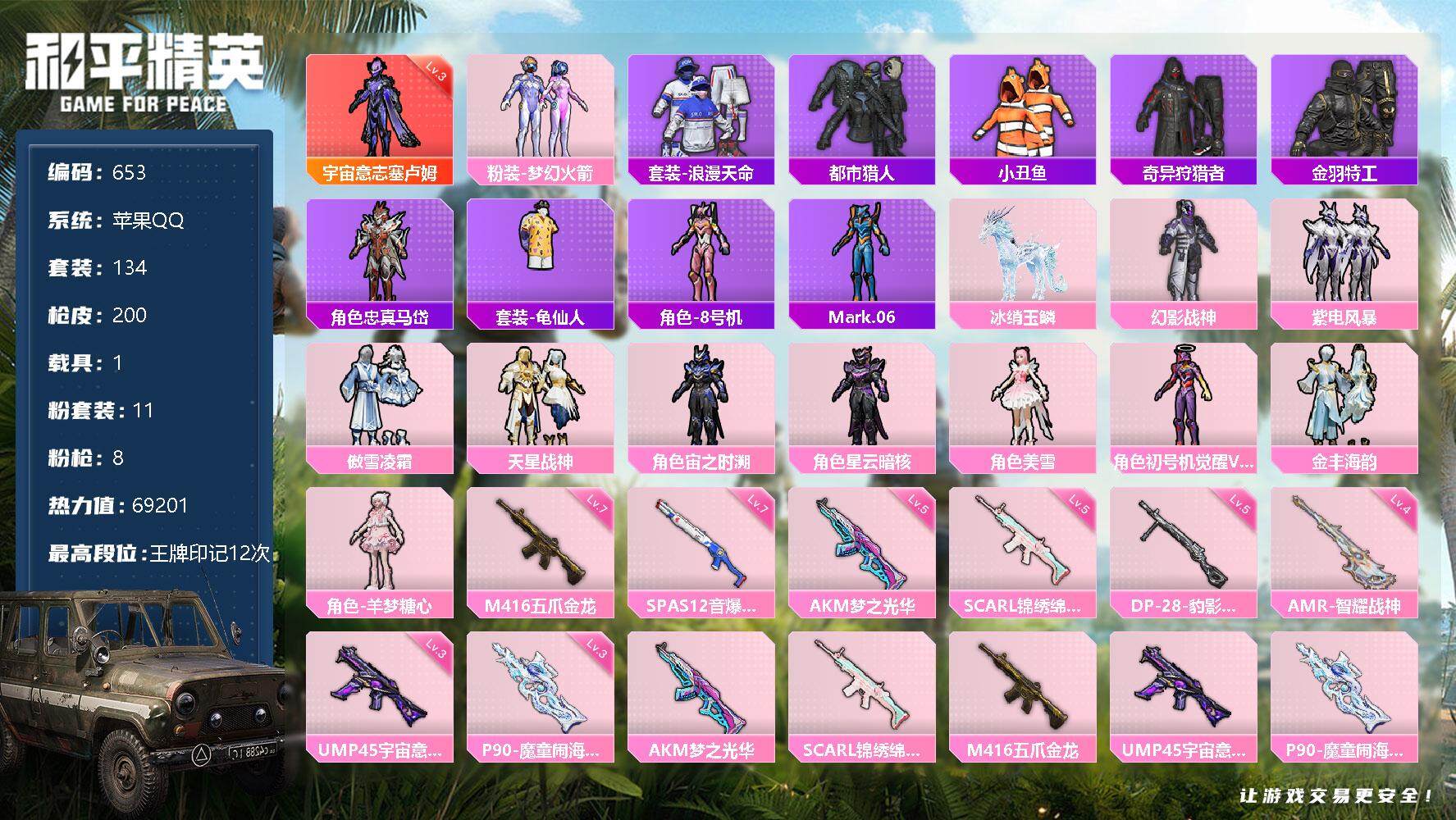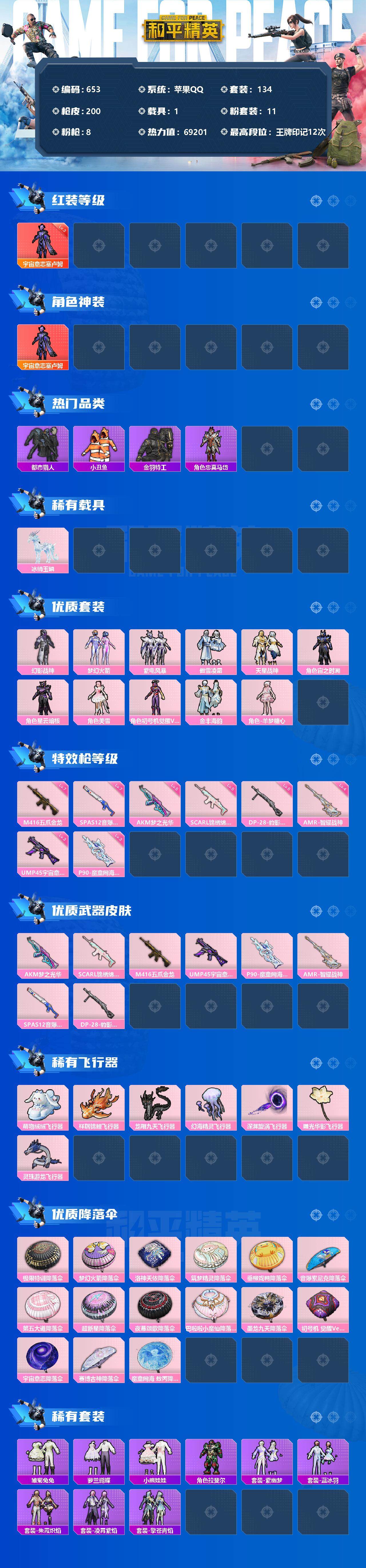 [12484137]【商品标题】:苹果 手q-1神装-11粉装-8特效呛-1载具-7粉色飞行器-69201热力值-12王牌印记-134套装-200呛皮 【红色神装等级】:宇宙意志-塞卢姆三级 【红色角色神装】:宇宙意志-塞卢姆 【热门品类】:粉装-梦幻火箭,套装-浪漫天命,套装-都市猎人,套装-小丑鱼,套装-奇异狩猎者,套装-金羽特工,角色-忠真马岱,套装-龟仙人,角色-8号机,角色-mark.06 【粉色载具】:冰绡玉鳞 【粉色套装】:粉装-幻影战神,粉装-梦幻火箭,粉装-紫电风暴,粉装-傲雪凌霜,粉装-天星战神,角色-宙之时溯,角色-星云暗核,角色-美雪,角色-初号机 觉醒ver.,粉装-金丰海韵,角色-羊梦糖心 【粉色呛皮等级】:akm-梦之光华五级,scar-l-锦绣绵绵五级,m416-五爪金龙七级,ump45-宇宙意志三级,p90-魔童闹海 敖丙三级,amr-智耀战神四级,spas-12-音爆索尼克七级,dp-28-豹影疾电五级 【粉色呛皮】:akm-梦之光华,scar-l-锦绣绵绵,m416-五爪金龙,ump45-宇宙意志,p90-魔童闹海 敖丙,amr-智耀战神,spas-12-音爆索尼克,dp-28-豹影疾电 【粉色飞行器】:萌物绒绒飞行器,祥瑞锦鲤飞行器,龙翔九天飞行器,幻海精灵飞行器,深渊漩涡飞行器,曦光华影飞行器,灵珠游龙飞行器 【粉色降落伞】:极限特训降落伞,梦幻火箭降落伞,洛神天依降落伞,筑梦精灵降落伞,垂柳戏鸭降落伞,音爆索尼克降落伞,第五大道降落伞,超新星降落伞,夜幕颂歌降落伞,巴啦啦小魔仙降落伞,墨龙九天降落伞,初号机 觉醒ver.降落伞,宇宙意志降落伞,赛博古神降落伞,魔童闹海 敖丙降落伞 【稀有套装】:套装-龟仙人,套装-雏菊兔兔,套装-萝兰蝴蝶,套装-小熊娃娃,角色-拉斐尔,套装-紫幽梦,套装-蓝冰羽,套装-朱霞炽焰,套装-凌霄紫焰,套装-擎苍青焰 【稀有呛皮】:akm-2p战斗服款,akm-墨染幽兰,akm-奇异狩猎者,akm-彩虹符号,akm-影袭,akm-星之彼岸,akm-缤纷海域,akm-龙的传人,m16a4-幻世战舞者,m16a4-甜心亚梦,m16a4-莲影清波,scar-l-暗夜玫瑰,scar-l-玉兔迎春,scar-l-红色方程式,m416-糯团青竹,m416-蓝色火焰,groza-彩虹符号,gr