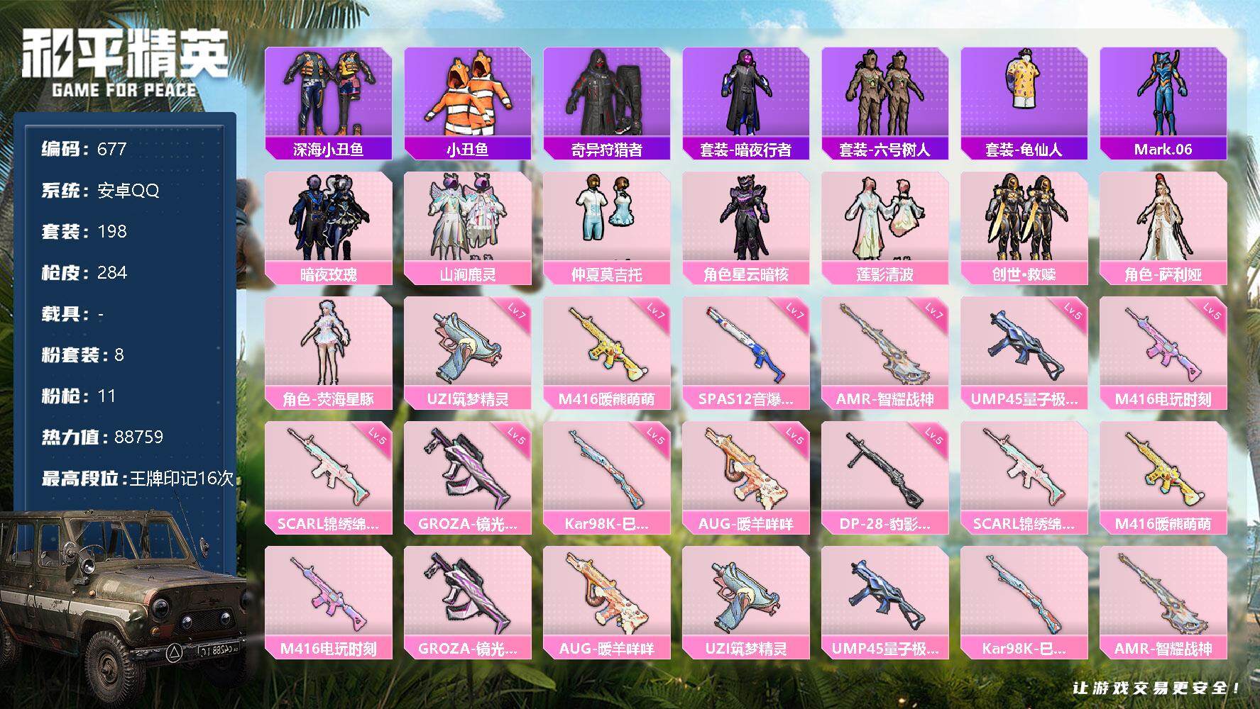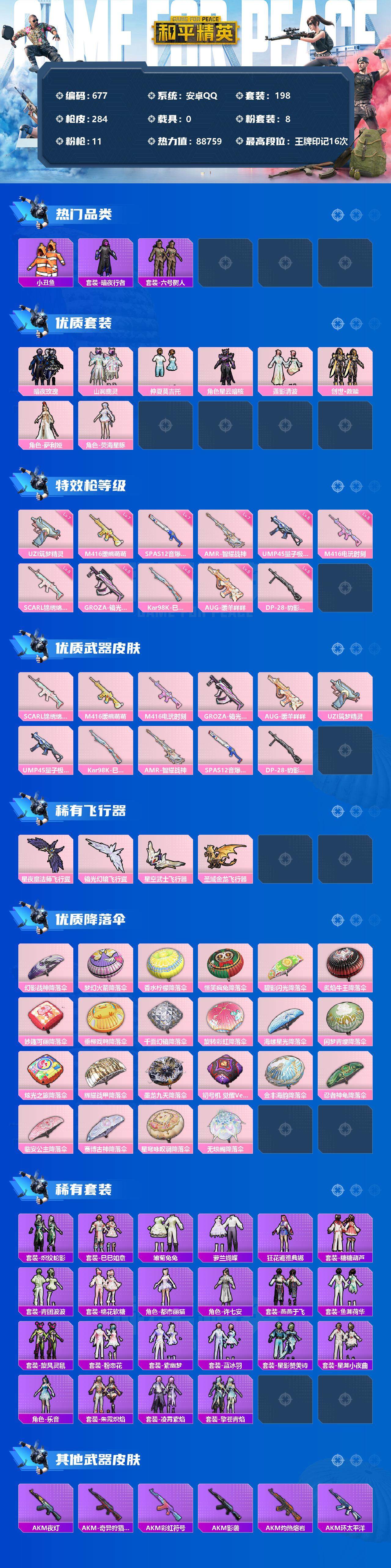[12484160]【商品标题】:安卓 手q-8粉装-11特效呛-0载具-5粉色飞行器-88759热力值-16王牌印记-198套装-284呛皮 【热门品类】:套装-深海小丑鱼,套装-小丑鱼,套装-奇异狩猎者,套装-暗夜行者,套装-六号树人,套装-龟仙人,角色-mark.06 【粉色套装】:粉装-暗夜玫瑰,粉装-山涧鹿灵,粉装-仲夏莫吉托,角色-星云暗核,粉装-莲影清波,套装-创世·救赎,角色-萨利娅,角色-荧海星豚 【粉色呛皮等级】:scar-l-锦绣绵绵五级,m416-暖熊萌萌七级,m416-电玩时刻五级,groza-镜光银凌五级,aug-暖羊咩咩五级,uzi-筑梦精灵七级,ump45-量子极限五级,kar98k-巳巳如意五级,amr-智耀战神七级,spas-12-音爆索尼克七级,dp-28-豹影疾电五级 【粉色呛皮】:scar-l-锦绣绵绵,m416-暖熊萌萌,m416-电玩时刻,groza-镜光银凌,aug-暖羊咩咩,uzi-筑梦精灵,ump45-量子极限,kar98k-巳巳如意,amr-智耀战神,spas-12-音爆索尼克,dp-28-豹影疾电 【粉色飞行器】:星夜魔法师飞行翼,镜光幻境飞行翼,星空武士飞行器,圣域金龙飞行器 【粉色降落伞】:幻影战神降落伞,梦幻火箭降落伞,香水柠檬降落伞,怪笑疯兔降落伞,碧影闪光降落伞,炙焰牛王降落伞,妙趣可丽降落伞,垂柳戏鸭降落伞,千面幻镜降落伞,旋转彩虹降落伞,海螺星光降落伞,闲梦青缨降落伞,炫光之旅降落伞,辉耀战甲降落伞,墨龙九天降落伞,初号机 觉醒ver.降落伞,金丰海韵降落伞,忍者神龟降落伞,临安公主降落伞,赛博古神降落伞,星穹咏叹调降落伞,无垠阁降落伞 【稀有套装】:套装-龟仙人,套装-炽纹蛇影,套装-巳巳如意,套装-雏菊兔兔,套装-萝兰蝴蝶,角色-狂花道·雅典娜,套装-糖糖葫芦,套装-青团波波,套装-棉花软糖,角色-都市丽猫,角色-许七安,套装-燕燕于飞,套装-鱼渊荷华,套装-旋风灵鼠,套装-粉恋花,套装-紫幽梦,套装-蓝冰羽,套装-星影赞美诗,套装-星渊小夜曲,角色-乐音,套装-朱霞炽焰,套装-凌霄紫焰,套装-擎苍青焰 【稀有呛皮】:akm-夜灯,akm-奇异狩猎者,akm-彩虹符号,akm-影袭,akm-江南烟雨,akm-灼热熔岩,akm-环太平洋,akm-生命誓言,akm-破晓战