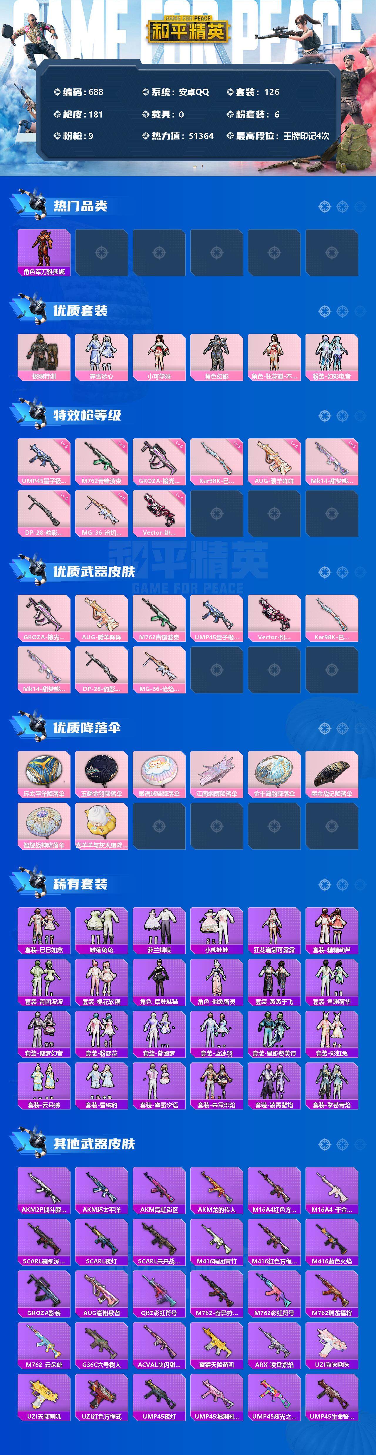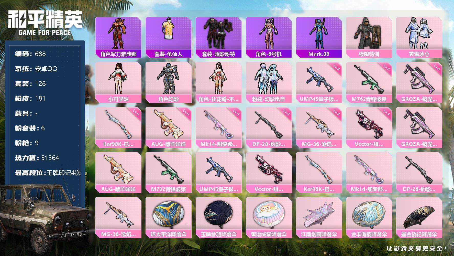 [12484193]【商品标题】:安卓 手q-6粉装-9特效呛-0载具-0粉色飞行器-51364热力值-4王牌印记-126套装-181呛皮 【热门品类】:角色-军刀雅典娜,套装-龟仙人,套装-暗影哥特,角色-8号机,角色-mark.06 【粉色套装】:粉装-极限特训,粉装-霁雪冰心,角色-小可学妹,角色-幻影,角色-狂花道·不知火舞,粉装-幻彩电音 【粉色呛皮等级】:groza-镜光银凌五级,aug-暖羊咩咩五级,m762-青锋波束五级,ump45-量子极限五级,vect-绯穹魔姬四级,kar98k-巳巳如意五级,mk14-甜梦熊击五级,dp-28-豹影疾电五级,mg-36-沧焰双生五级 【粉色呛皮】:groza-镜光银凌,aug-暖羊咩咩,m762-青锋波束,ump45-量子极限,vect-绯穹魔姬,kar98k-巳巳如意,mk14-甜梦熊击,dp-28-豹影疾电,mg-36-沧焰双生 【粉色降落伞】:环太平洋降落伞,玉鳞金羽降落伞,蜜语绒猫降落伞,江南烟雨降落伞,金丰海韵降落伞,墨金战记降落伞,智耀战神降落伞,喜羊羊与灰太狼降落伞 【稀有套装】:套装-龟仙人,套装-巳巳如意,套装-雏菊兔兔,套装-萝兰蝴蝶,套装-小熊娃娃,角色-狂花道·娜可露露,套装-糖糖葫芦,套装-青团波波,套装-棉花软糖,角色-摩登魅猫,角色-俏兔智灵,套装-燕燕于飞,套装-鱼渊荷华,套装-樱梦幻音,套装-粉恋花,套装-紫幽梦,套装-蓝冰羽,套装-星影赞美诗,套装-彩虹兔,套装-云朵鹅,套装-雪绒豹,套装-蜜露汐语,套装-朱霞炽焰,套装-凌霄紫焰,套装-擎苍青焰 【稀有呛皮】:akm-2p战斗服款,akm-环太平洋,akm-霓虹街区,akm-龙的传人,m16a4-红色方程式,m16a4-千金淑猫,scar-l-凝视深渊,scar-l-夜灯,scar-l-未来战士,m416-糯团青竹,m416-红色方程式,m416-蓝色火焰,groza-影袭,aug-耀粉歌者,q-彩虹符号,m762-奇异狩猎者,m762-彩虹符号,m762-瑞龙福将,m762-云朵鹅,g36c-六号树人,ac-val-快闪甜心,蜜獾-天降萌叽,arx-凌霄紫焰,uzi-啾咪啾咪,uzi-天降萌叽,uzi-红色方程式,ump45-夜灯,ump45-海渊国主,ump45-炫光之旅,ump45-生命誓