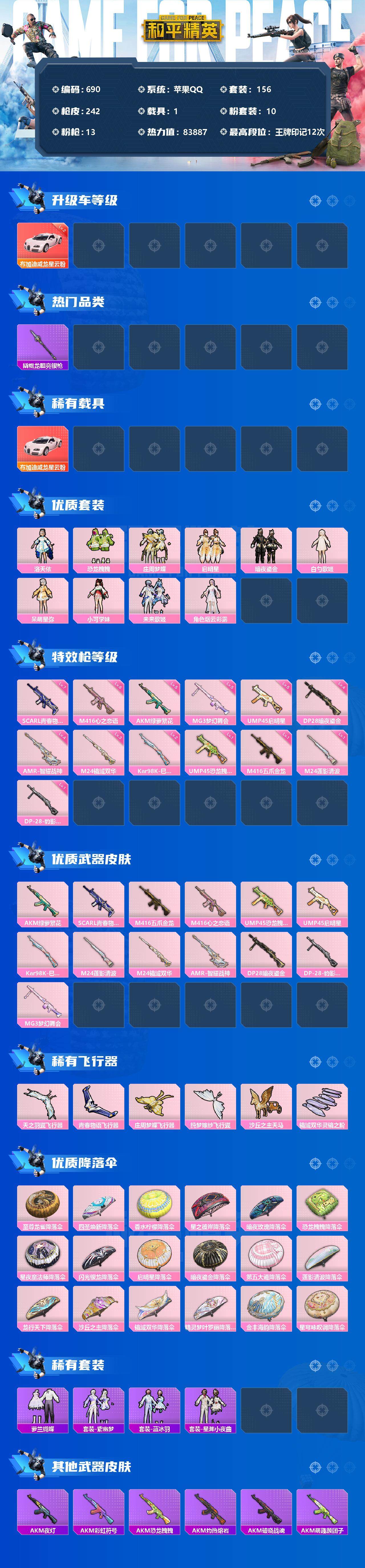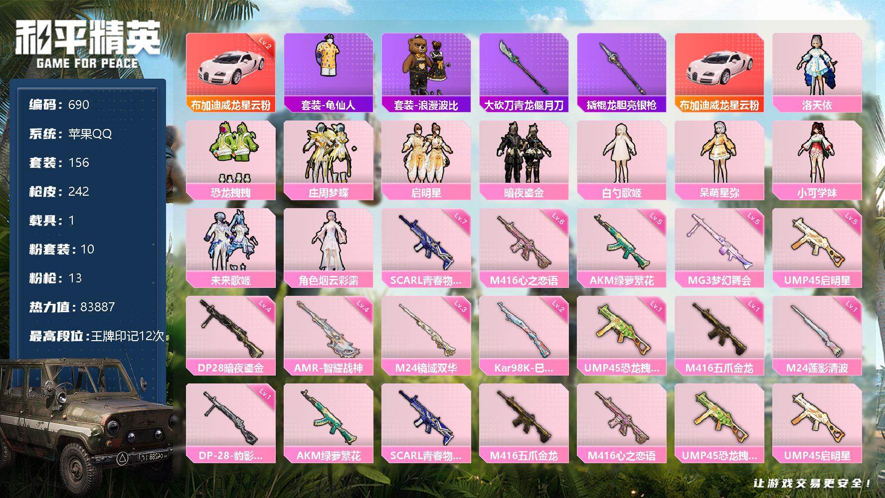 [12484199]【商品标题】:苹果 手q-10粉装-13特效呛-1载具-6粉色飞行器-83887热力值-12王牌印记-156套装-242呛皮 【红色载具】:布加迪威龙(星云粉)二级 【热门品类】:套装-龟仙人,套装-浪漫波比,大砍刀-青龙偃月刀,撬棍-龙胆亮银呛 【粉色载具】:布加迪威龙(星云粉) 【粉色套装】:角色-洛天依,粉装-恐龙拽拽,粉装-庄周梦蝶,粉装-启明星,粉装-暗夜鎏金,角色-白勺歌姬,角色-呆萌星弥,角色-小可学妹,粉装-未来歌姬,角色-烟云彩露 【粉色呛皮等级】:akm-绿萝繁花五级,scar-l-青春物语七级,m416-五爪金龙一级,m416-心之恋语六级,ump45-恐龙拽拽一级,ump45-启明星五级,kar98k-巳巳如意二级,m24-莲影清波一级,m24-镜域双华三级,amr-智耀战神四级,dp-28-暗夜鎏金四级,dp-28-豹影疾电一级,mg3-梦幻舞会五级 【粉色呛皮】:akm-绿萝繁花,scar-l-青春物语,m416-五爪金龙,m416-心之恋语,ump45-恐龙拽拽,ump45-启明星,kar98k-巳巳如意,m24-莲影清波,m24-镜域双华,amr-智耀战神,dp-28-暗夜鎏金,dp-28-豹影疾电,mg3-梦幻舞会 【粉色飞行器】:天之羽翼飞行器,青春物语飞行器,庄周梦蝶飞行器,纯梦嫁纱飞行翼,沙丘之主天马,镜域双华-灵镜之阶 【粉色降落伞】:至尊龙雀降落伞,四圣焕新降落伞,香水柠檬降落伞,星之彼岸降落伞,暗夜玫瑰降落伞,恐龙拽拽降落伞,星夜魔法师降落伞,闪光银龙降落伞,启明星降落伞,暗夜鎏金降落伞,第五大道降落伞,莲影清波降落伞,龙行天下降落伞,沙丘之主降落伞,镜域双华降落伞,精灵梦叶罗丽降落伞,金丰海韵降落伞,星穹咏叹调降落伞 【稀有套装】:套装-龟仙人,套装-萝兰蝴蝶,套装-紫幽梦,套装-蓝冰羽,套装-星渊小夜曲 【稀有呛皮】:akm-夜灯,akm-彩虹符号,akm-恐龙拽拽,akm-灼热熔岩,akm-破晓战魂,akm-萌趣颜团子,akm-虎虎生威,akm-霓虹街区,akm-龙的传人,m16a4-夜灯,m16a4-幻世战舞者,m16a4-甜心亚梦,m16a4-莲影清波,scar-l-兔兔白日梦,scar-l-炫彩节奏,scar-l-玉兔迎春,scar-l-红色方程式,m