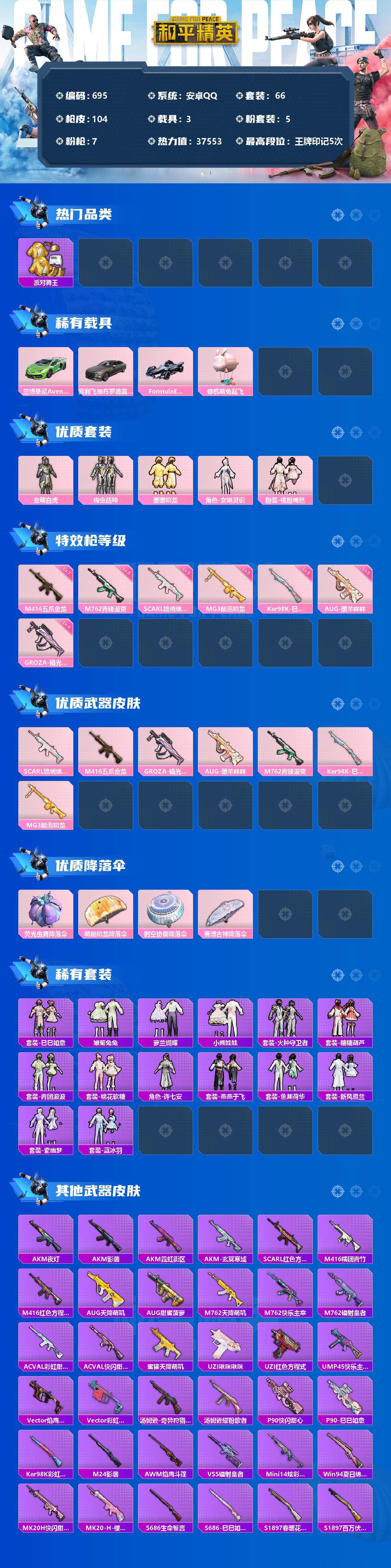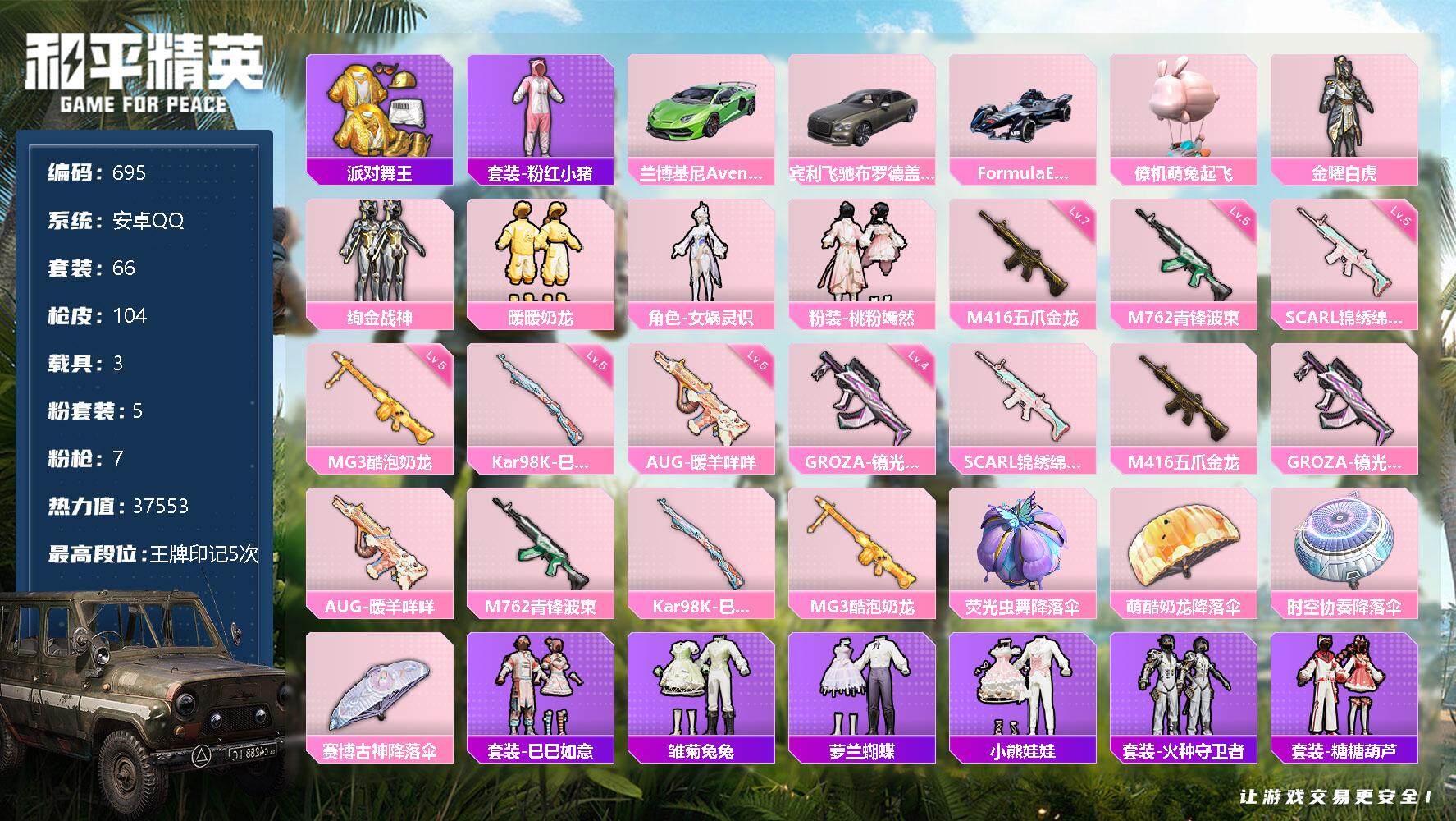 [12484217]【商品标题】:安卓 手q-5粉装-7特效呛-3载具-0粉色飞行器-37553热力值-5王牌印记-66套装-104呛皮 【热门品类】:套装-派对舞王,套装-粉红小猪 【粉色载具】:兰博基尼aventad svj(翡翠绿),宾利飞驰(布罗德盖棕双色),fmula e gen2(幽光蓝),僚机-萌兔起飞 【粉色套装】:粉装-金曜白虎,粉装-绚金战神,粉装-暖暖奶龙,角色-女娲灵识,粉装-桃粉嫣然 【粉色呛皮等级】:scar-l-锦绣绵绵五级,m416-五爪金龙七级,groza-镜光银凌四级,aug-暖羊咩咩五级,m762-青锋波束五级,kar98k-巳巳如意五级,mg3-酷泡奶龙五级 【粉色呛皮】:scar-l-锦绣绵绵,m416-五爪金龙,groza-镜光银凌,aug-暖羊咩咩,m762-青锋波束,kar98k-巳巳如意,mg3-酷泡奶龙 【粉色降落伞】:荧光虫舞降落伞,萌酷奶龙降落伞,时空协奏降落伞,赛博古神降落伞 【稀有套装】:套装-巳巳如意,套装-雏菊兔兔,套装-萝兰蝴蝶,套装-小熊娃娃,套装-火种守卫者,套装-糖糖葫芦,套装-青团波波,套装-棉花软糖,角色-许七安,套装-燕燕于飞,套装-鱼渊荷华,套装-新风雅兰,套装-紫幽梦,套装-蓝冰羽 【稀有呛皮】:akm-夜灯,akm-影袭,akm-霓虹街区,akm-玄冥寒域,scar-l-红色方程式,m416-糯团青竹,m416-红色方程式,aug-天降萌叽,aug-甜蜜菠萝,m762-天降萌叽,m762-快乐主宰,m762-镭射皇者,ac-val-彩虹甜喵,ac-val-快闪甜心,蜜獾-天降萌叽,uzi-啾咪啾咪,uzi-红色方程式,ump45-快乐主宰,vect-焰鹰斗篷,vect-彩虹符号,汤姆逊-奇异狩猎者,汤姆逊-耀粉歌者,p90-快闪甜心,p90-巳巳如意,kar98k-彩虹符号,m24-影袭,awm-焰鹰斗篷,vss-镭射皇者,mini14-炫彩节奏,win94-夏日绵绵冰,mk20-h-快闪甜心,mk20-h-樱桃泡泡,s686-生命誓言,s686-巳巳如意,s1897-春暖花开,s1897-百万伏特,s1897-镭射皇者,s12k-玩趣呆呆,s12k-破晓战魂,dbs-焰鹰斗篷,dbs-彩虹甜喵,m249-镭射皇者,dp-28-焰鹰斗篷,mg3-幻世战舞者,
