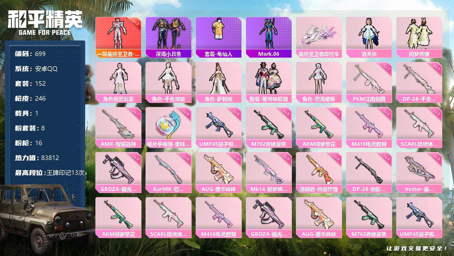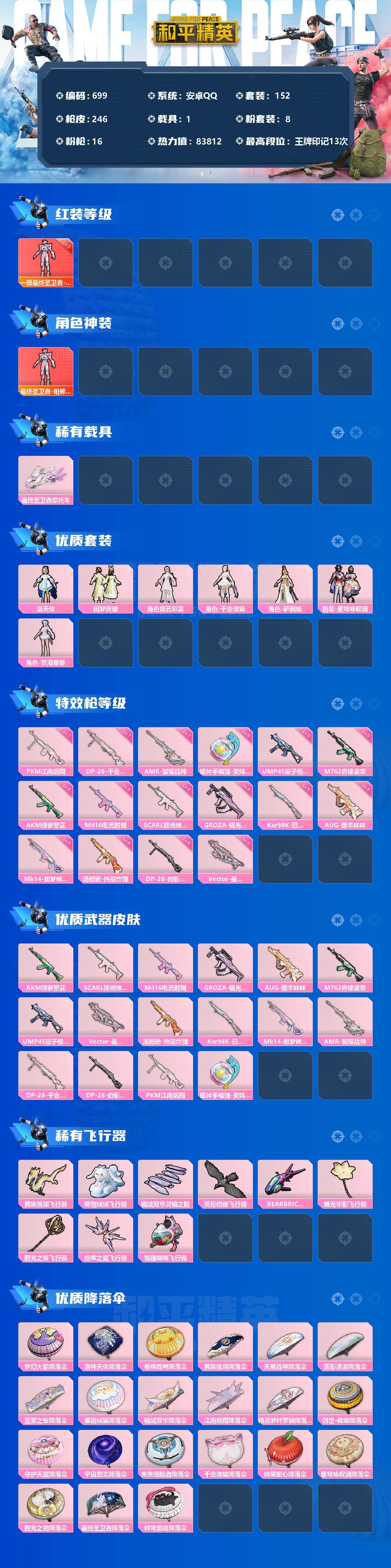 [12484244]【商品标题】:安卓 手q-1神装-8粉装-16特效呛-1载具-10粉色飞行器-83812热力值-13王牌印记-152套装-246呛皮 【红色神装等级】:最终圣卫者-帕修斯二级 【红色角色神装】:最终圣卫者-帕修斯 【热门品类】:套装-深海小丑鱼,套装-龟仙人,角色-mark.06 【粉色载具】:最终圣卫者摩托车 【粉色套装】:角色-洛天依,粉装-闲梦青缨,角色-烟云彩露,角色-千金淑猫,角色-萨利娅,粉装-星穹咏叹调,角色-荧海星豚 【粉色呛皮等级】:akm-绿萝繁花五级,scar-l-锦绣绵绵五级,m416-电玩时刻五级,groza-镜光银凌五级,aug-暖羊咩咩五级,m762-青锋波束五级,ump45-量子极限五级,vect-最终圣卫者三级,汤姆逊-热量炸弹五级,kar98k-巳巳如意五级,mk14-甜梦熊击五级,amr-智耀战神七级,dp-28-千金淑猫七级,dp-28-豹影疾电五级,pkm-江南烟雨七级,破片手留单-美味星星糖六级 【粉色呛皮】:akm-绿萝繁花,scar-l-锦绣绵绵,m416-电玩时刻,groza-镜光银凌,aug-暖羊咩咩,m762-青锋波束,ump45-量子极限,vect-最终圣卫者,汤姆逊-热量炸弹,kar98k-巳巳如意,mk14-甜梦熊击,amr-智耀战神,dp-28-千金淑猫,dp-28-豹影疾电,pkm-江南烟雨,破片手留单-美味星星糖 【粉色飞行器】:黄族统领飞行器,萌物绒绒飞行器,镜域双华-灵镜之阶,英伦信使飞行器,bearbrick飞行器,曦光华影飞行器,时光之誓飞行器,终晖之翼飞行器,智趣喵喵飞行器 【粉色降落伞】:梦幻火箭降落伞,洛神天依降落伞,垂柳戏鸭降落伞,黄族统领降落伞,天星战神降落伞,莲影清波降落伞,圣堂之誓降落伞,蜜语绒猫降落伞,镜域双华降落伞,江南烟雨降落伞,精灵梦叶罗丽降落伞,创世·救赎降落伞,守护天翼降落伞,宇宙意志降落伞,未来领航者降落伞,千金淑猫降落伞,绯果甜心降落伞,星穹咏叹调降落伞,时光之吻降落伞,最终圣卫者降落伞,绯穹魔姬降落伞 【稀有套装】:套装-龟仙人,套装-巳巳如意,套装-雏菊兔兔,套装-萝兰蝴蝶,套装-小熊娃娃,角色-拉斐尔,套装-游龙飞鱼,套装-行星泡泡,套装-火种守卫者,套装-糖糖葫芦,套装-青团波波