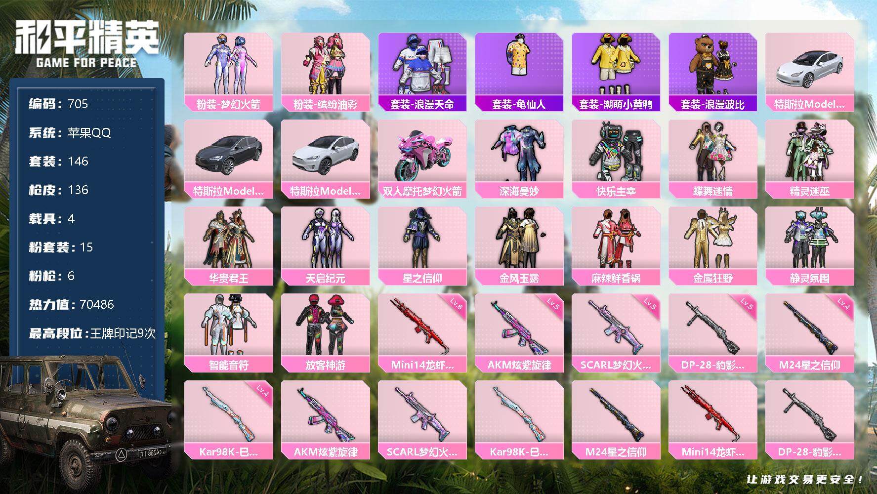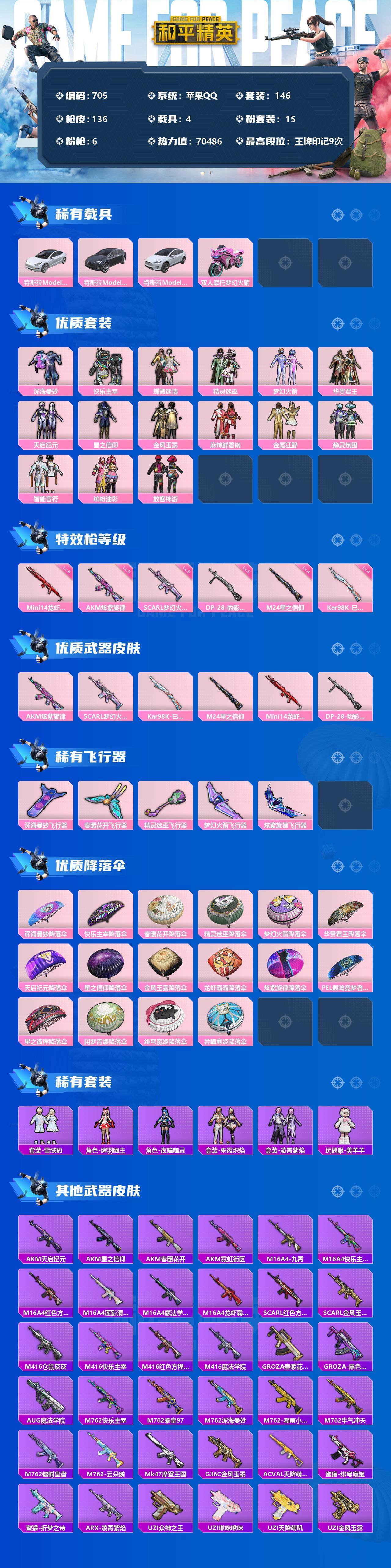 [12484284]【商品标题】:苹果 手q-15粉装-6特效呛-4载具-6粉色飞行器-70486热力值-9王牌印记-146套装-136呛皮 【热门品类】:粉装-梦幻火箭,粉装-缤纷油彩,套装-浪漫天命,套装-龟仙人,套装-潮萌小黄鸭,套装-浪漫波比 【粉色载具】:特斯拉model 3(珍珠白),特斯拉model x(冷光银),特斯拉model x(珍珠白),双人摩托-梦幻火箭 【粉色套装】:粉装-深海曼妙,粉装-快乐主宰,粉装-蝶舞迷情,粉装-精灵迷巫,粉装-梦幻火箭,粉装-华贵君王,粉装-天启纪元,粉装-星之信仰,粉装-金风玉露,粉装-麻辣鲜香锅,粉装-金属狂野,粉装-静灵氛围,粉装-智能音符,粉装-缤纷油彩,粉装-放客神游 【粉色呛皮等级】:akm-炫紫旋律五级,scar-l-梦幻火箭五级,kar98k-巳巳如意四级,m24-星之信仰四级,mini14-龙虾霸霸六级,dp-28-豹影疾电五级 【粉色呛皮】:akm-炫紫旋律,scar-l-梦幻火箭,kar98k-巳巳如意,m24-星之信仰,mini14-龙虾霸霸,dp-28-豹影疾电 【粉色飞行器】:深海曼妙飞行器,春暖花开飞行器,精灵迷巫飞行器,梦幻火箭飞行器,炫紫旋律飞行器 【粉色降落伞】:深海曼妙降落伞,快乐主宰降落伞,春暖花开降落伞,精灵迷巫降落伞,梦幻火箭降落伞,华贵君王降落伞,天启纪元降落伞,星之信仰降落伞,金风玉露降落伞,龙虾霸霸降落伞,炫紫旋律降落伞,pel轰鸣竞梦者降落伞,星之彼岸降落伞,闲梦青缨降落伞,绯穹魔姬降落伞,异瞳寒姬降落伞 【稀有套装】:套装-龟仙人,套装-雪绒豹,角色-绛羽幽主,角色-夜瞳黯灵,套装-朱霞炽焰,套装-凌霄紫焰,玩偶服-美羊羊 【稀有呛皮】:akm-天启纪元,akm-星之信仰,akm-春暖花开,akm-霓虹街区,m16a4-九霄,m16a4-快乐主宰,m16a4-红色方程式,m16a4-莲影清波,m16a4-魔法学院,m16a4-龙虾霸霸,scar-l-红色方程式,scar-l-金风玉露,m416-仓鼠灰灰,m416-快乐主宰,m416-红色方程式,m416-魔法学院,groza-春暖花开,groza-黑色刀锋,aug-魔法学院,m762-快乐主宰,m762-拳皇97,m762-深海曼妙,m762-潮萌小黄鸭,m762-牛气冲天,m762-镭射皇者,m762-