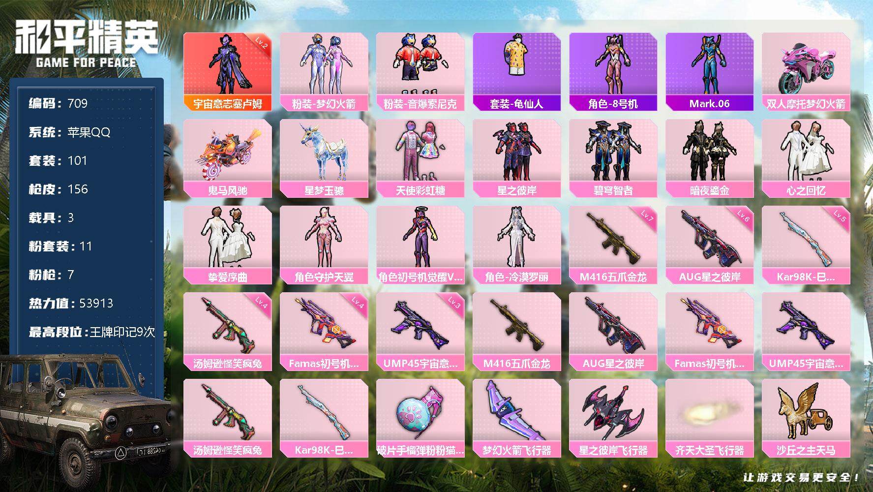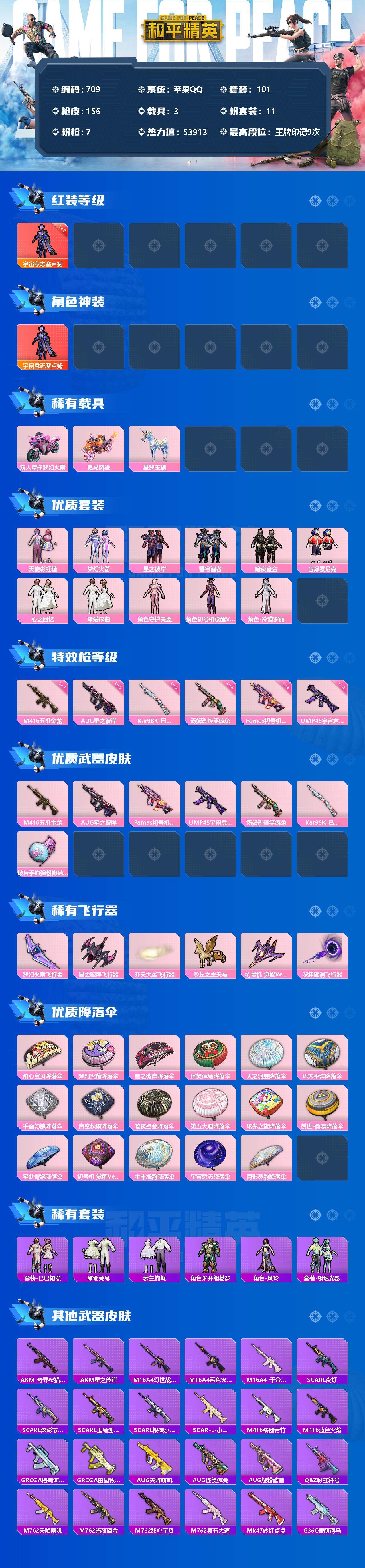 [12484307]【商品标题】:苹果 手q-1神装-11粉装-7特效呛-3载具-6粉色飞行器-53913热力值-9王牌印记-101套装-156呛皮 【红色神装等级】:宇宙意志-塞卢姆二级 【红色角色神装】:宇宙意志-塞卢姆 【热门品类】:粉装-梦幻火箭,粉装-音爆索尼克,套装-龟仙人,角色-8号机,角色-mark.06 【粉色载具】:双人摩托-梦幻火箭,鬼马风驰,星梦玉骢 【粉色套装】:粉装-天使彩虹糖,粉装-梦幻火箭,粉装-星之彼岸,粉装-碧穹智者,粉装-暗夜鎏金,粉装-音爆索尼克,粉装-心之回忆,粉装-挚爱序曲,角色-守护天翼,角色-初号机 觉醒ver.,角色-冷漠罗丽 【粉色呛皮等级】:m416-五爪金龙七级,aug-星之彼岸六级,famas-初号机 觉醒ver.四级,ump45-宇宙意志三级,汤姆逊-怪笑疯兔四级,kar98k-巳巳如意五级 【粉色呛皮】:m416-五爪金龙,aug-星之彼岸,famas-初号机 觉醒ver.,ump45-宇宙意志,汤姆逊-怪笑疯兔,kar98k-巳巳如意,破片手留单-粉粉猫爪 【粉色飞行器】:梦幻火箭飞行器,星之彼岸飞行器,齐天大圣飞行器,沙丘之主天马,初号机 觉醒ver.飞行器,深渊漩涡飞行器 【粉色降落伞】:甜心宝贝降落伞,梦幻火箭降落伞,星之彼岸降落伞,怪笑疯兔降落伞,天之羽翼降落伞,环太平洋降落伞,千面幻镜降落伞,青空秋雨降落伞,暗夜鎏金降落伞,第五大道降落伞,炫光之旅降落伞,创世·救赎降落伞,星梦奇缘降落伞,初号机 觉醒ver.降落伞,金丰海韵降落伞,宇宙意志降落伞,月影灵韵降落伞 【稀有套装】:套装-龟仙人,套装-巳巳如意,套装-雏菊兔兔,套装-萝兰蝴蝶,角色-米开朗基罗,角色-风玲,套装-极速光影 【稀有呛皮】:akm-奇异狩猎者,akm-星之彼岸,m16a4-幻世战舞者,m16a4-蓝色火焰,m16a4-千金淑猫,scar-l-夜灯,scar-l-炫彩节奏,scar-l-玉兔迎春,scar-l-银碳小老虎,scar-l-小狗蛇点点,m416-糯团青竹,m416-蓝色火焰,groza-懵萌河马,groza-田园牧歌,aug-天降萌叽,aug-怪笑疯兔,aug-耀粉歌者,q-彩虹符号,m762-天降萌叽,m762-暗夜鎏金,m762-甜心宝贝,m762-第五大道,mk47-妙红点点,g36c-懵萌