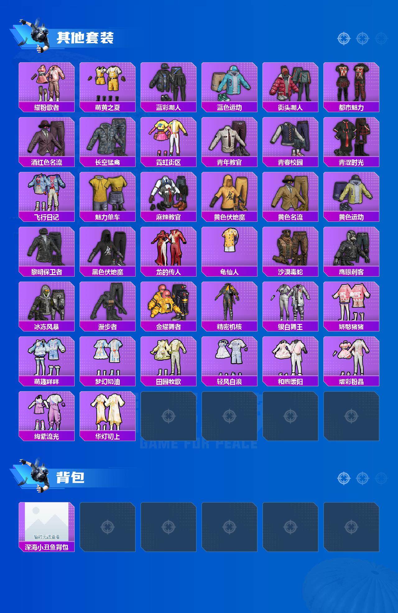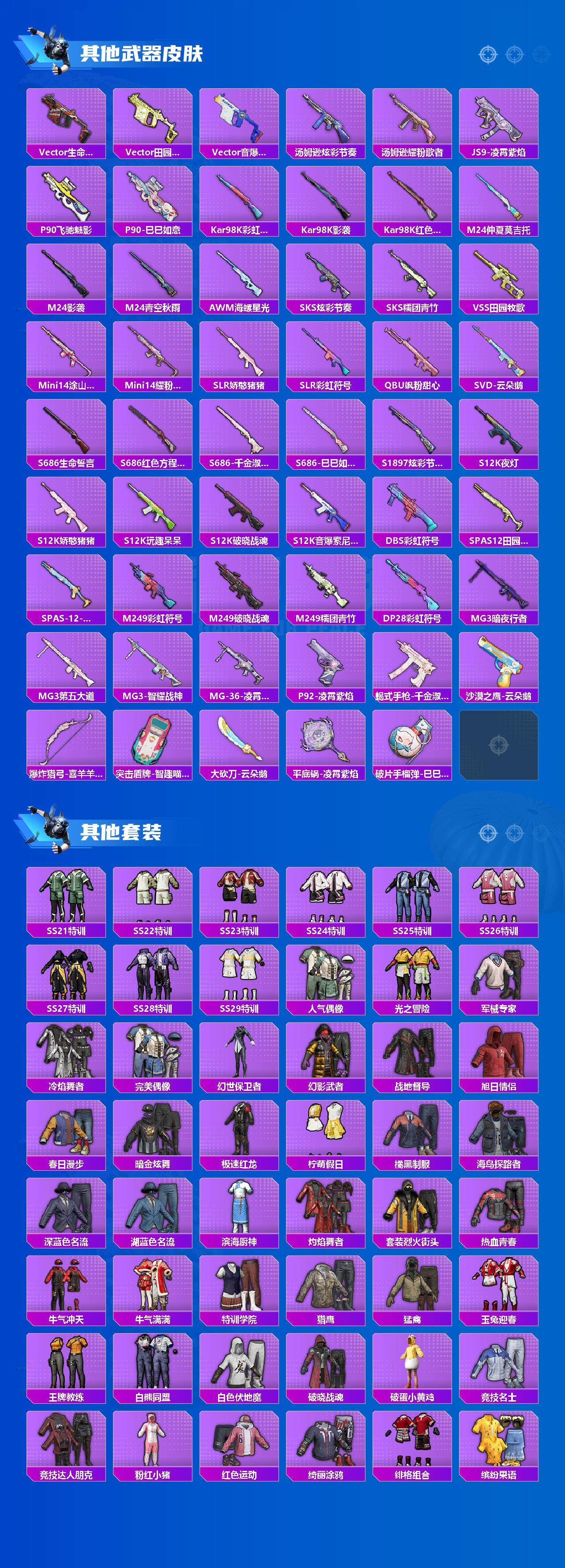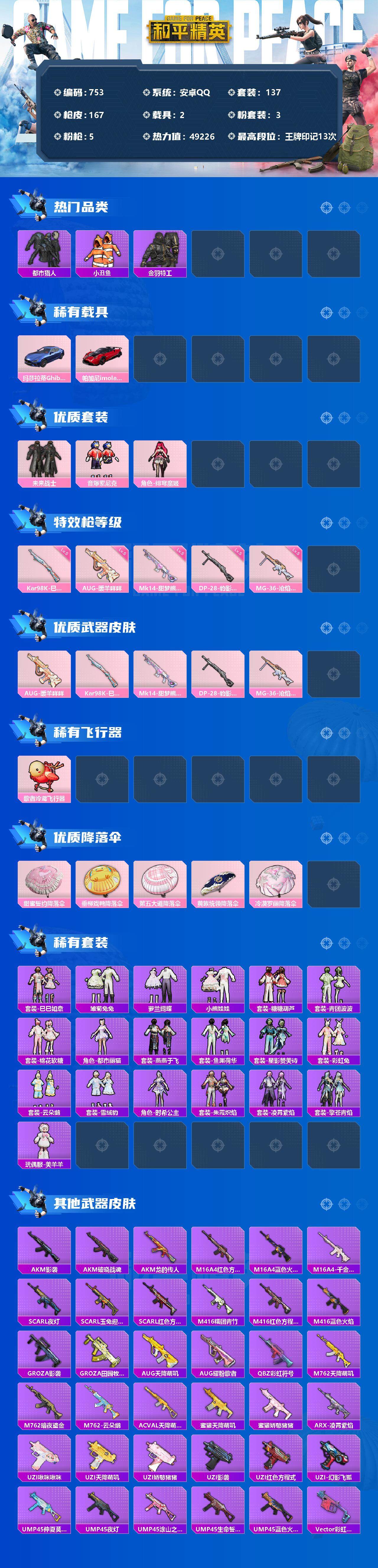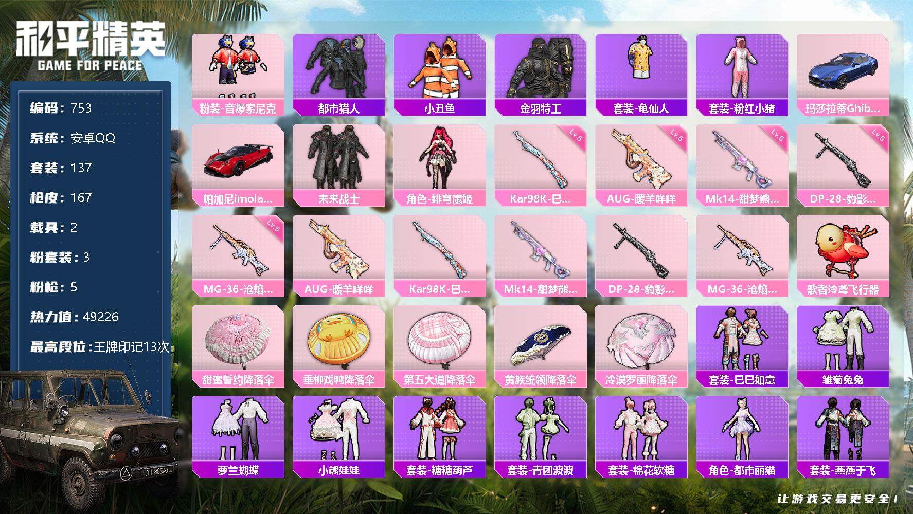 [12484522]【商品标题】:安卓 手q-3粉装-5特效呛-2载具-1粉色飞行器-49226热力值-13王牌印记-137套装-167呛皮 【热门品类】:粉装-音爆索尼克,套装-都市猎人,套装-小丑鱼,套装-金羽特工,套装-龟仙人,套装-粉红小猪 【粉色载具】:玛莎拉蒂ghibli(蓝),帕加尼imola(光影红) 【粉色套装】:粉装-未来战士,粉装-音爆索尼克,角色-绯穹魔姬 【粉色呛皮等级】:aug-暖羊咩咩五级,kar98k-巳巳如意五级,mk14-甜梦熊击五级,dp-28-豹影疾电五级,mg-36-沧焰双生五级 【粉色呛皮】:aug-暖羊咩咩,kar98k-巳巳如意,mk14-甜梦熊击,dp-28-豹影疾电,mg-36-沧焰双生 【粉色飞行器】:歌者泠鸢飞行器 【粉色降落伞】:甜蜜誓约降落伞,垂柳戏鸭降落伞,第五大道降落伞,黄族统领降落伞,冷漠罗丽降落伞 【稀有套装】:套装-龟仙人,套装-巳巳如意,套装-雏菊兔兔,套装-萝兰蝴蝶,套装-小熊娃娃,套装-糖糖葫芦,套装-青团波波,套装-棉花软糖,角色-都市丽猫,套装-燕燕于飞,套装-鱼渊荷华,套装-星影赞美诗,套装-彩虹兔,套装-云朵鹅,套装-雪绒豹,角色-时希公主,套装-朱霞炽焰,套装-凌霄紫焰,套装-擎苍青焰,玩偶服-美羊羊 【稀有呛皮】:akm-影袭,akm-破晓战魂,akm-龙的传人,m16a4-红色方程式,m16a4-蓝色火焰,m16a4-千金淑猫,scar-l-夜灯,scar-l-玉兔迎春,scar-l-红色方程式,m416-糯团青竹,m416-红色方程式,m416-蓝色火焰,groza-影袭,groza-田园牧歌,aug-天降萌叽,aug-耀粉歌者,q-彩虹符号,m762-天降萌叽,m762-暗夜鎏金,m762-云朵鹅,ac-val-天降萌叽,蜜獾-天降萌叽,蜜獾-娇憨猪猪,arx-凌霄紫焰,uzi-啾咪啾咪,uzi-天降萌叽,uzi-娇憨猪猪,uzi-影袭,uzi-红色方程式,uzi-幻影飞狐,ump45-仲夏莫吉托,ump45-夜灯,ump45-涂山之恋,ump45-生命誓言,ump45-蓝色火焰,vect-彩虹符号,vect-生命誓言,vect-田园牧歌,vect-音爆索尼克,汤姆逊-炫彩节奏,汤姆逊-耀粉歌者,js9-凌霄紫焰,p90-飞驰魅影,p90-巳巳如意,k