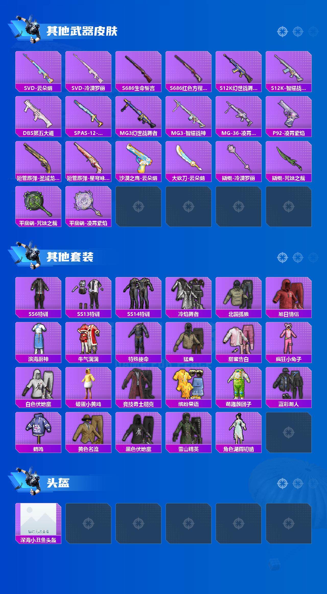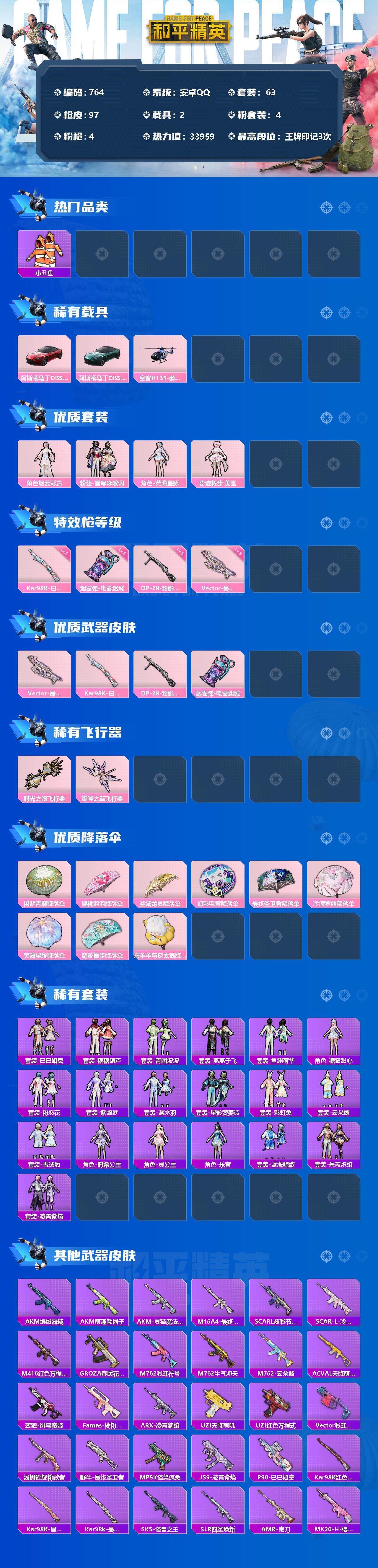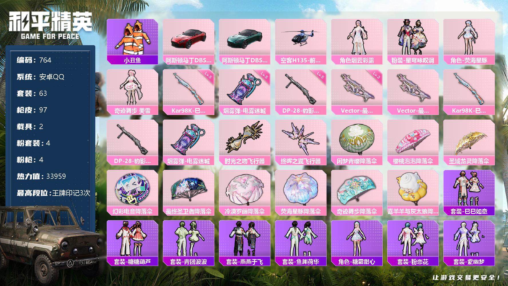 [12484592]【商品标题】:安卓 手q-4粉装-4特效呛-2载具-2粉色飞行器-33959热力值-3王牌印记-63套装-97呛皮 【热门品类】:套装-小丑鱼 【粉色载具】:阿斯顿马丁dbs(红),阿斯顿马丁dbs(绿),空客h135-蔚蓝之翼 【粉色套装】:角色-烟云彩露,粉装-星穹咏叹调,角色-荧海星豚,角色-奇迹舞步 美雪 【粉色呛皮等级】:vect-最终圣卫者三级,kar98k-巳巳如意五级,dp-28-豹影疾电五级,盐雾蛋-电雾迷城五级 【粉色呛皮】:vect-最终圣卫者,kar98k-巳巳如意,dp-28-豹影疾电,盐雾蛋-电雾迷城 【粉色飞行器】:时光之吻飞行器,终晖之翼飞行器 【粉色降落伞】:闲梦青缨降落伞,樱桃泡泡降落伞,圣域龙灵降落伞,幻彩电音降落伞,最终圣卫者降落伞,冷漠罗丽降落伞,荧海星豚降落伞,奇迹舞步降落伞,喜羊羊与灰太狼降落伞 【稀有套装】:套装-巳巳如意,套装-糖糖葫芦,套装-青团波波,套装-燕燕于飞,套装-鱼渊荷华,角色-糖霜甜心,套装-粉恋花,套装-紫幽梦,套装-蓝冰羽,套装-星影赞美诗,套装-彩虹兔,套装-云朵鹅,套装-雪绒豹,角色-时希公主,角色-灵公主,角色-乐音,套装-蓝海鲸歌,套装-朱霞炽焰,套装-凌霄紫焰 【稀有呛皮】:akm-缤纷海域,akm-萌趣颜团子,akm-灵猫魔法师,m16a4-最终圣卫者,scar-l-炫彩节奏,scar-l-冷漠罗丽,m416-红色方程式,groza-春暖花开,m762-彩虹符号,m762-牛气冲天,m762-云朵鹅,ac-val-天降萌叽,蜜獾-绯穹魔姬,famas-桃粉嫣然,arx-凌霄紫焰,uzi-天降萌叽,uzi-红色方程式,vect-彩虹符号,汤姆逊-耀粉歌者,野牛-最终圣卫者,mp5k-怪笑疯兔,js9-凌霄紫焰,p90-巳巳如意,kar98k-红色方程式,kar98k-最终圣卫者,kar98k-星穹咏叹调,sks-怪兽之王,slr-四圣焕新,amr-鬼刀,mk20-h-樱桃泡泡,svd-云朵鹅,svd-冷漠罗丽,s686-生命誓言,s686-红色方程式,s12k-幻世战舞者,s12k-智耀战神,dbs-第五大道,spas-12-云朵鹅,mg3-幻世战舞者,mg3-智耀战神,mg-36-凌霄紫焰,p92-凌霄紫焰,短管霰弹-圣域龙灵,短管霰弹-星穹咏叹调,沙墨之鹦